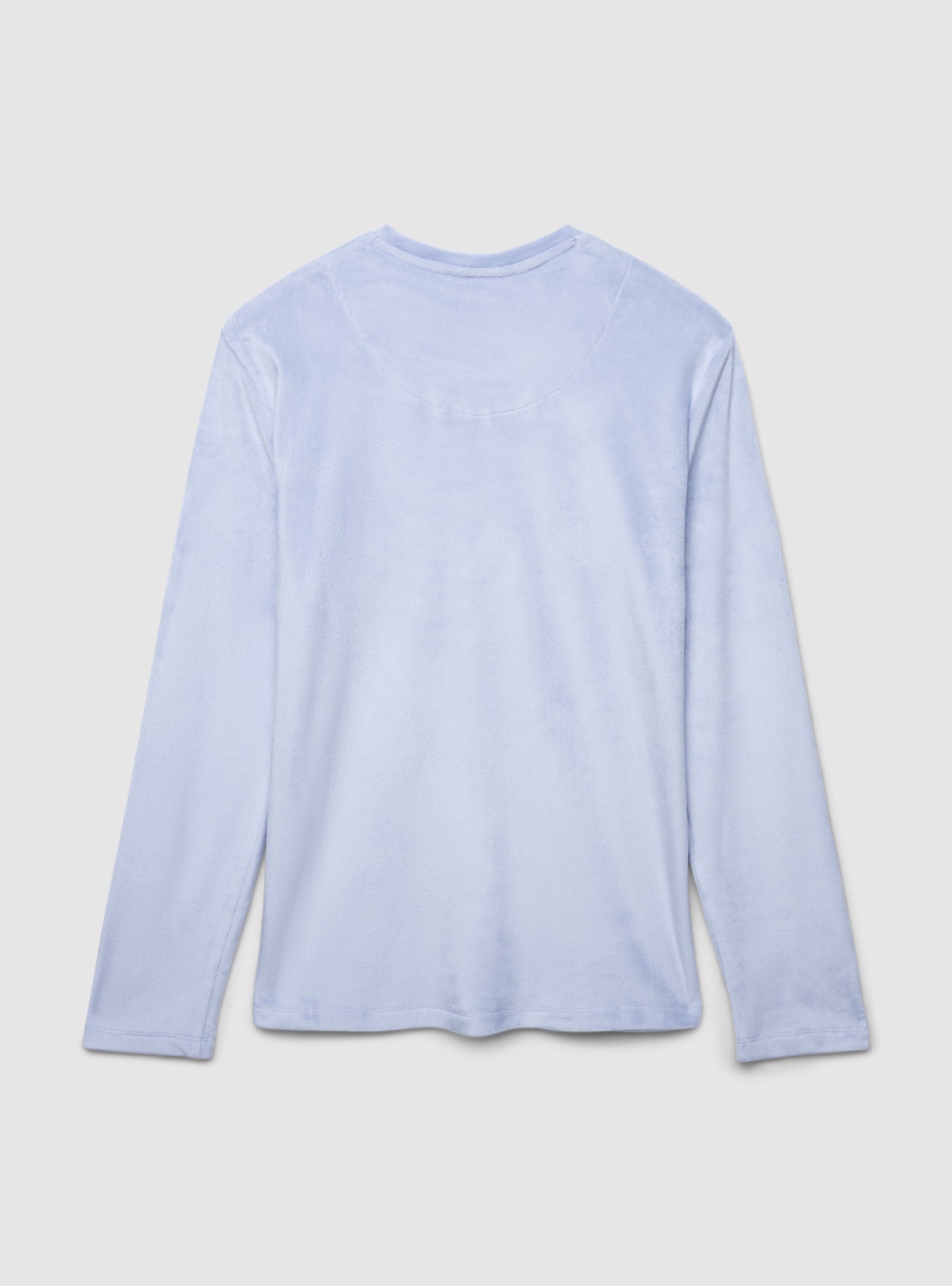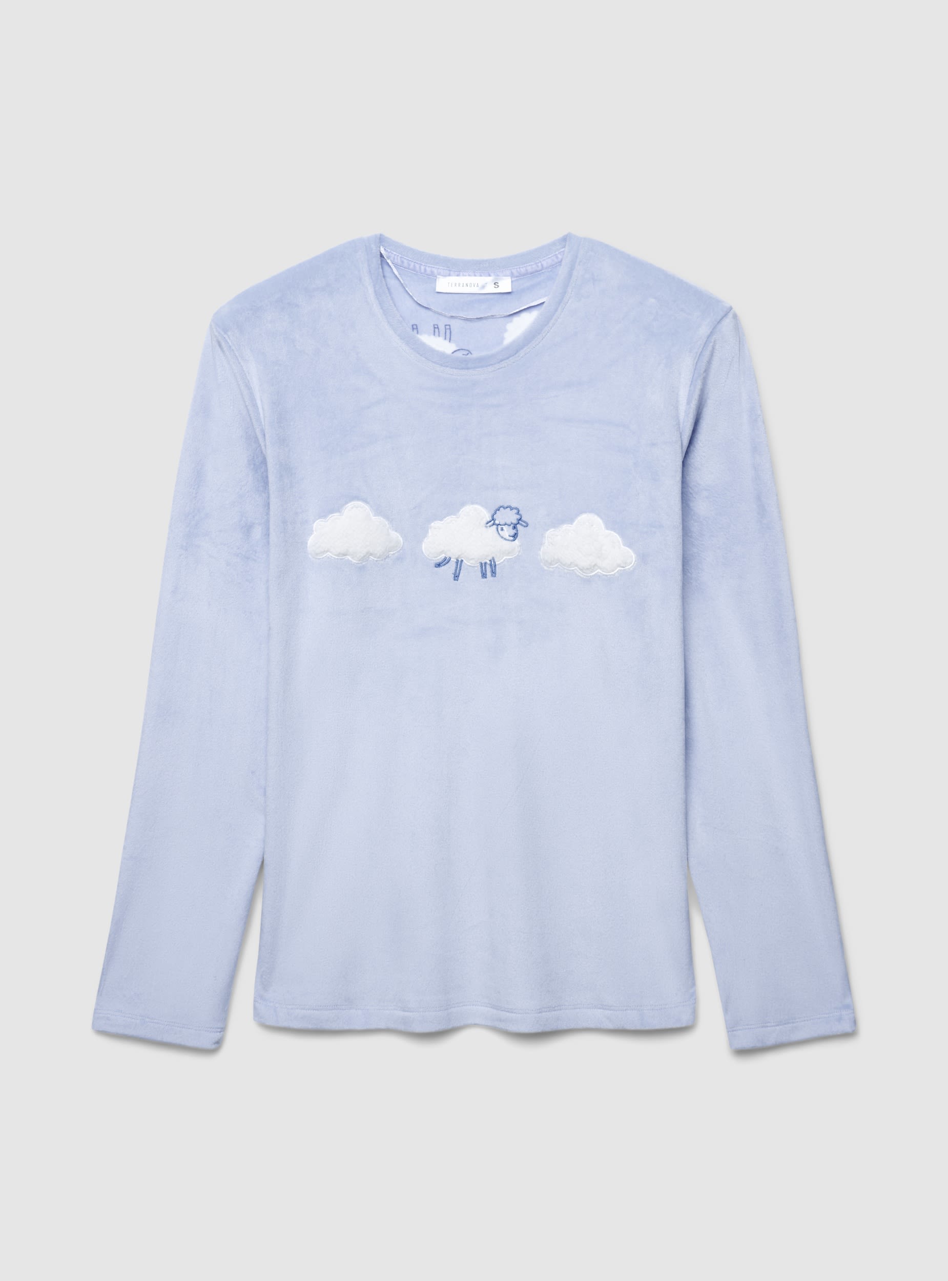 Pigiama da donna composto da maglia a maniche lunghe e pantaloni lunghi, ideale per le serate rilassanti a casa. La maglia presenta scollo tondo e applicazioni soffici con nuvole e pecora al centro, per un tocco giocoso. Mentre i pantaloni presentano una stampa all over di nuvole e pecore. Vestibilità comoda che agevola i movimenti e garantisce comfort durante il riposo. Perfetto da abbinare a calze antiscivolo e una vestaglia per creare un set notte accogliente.
