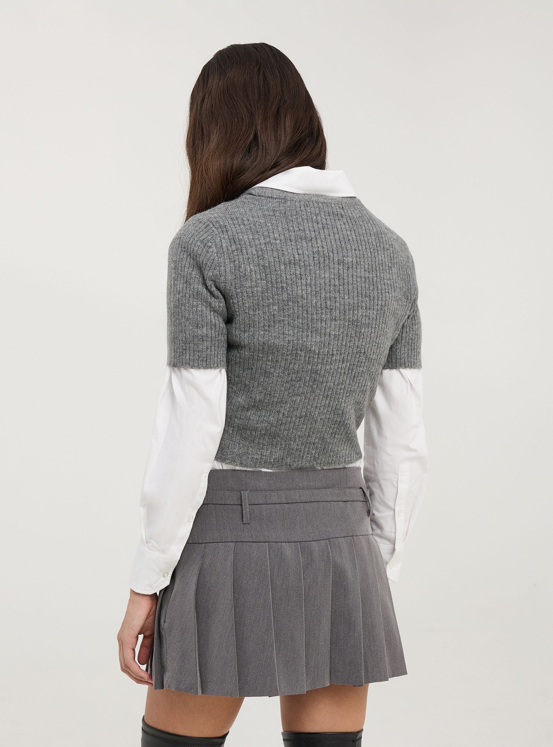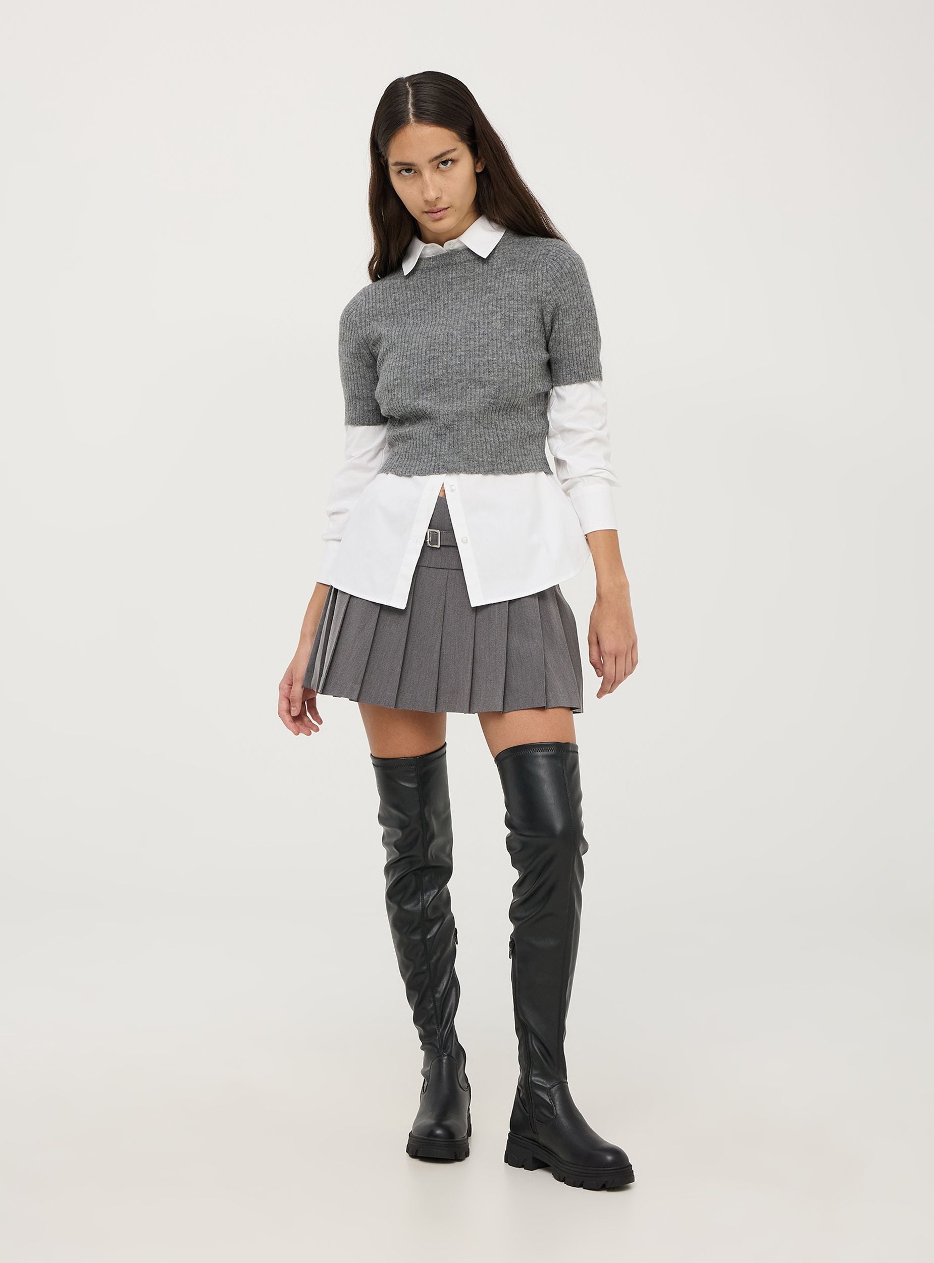 Gonna-pantaloncini da donna melange. Si distingue per il suo design plissettato che aggiunge un tocco di movimento e stile. Dotata di una cintura decorativa con fibbia sulla vita per un dettaglio raffinato, questa gonna ha una vestibilità regolare che la rende adatta a diverse occasioni. Perfetta per look casual ma curati, ideale sia per il lavoro che per le uscite serali. Chiusura laterale con zip nascosta.