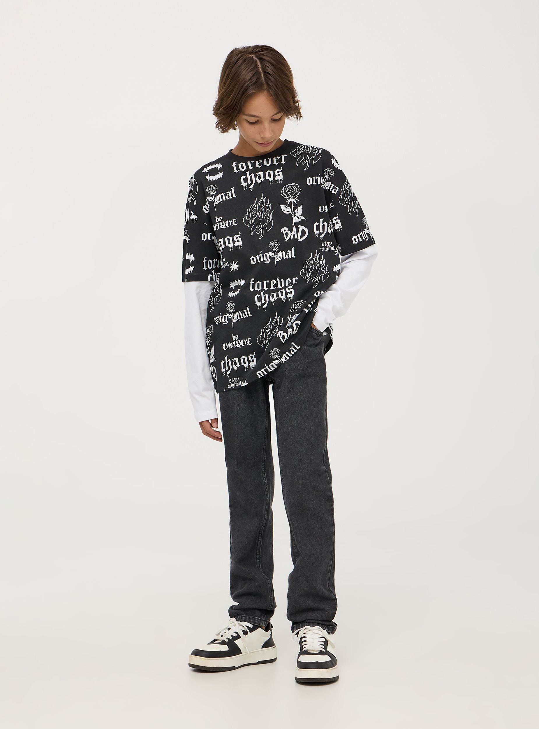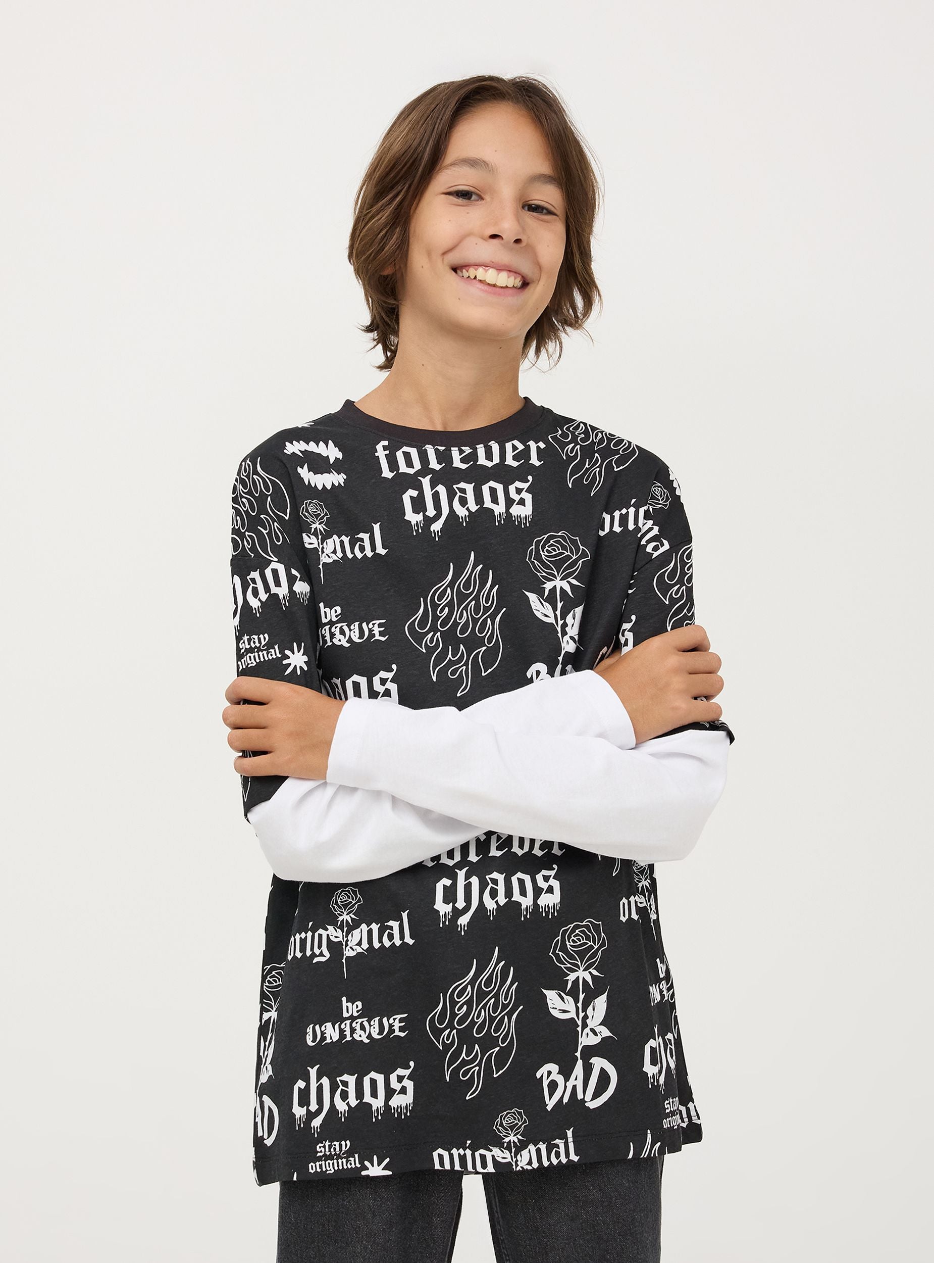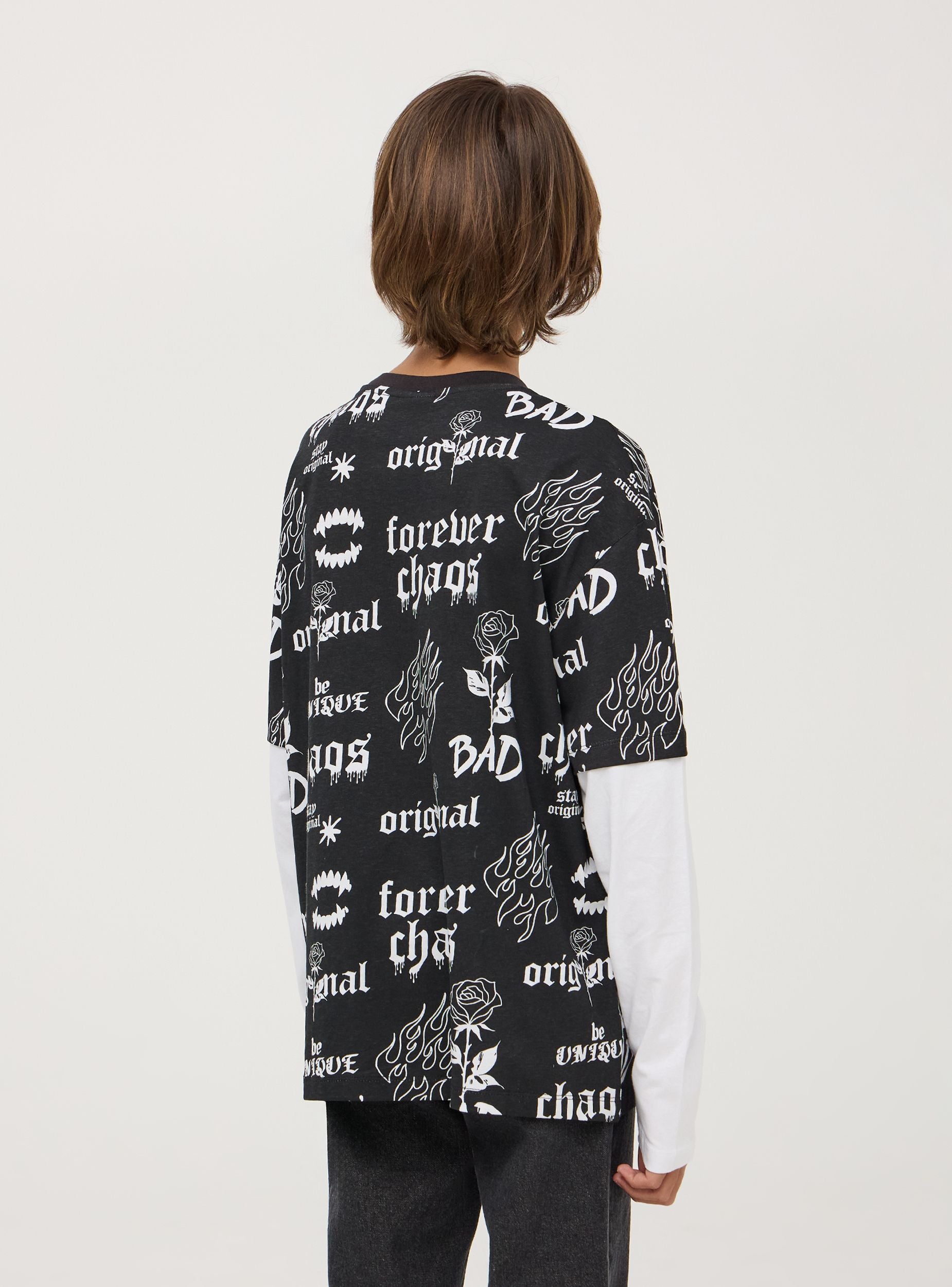 Maglia da bambino a maniche lunghe con stampa gotica. Modello girocollo con doppie maniche effetto bicolor, il tessuto in jersey di cotone presenta disegni e scritte in stile gotico all-over. Vestibilità regular.Dettagli