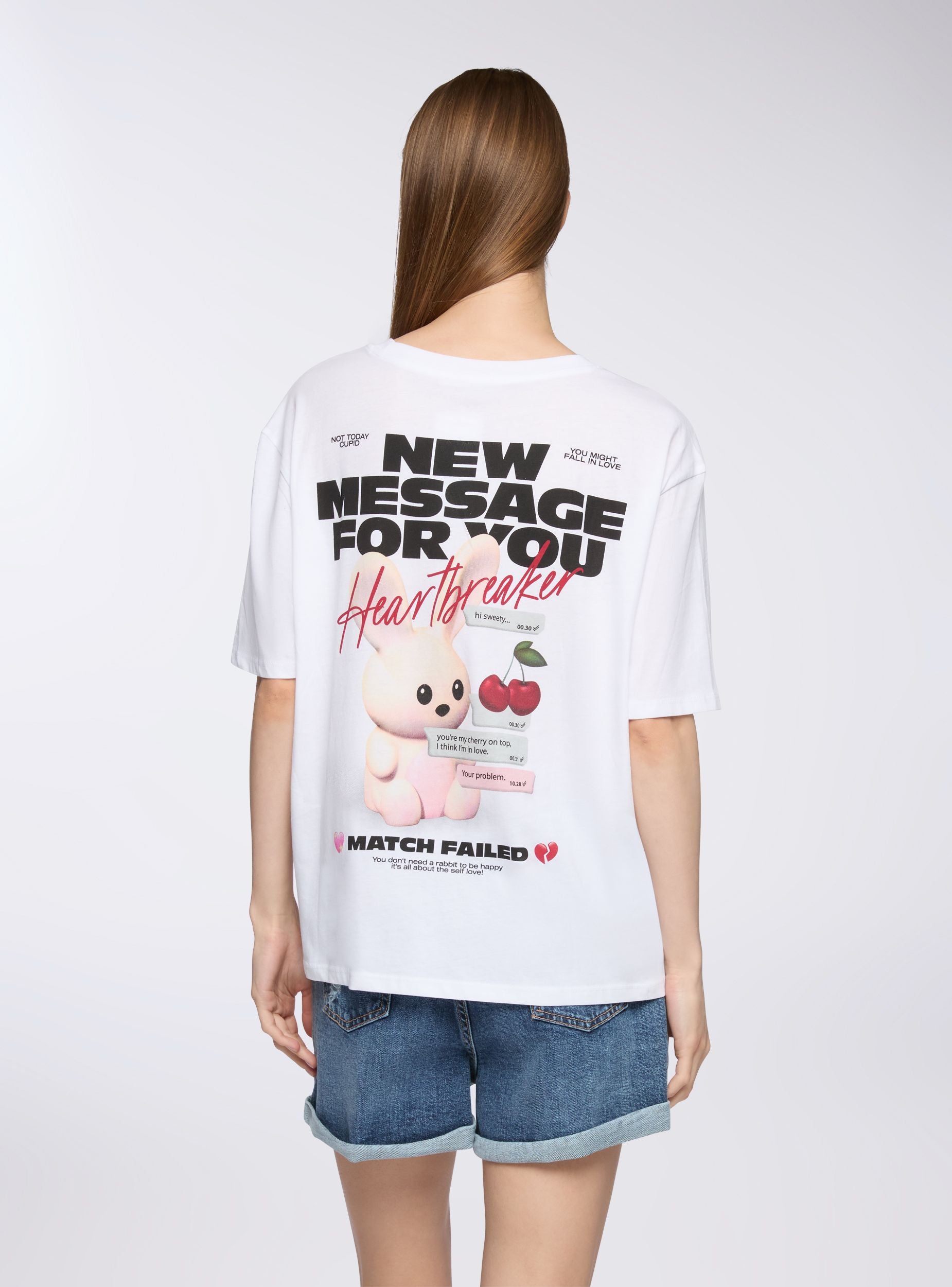 Maglietta da donna con vestibilità ampia, ideale per un look casual e moderno. Presenta una stampa sul fronte e sul retro, aggiungendo un tocco di originalità. Perfetta per abbinamenti con jeans o pantaloni sportivi, questa maglietta è adatta per il tempo libero e occasioni informali. Il design versatile la rende un capo indispensabile per il guardaroba.