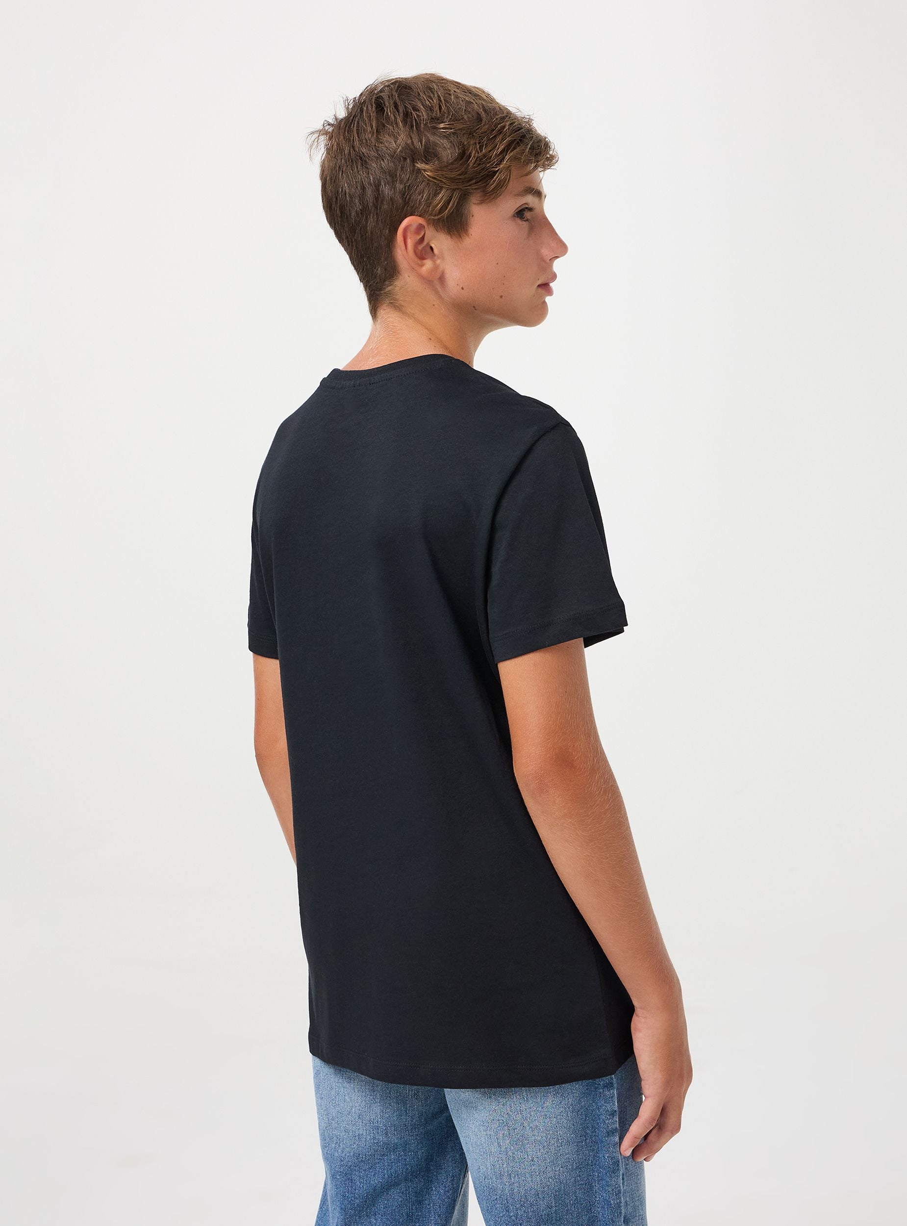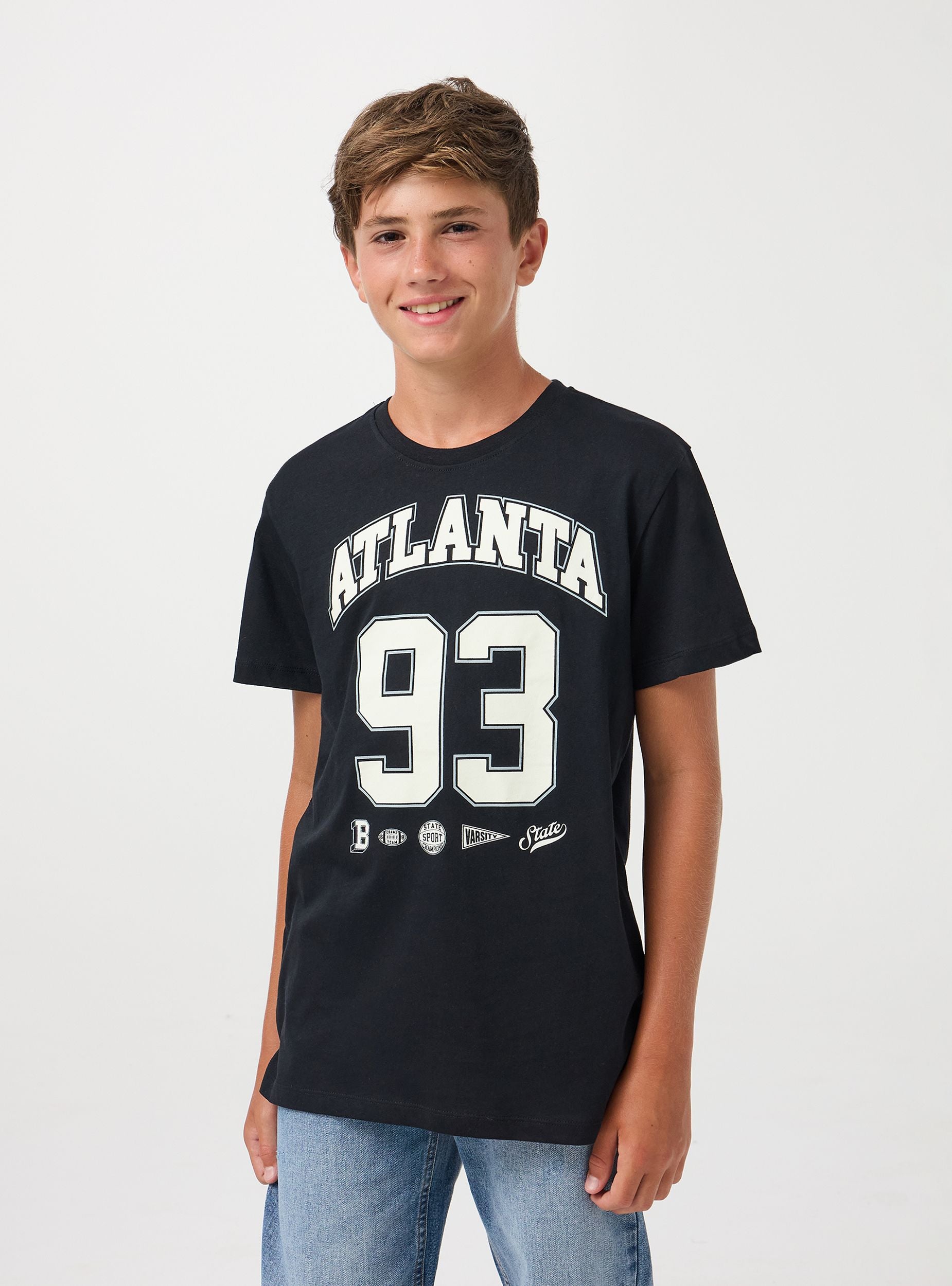 Maglietta da bambino in jersey di cotone con stampa college. Modello girocollo con maniche corte. Vestibilità regular.Dettagli