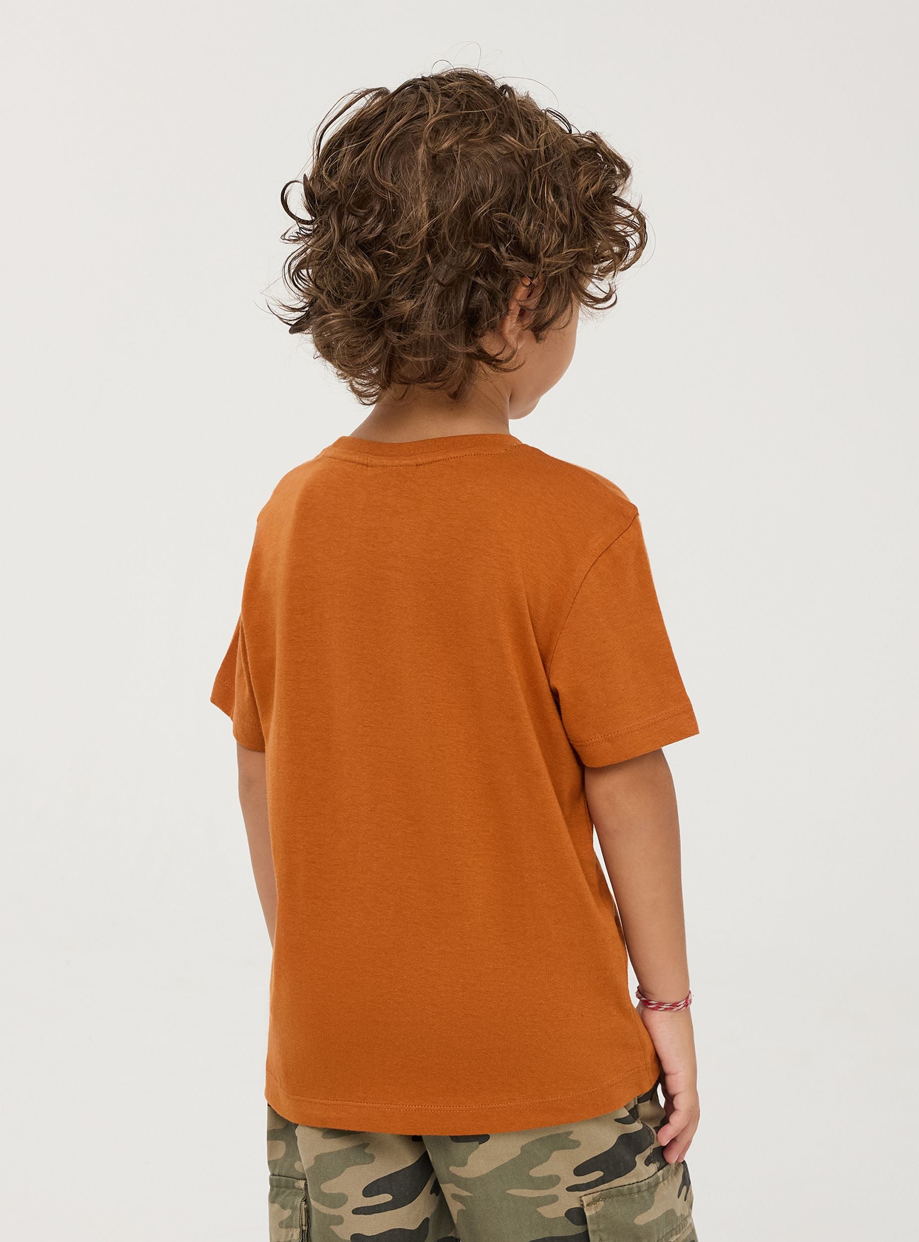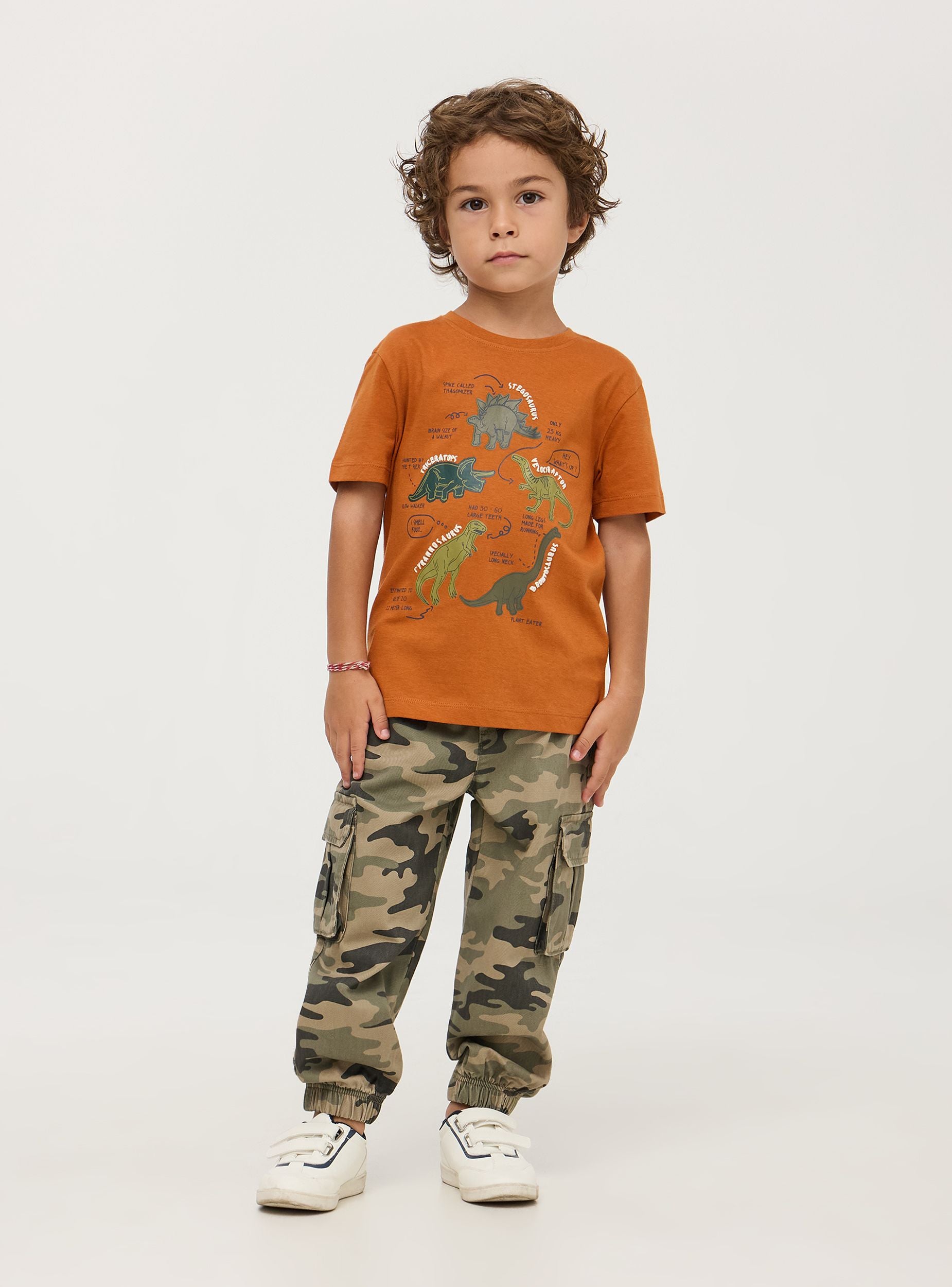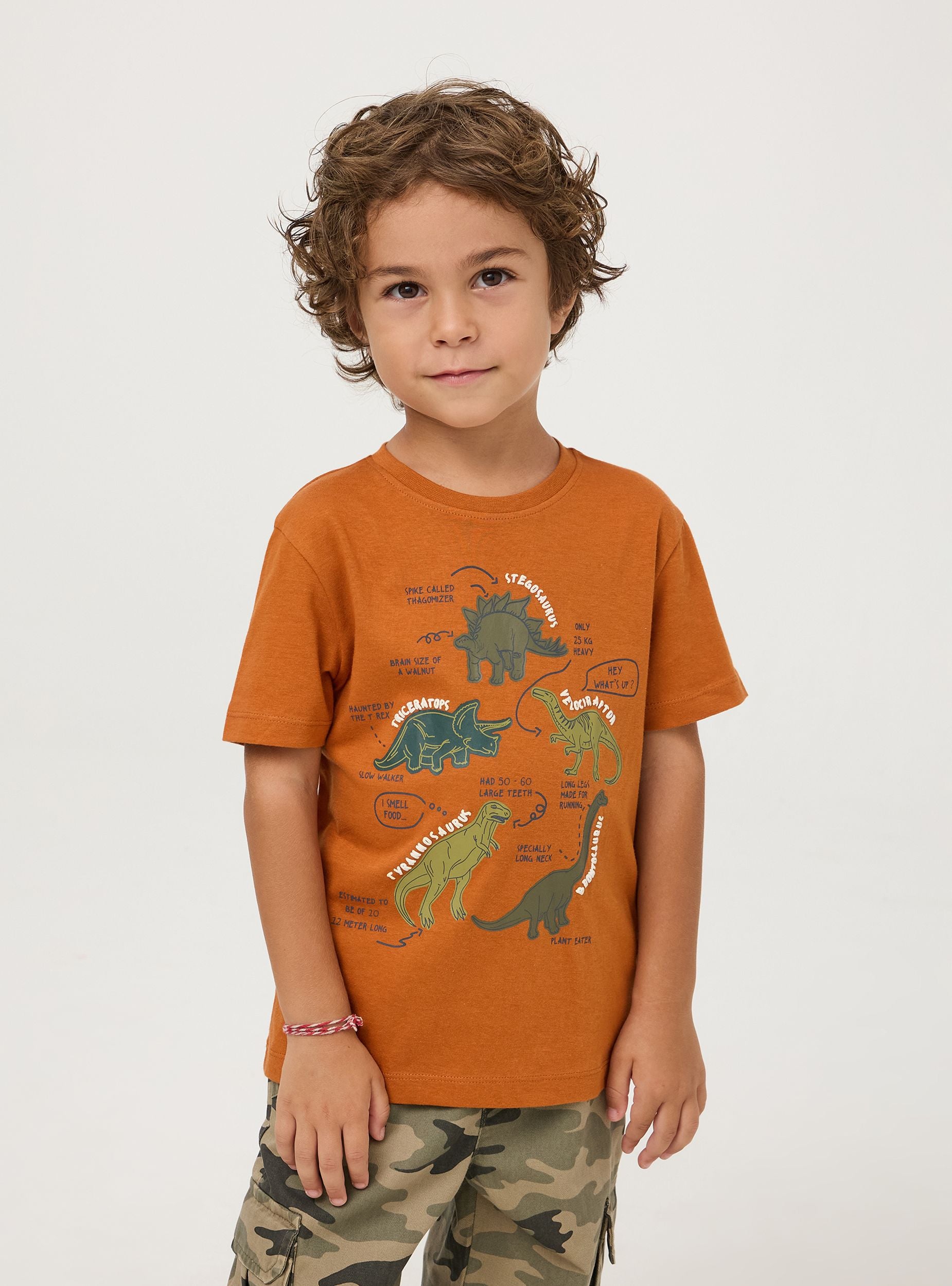 Maglietta da bimbo in jersey di cotone con stampa dinosauri. Sulla t-shirt sono rappresentate cinque specie diverse di dinosauri con i rispettivi nomi e particolarità, pensata per far imparare i più piccoli divertendosi. Modello girocollo con maniche corte. Perfetta per i look di tutti i giorni. Vestibilità regular.Dettagli