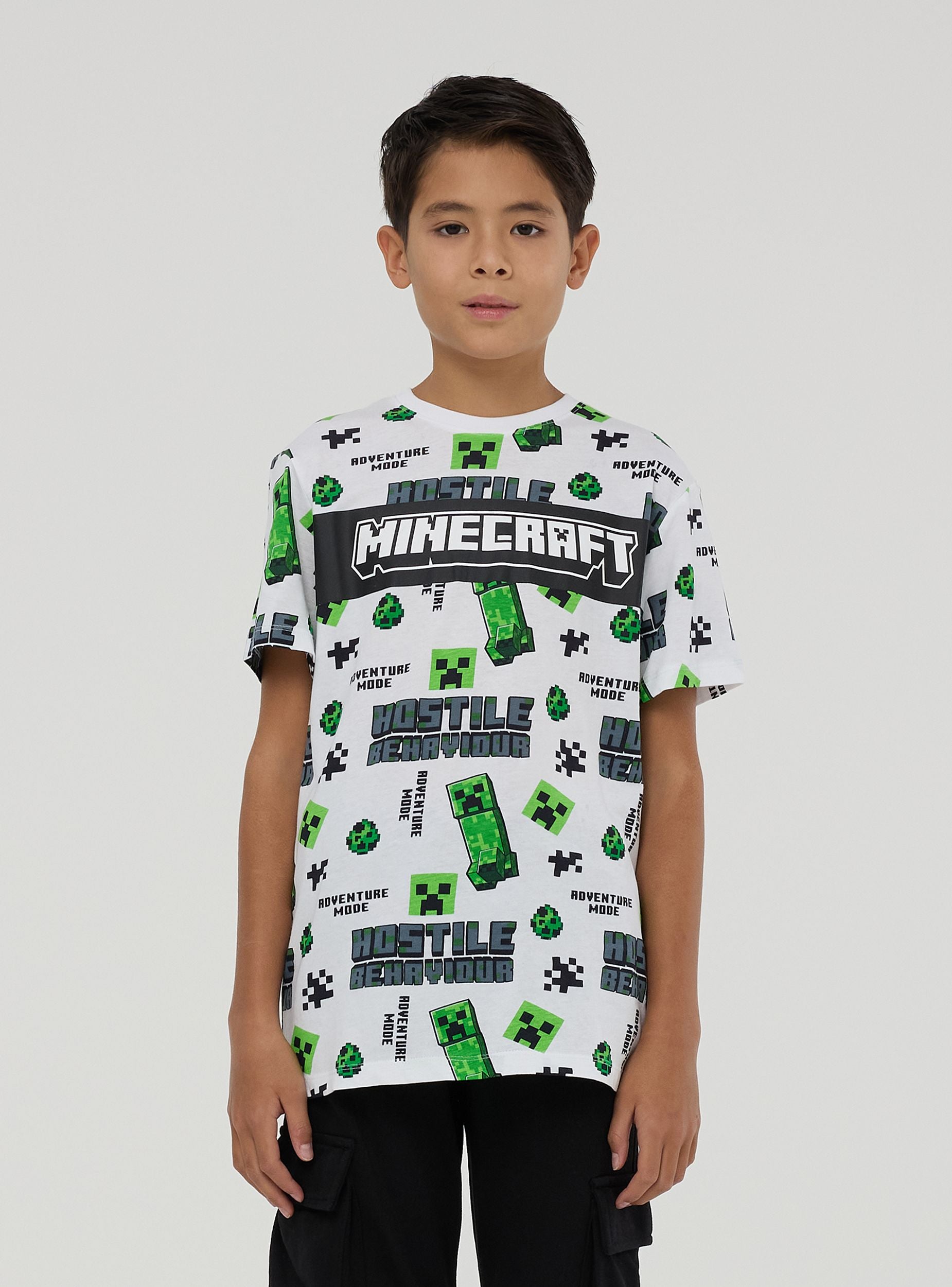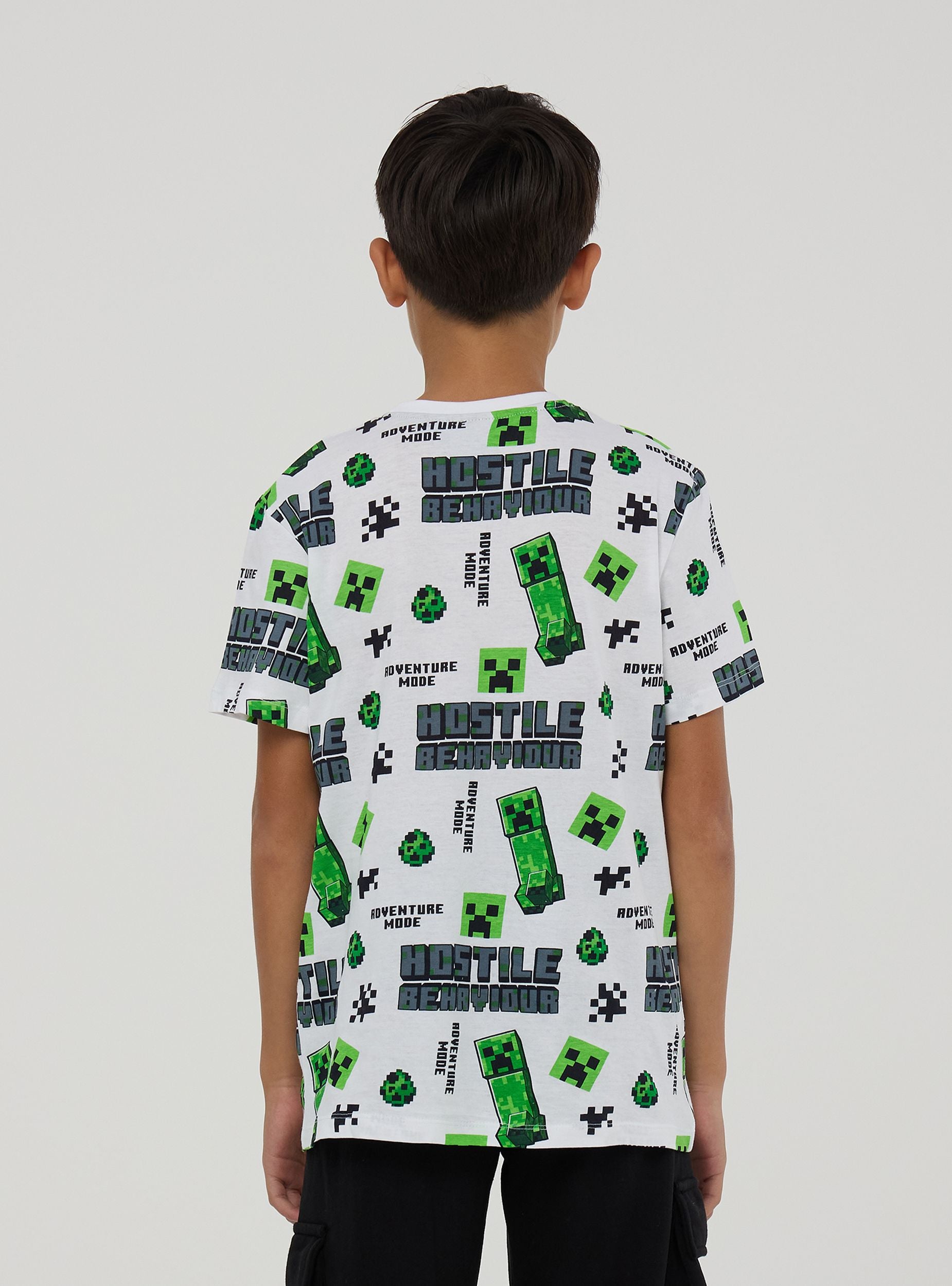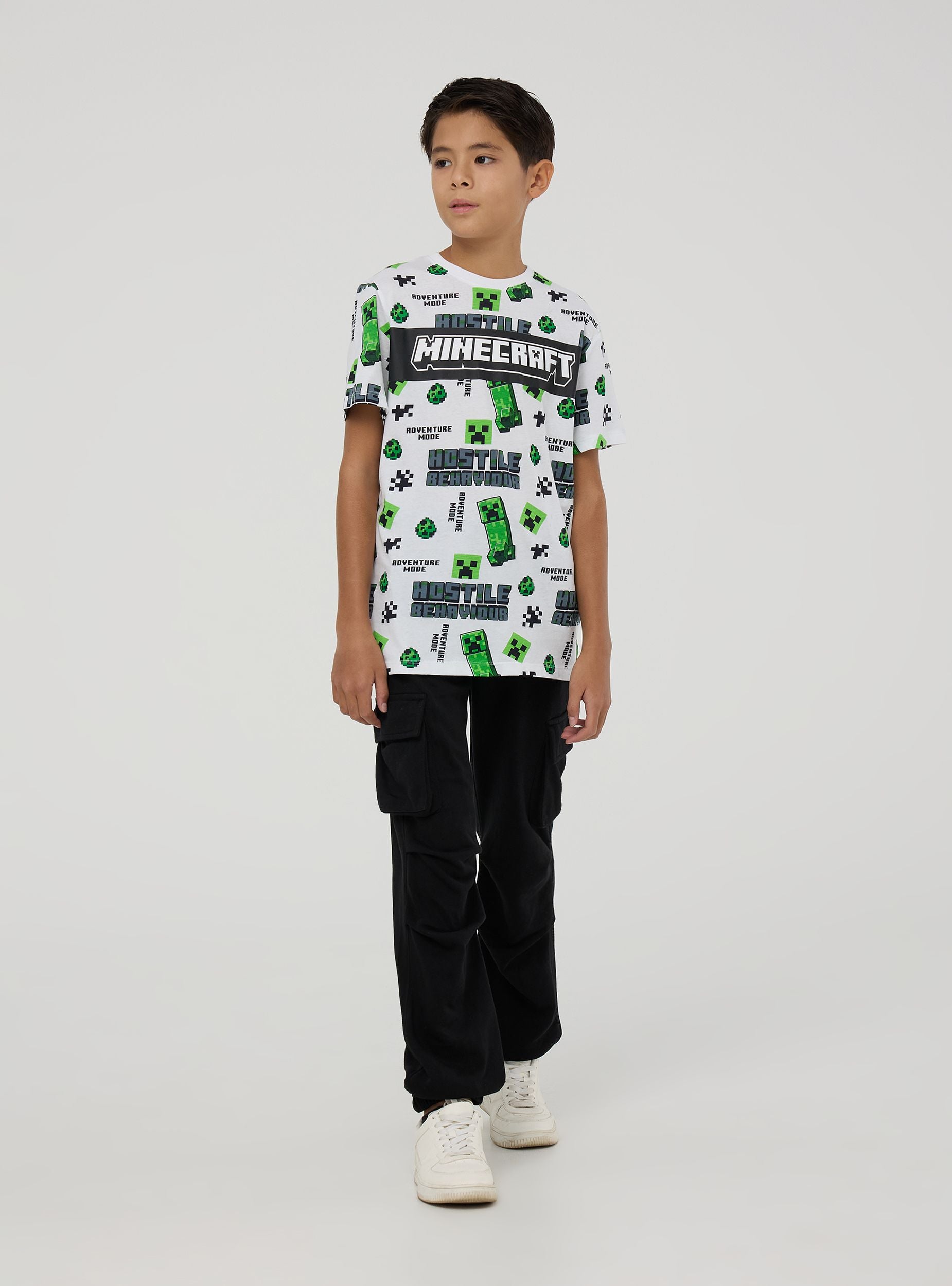 Maglietta da bambino in jersey di cotone con stampa Minecraft®. Modello girocollo con maniche corte. Vestibilità regular.Dettagli