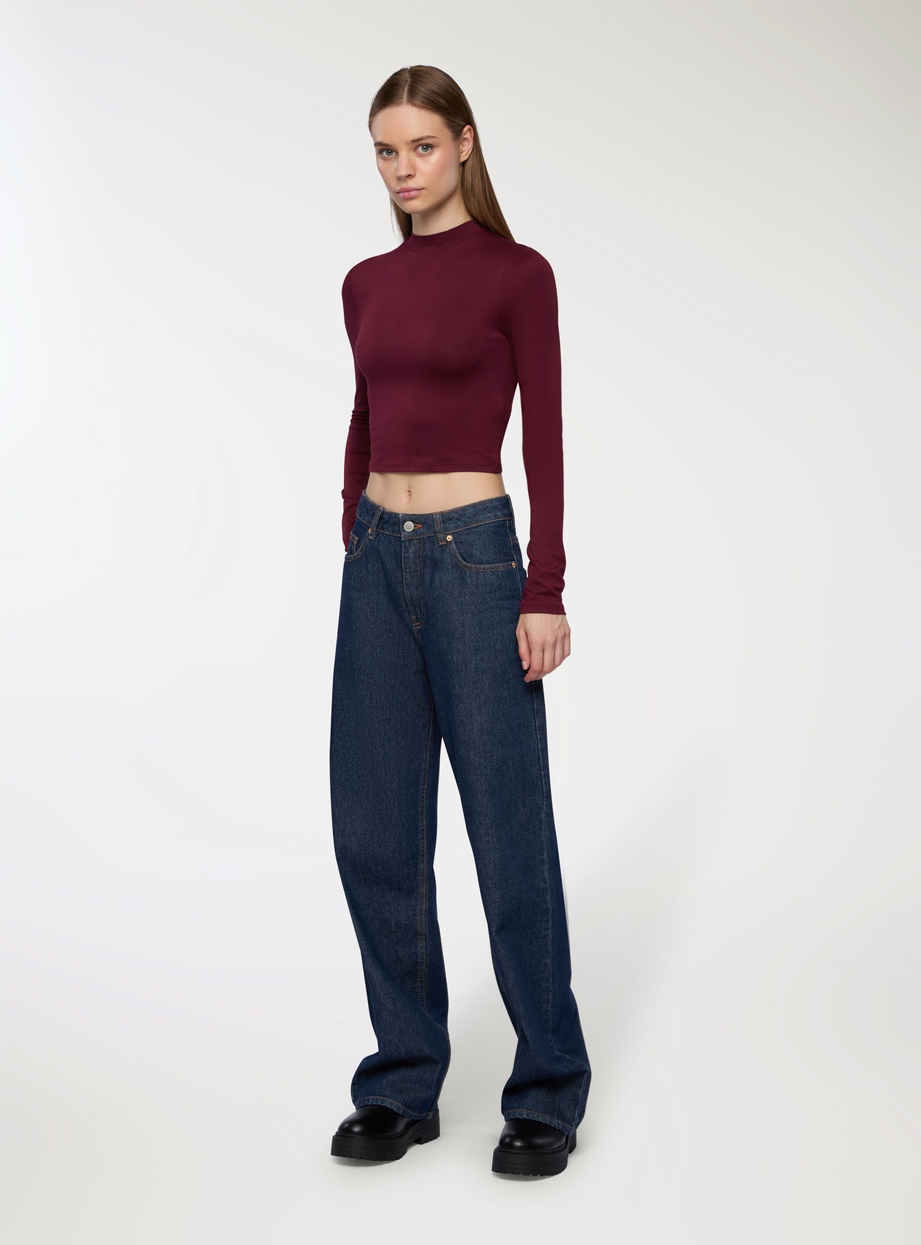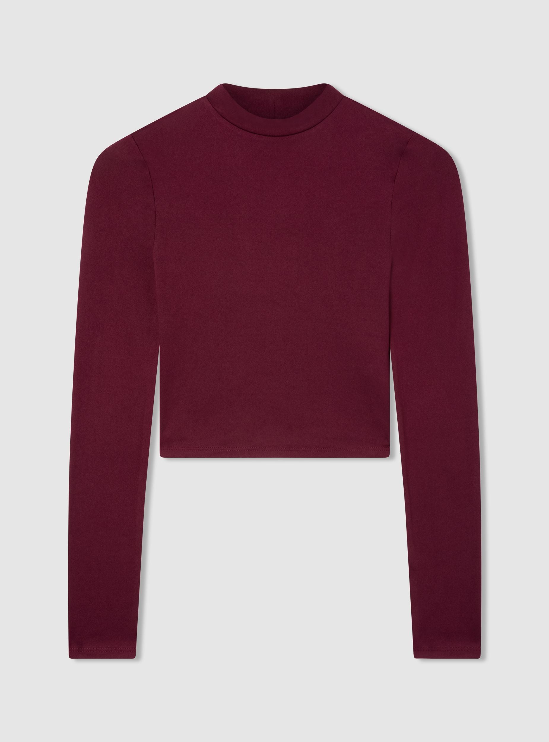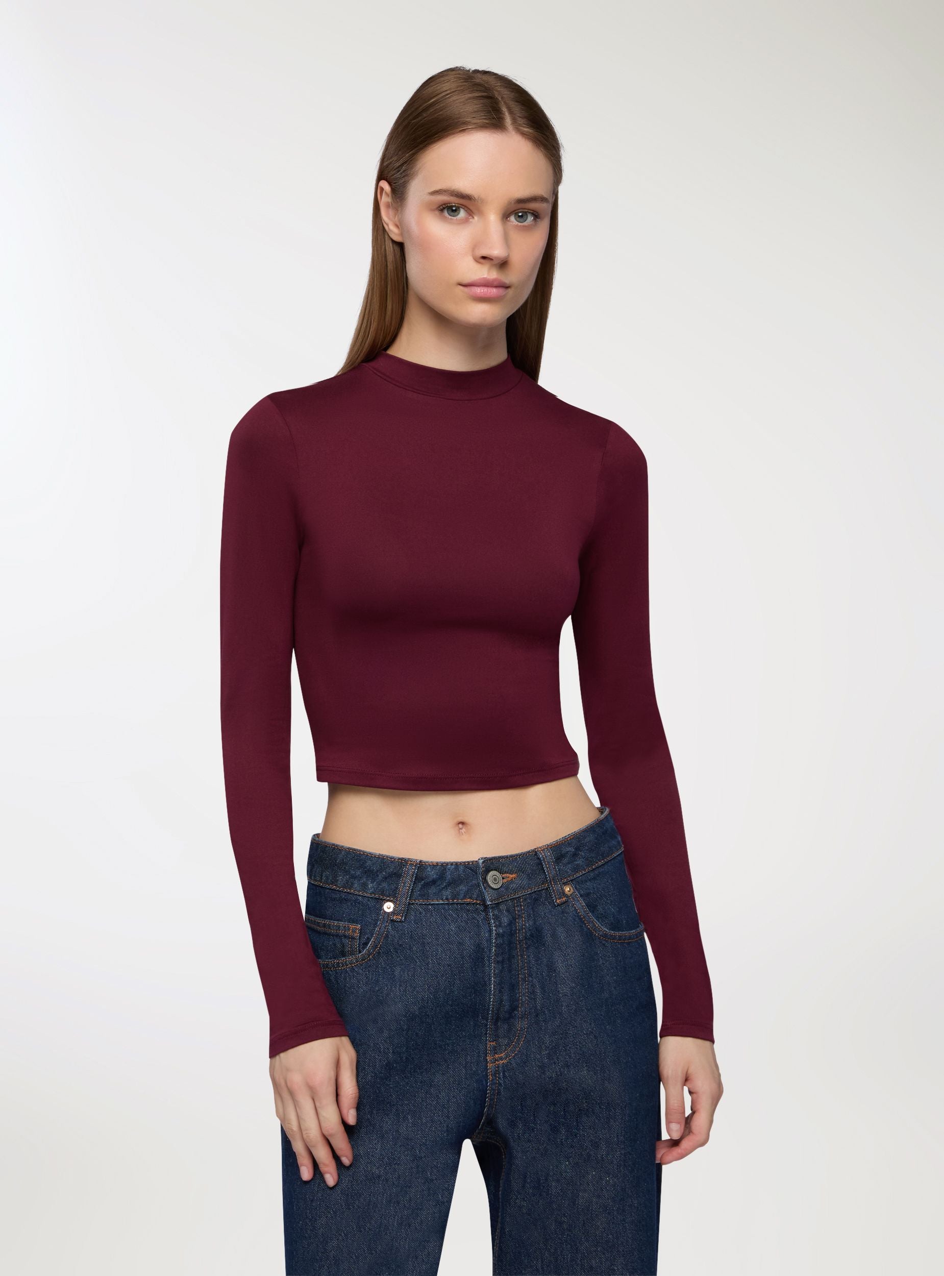 Tessuto caldo. Maglietta da donna elasticizzata a maniche lunghe con design crop e collo alto. Perfetta per outfit casual e moderni, si abbina facilmente a jeans o gonne a vita alta. La vestibilità aderente e il taglio corto la rendono ideale per creare look alla moda. Adatta per occasioni informali. Capo basico indispensabile da avere nell'armadio.