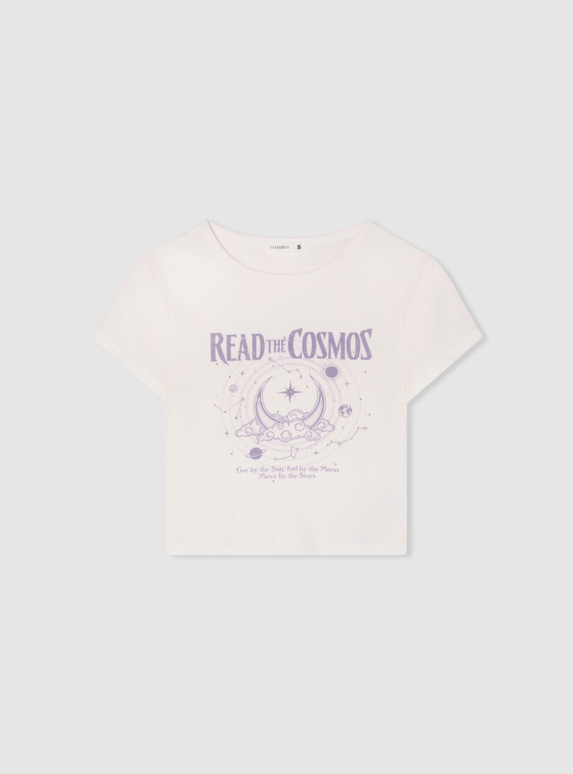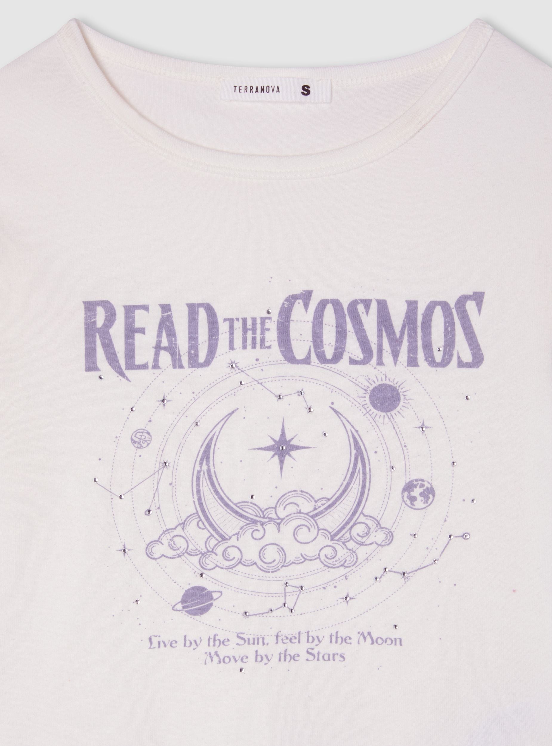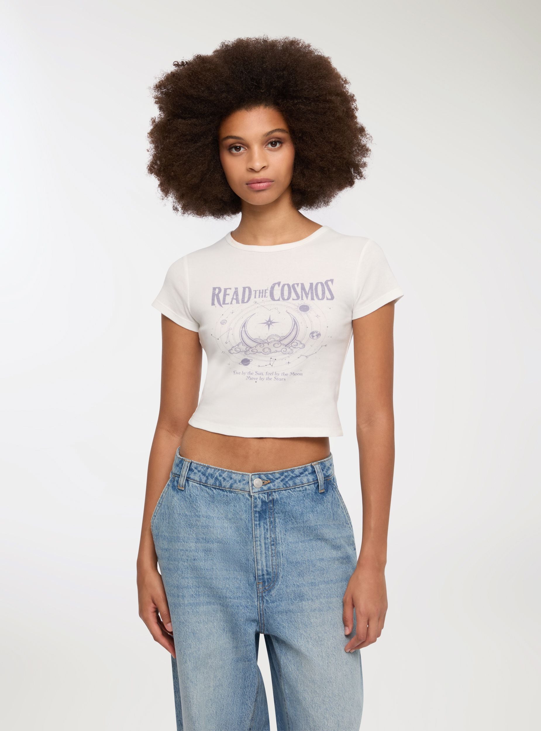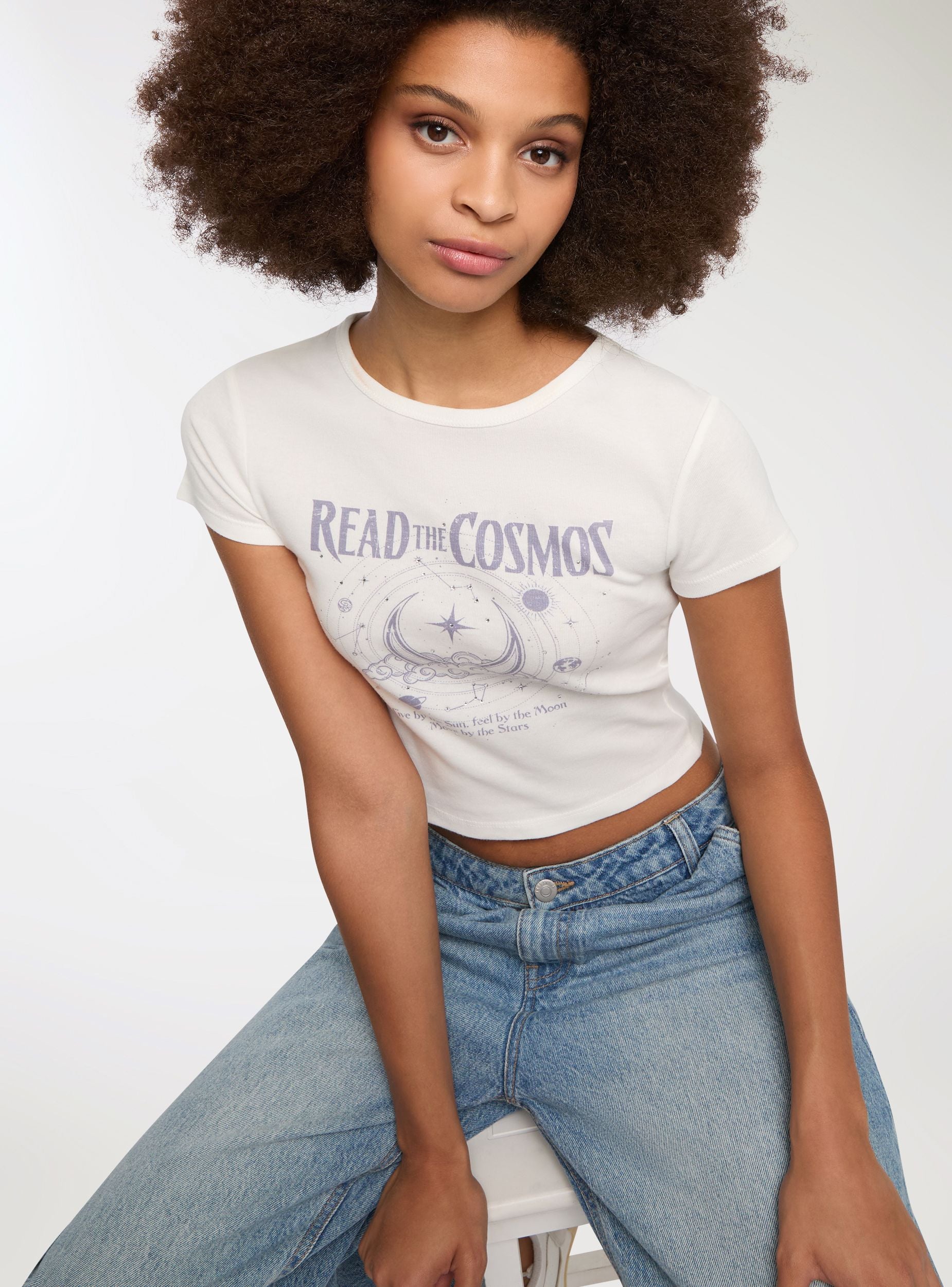 Maglietta da donna con design crop e maniche corte, ideale per un look casual e alla moda. Presenta una scritta decorativa sul davanti con motivi astrali e dettagli brillanti che aggiungono un tocco originale e distintivo. Perfetta da abbinare a jeans o pantaloni a vita alta per un outfit moderno e versatile. La vestibilità crop la rende adatta per occasioni informali e giornate di relax.