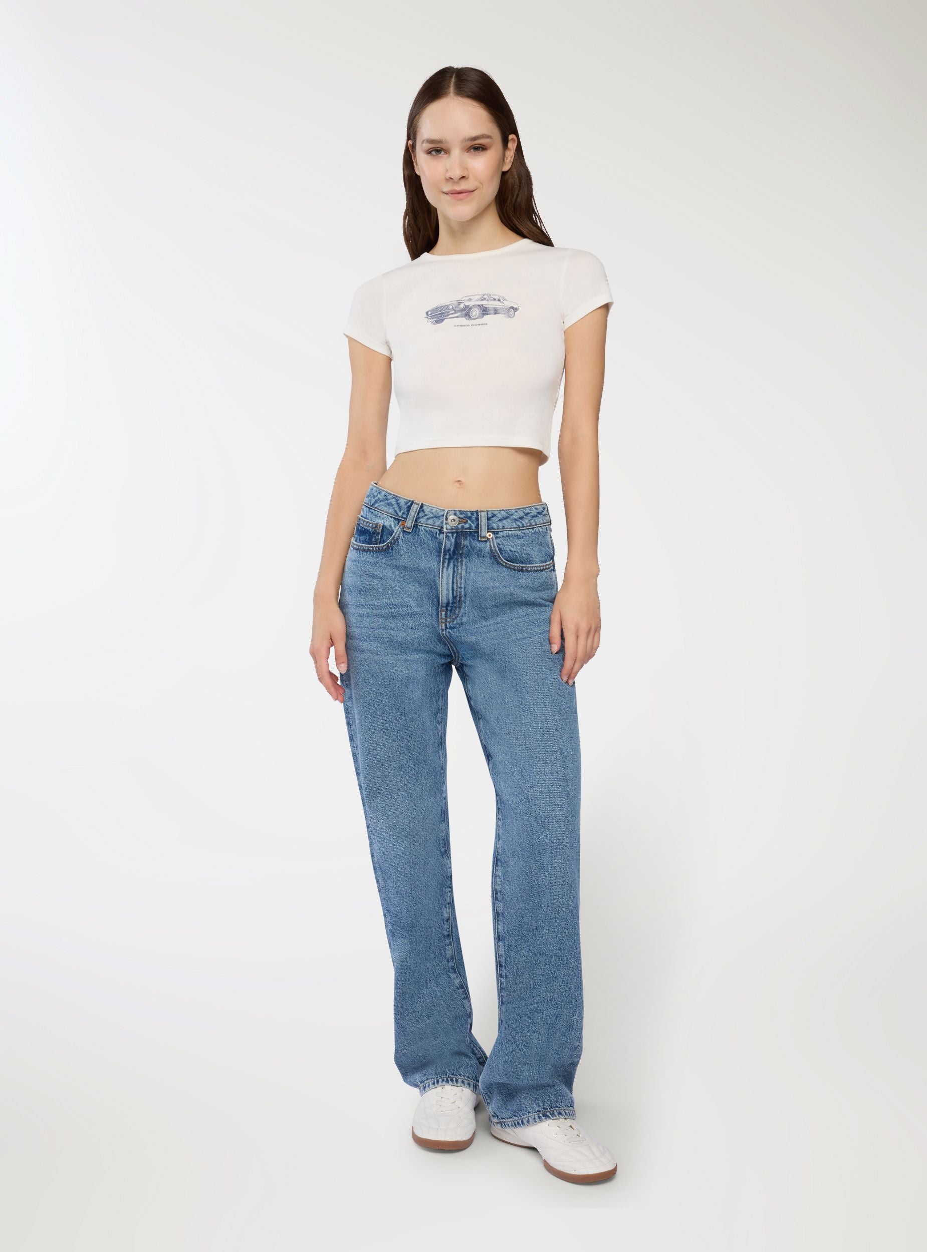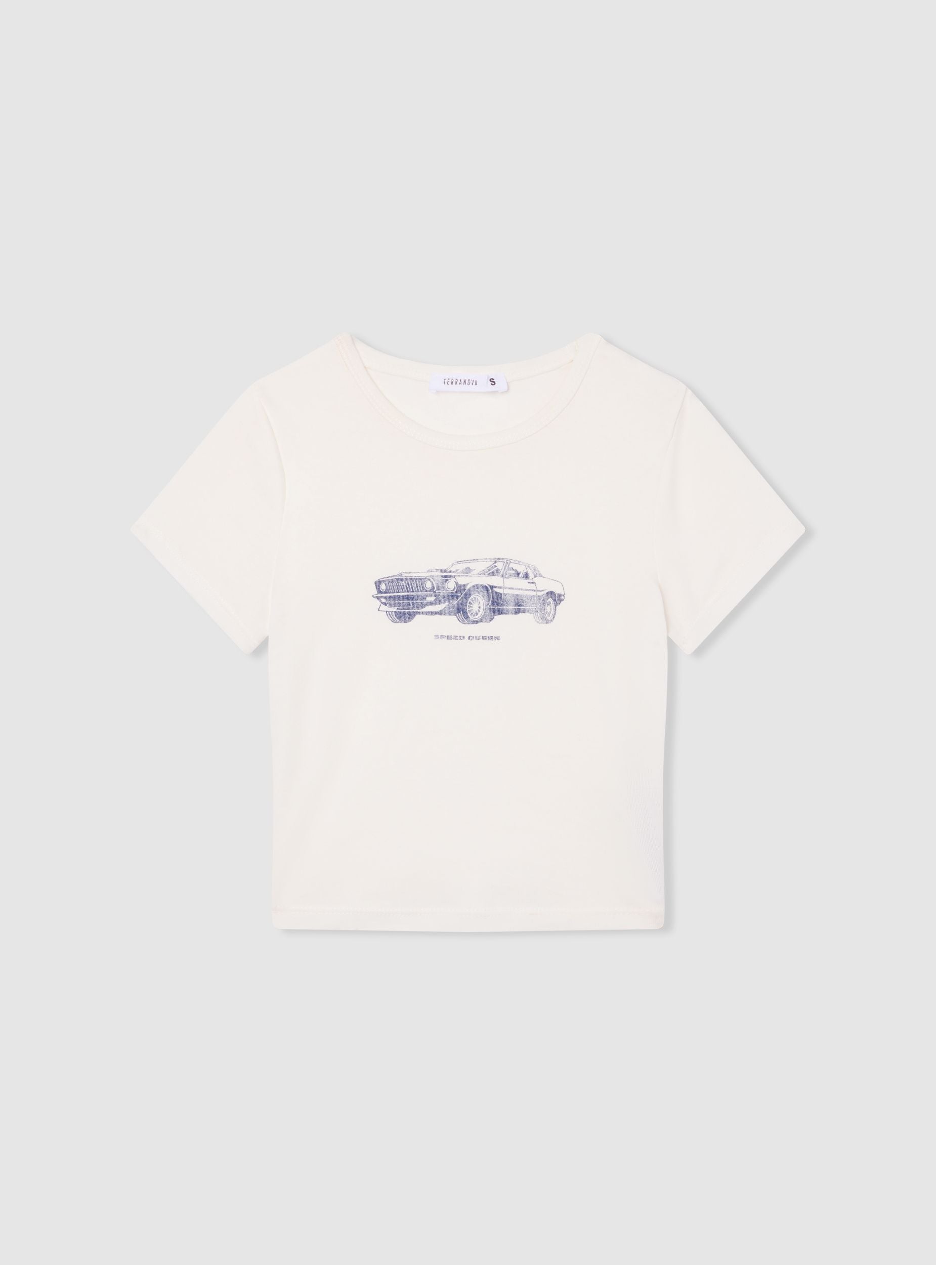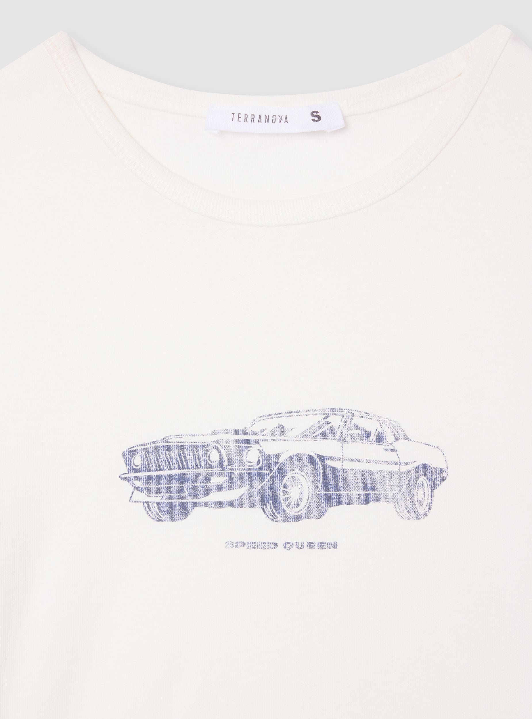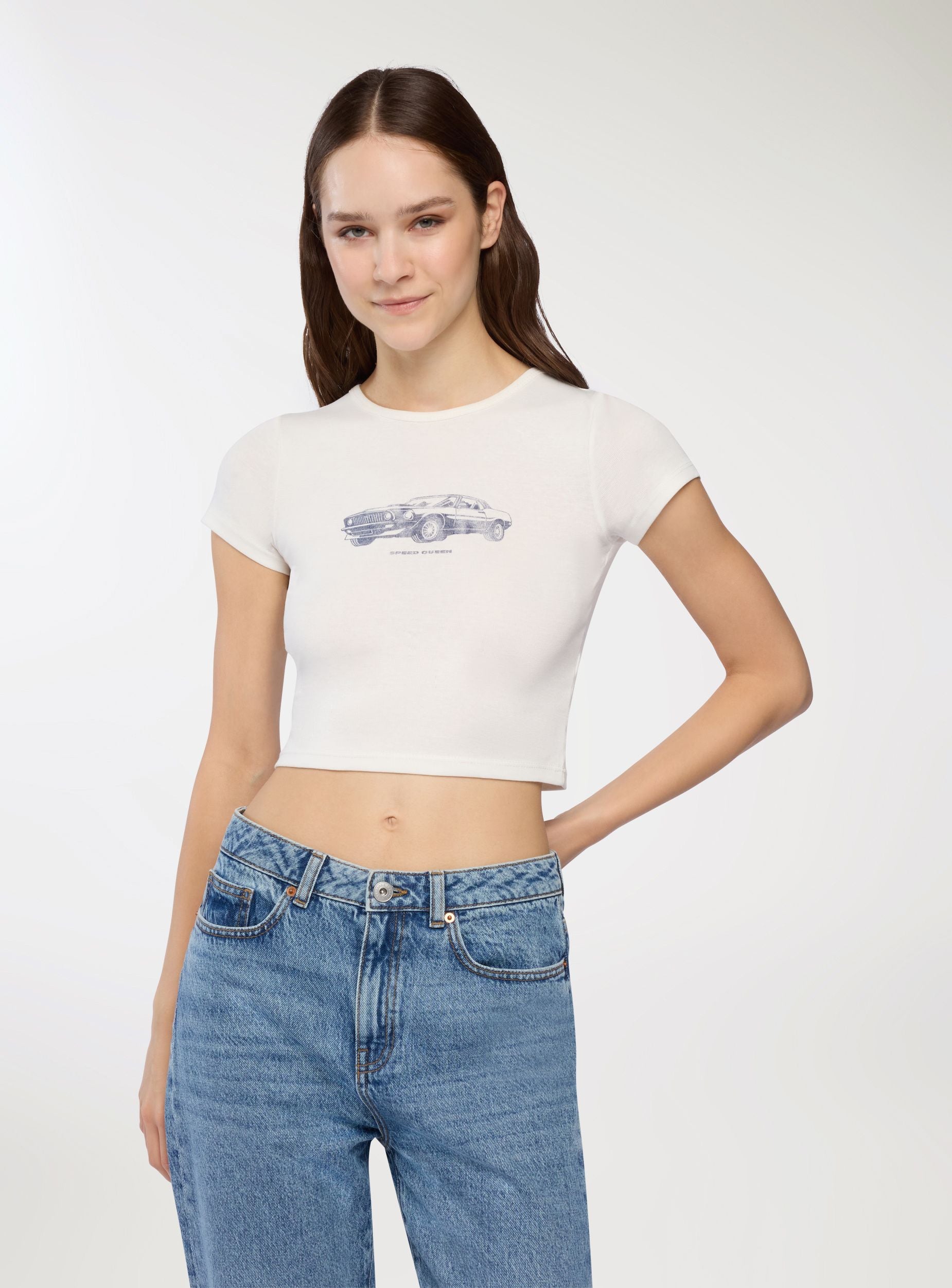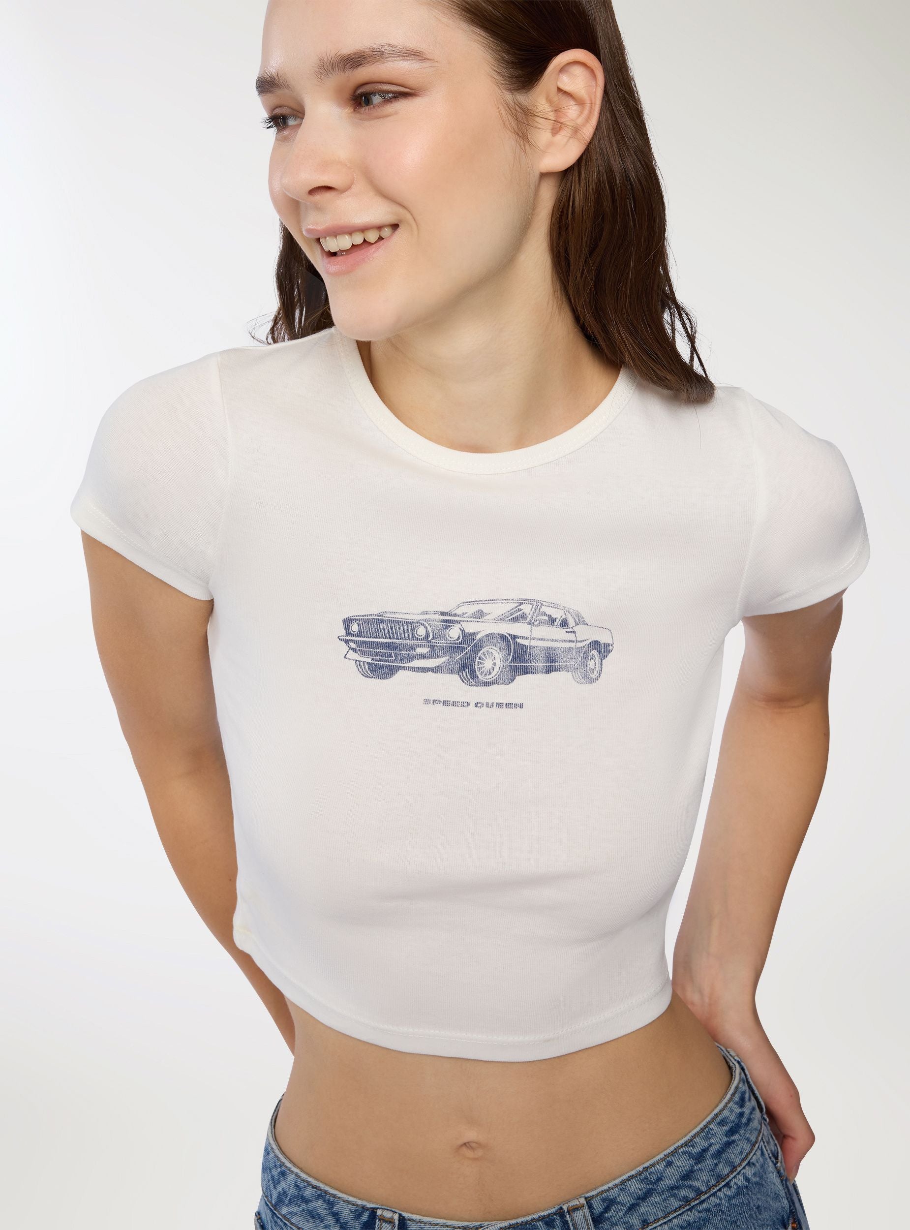 Maglietta da donna con vestibilitá crop e mezza manica. Presenta una stampa grafica di un'auto sul davanti, ideale per un look casual e moderno. Perfetta da abbinare a jeans o pantaloncini per un outfit informale e alla moda. Il design crop aggiunge un tocco di stile contemporaneo, rendendola adatta per diverse occasioni di svago.