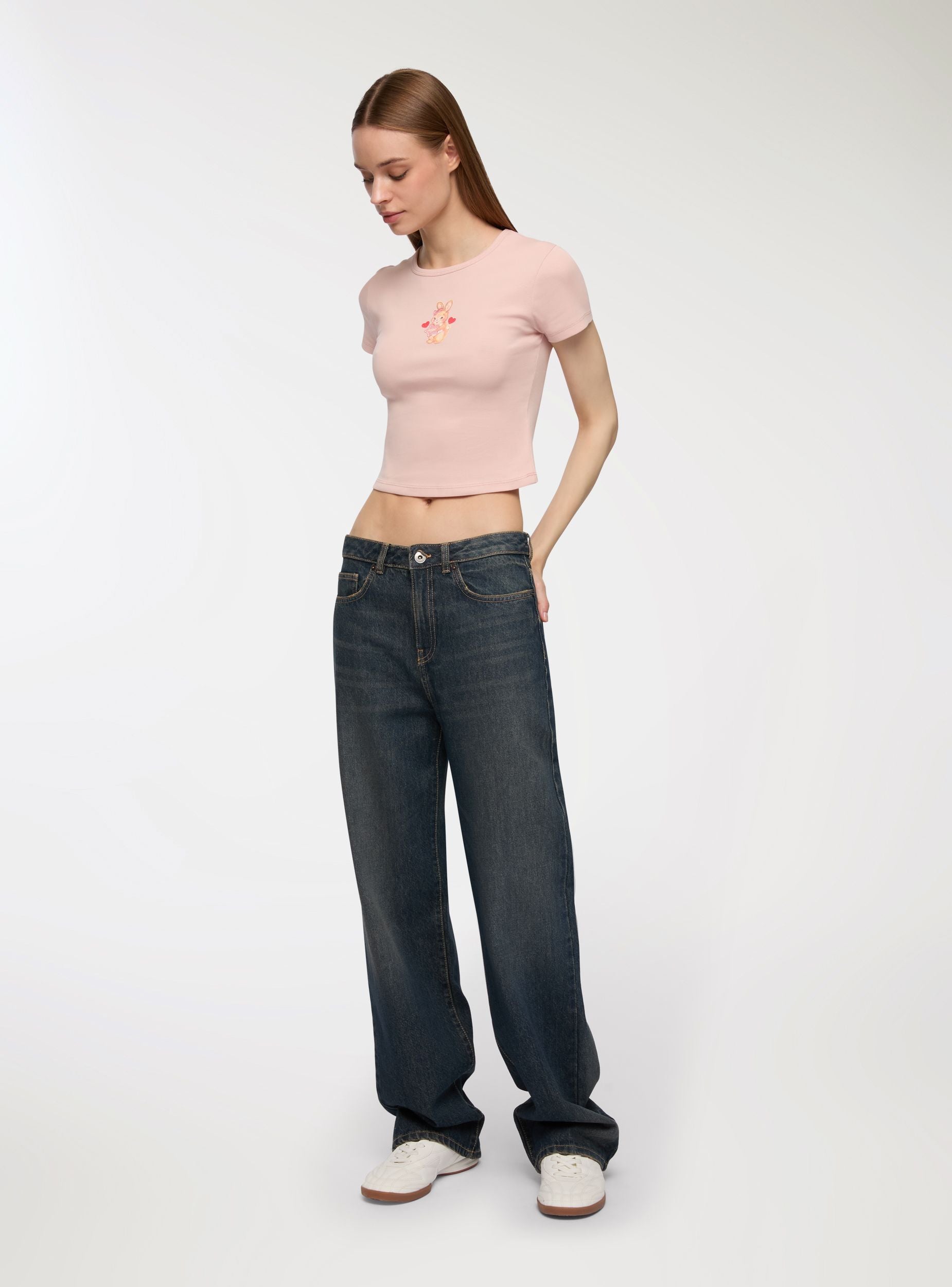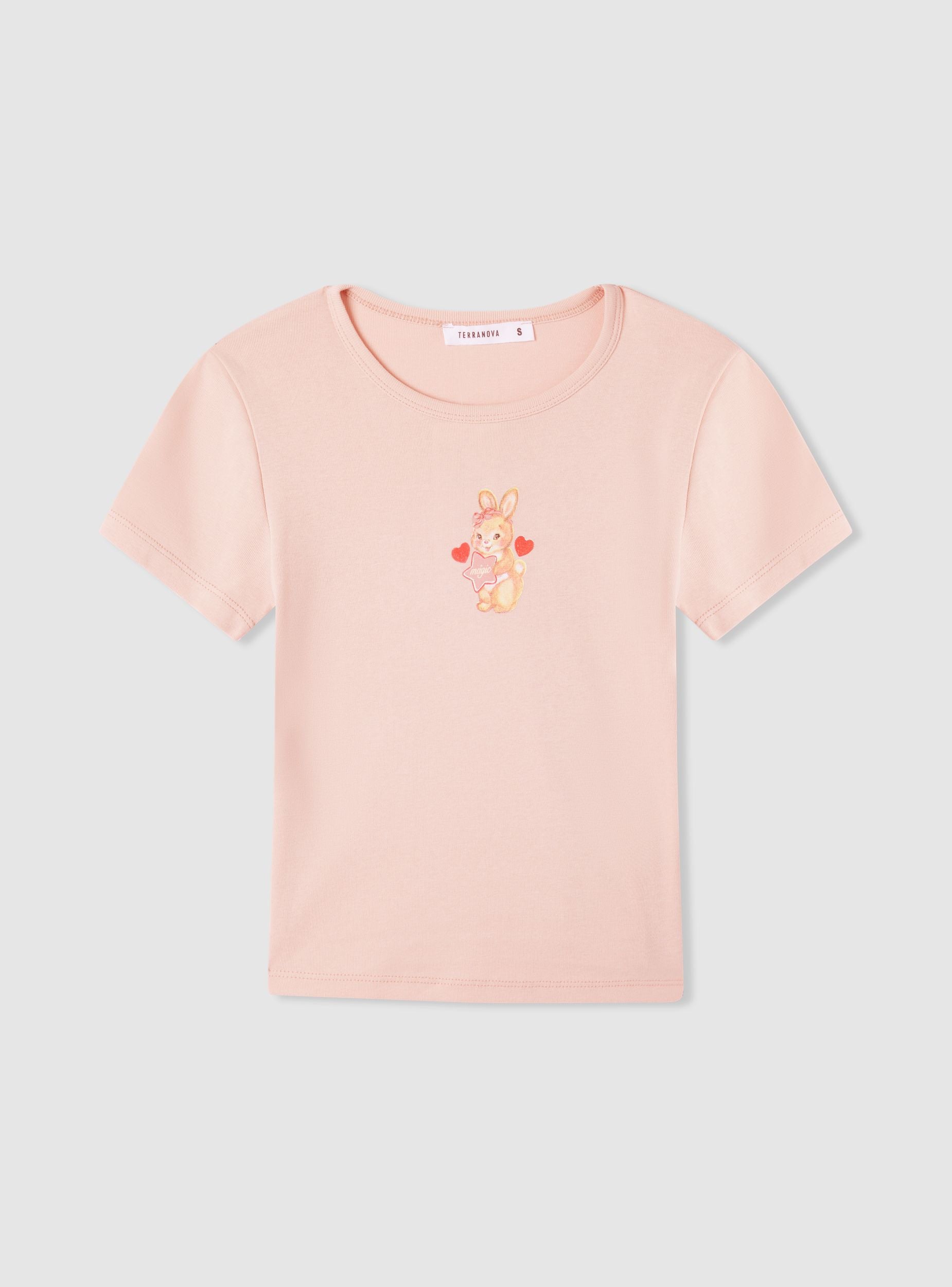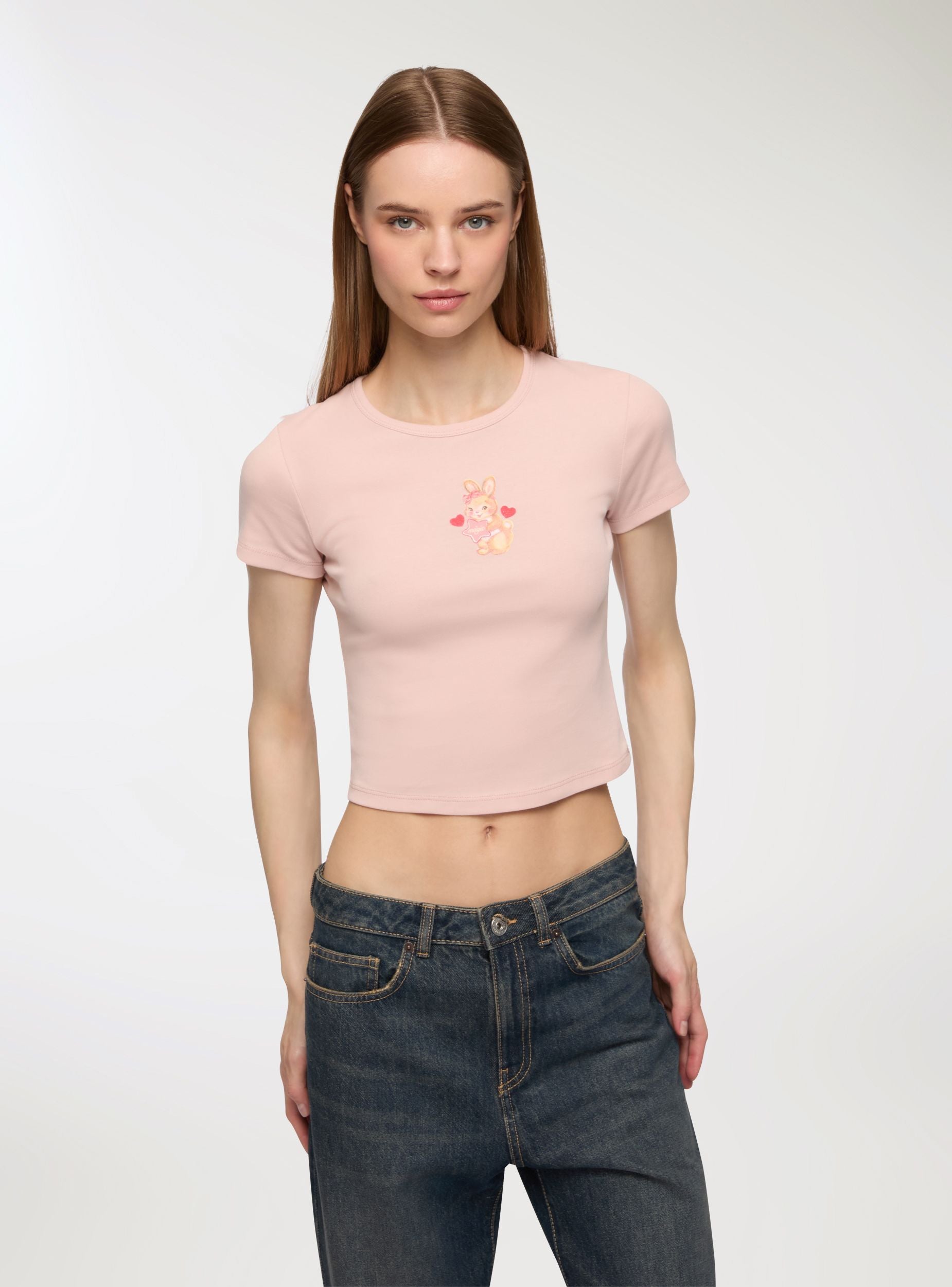 Maglietta da donna con vestibilità crop, ideale per un look casual e moderno. Presenta una stampa centrale con motivi giocosi e originali, che aggiungono un tocco di vivacità al design. Perfetta da abbinare a jeans o pantaloni a vita alta per un outfit giovane e dinamico. Il design con maniche corte e girocollo la rende versatile e adatta a diverse occasioni informali.