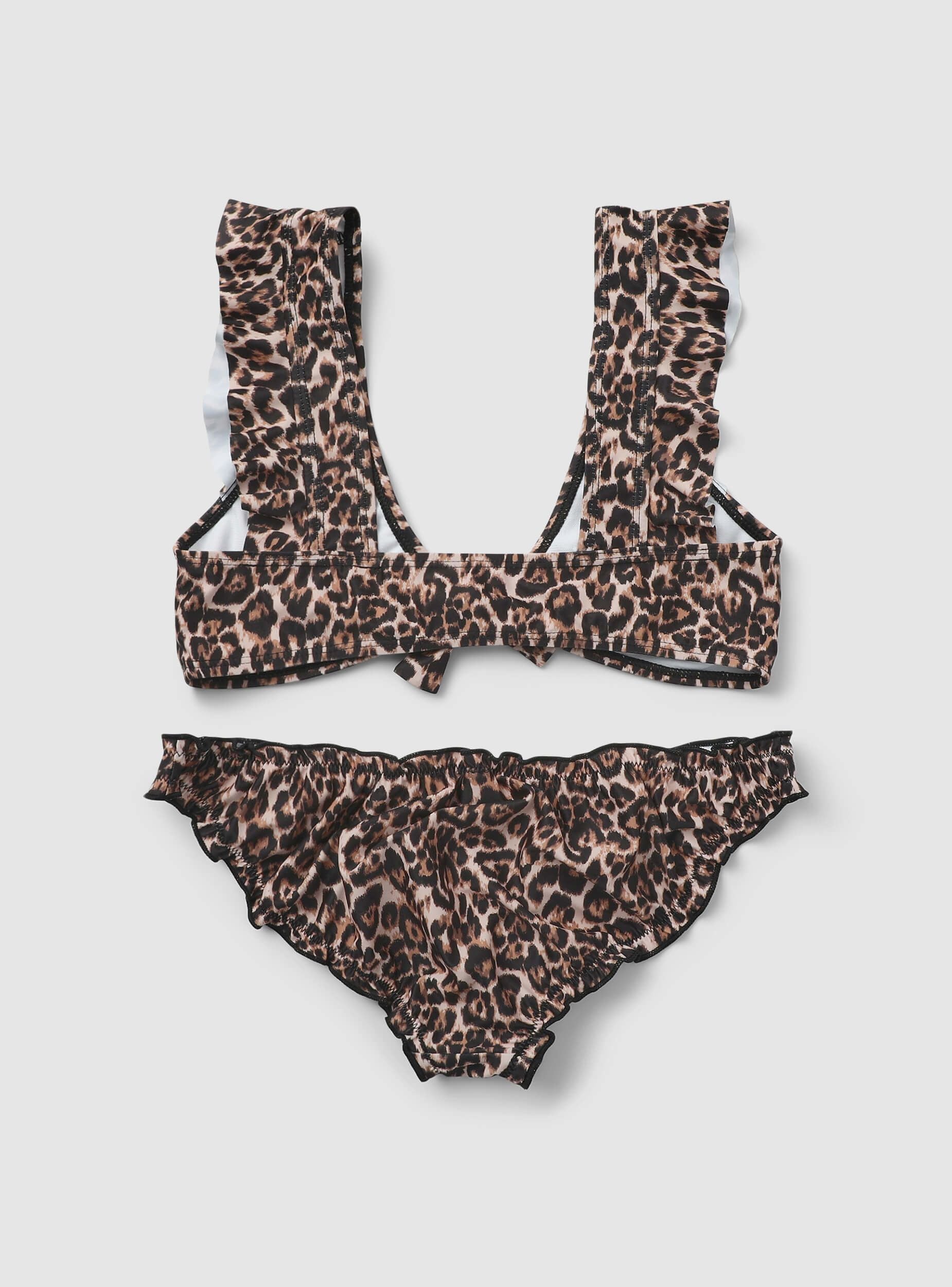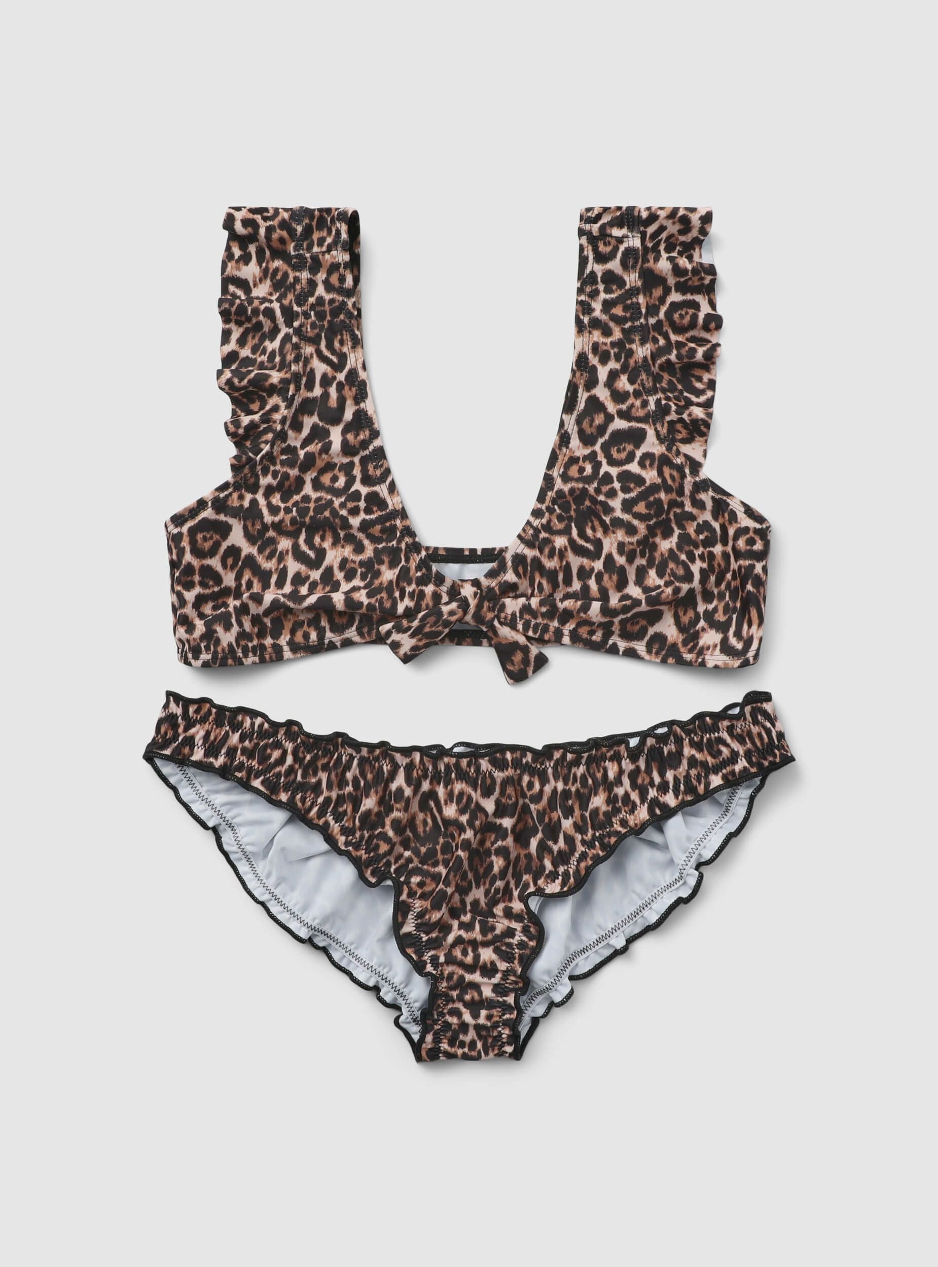Costume a 2 pezzi da bambina con un grintoso motivo maculato, perfetto per un look trendy in spiaggia o in piscina. Il bikini presenta un top a triangolo con volant sulle spalline e fiocco sul davanti, per un tocco di dolcezza e originalità. Lo slip coordinato assicura una vestibilità confortevole. Ideale da abbinare a un copricostume leggero e sandali colorati per un'estate all'insegna dello stile.
