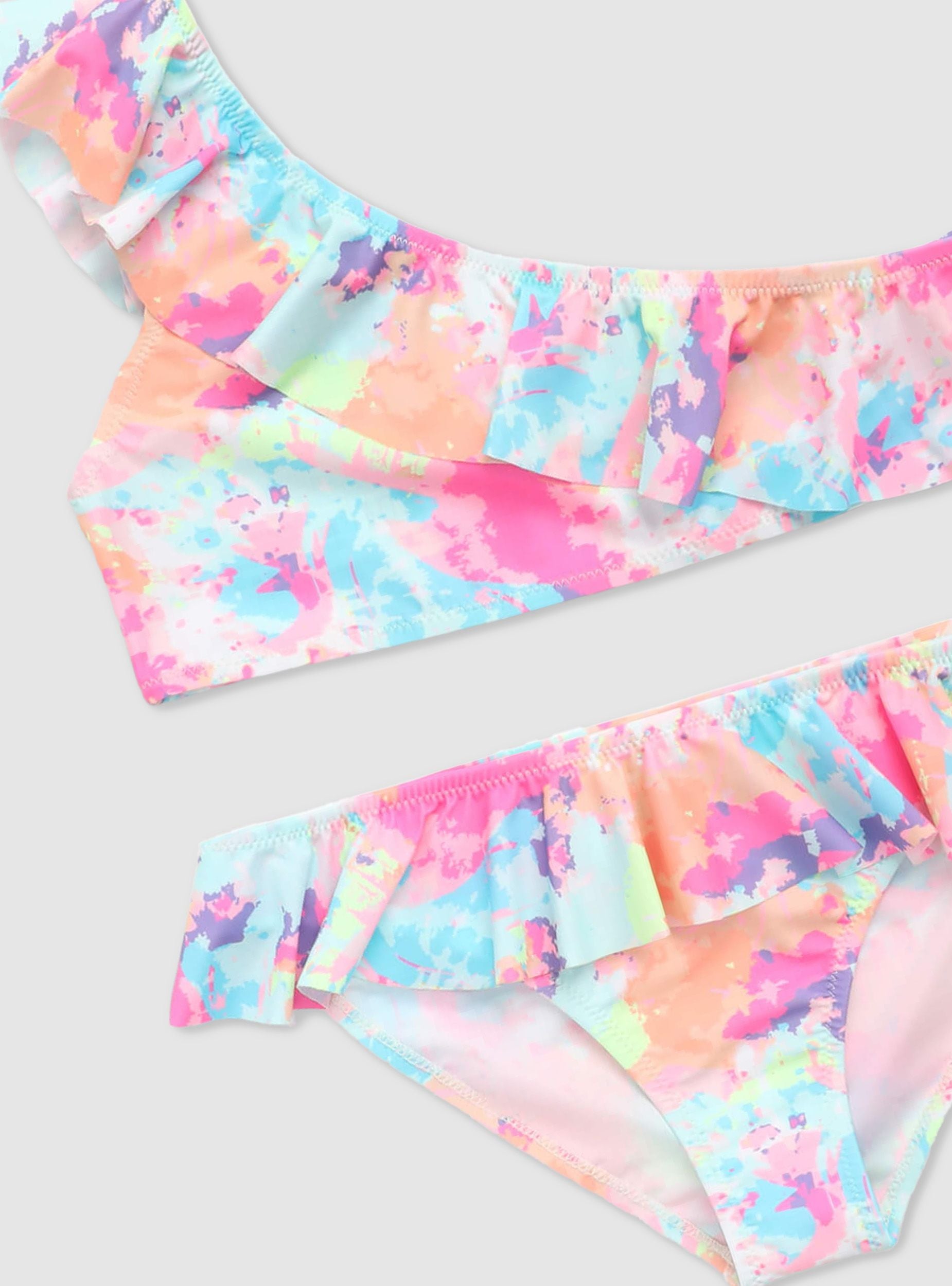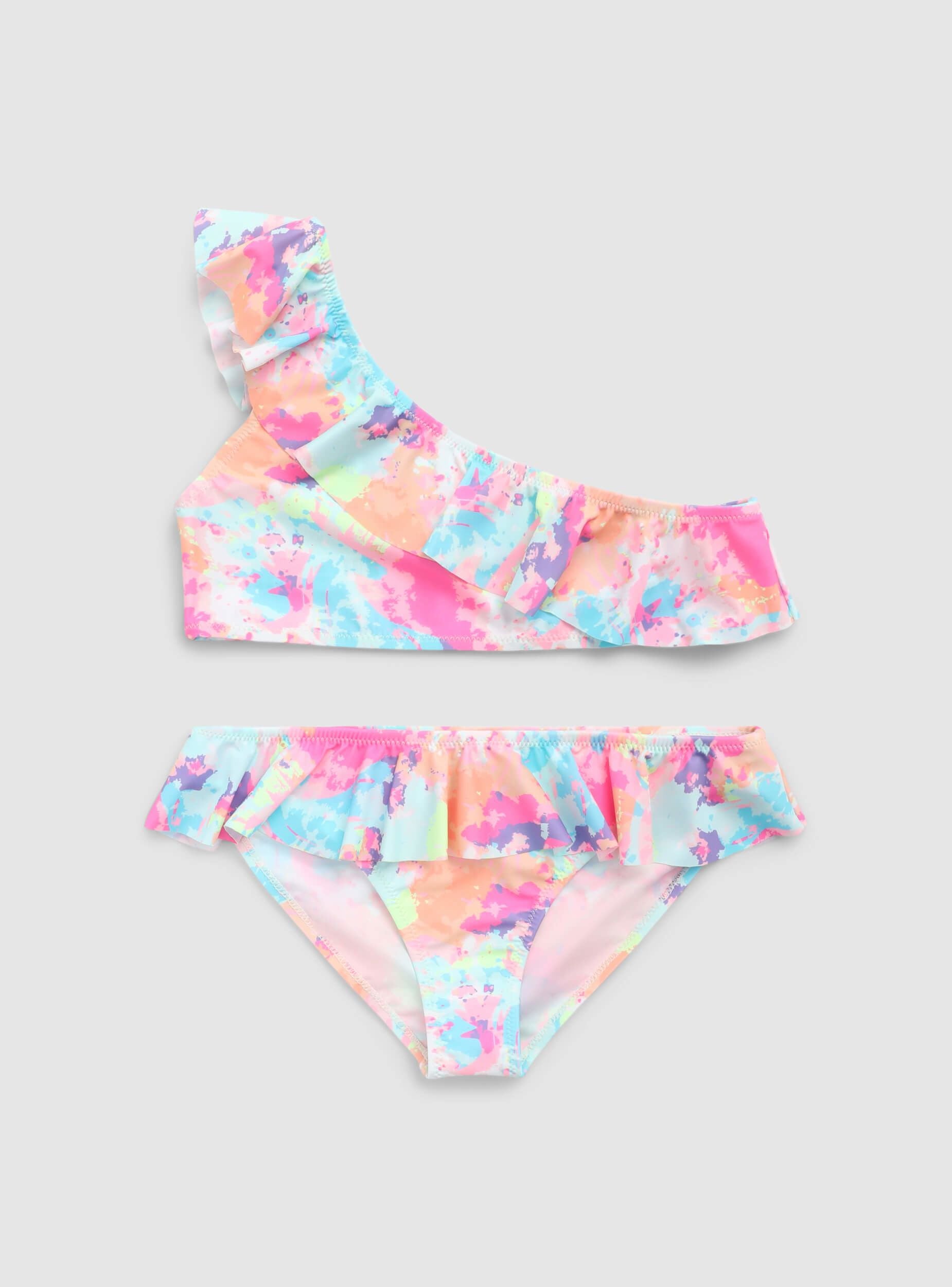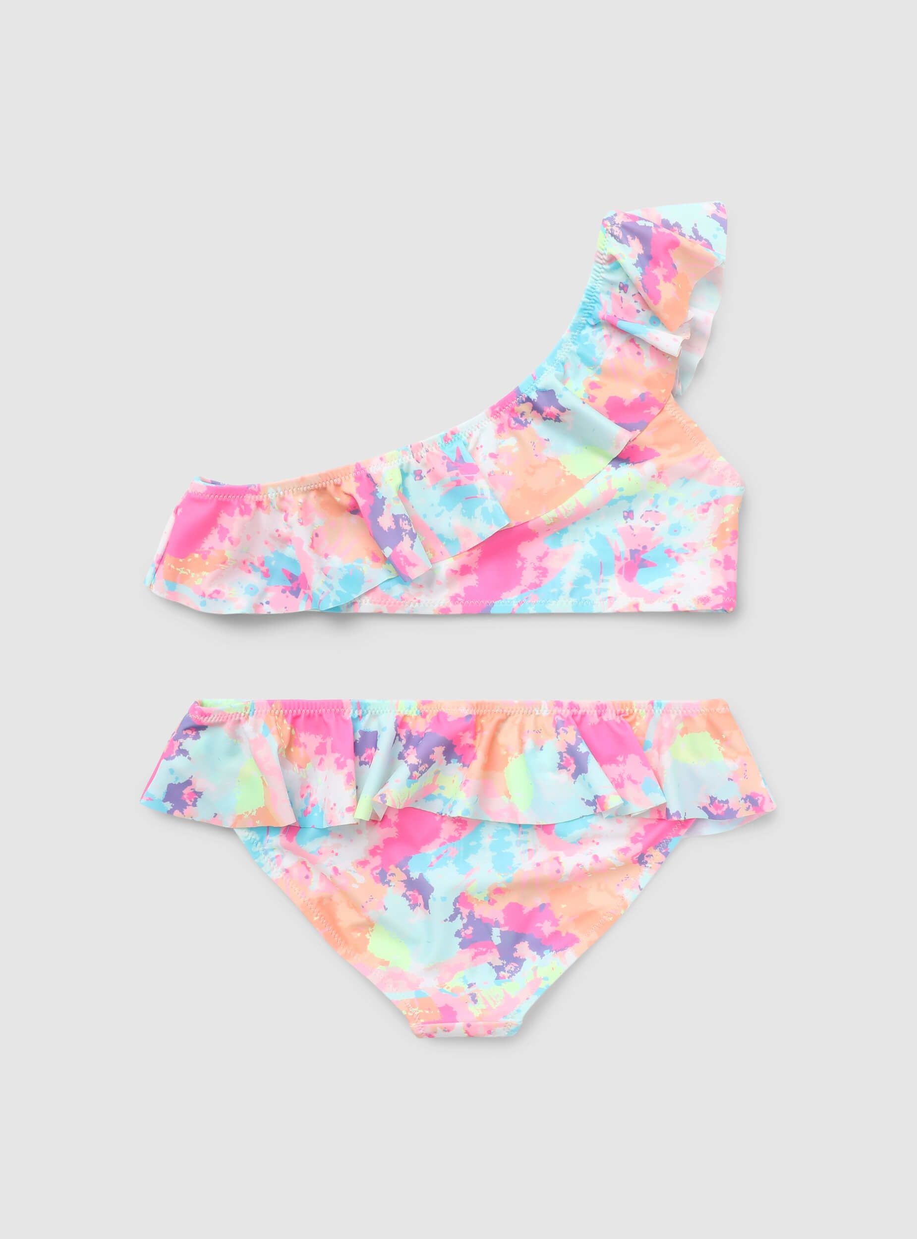 Costume a 2 pezzi da bambina perfetto per un'estate all'insegna del colore e del divertimento in spiaggia o in piscina. Il bikini monospalla aggiunge un tocco di originalità, mentre la balza dona movimento e femminilità. La fantasia tie-dye lo rende vivace e trendy, ideale da abbinare a un pareo leggero e sandali colorati per un look solare e spensierato.Dettagli