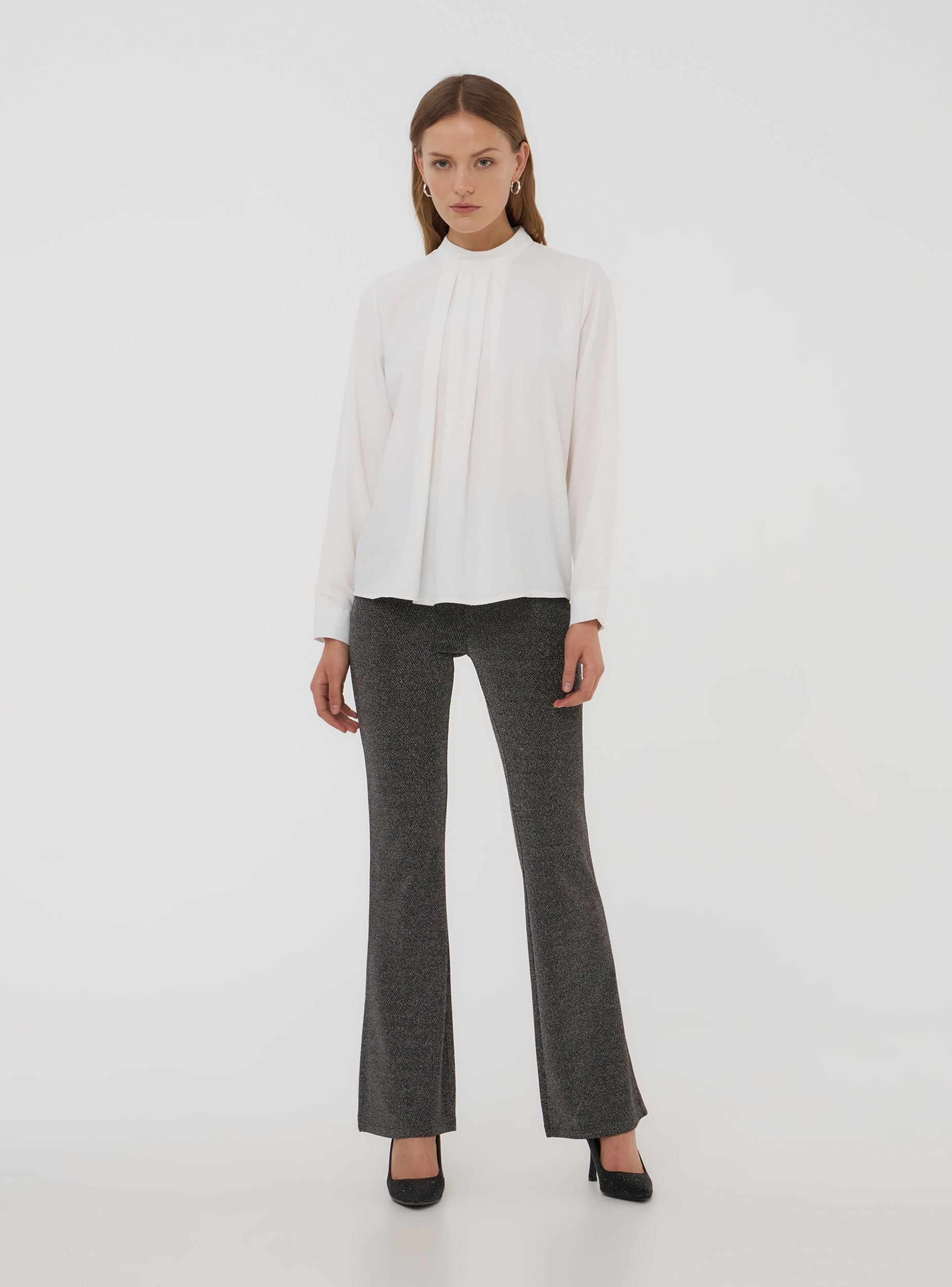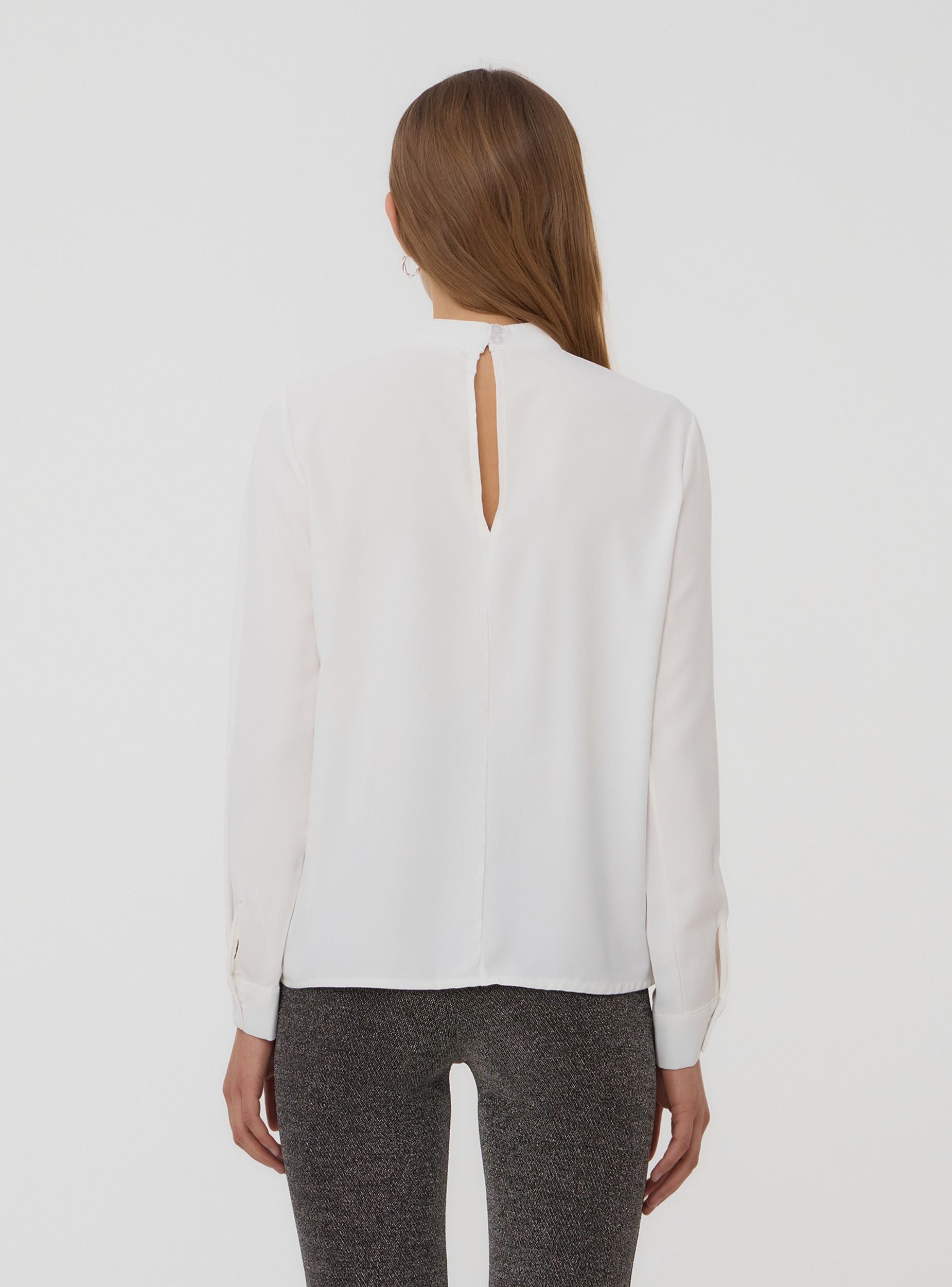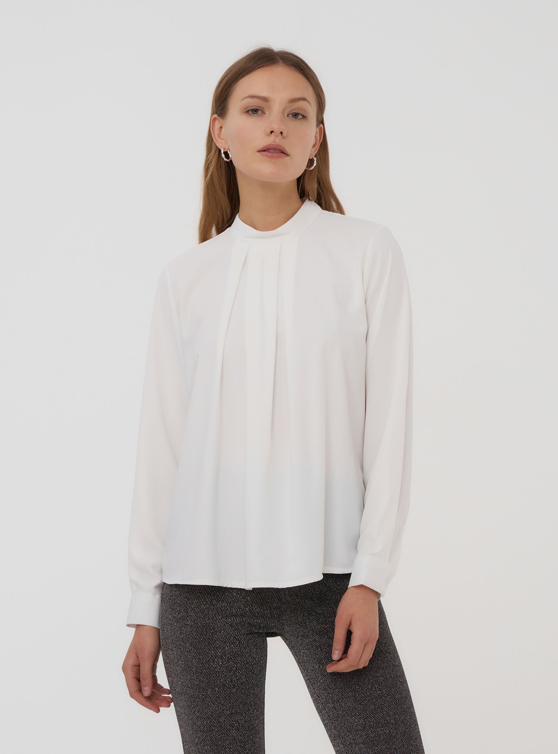 Camicia da donna a tinta unita, dal design sofisticato, caratterizzata da un elegante lupetto che dona un tocco contemporaneo e raffinato. La piega centrale sul davanti aggiunge movimento e stile al capo, valorizzandone la silhouette con un dettaglio ricercato. Le maniche lunghe con polsini completano il look, rendendola una scelta ideale per diverse occasioni, sia per contesti professionali che per eventi serali. Perfetta per chi desidera un capo versatile e di tendenza, facile da abbinare a pantaloni o gonne per un effetto elegante e moderno.