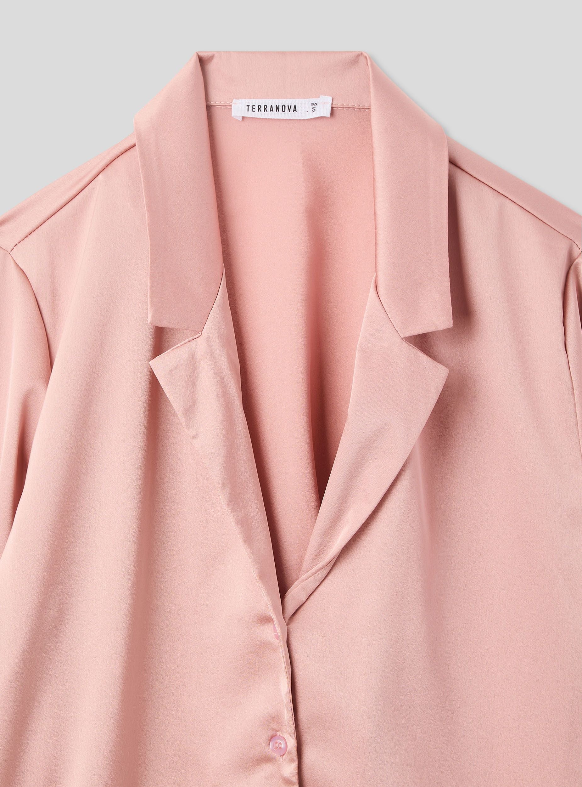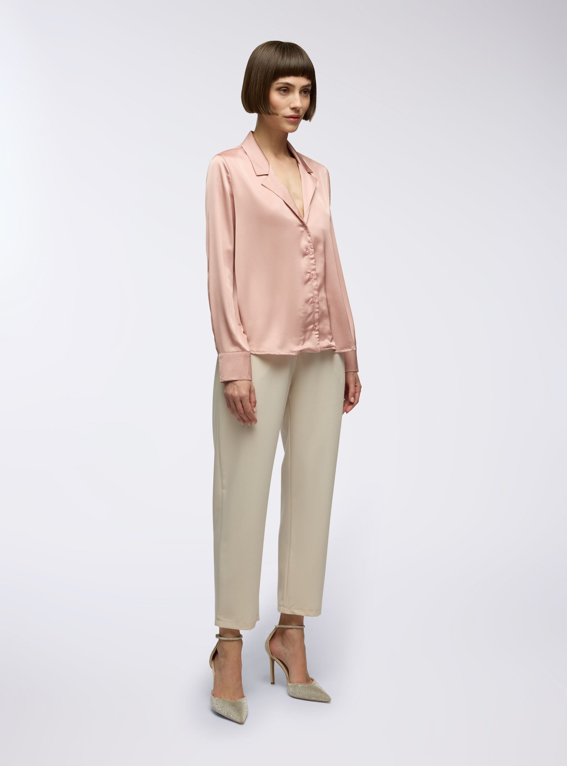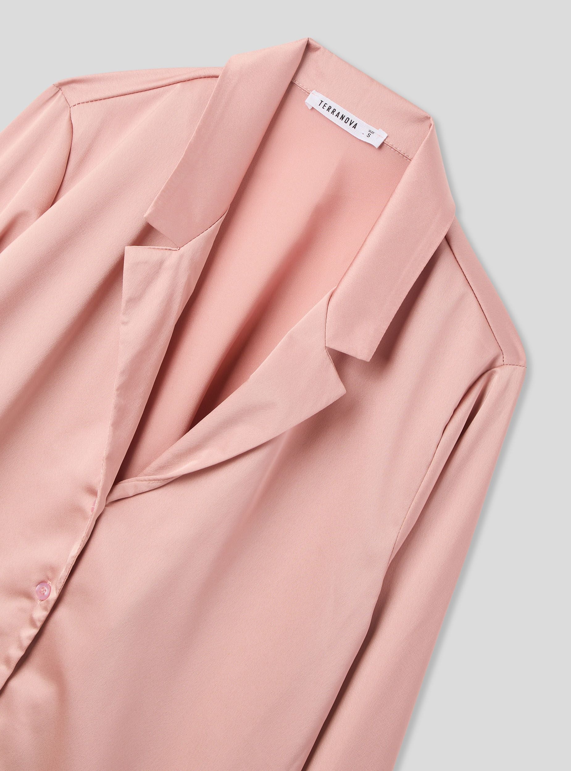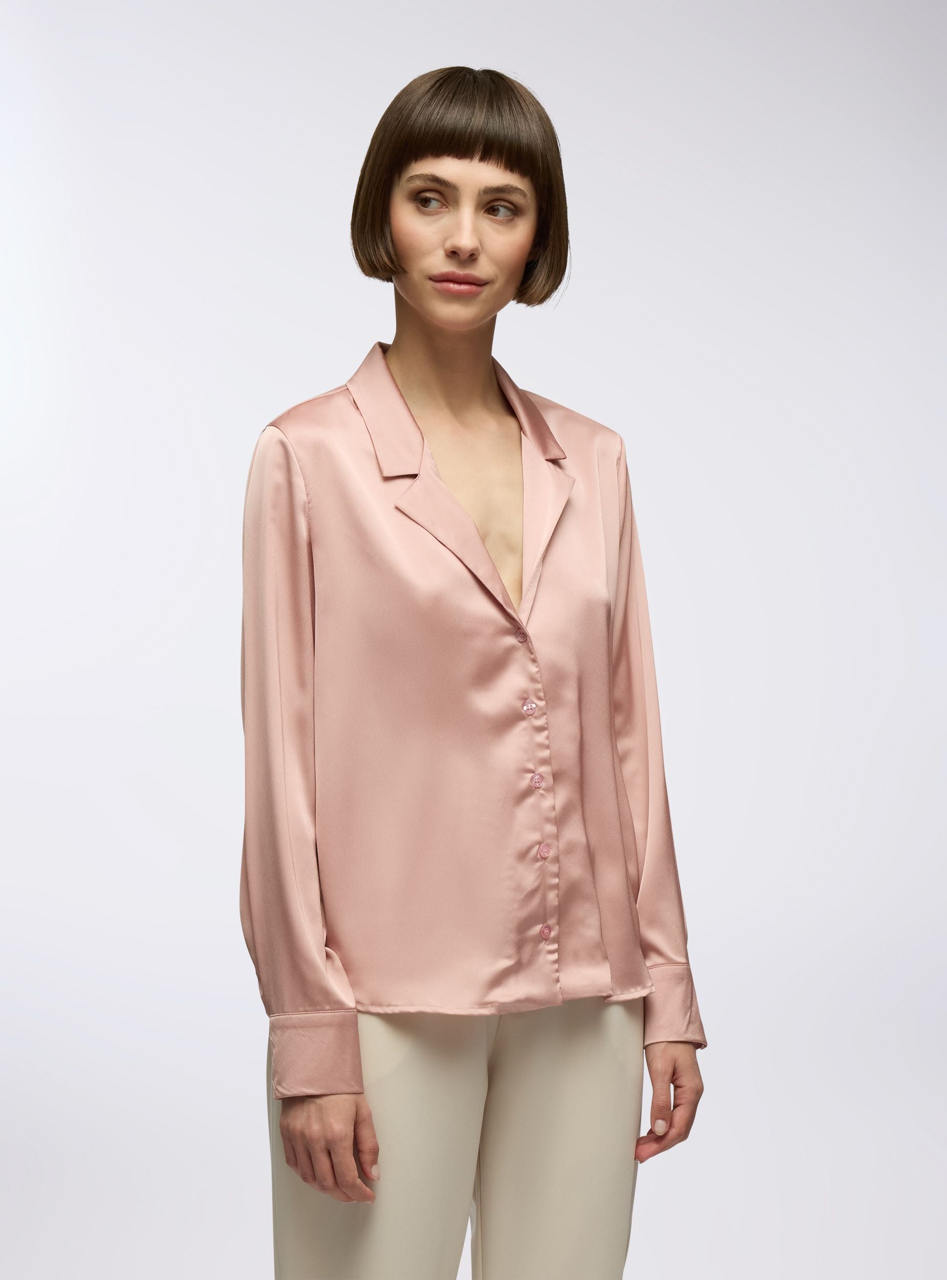 Camicia da donna ideale per un look elegante e sofisticato, perfetta per occasioni formali o per un outfit da ufficio. Caratterizzata da una vestibilità regolare, presenta un design con revers, realizzata in tessuto effetto raso a tinta unita, dotata di maniche lunghe e chiusura con bottoni in tono. Una scelta versatile per chi cerca stile e comfort in ogni occasione.