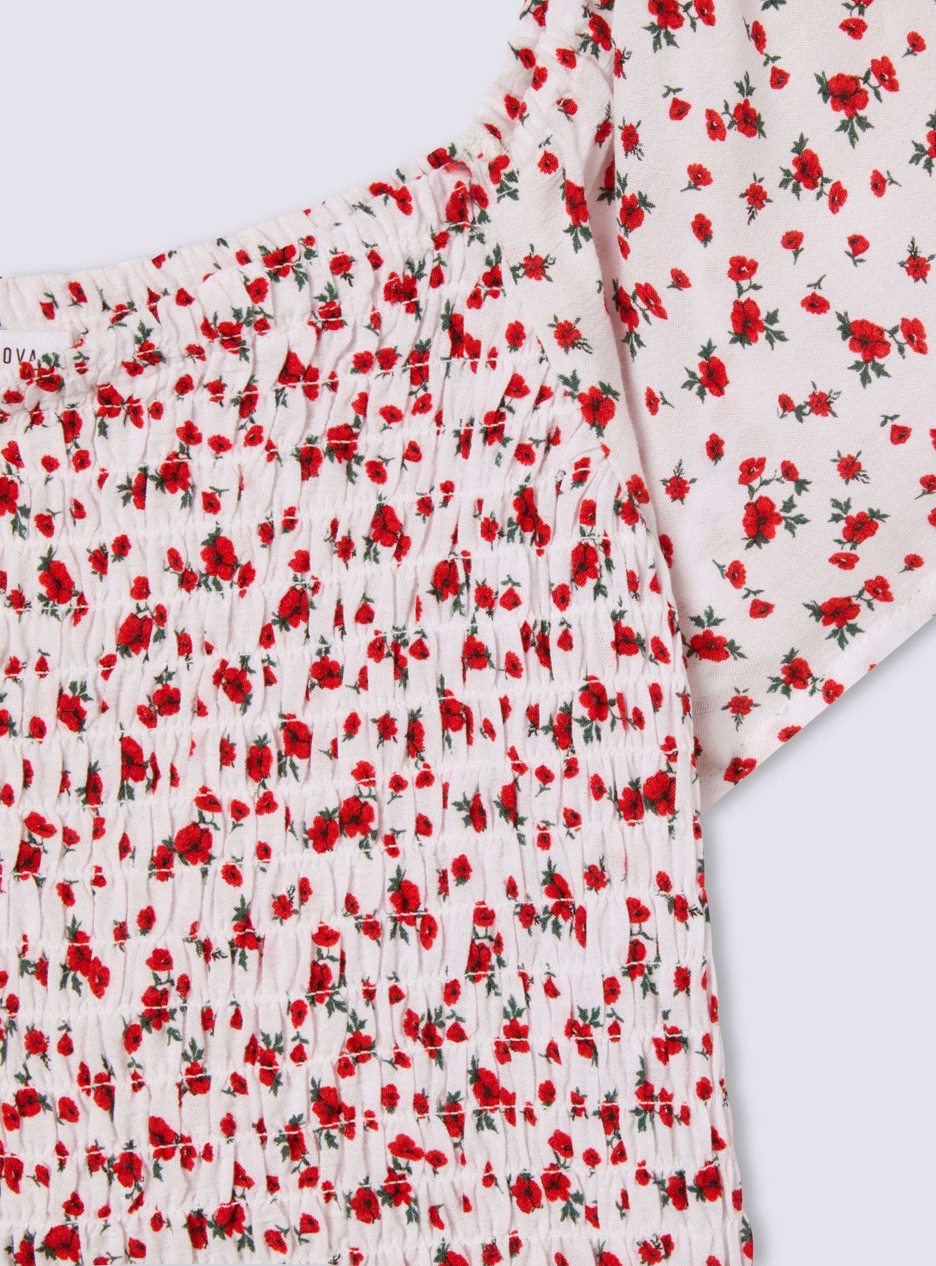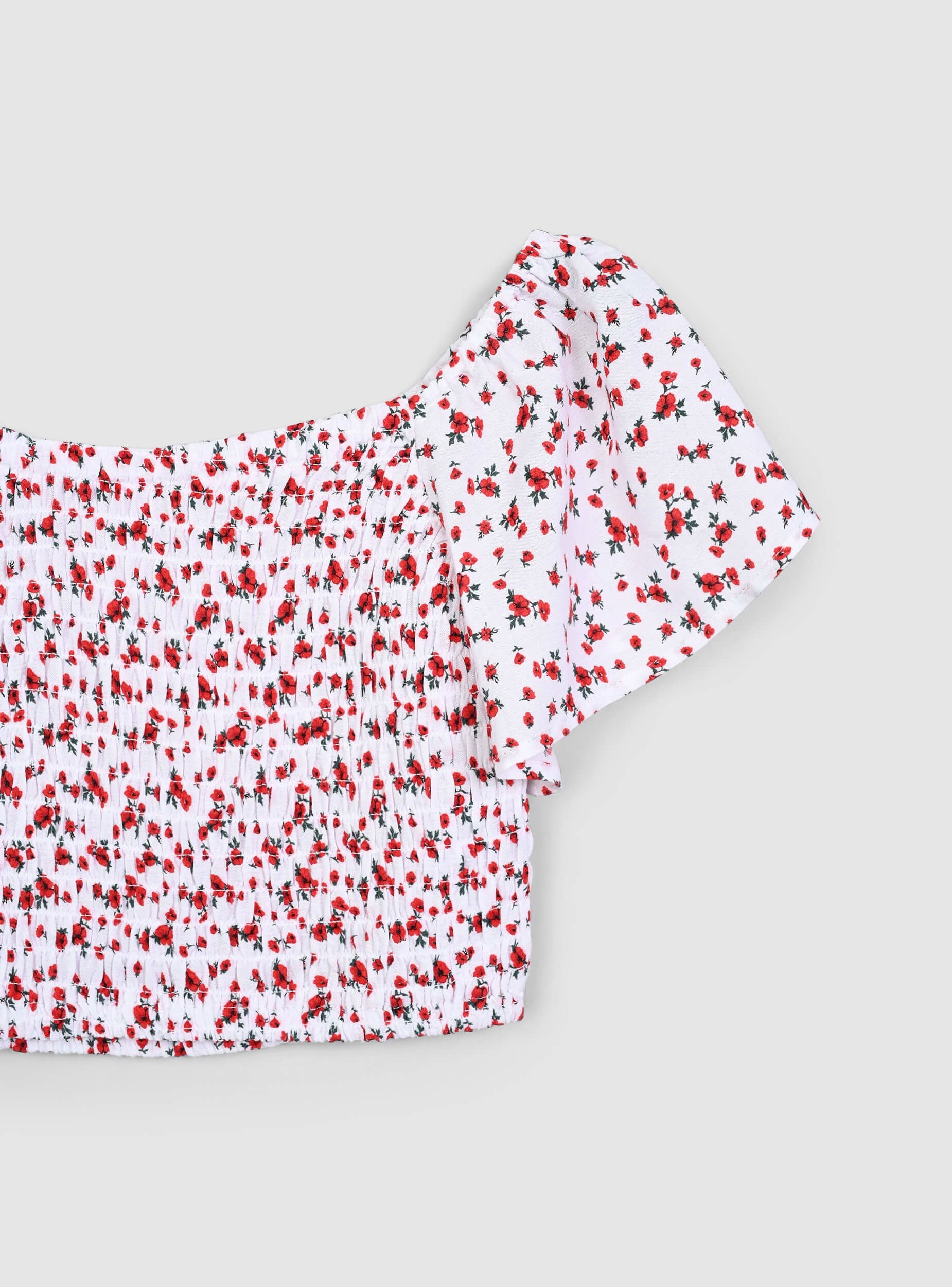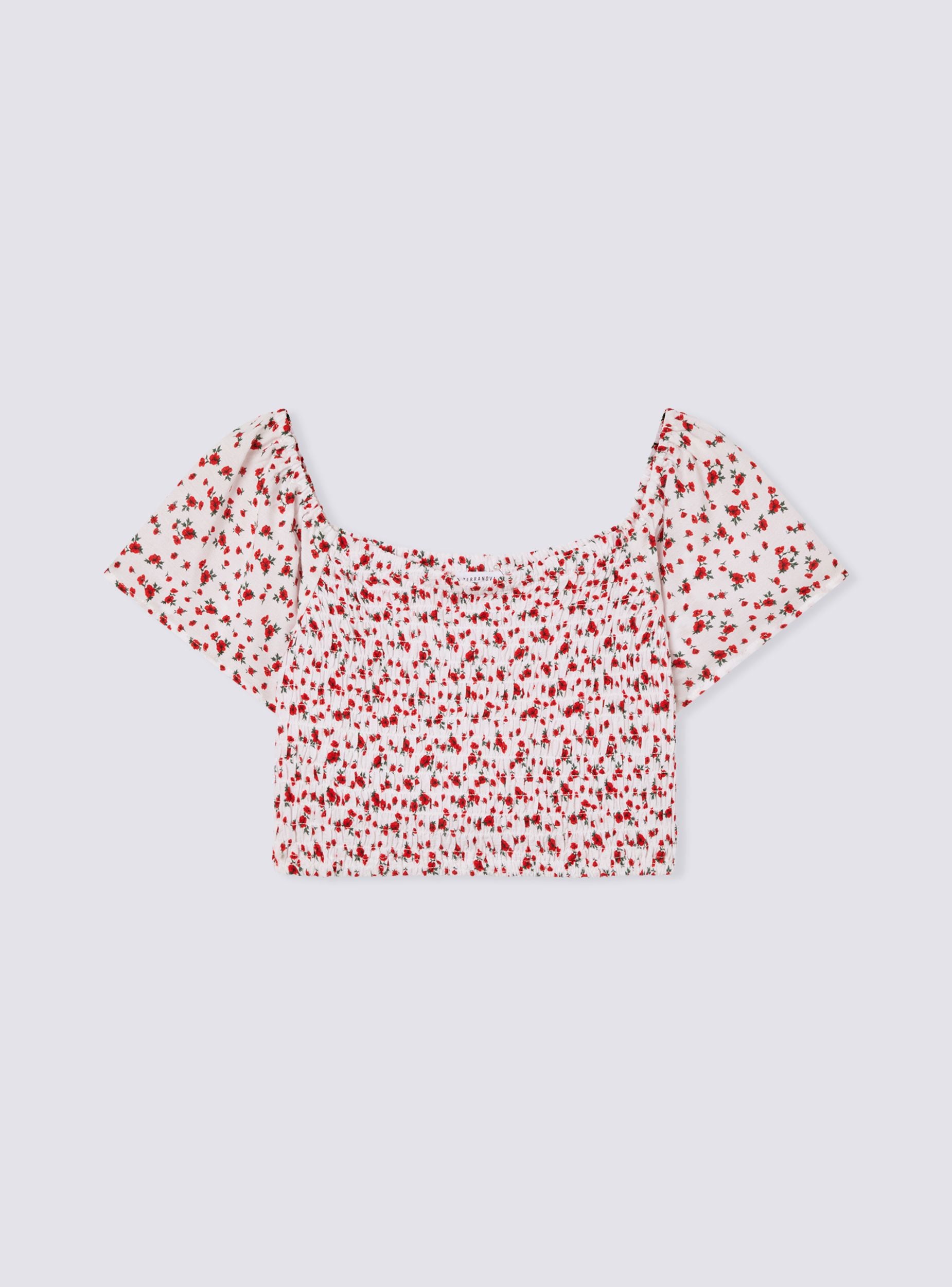 Blusa da donna crop con punto smock, caratterizzata da una delicata stampa floreale che aggiunge un tocco romantico e femminile. Vestibilità confortevole e valorizzante. Le ampie maniche donano leggerezza e movimento. Perfetta per look estivi e casual, si abbina facilmente a gonne o pantaloni a vita alta per un outfit fresco e armonioso.