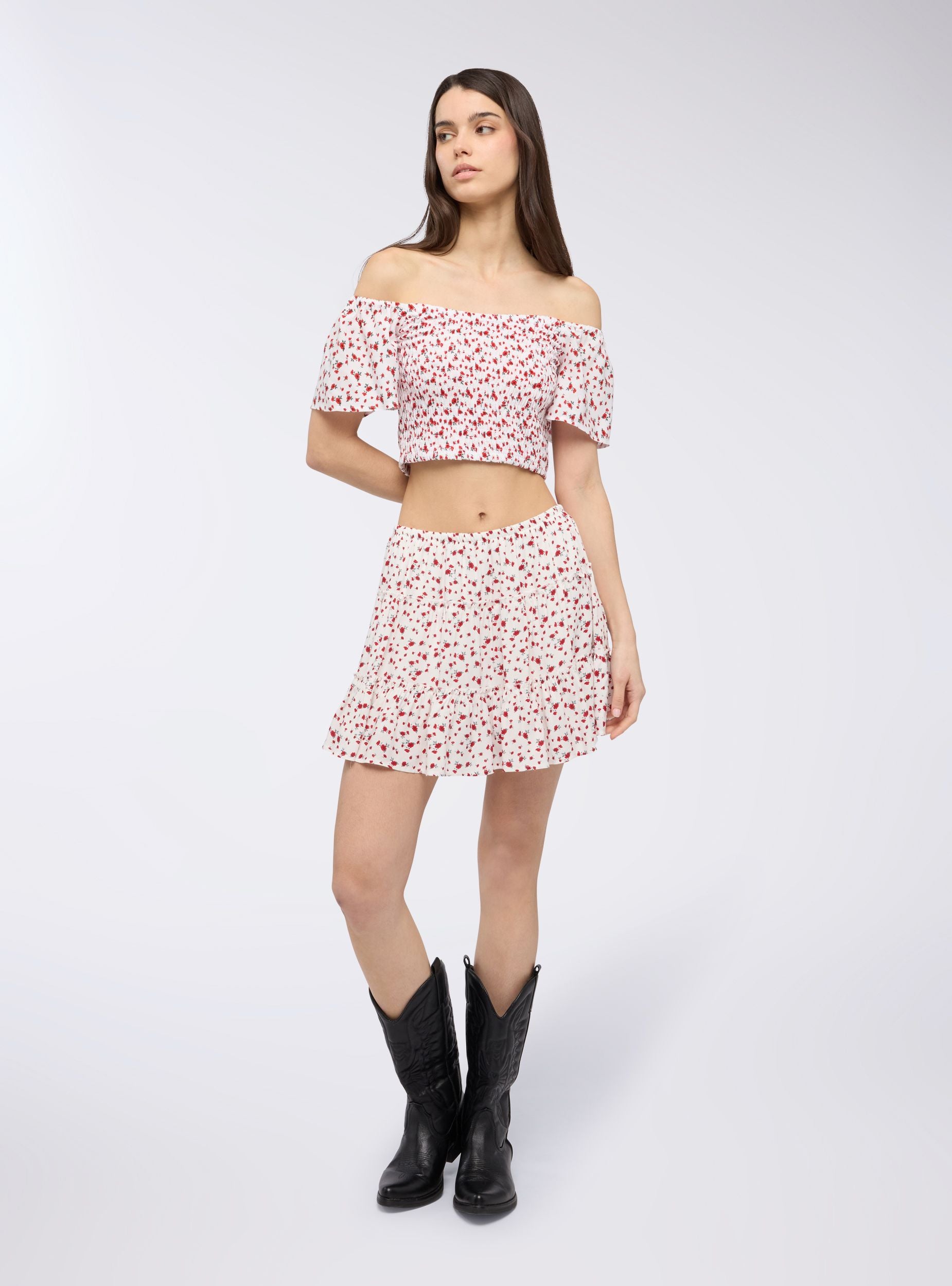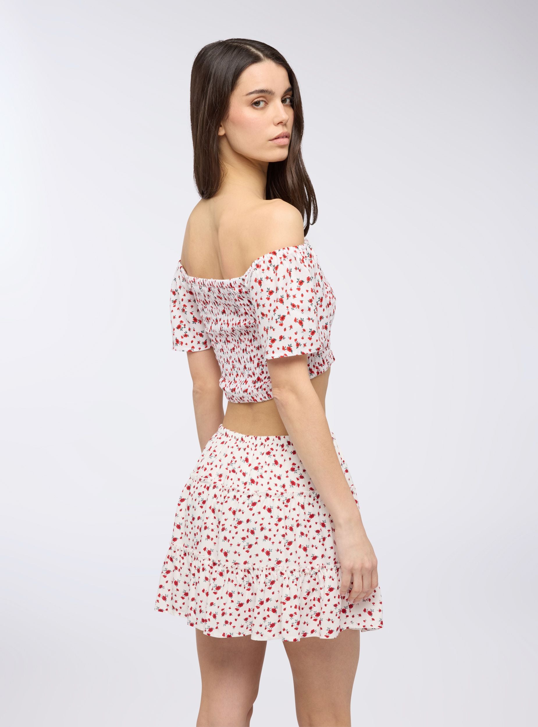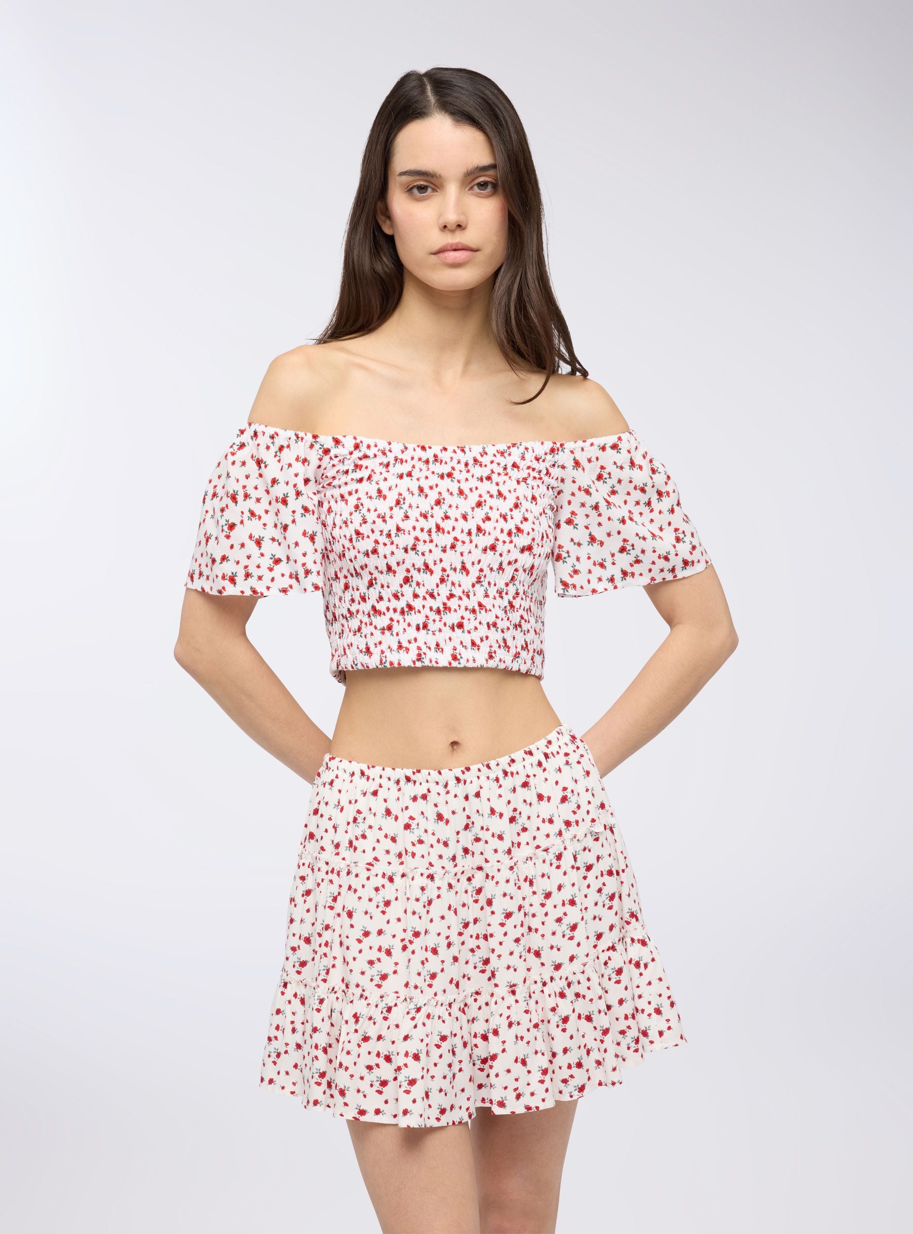 Blusa da donna crop con punto smock, caratterizzata da una delicata stampa floreale che aggiunge un tocco romantico e femminile. Vestibilità confortevole e valorizzante. Le ampie maniche donano leggerezza e movimento. Perfetta per look estivi e casual, si abbina facilmente a gonne o pantaloni a vita alta per un outfit fresco e armonioso.