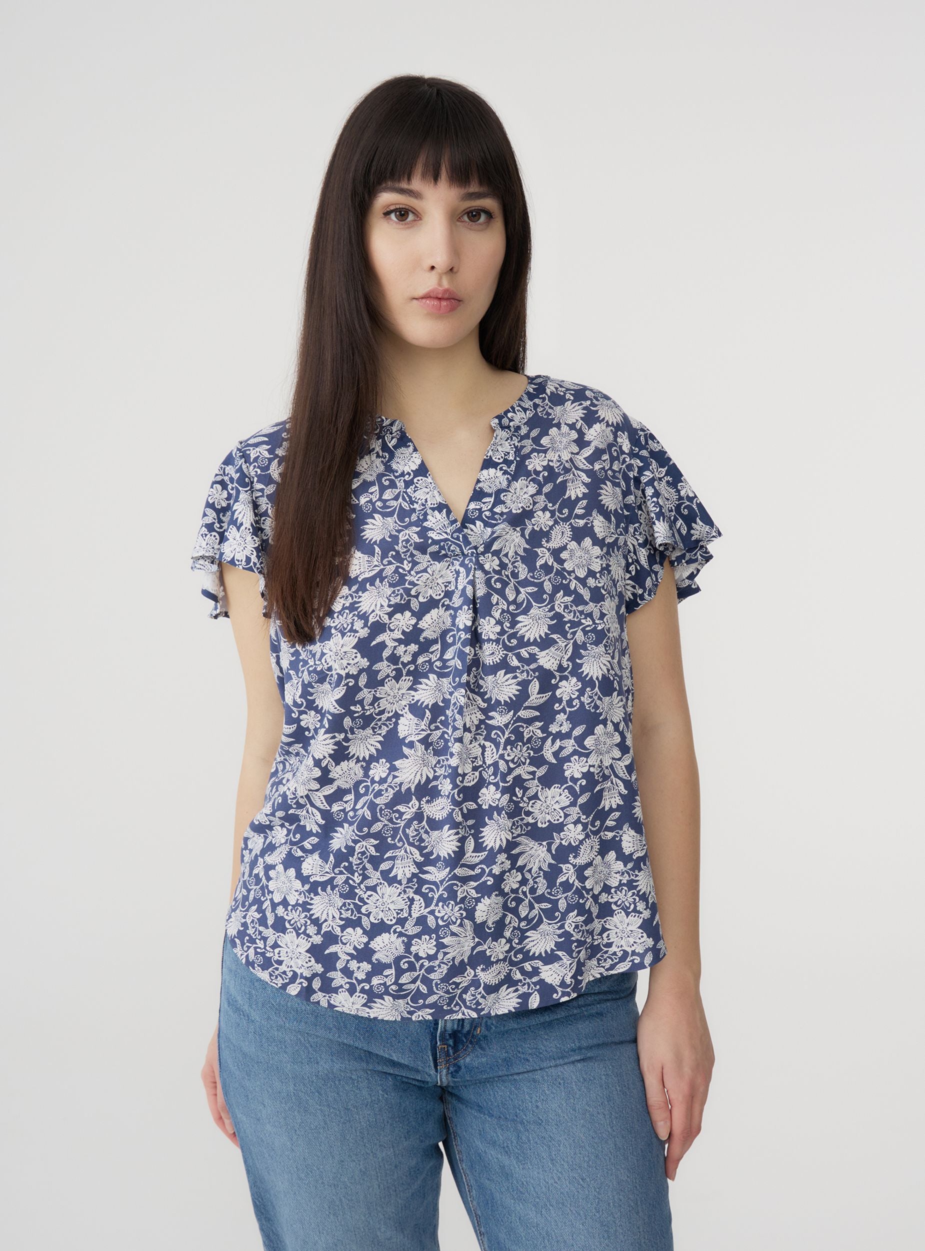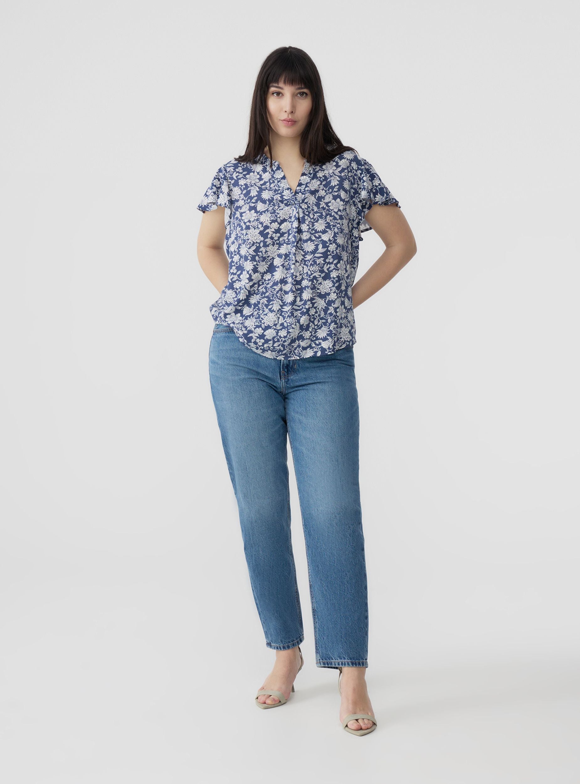 Blusa da donna con un'elegante fantasia che dona un tocco distintivo e ricercato al look. Il design con maniche corte assicura freschezza e leggerezza, ideale per le giornate più calde. Lo scollo a V aggiunge un dettaglio raffinato. Perfetta da abbinare a pantaloni o gonne per un outfit versatile, adatto sia al tempo libero che alle occasioni più ricercate.
