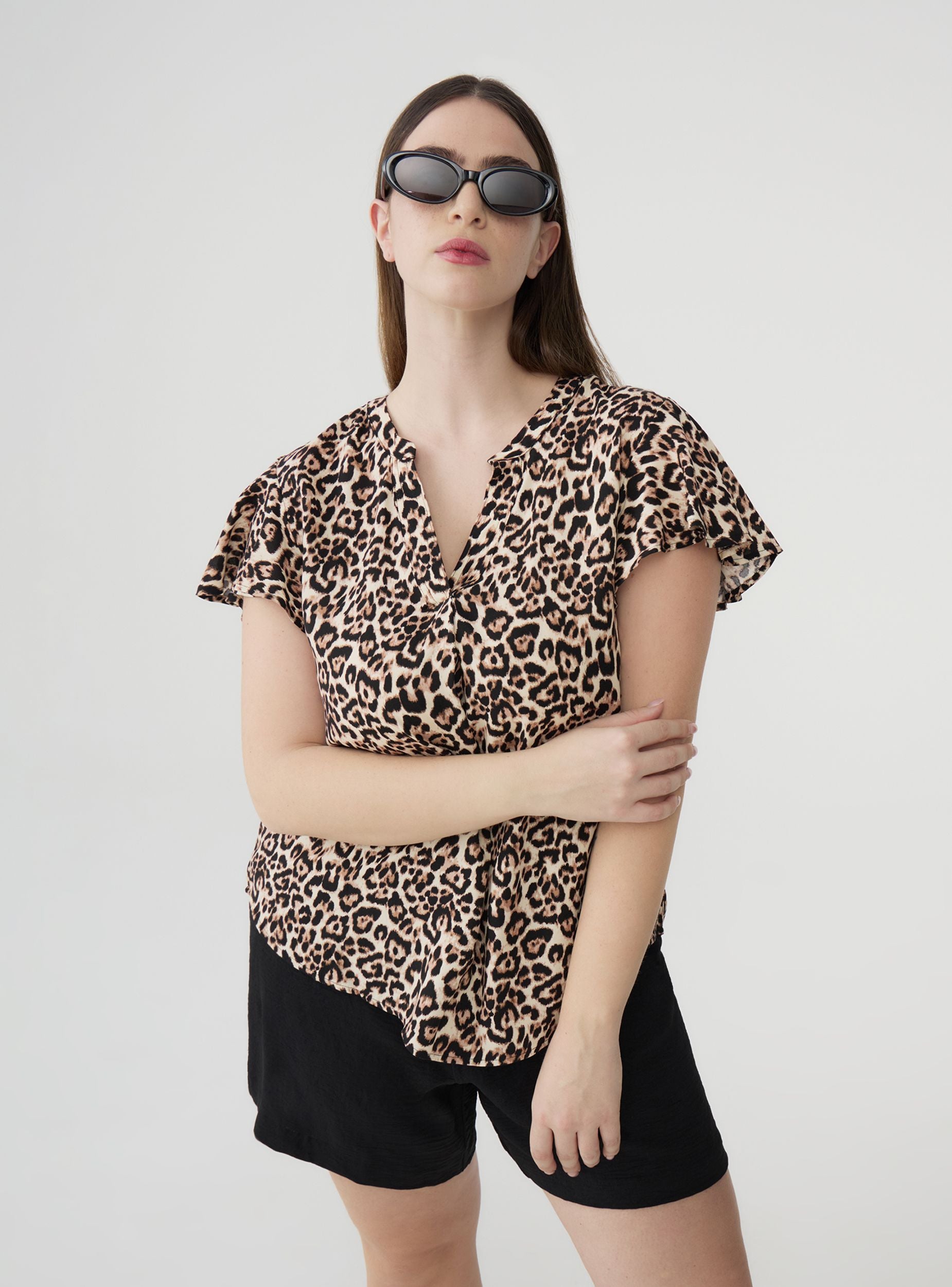 Blusa da donna con una grintosa fantasia animalier, ideale per aggiungere un tocco deciso al guardaroba. Il design con maniche corte dona leggerezza e comfort, perfetto per la stagione calda. Dotata di scollo a V crea un look femminile e versatile. Perfetta da indossare con jeans o gonne per un outfit che unisce carattere e praticità, adattandosi a diverse occasioni con facilità.