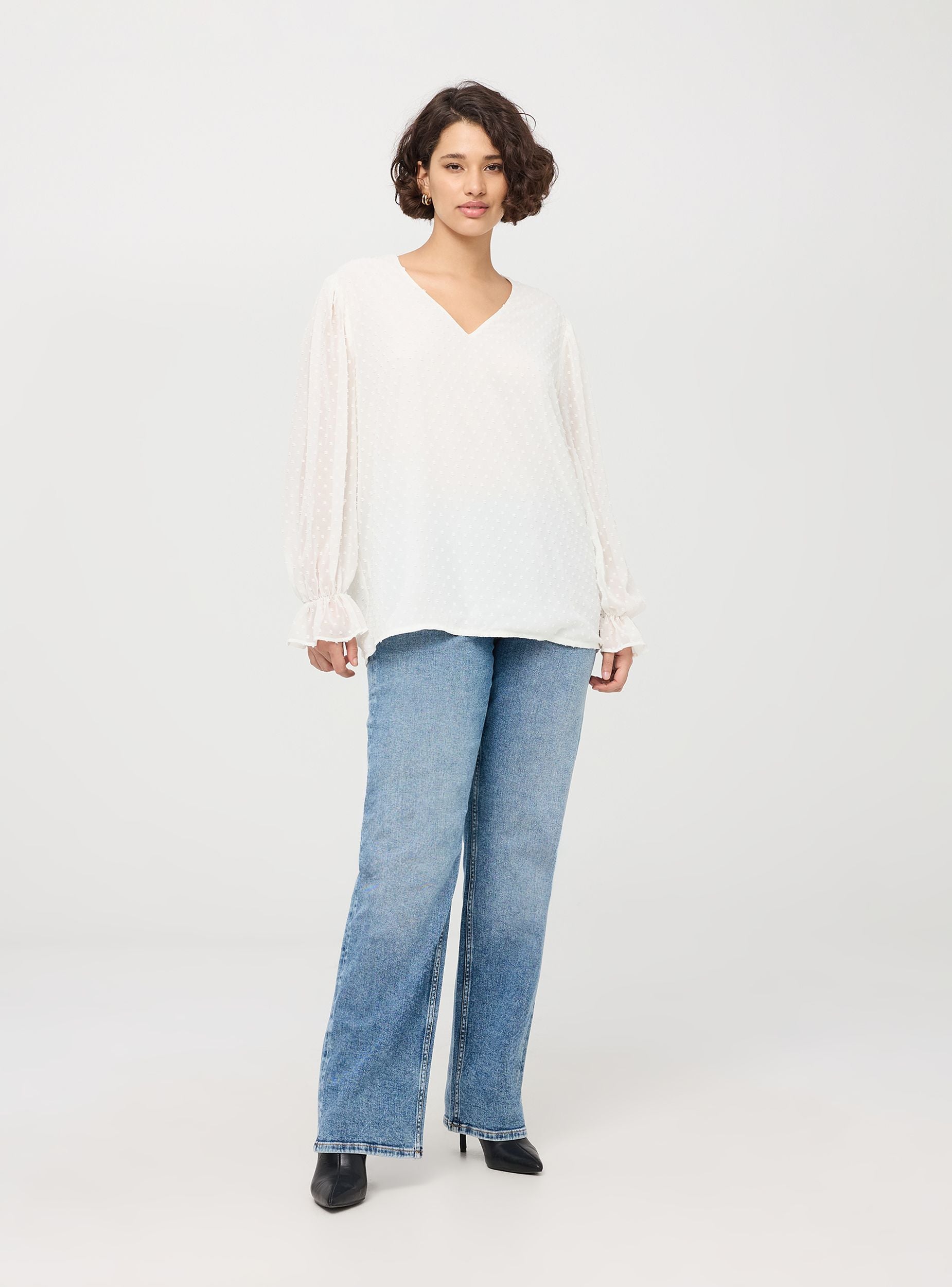Blusa da donna realizzata in chiffon con un delicato design a pois in rilievo. Modello con scollo a V e maniche lunghe a palloncino con dettaglio a balza sui polsini. La vestibilità è comoda e fluida, ideale per un look chic e raffinato. Perfetta per occasioni casual chic o per l’ufficio, aggiungerà un tocco di eleganza al tuo guardaroba quotidiano.Dettagli
