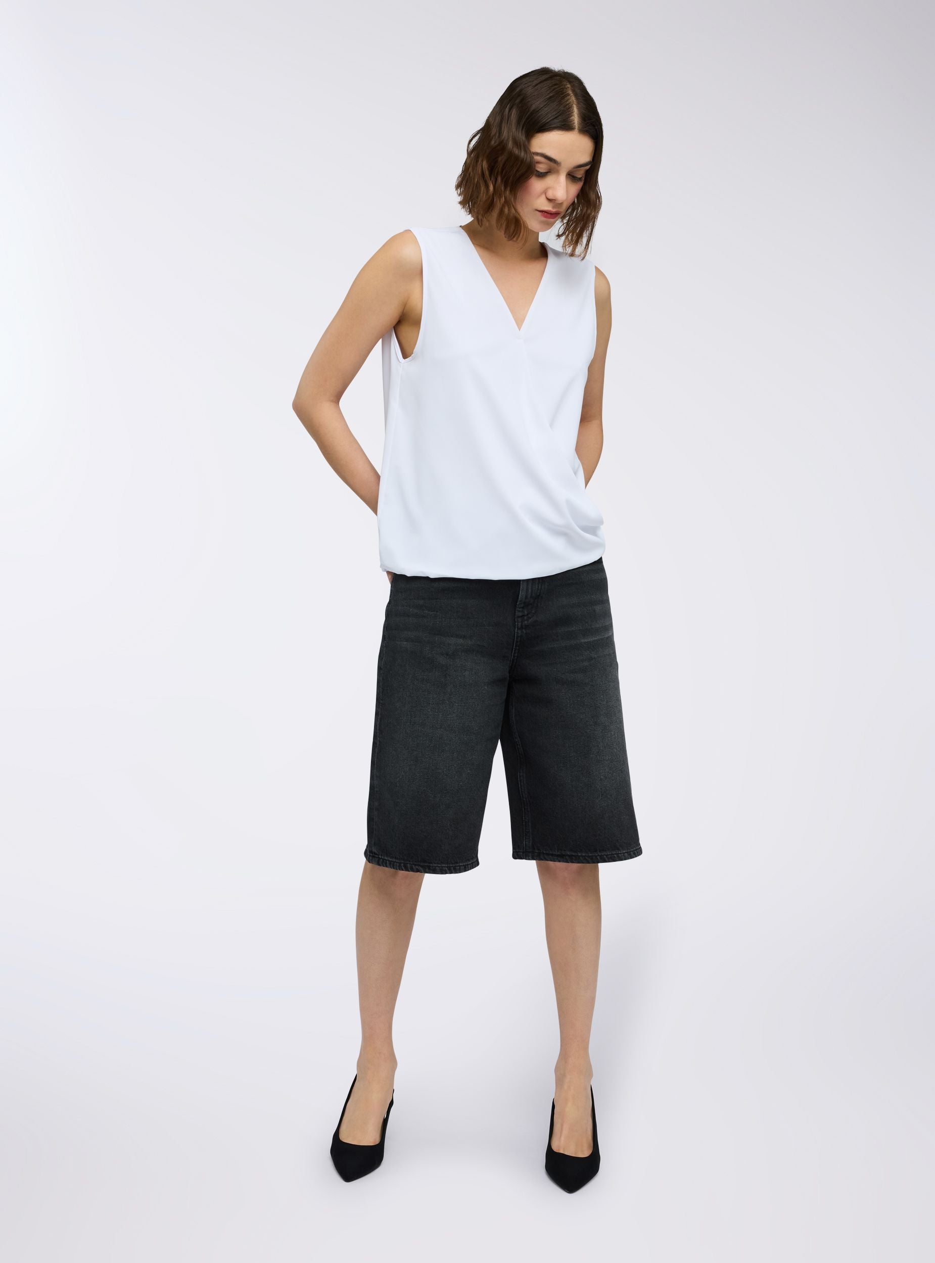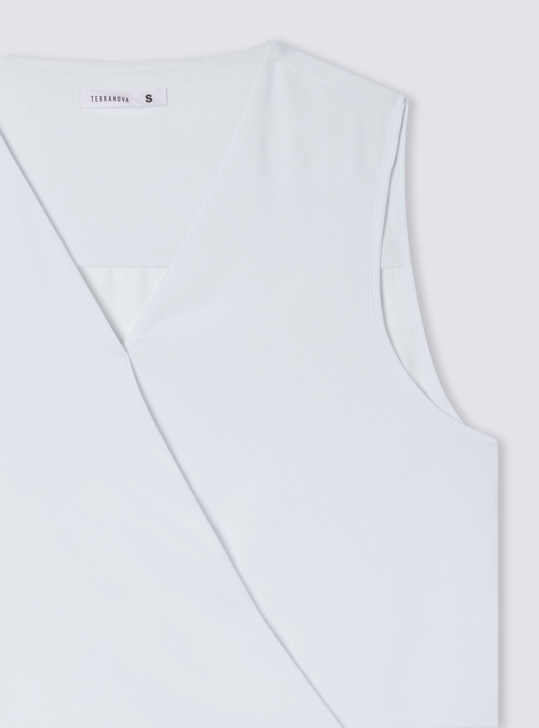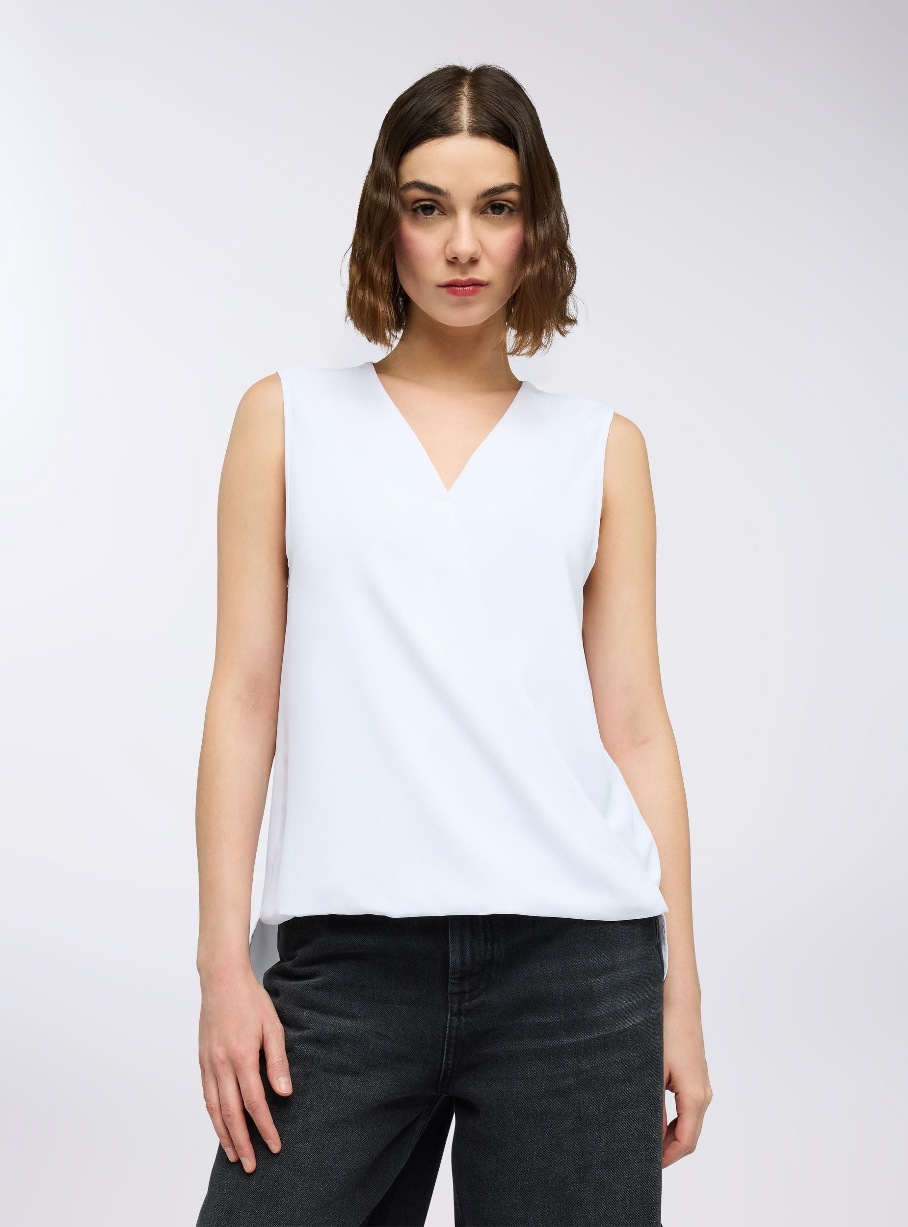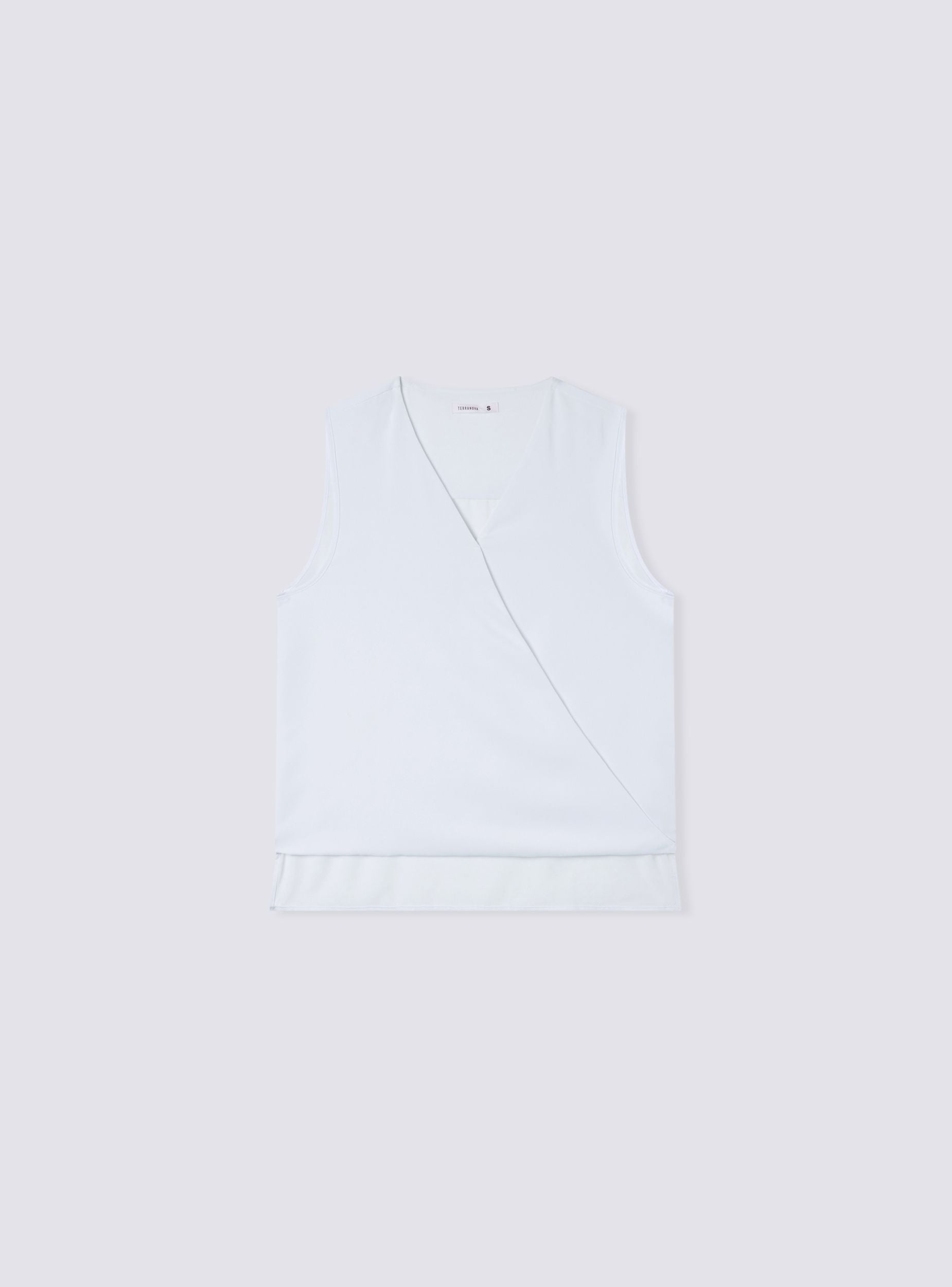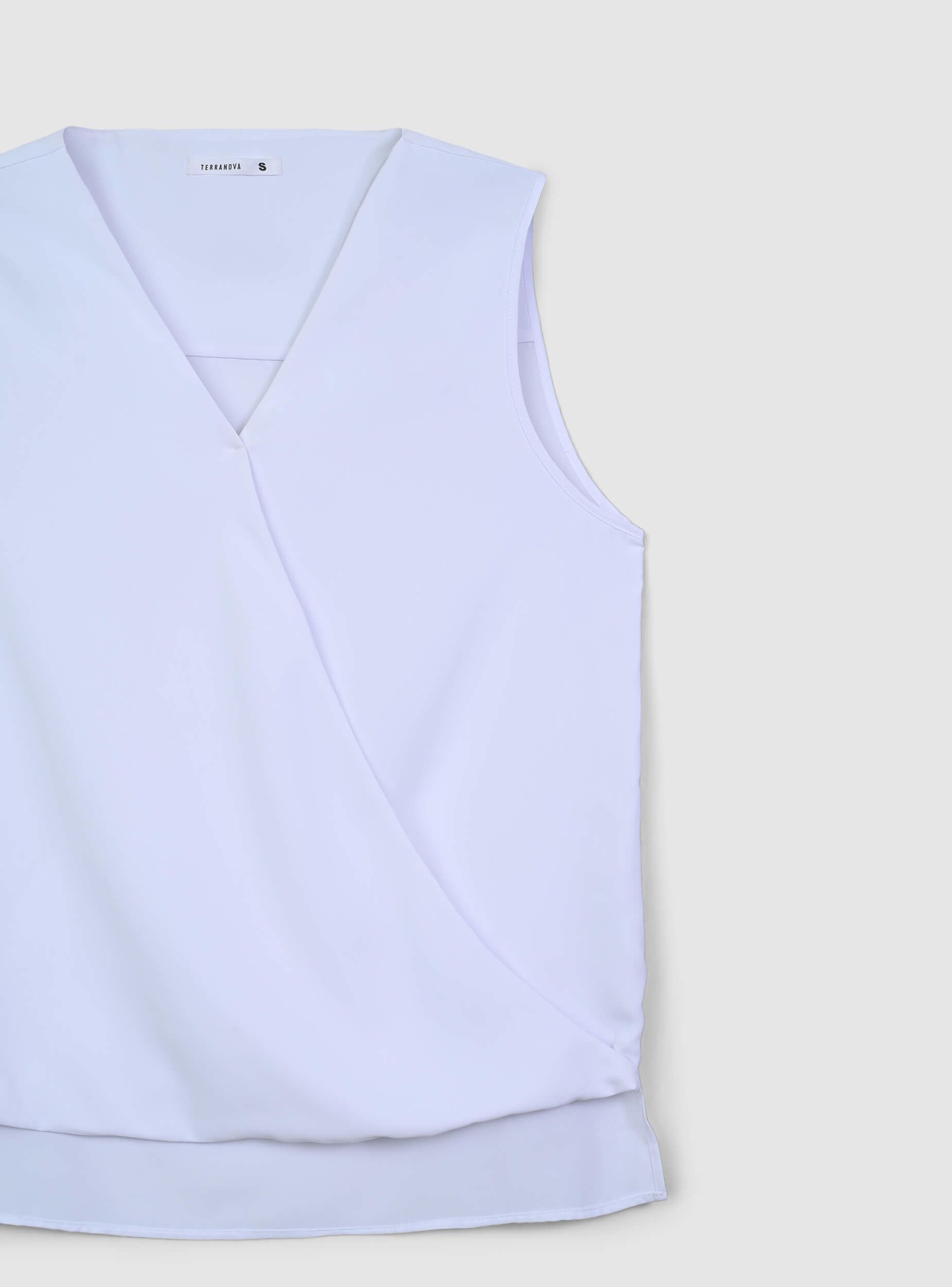 Camicetta da donna dalla linea essenziale e sofisticata, caratterizzata da un design incrociato che valorizza la silhouette con eleganza. Il taglio senza maniche la rende ideale per le giornate più calde, mentre l'incrocio aggiunge un tocco di dinamicità al look. La tinta unita la rende perfetta per abbinamenti versatili, sia con pantaloni sartoriali che con jeans, per un outfit sempre curato e raffinato.Dettagli