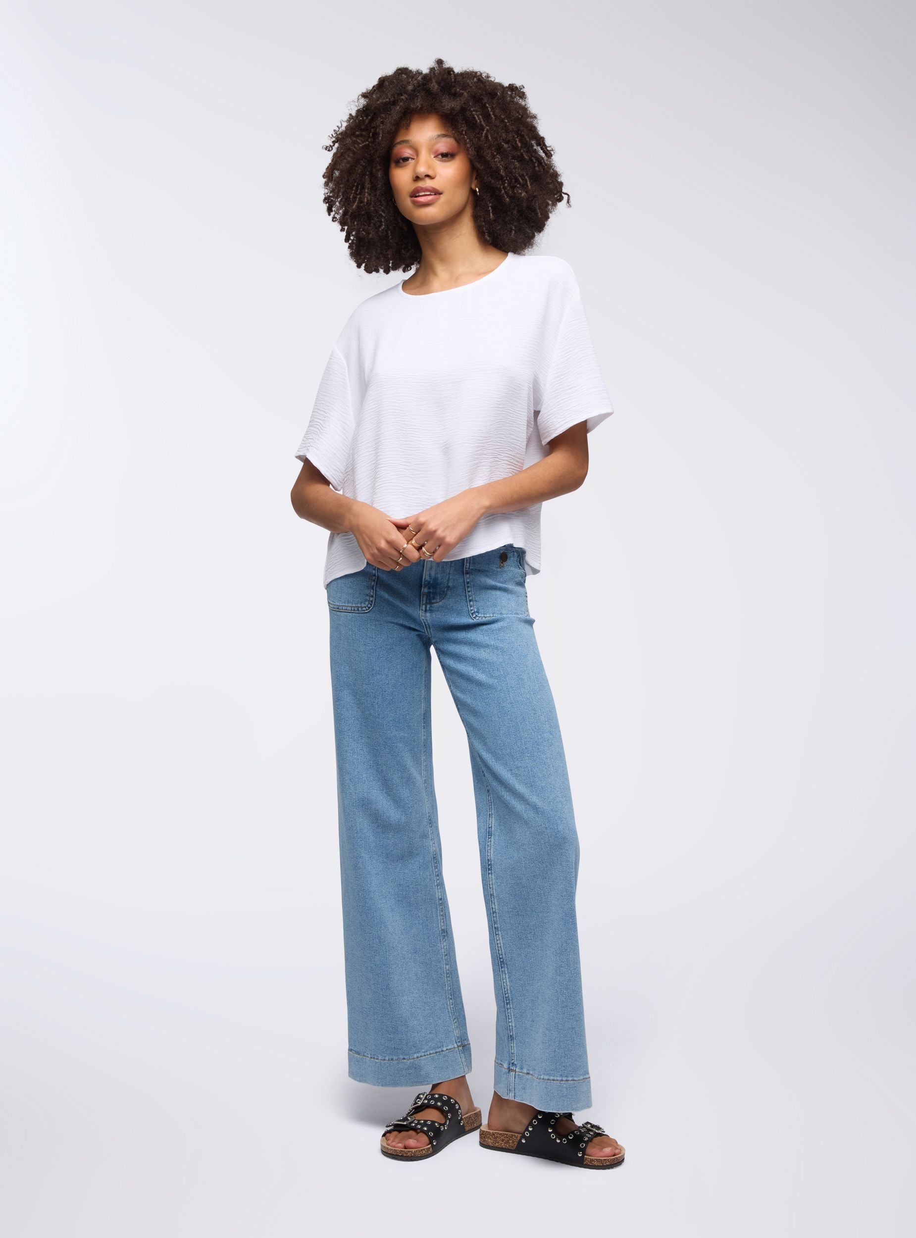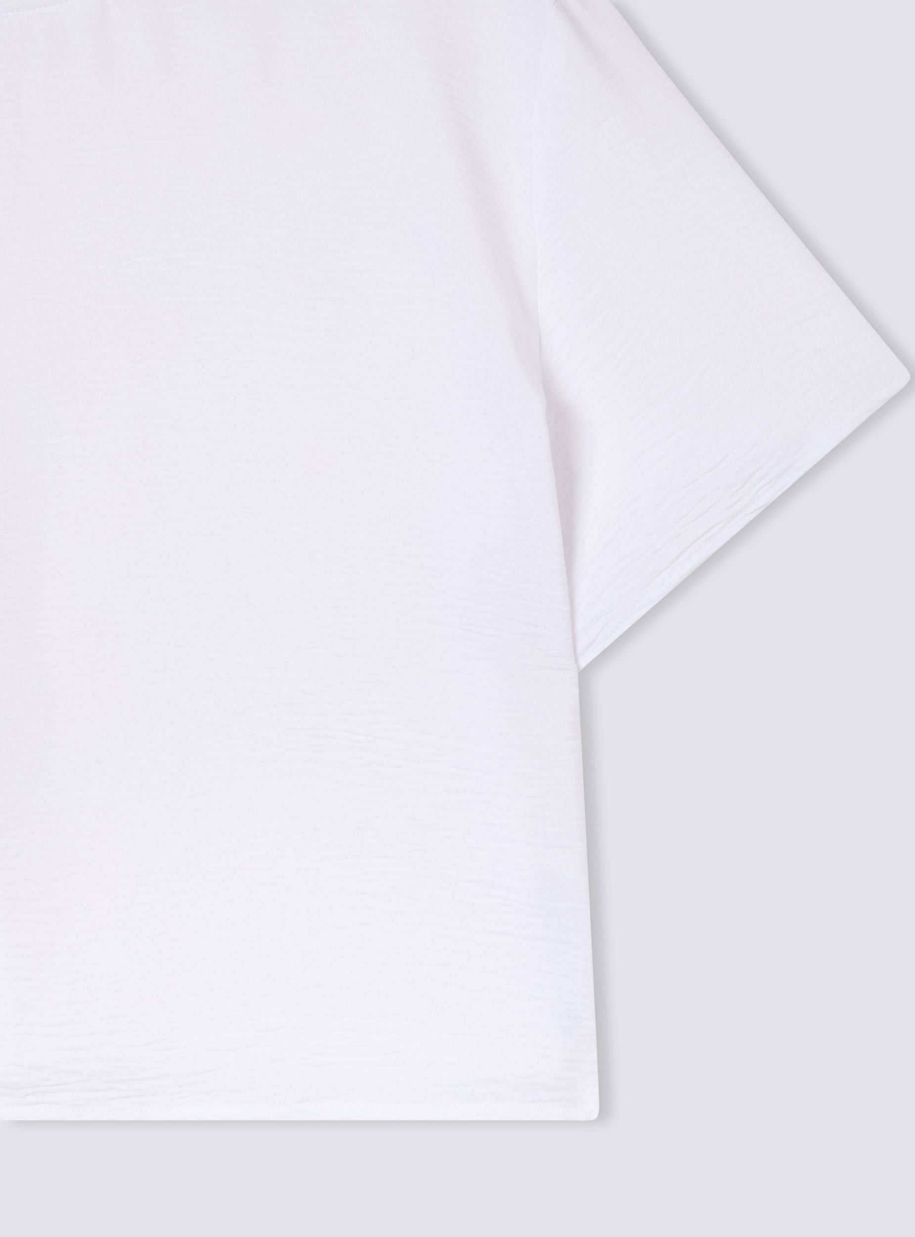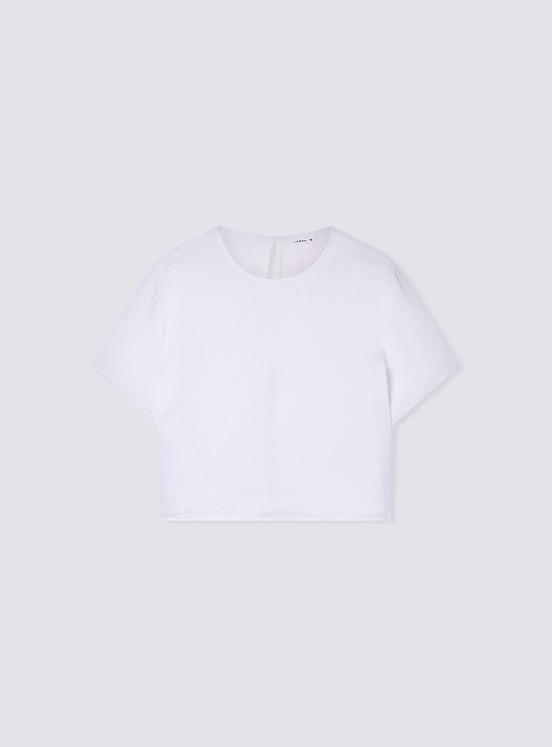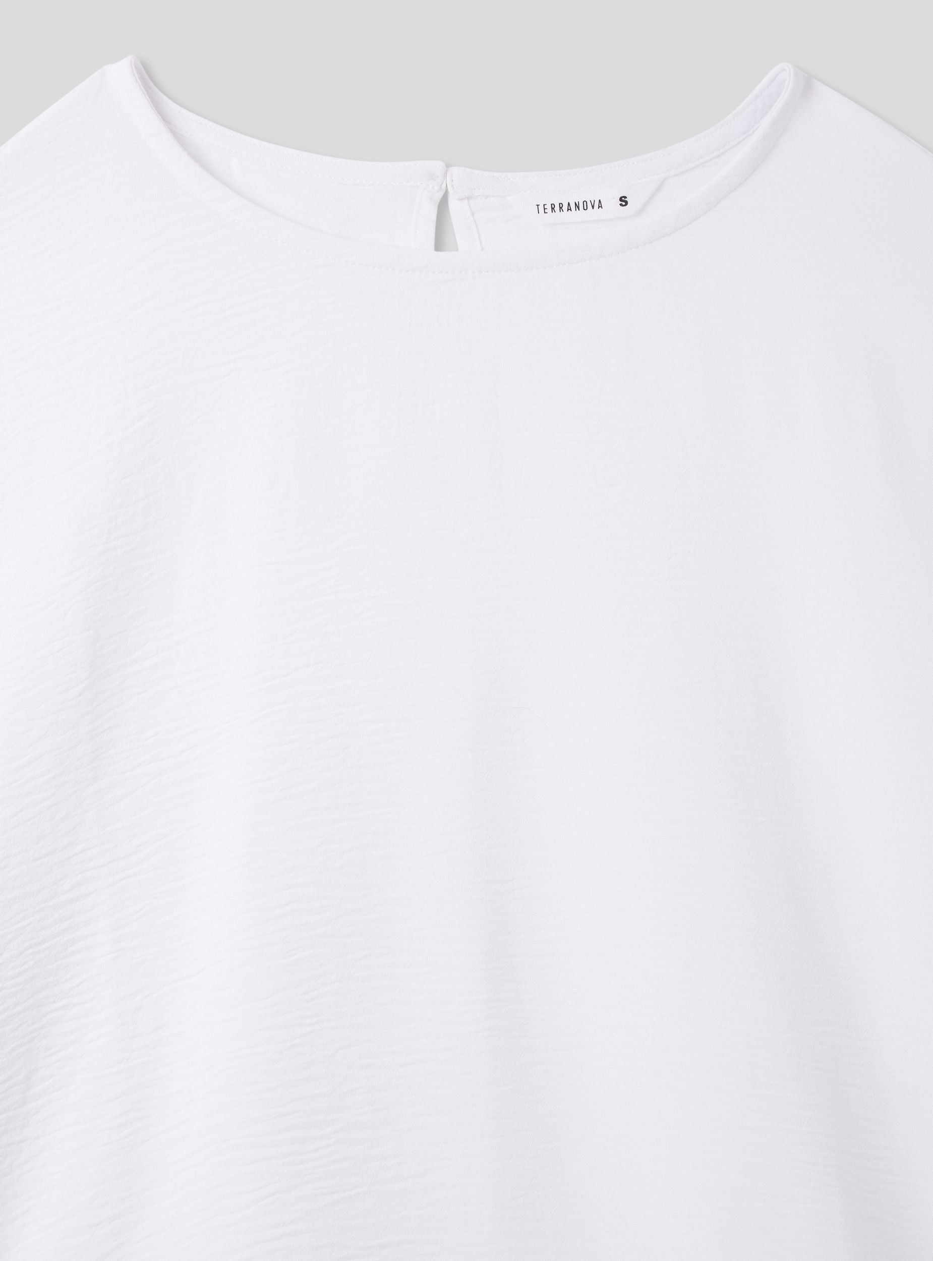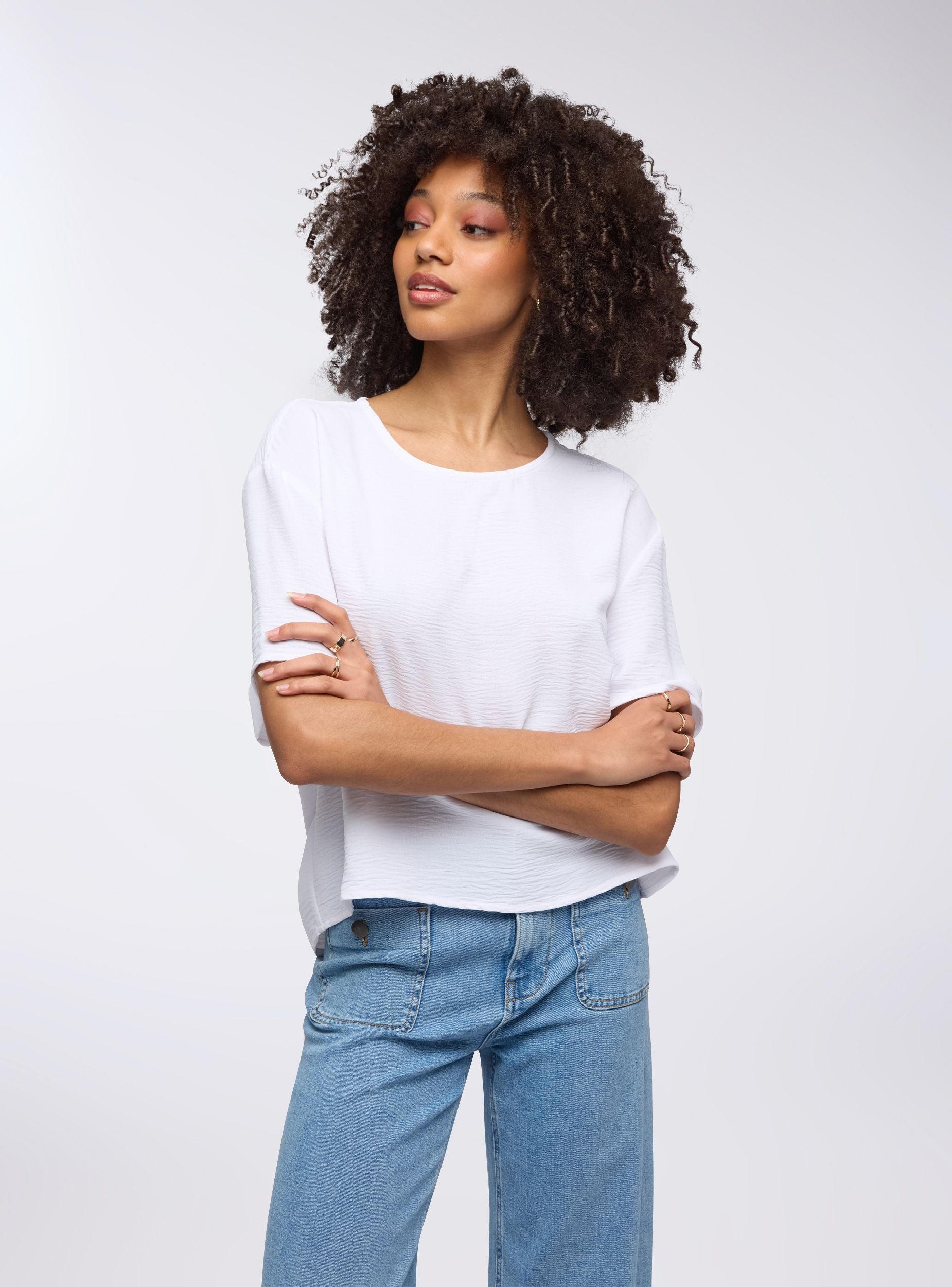 Blusa da donna a tinta unita, perfetta per un look raffinato e versatile. Il design essenziale presenta un elegante girocollo e maniche corte ampie, ideali per garantire comfort e libertà di movimento. Sul retro, un delicato bottone aggiunge un tocco di dettaglio, facilitando la chiusura. La linea morbida e fluida la rende adatta a diverse occasioni, da quelle informali a quelle più ricercate.