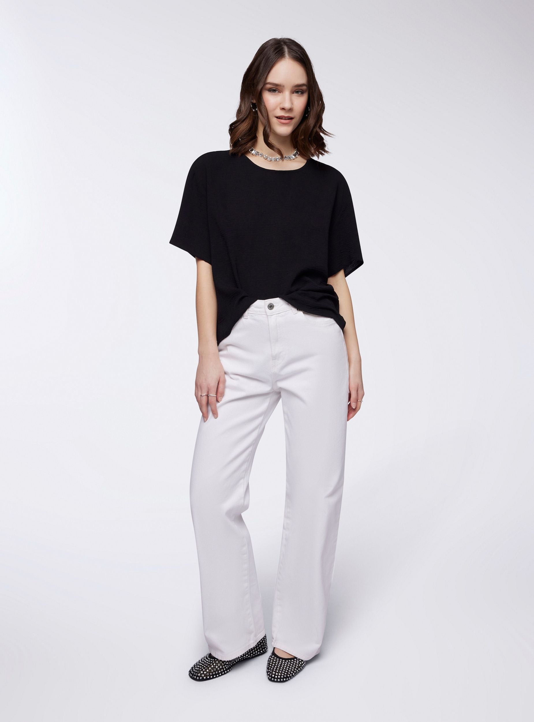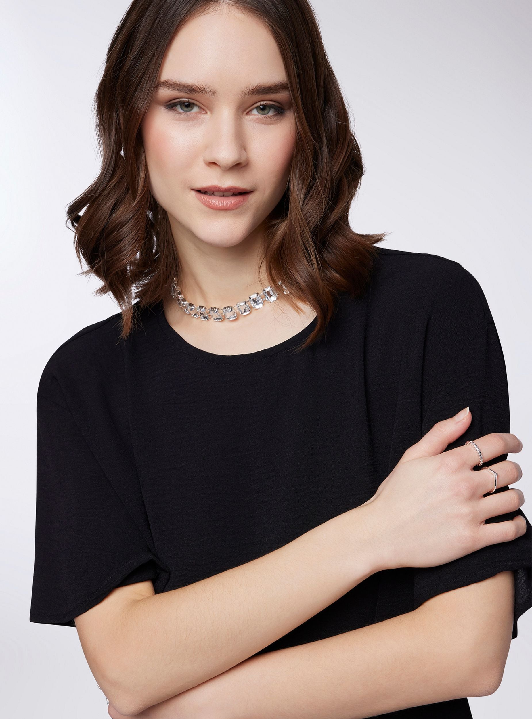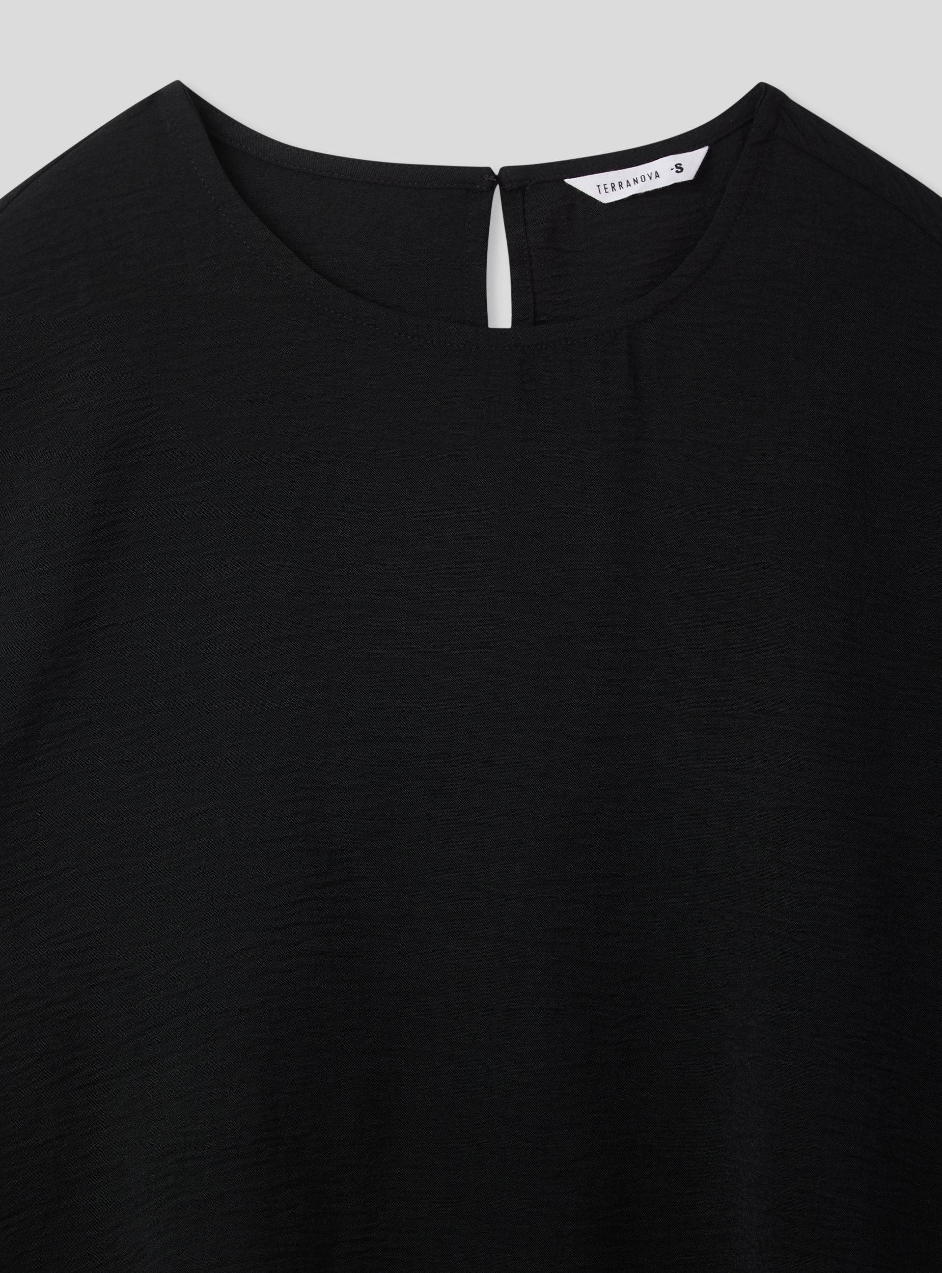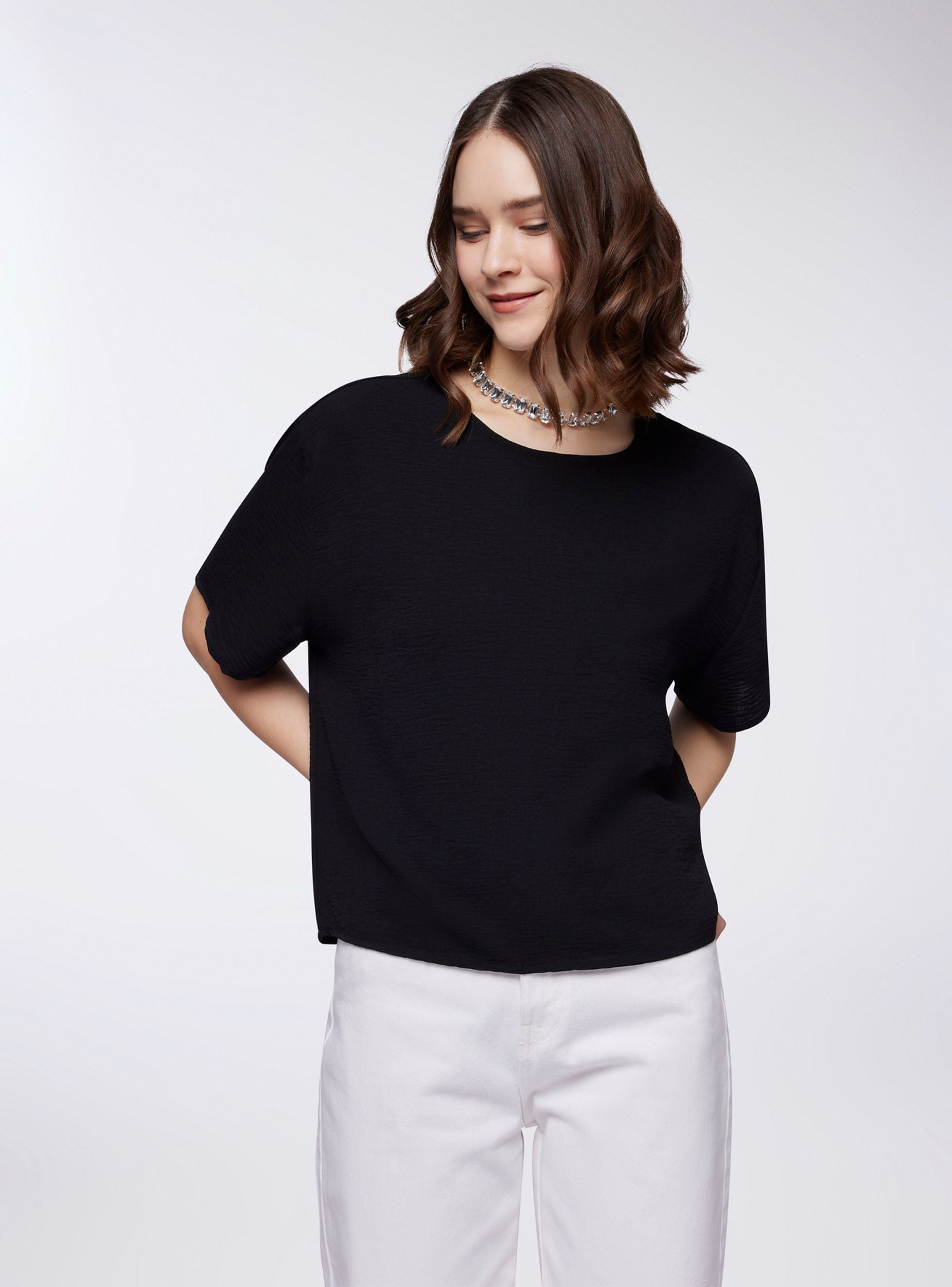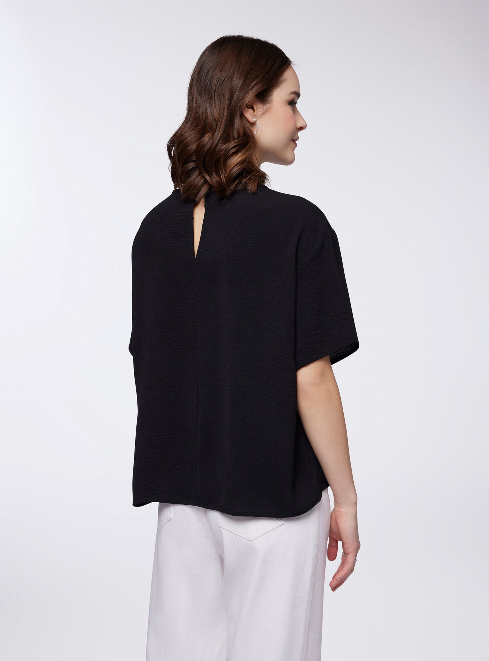 Blusa da donna a tinta unita, perfetta per un look raffinato e versatile. Il design essenziale presenta un elegante girocollo e maniche corte ampie, ideali per garantire comfort e libertà di movimento. Sul retro, un delicato bottone aggiunge un tocco di dettaglio, facilitando la chiusura. La linea morbida e fluida la rende adatta a diverse occasioni, da quelle informali a quelle più ricercate.