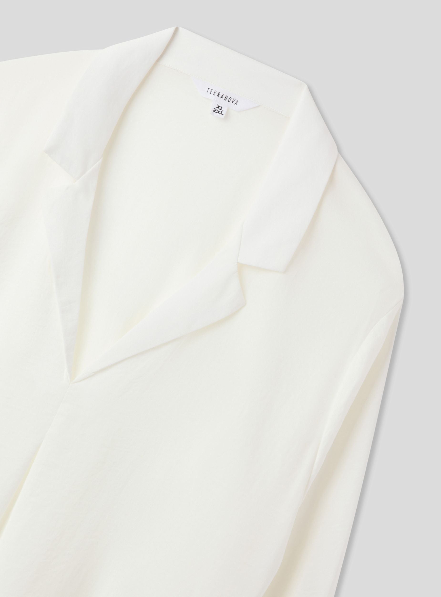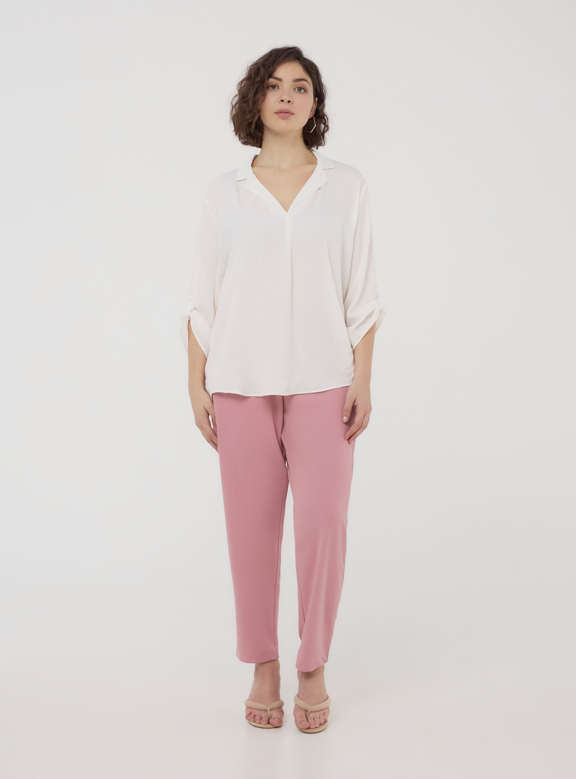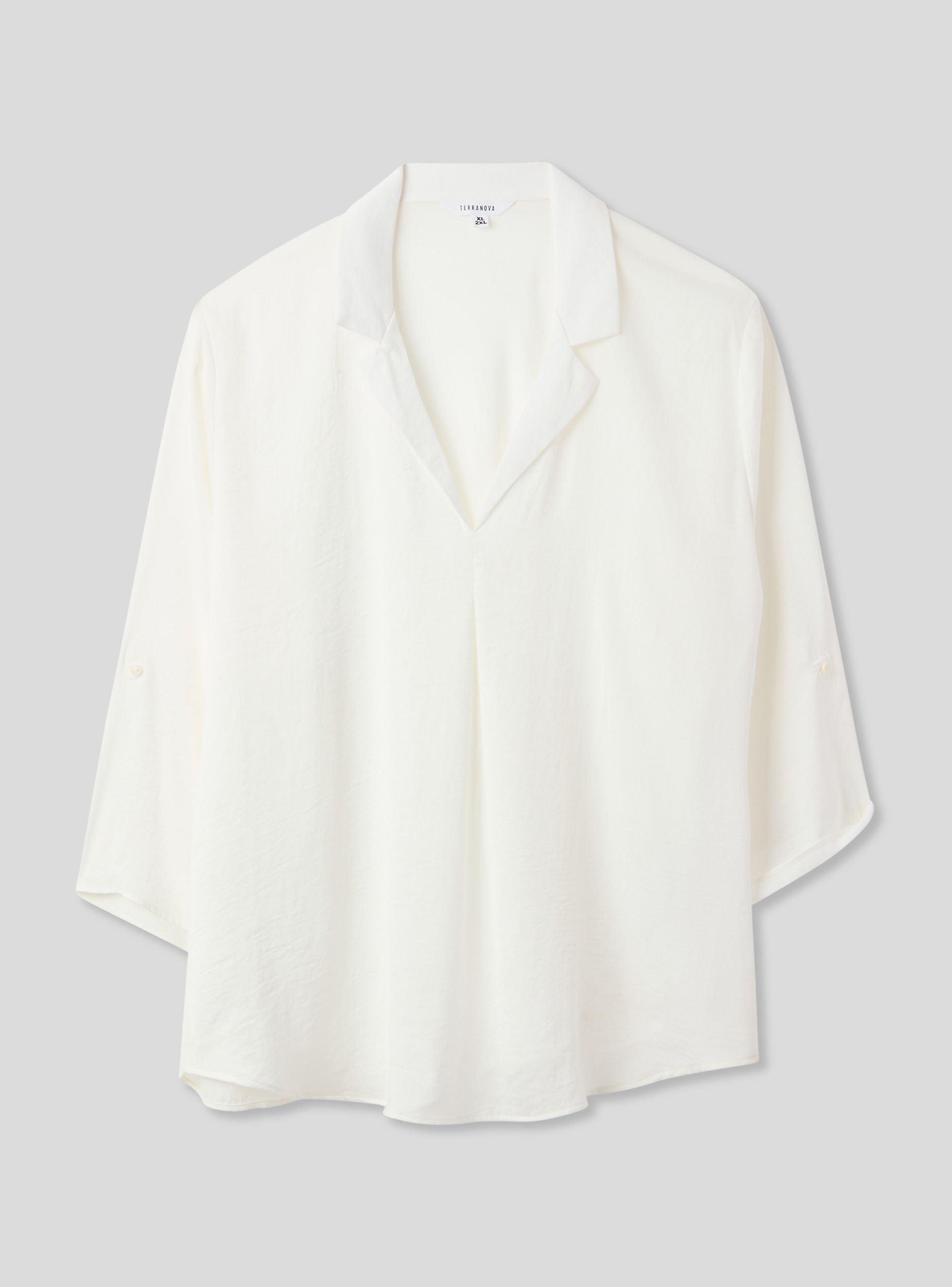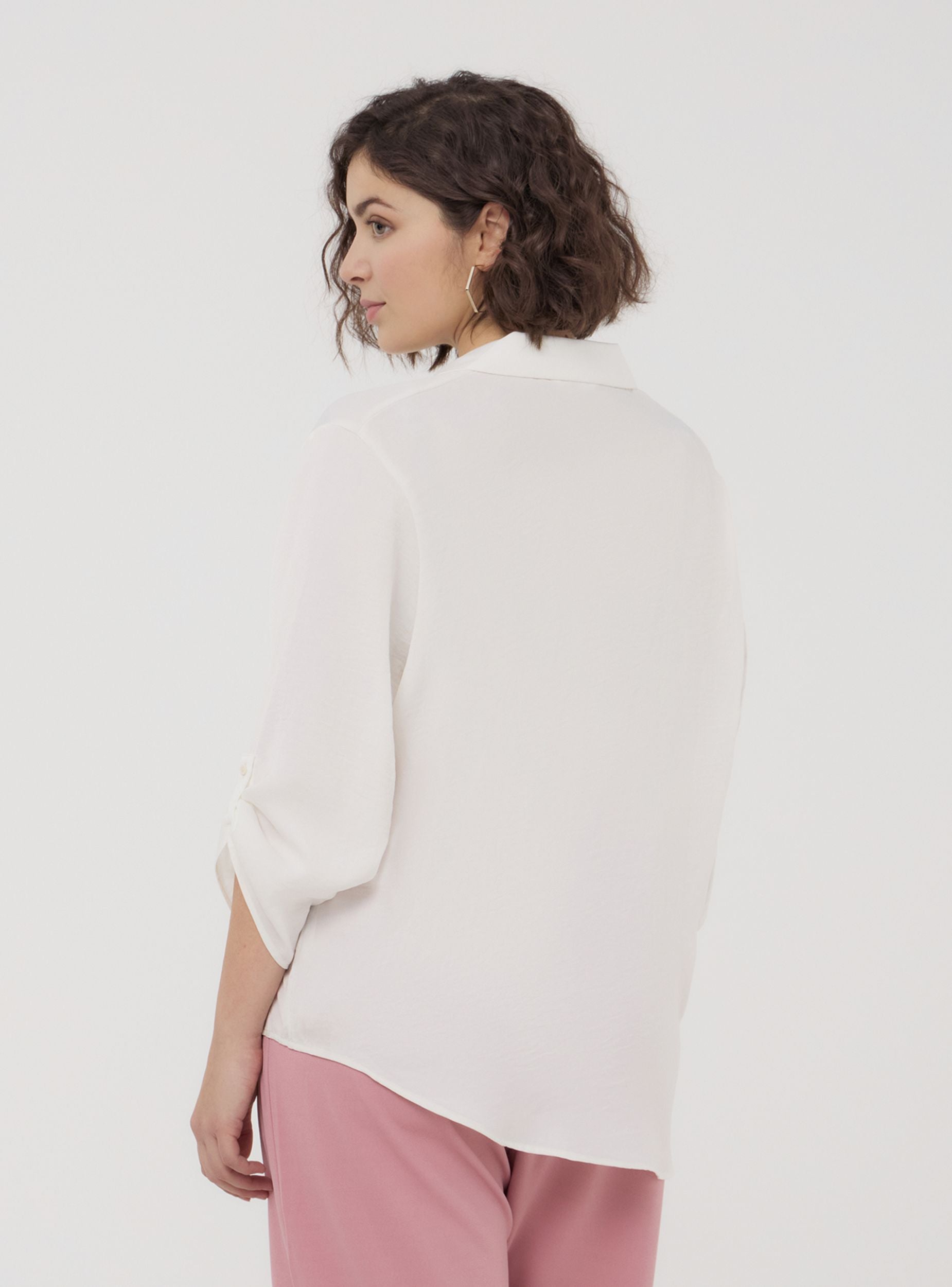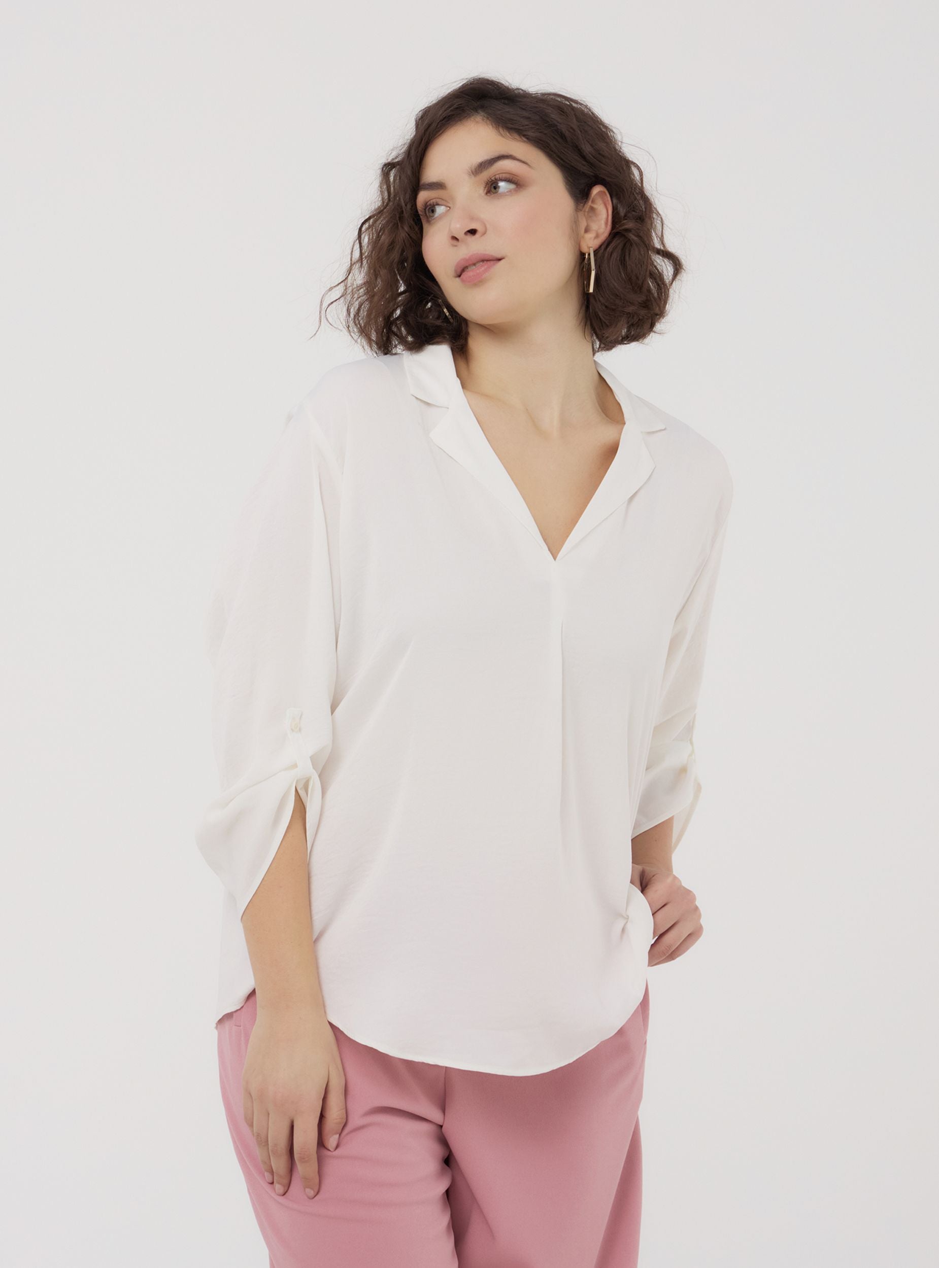 Blusa da donna a tinta unita, perfetta per un look raffinato e versatile. Il design presenta uno scollo a V con delicati revers che donano eleganza e fluidità. Le maniche lunghe possono essere indossate a tre quarti grazie al pratico bottone, offrendo maggiore adattabilità e stile. La vestibilità morbida assicura comfort, rendendola ideale per completare outfit sia casual che più ricercati.