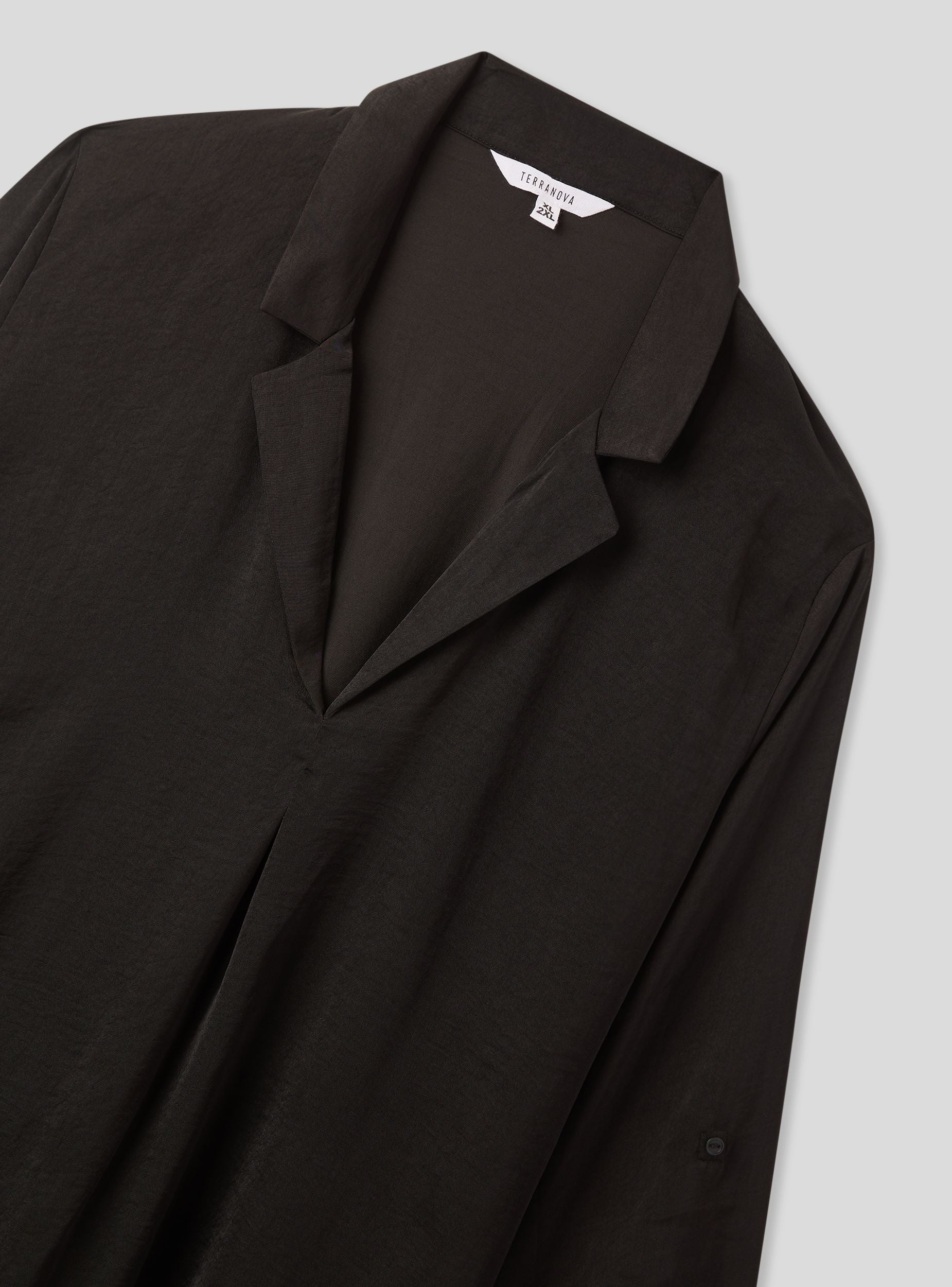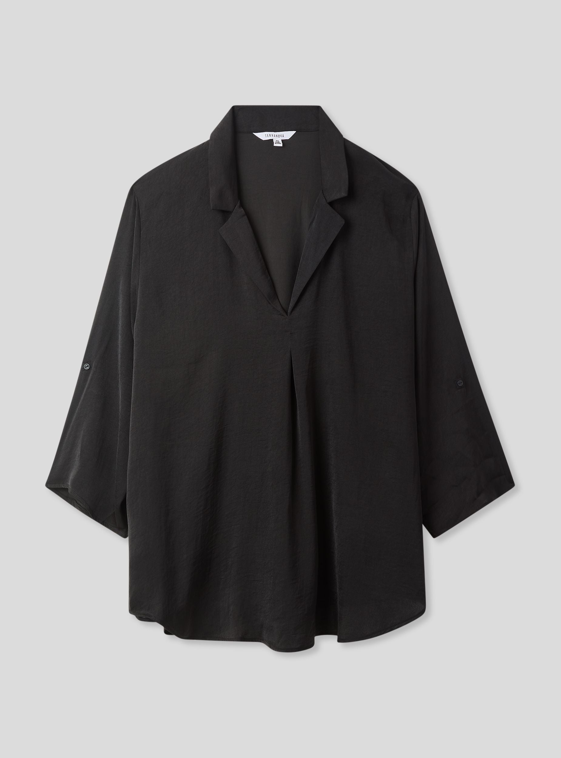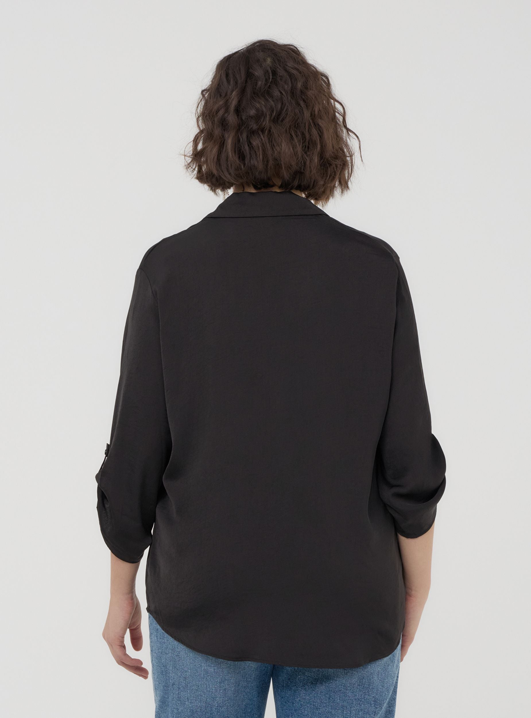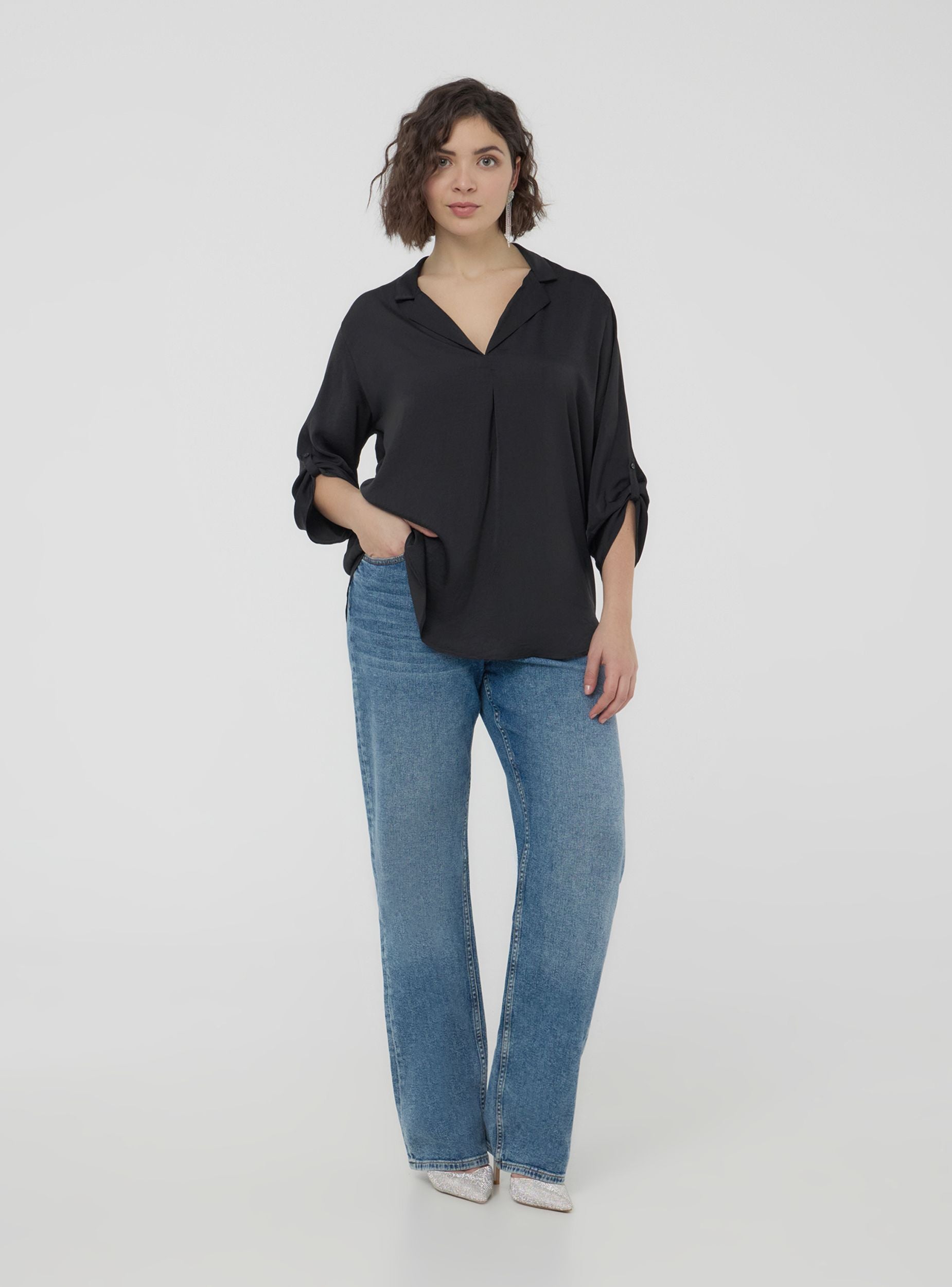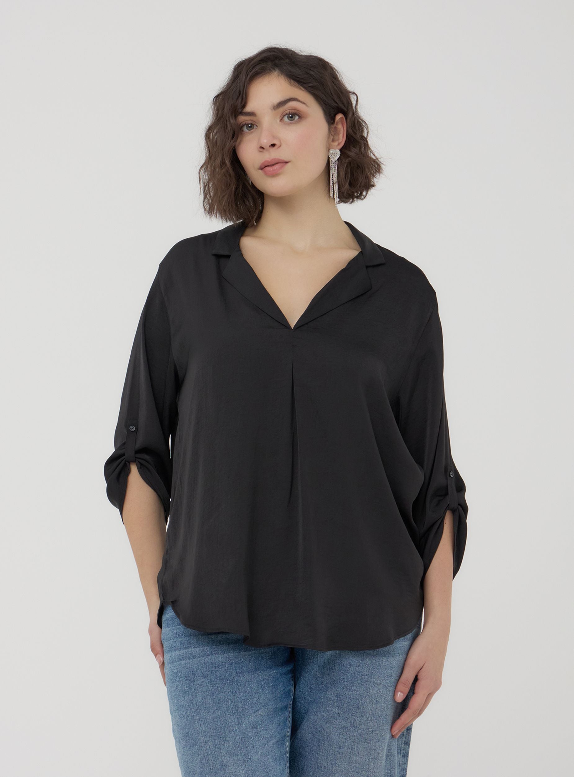 Blusa da donna a tinta unita, perfetta per un look raffinato e versatile. Il design presenta uno scollo a V con delicati revers che donano eleganza e fluidità. Le maniche lunghe possono essere indossate a tre quarti grazie al pratico bottone, offrendo maggiore adattabilità e stile. La vestibilità morbida assicura comfort, rendendola ideale per completare outfit sia casual che più ricercati.Dettagli