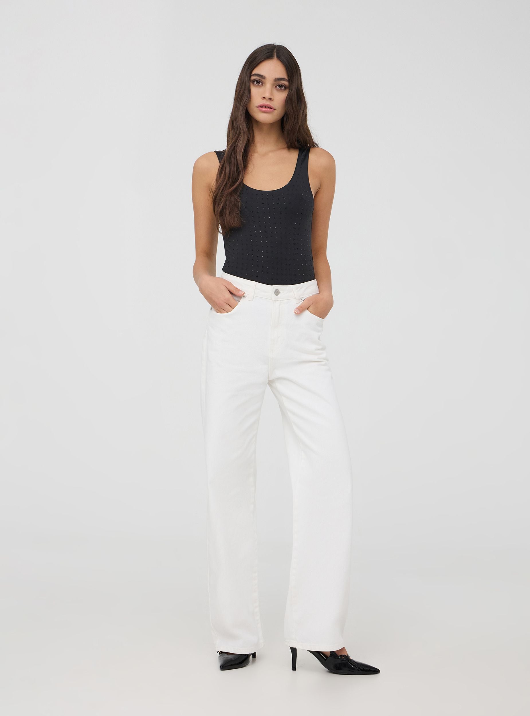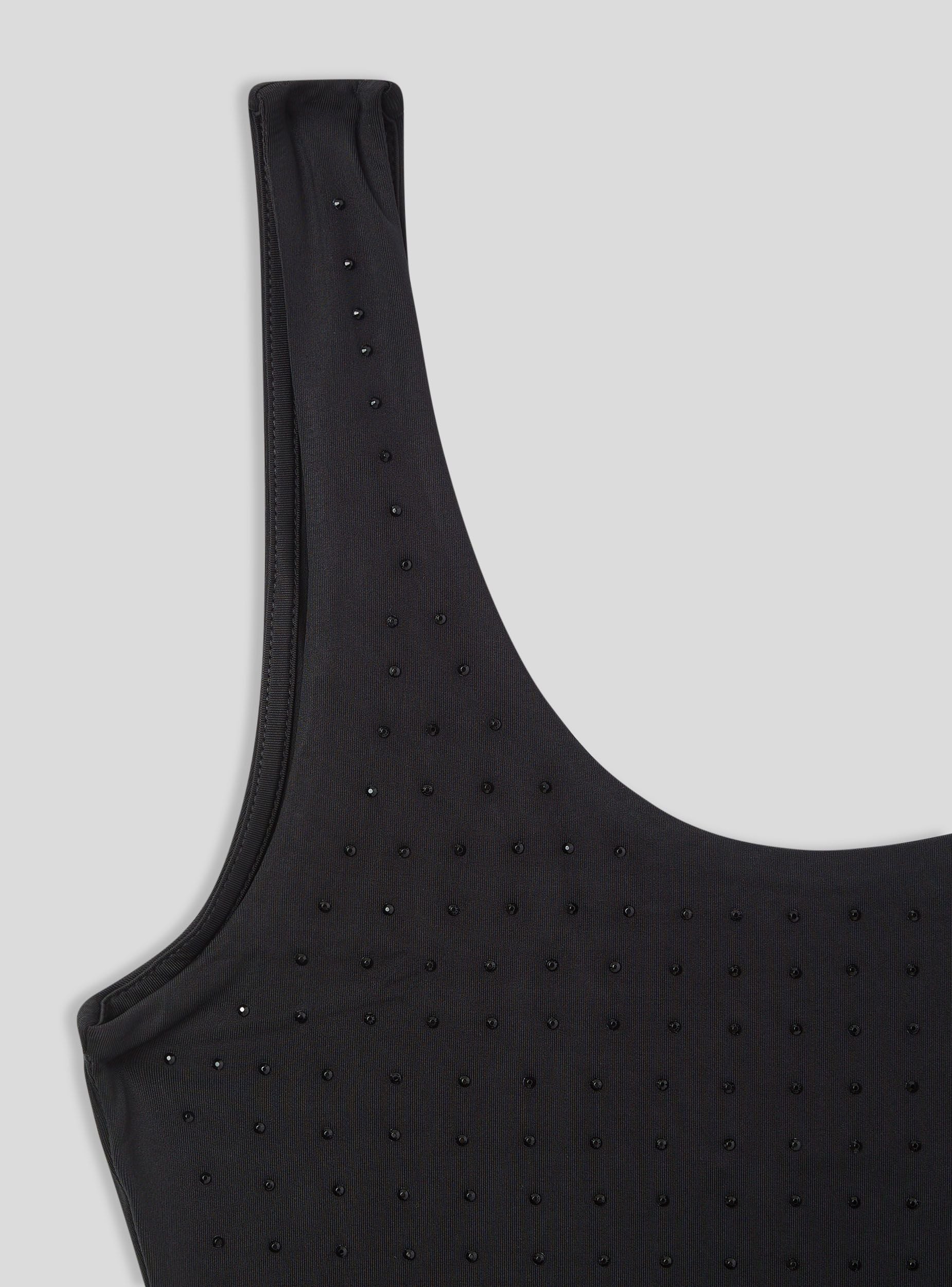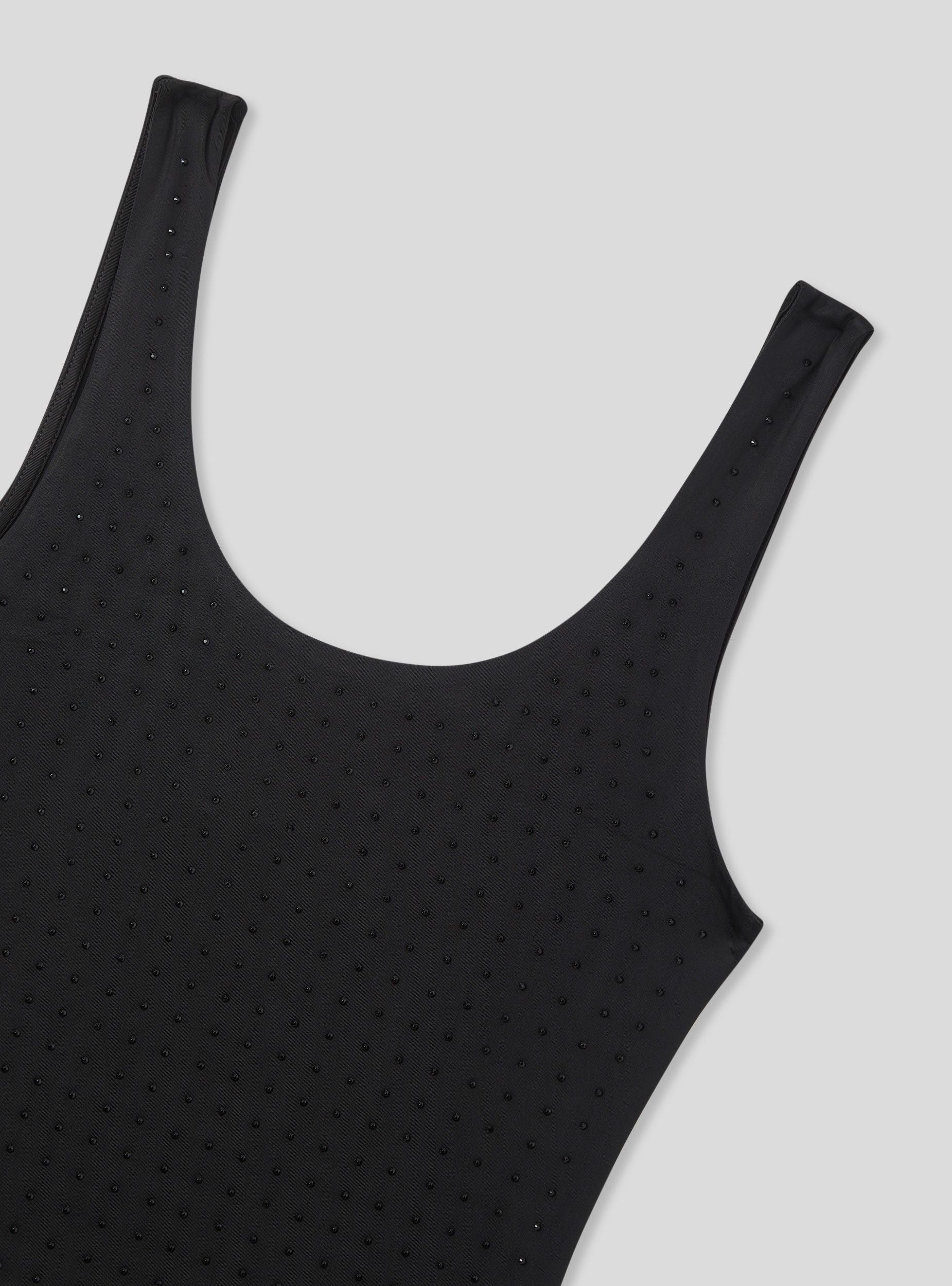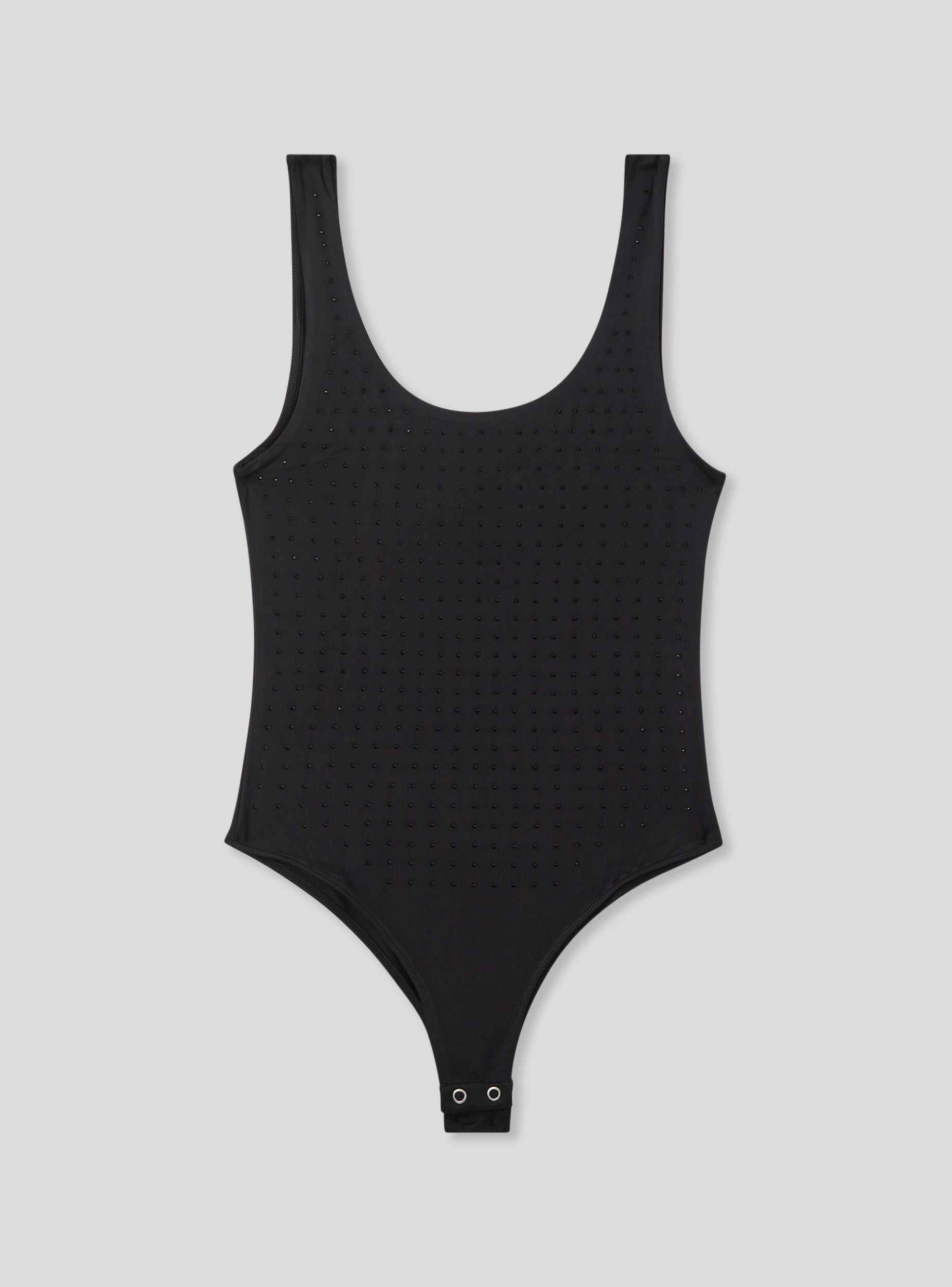 Body da donna dal design tinta unita, impreziosito da un'elegante applicazione di strass sul fronte. Questo capo è un vero must-have per chi desidera aggiungere un tocco luminoso al proprio look. Caratterizzato da una silhouette aderente che valorizza la figura, è perfetto per creare outfit di tendenza sia da giorno che da sera. Il dettaglio di strass dona un tocco glamour, mentre la scollatura rende il body versatile e adatto a diverse occasioni. Ideale per chi cerca uno stile sofisticato e alla moda.