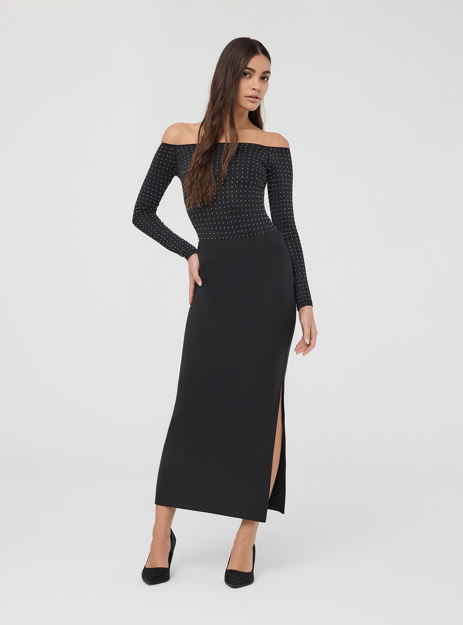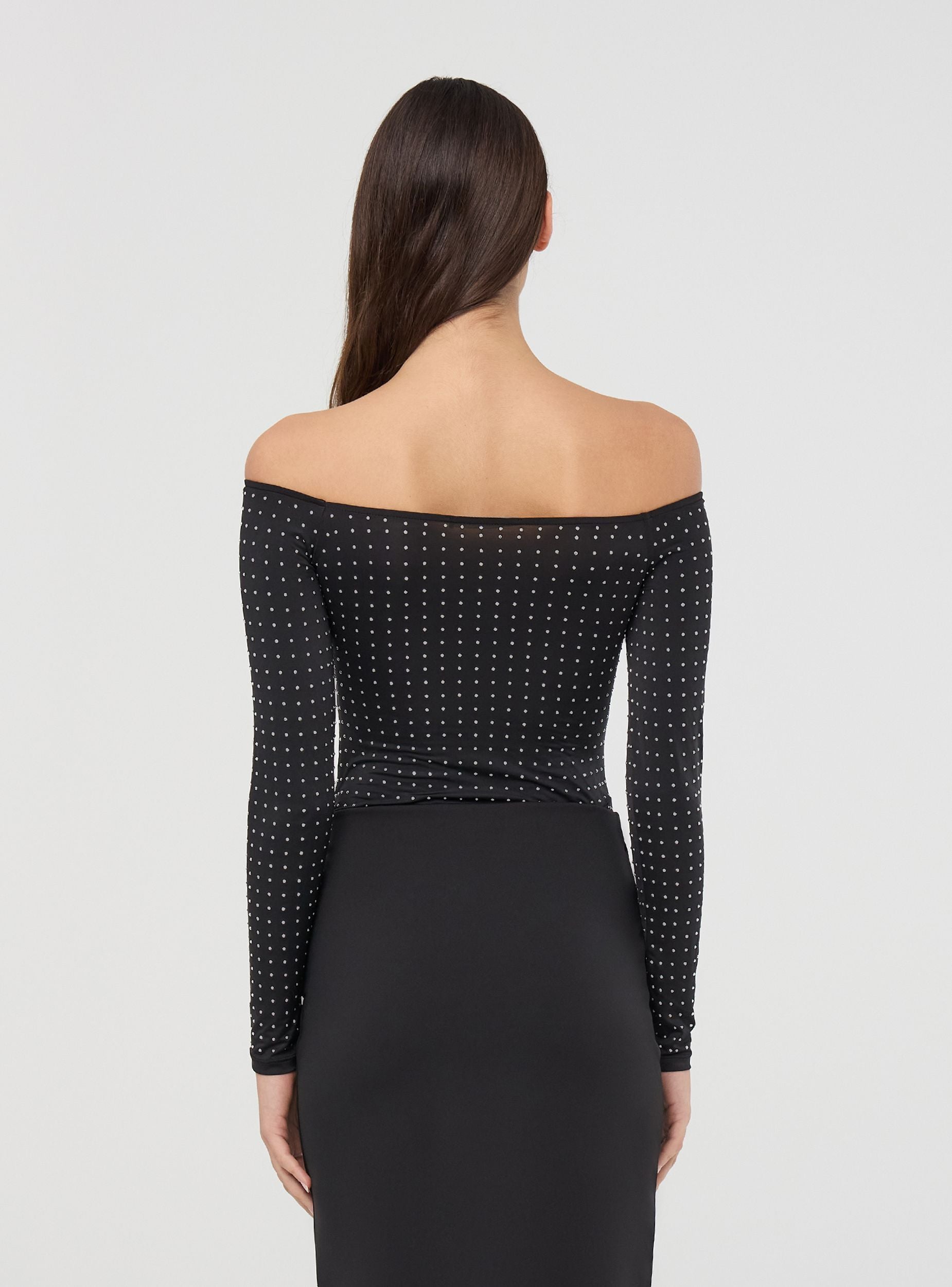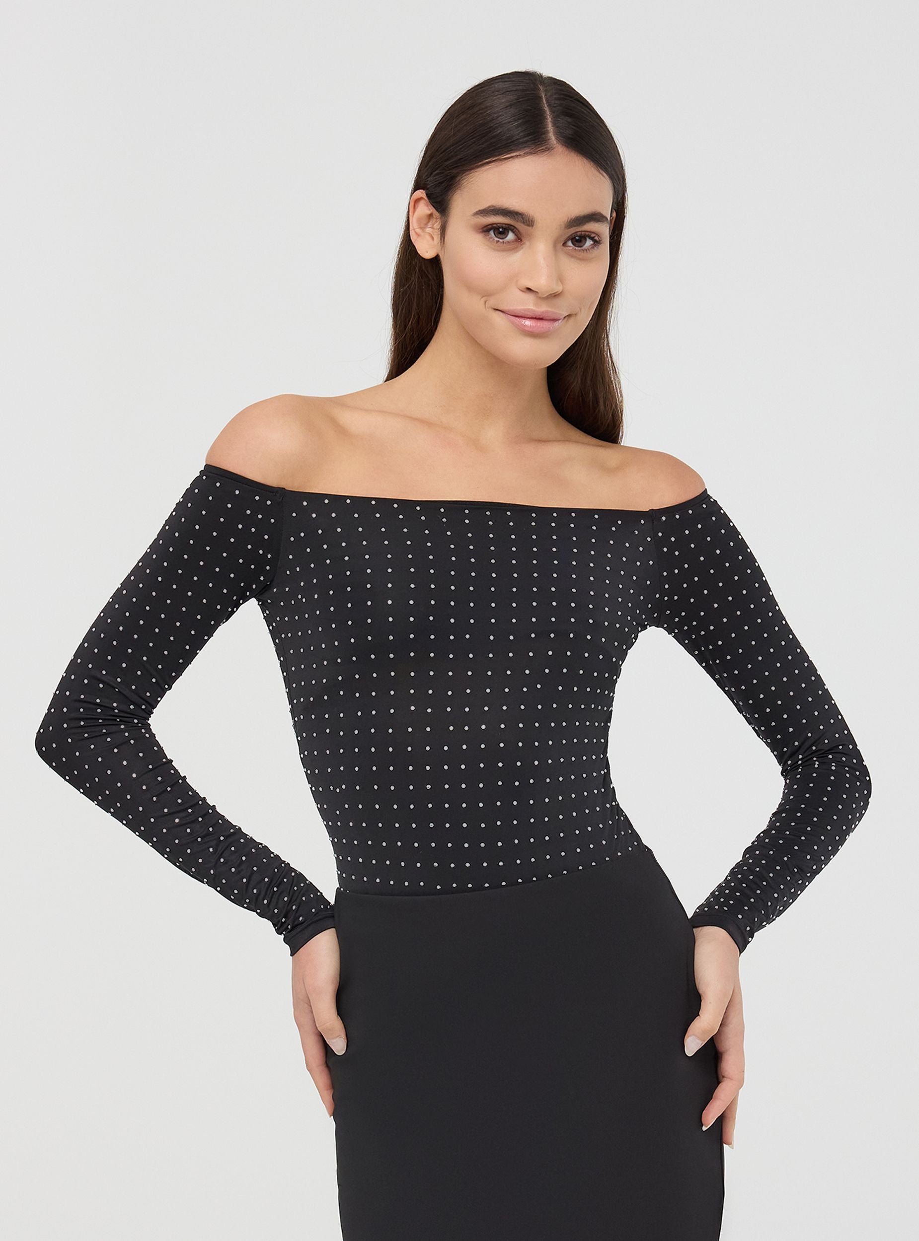 Body da donna a maniche lunghe in tessuto elasticizzato a tinta unita con strass. Questo capo offre una vestibilità aderente che valorizza la tua silhouette, mentre gli strass applicati aggiungono un tocco di brillantezza e glamour. La chiusura sul fondo con pratici bottoncini a pressione assicura comfort e facilità d'uso. Perfetto da indossare sotto blazer, con gonne o pantaloni per un look sofisticato e alla moda.