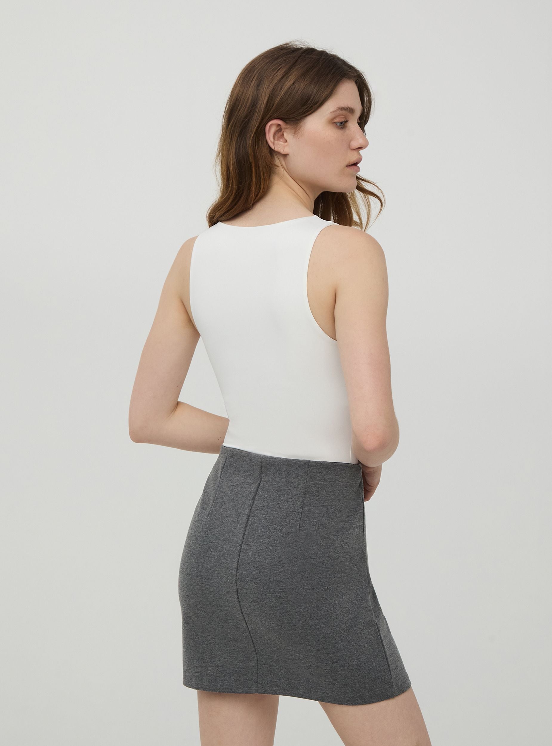 Body da donna a tinta unita, realizzato in tessuto elasticizzato per una vestibilità aderente e confortevole. Presenta uno scollo rotondo e spalline larghe, offrendo un look sobrio ed elegante. Dotato di chiusura inferiore con bottoncini a pressione per una pratica vestibilità. Questo body è ideale per essere indossato sia da solo che come base sotto giacche, blazer o maglioni, perfetto per look casual chic e sofisticati. Adatto per l'ufficio, serate fuori e occasioni informali, si abbina facilmente a gonne, pantaloni o jeans, aggiungendo un tocco di eleganza e femminilità a qualsiasi outfit.