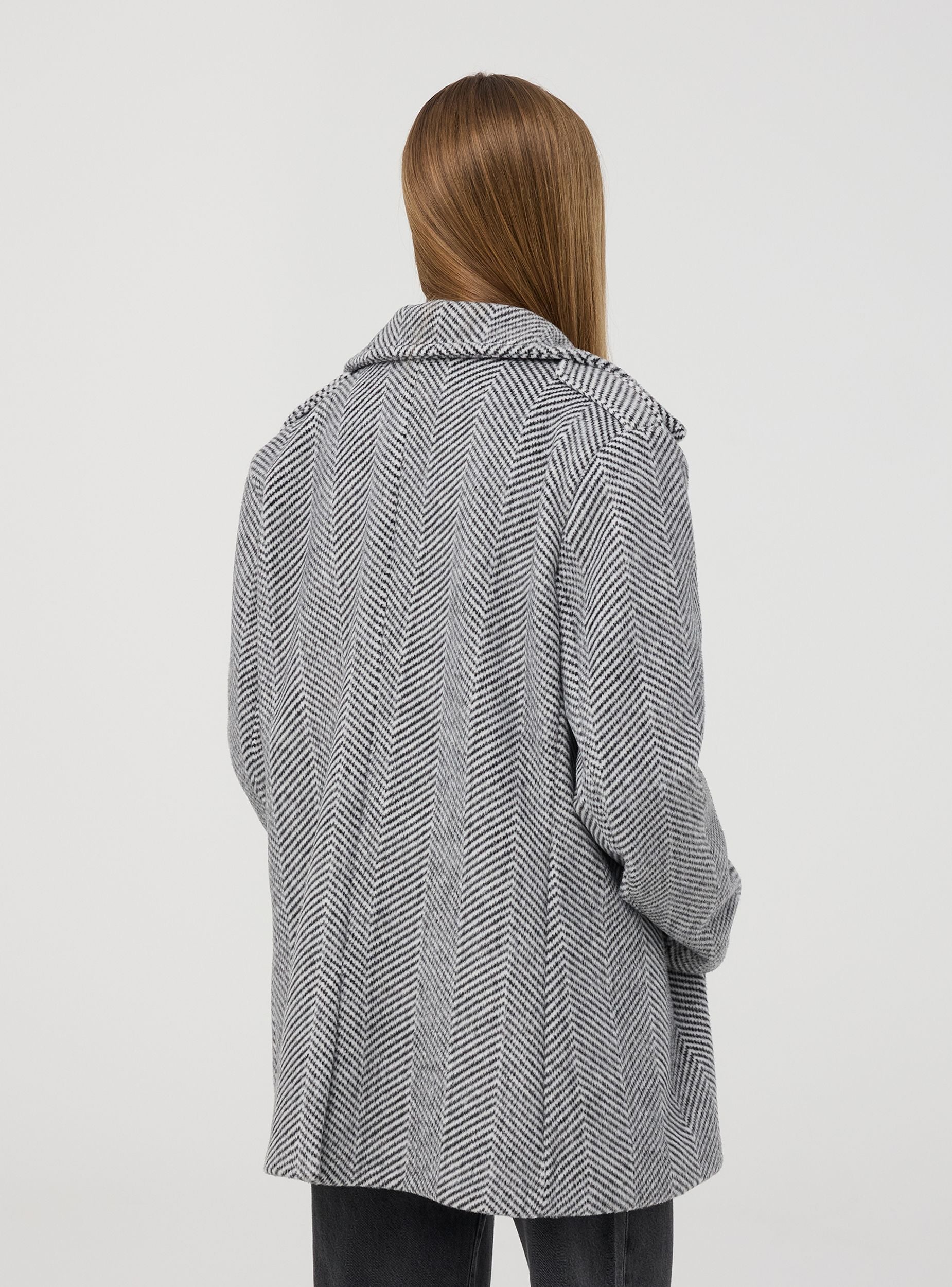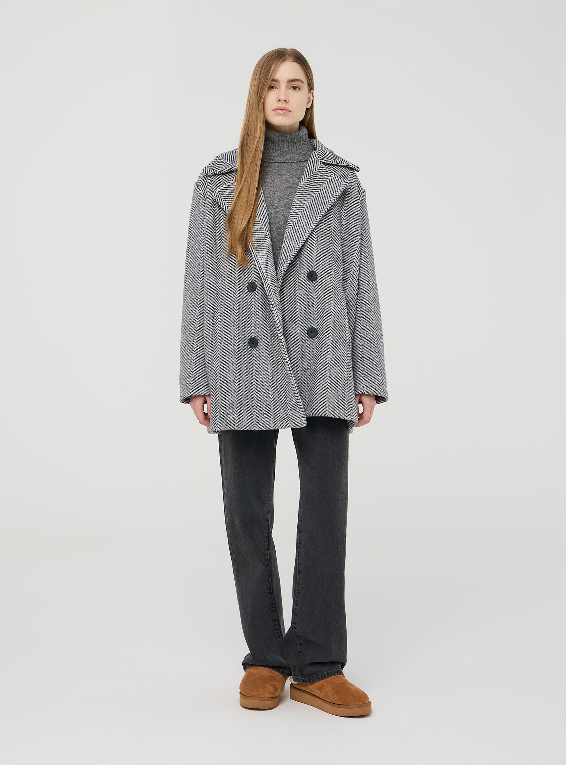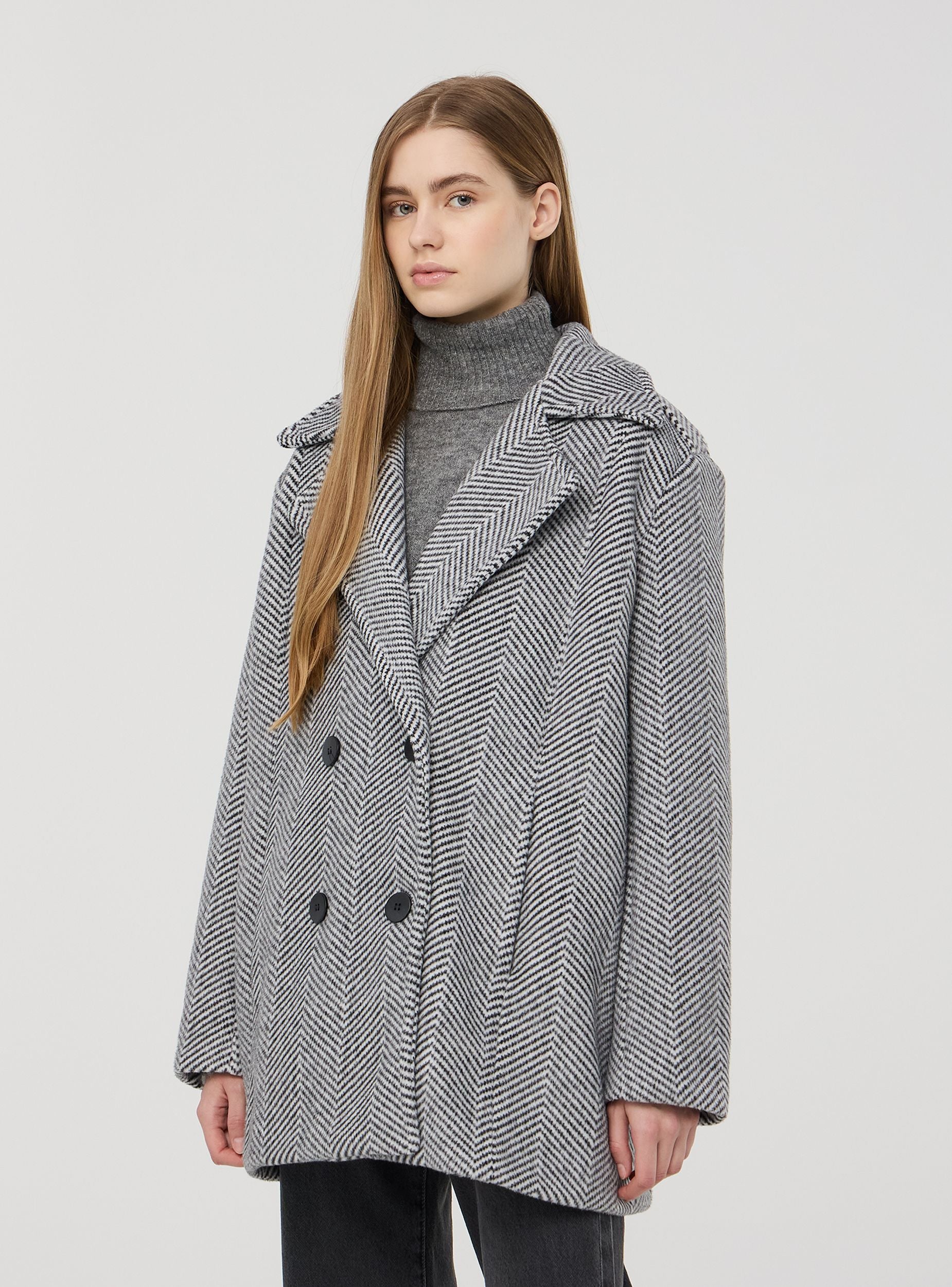 Cappotto da donna dalla vestibilità oversize e dallo stile sofisticato, caratterizzato da un elegante design a doppio petto con bottoni. I revers ampi donano un tocco raffinato, mentre il motivo a spina di pesce aggiunge personalità al capo. Dotato di pratiche tasche e maniche lunghe, è l'alleato ideale per affrontare con stile le giornate più fresche. Perfetto per completare look casual o più ricercati.
