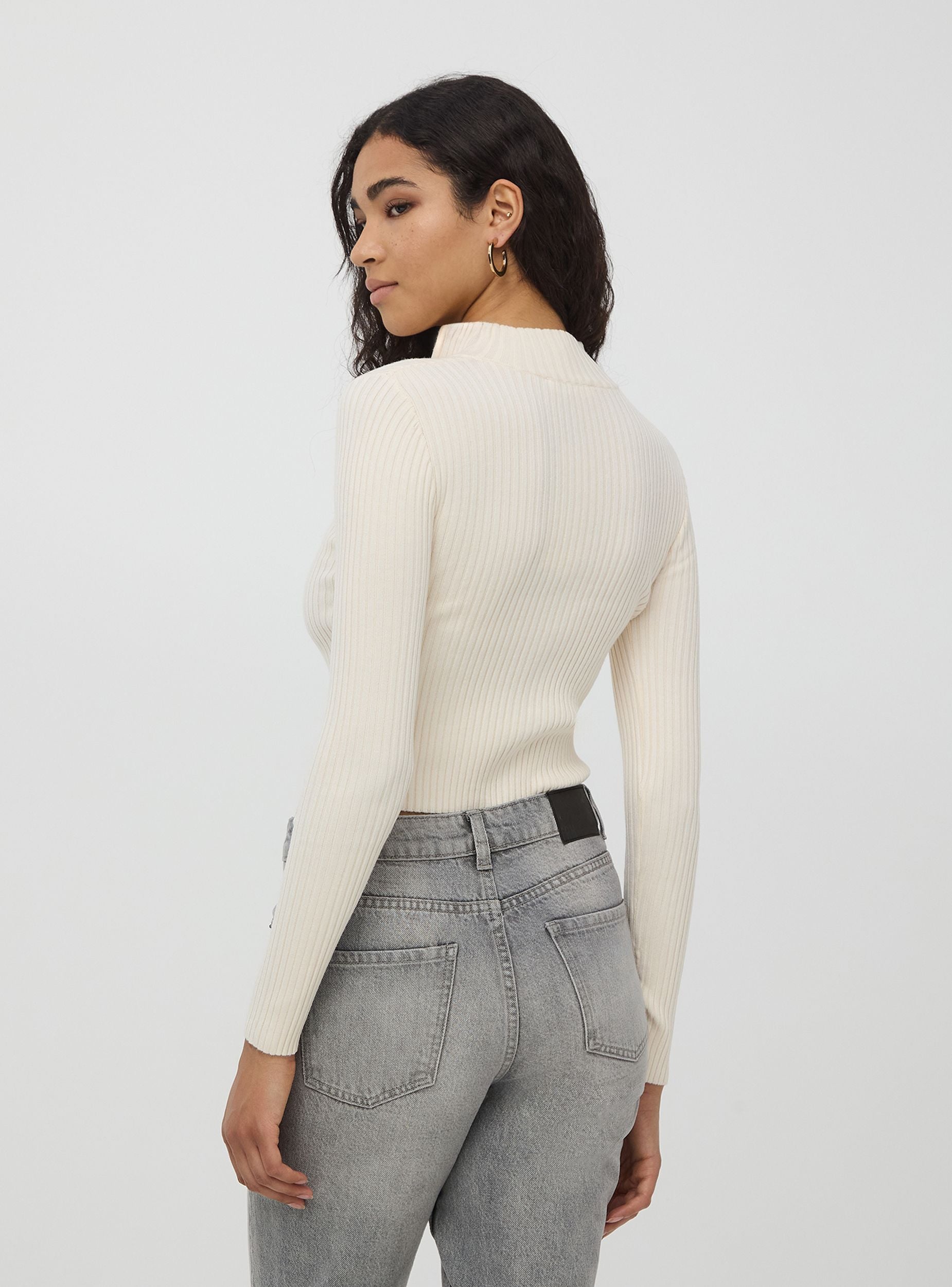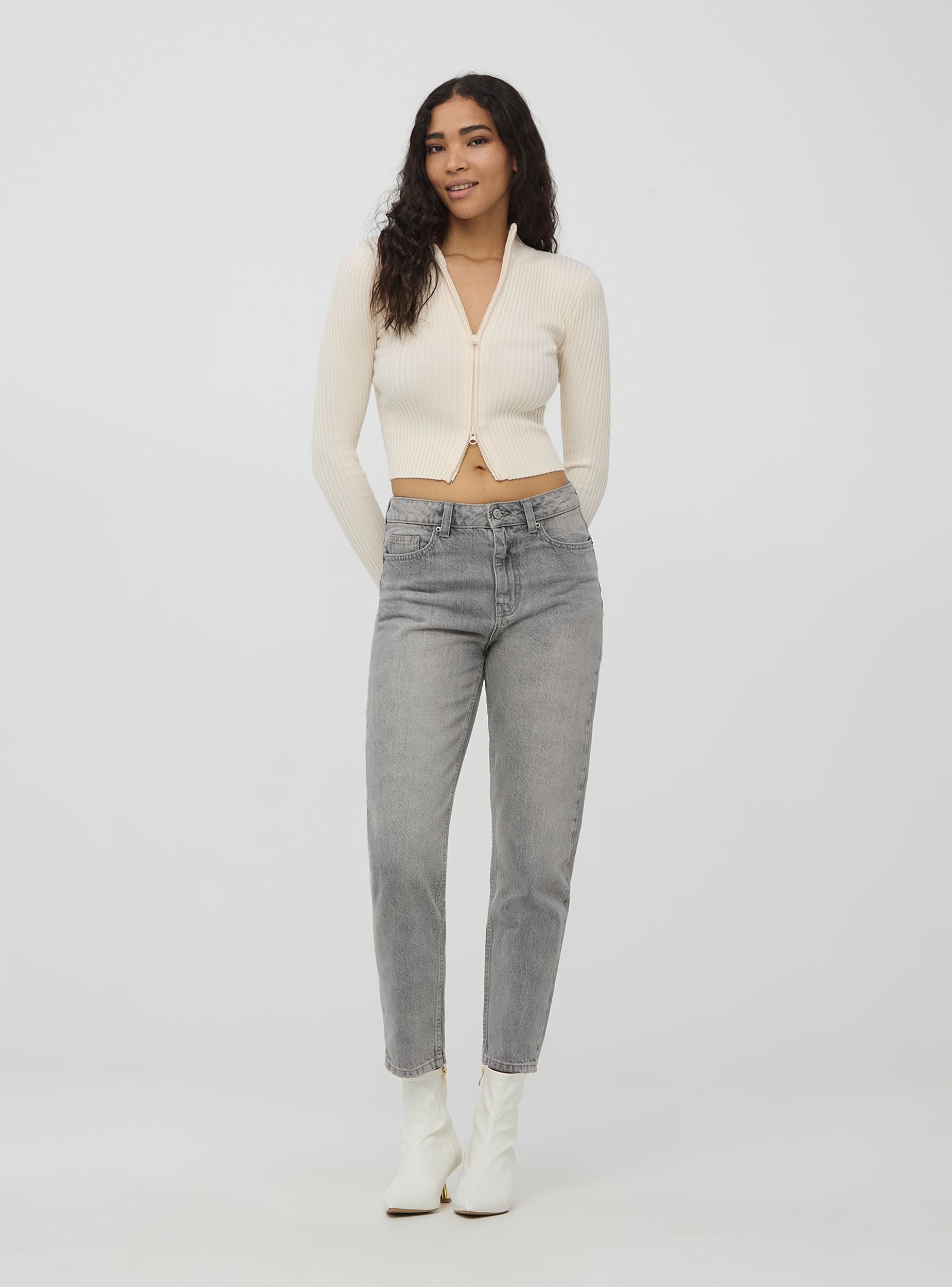 Cardigan a costine da donna realizzato in un tessuto elasticizzato che garantisce una vestibilità aderente e confortevole. Il design presenta una chiusura frontale con zip a doppio cursore, che consente di indossarlo sia completamente chiuso che parzialmente aperto, aggiungendo versatilità al capo. Le costine verticali donano una texture raffinata e un effetto visivo snellente. La lunghezza crop, che termina appena sopra la vita, conferisce un look moderno e alla moda.