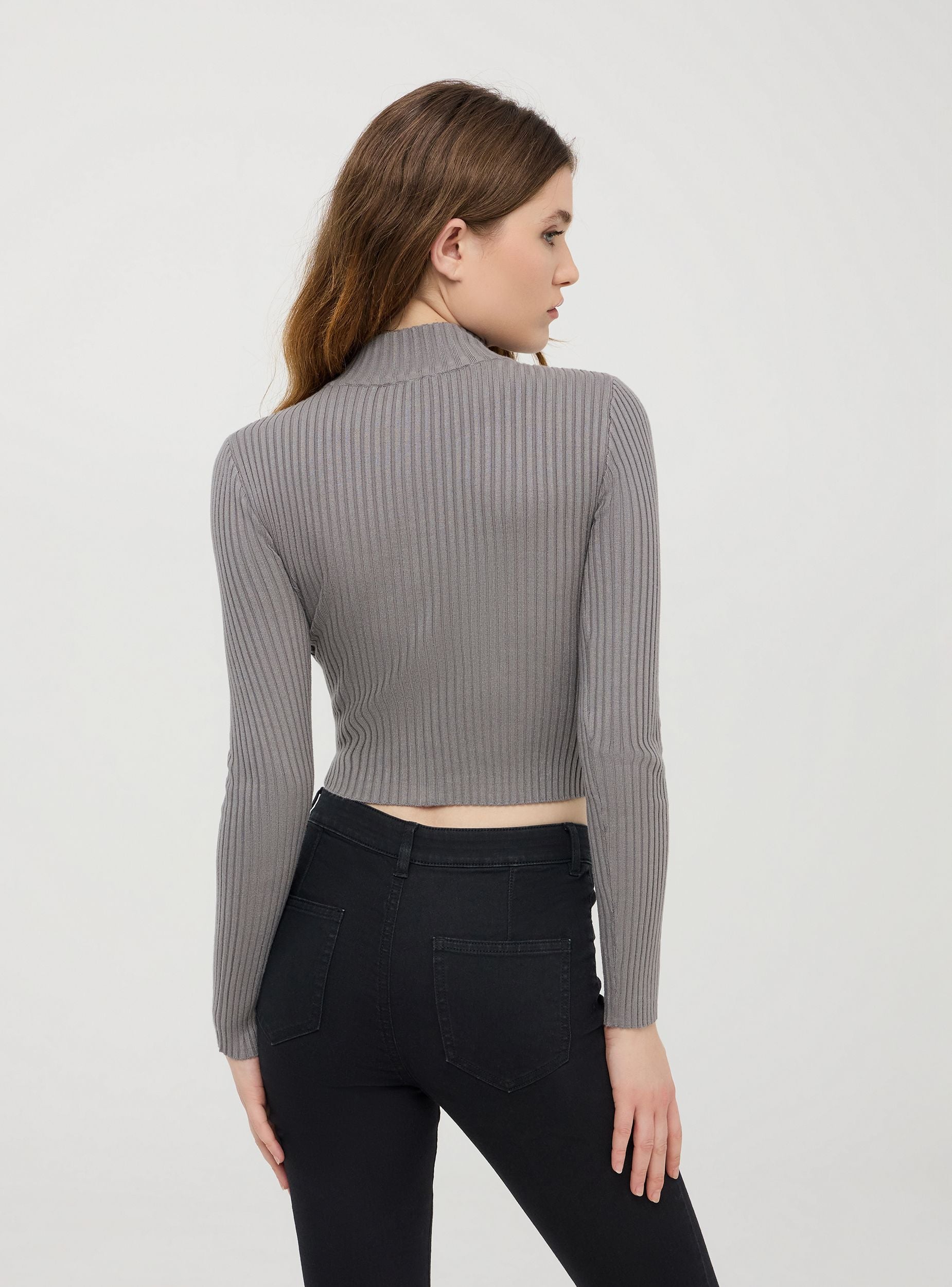 Cardigan a costine da donna realizzato in un tessuto elasticizzato che garantisce una vestibilità aderente e confortevole. Il design presenta una chiusura frontale con zip a doppio cursore, che consente di indossarlo sia completamente chiuso che parzialmente aperto, aggiungendo versatilità al capo. Le costine verticali donano una texture raffinata e un effetto visivo snellente. La lunghezza crop, che termina appena sopra la vita, conferisce un look moderno e alla moda.