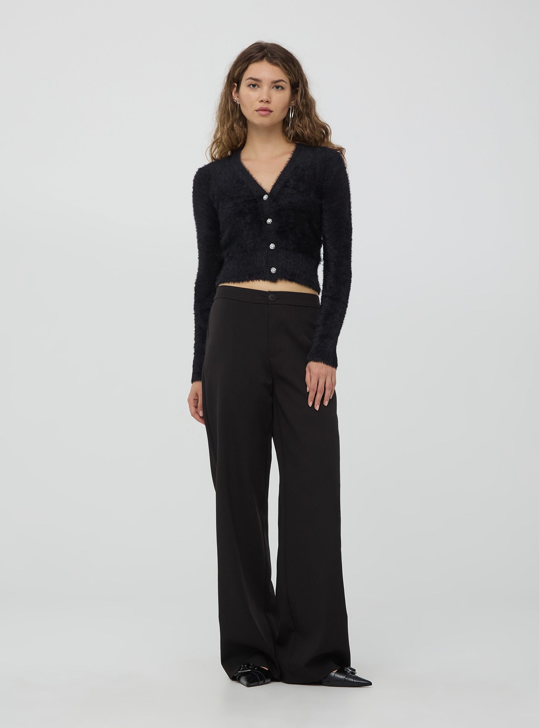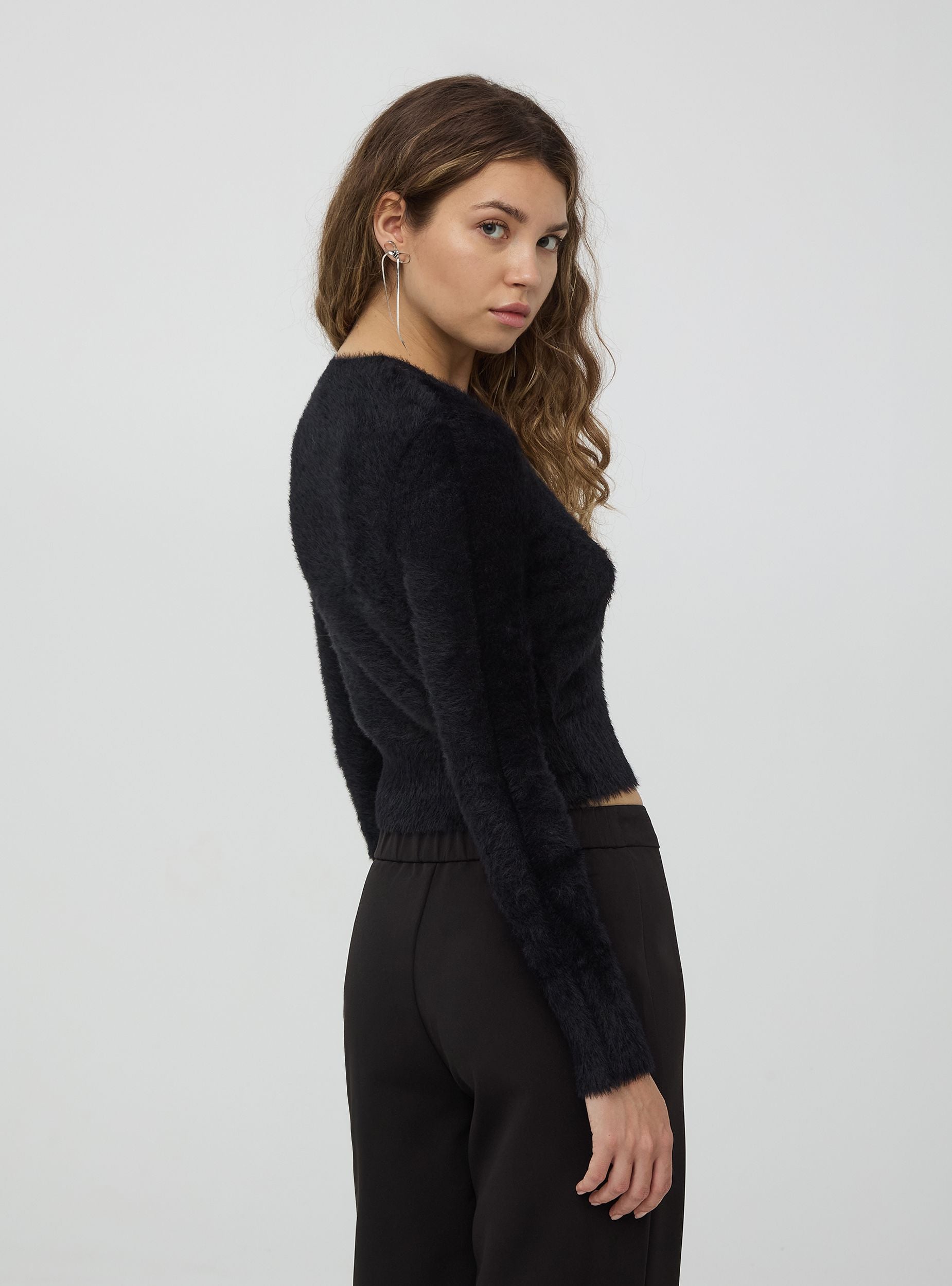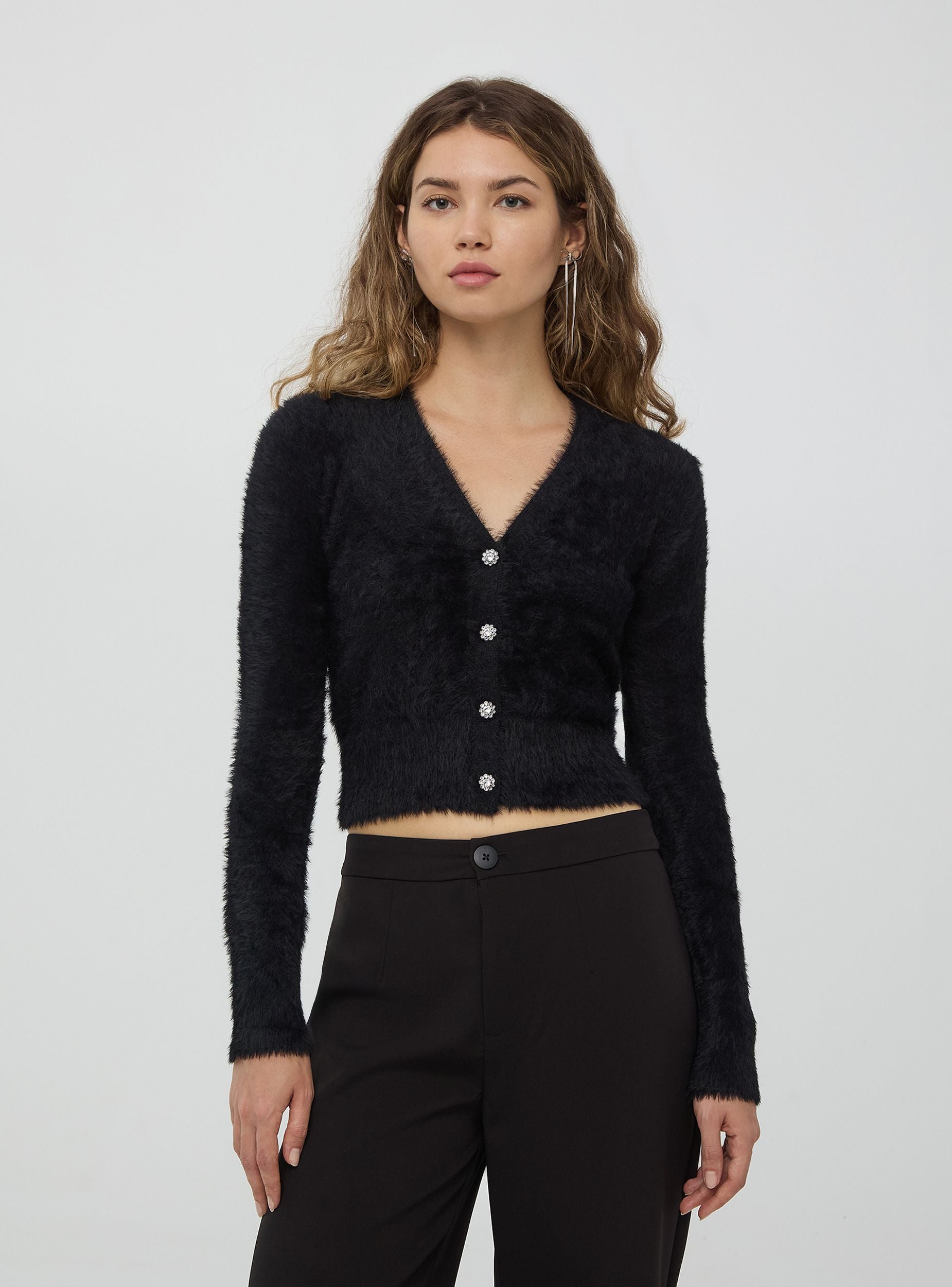 Maglia cardigan da donna a maniche lunghe, realizzata in morbido pelo sintetico con bottoni gioiello frontali. Il cardigan presenta un design classico con scollo a V e chiusura frontale con bottoni gioiello decorativi, che aggiungono un tocco di sofisticatezza. Il pelo sintetico garantisce una morbidezza ineguagliabile, mentre la vestibilità aderente mette in risalto la silhouette femminile. Le maniche lunghe contribuiscono a un look elegante e raffinato, perfetto per essere indossato sia in contesti casual che formali.