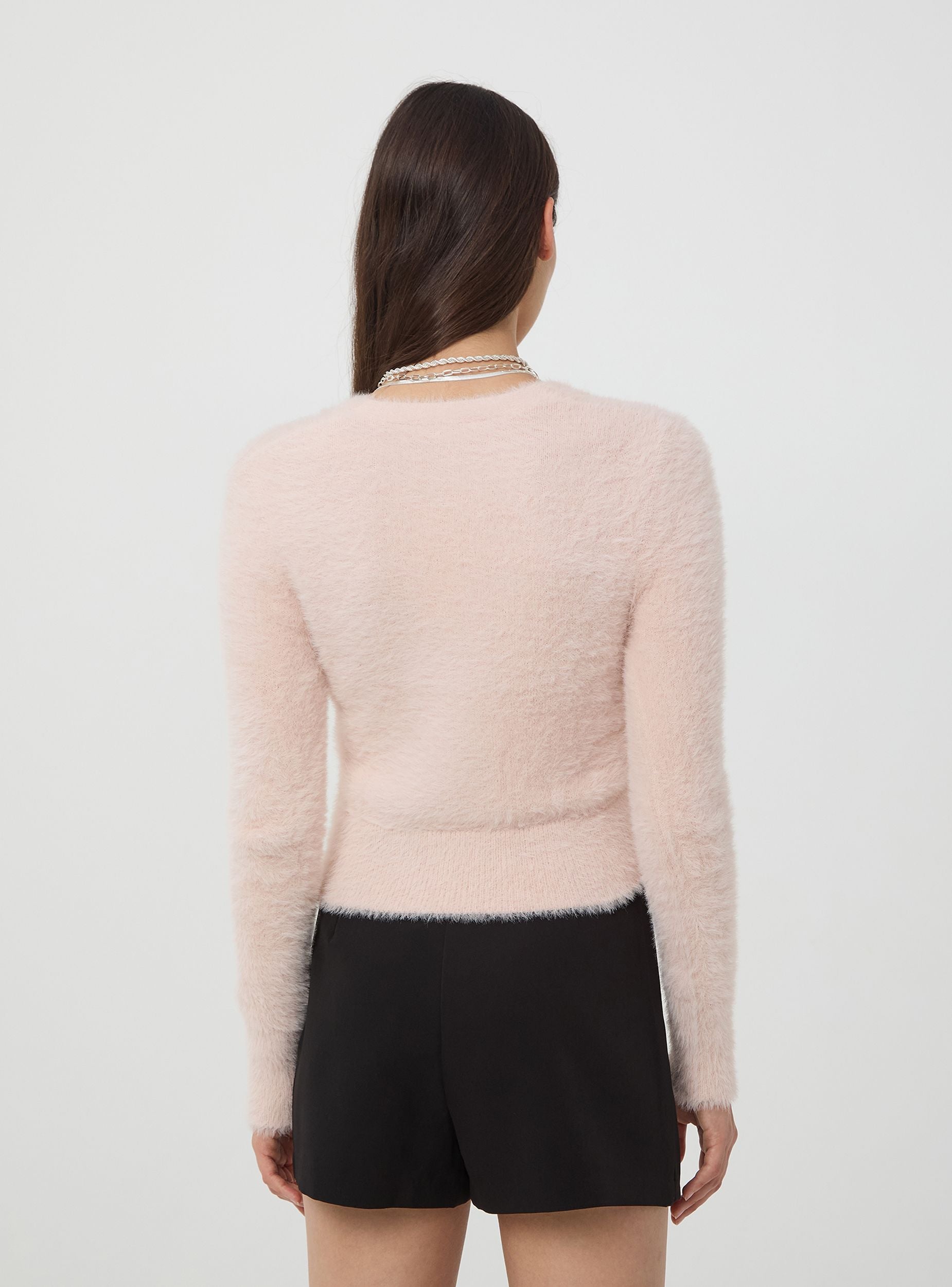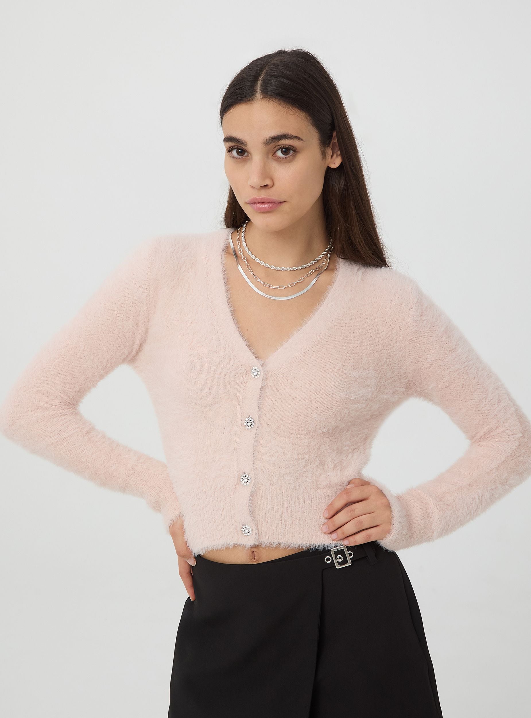 Maglia cardigan da donna a maniche lunghe, realizzata in morbido pelo sintetico con bottoni gioiello frontali. Il cardigan presenta un design classico con scollo a V e chiusura frontale con bottoni gioiello decorativi, che aggiungono un tocco di sofisticatezza. Il pelo sintetico garantisce una morbidezza ineguagliabile, mentre la vestibilità aderente mette in risalto la silhouette femminile. Le maniche lunghe contribuiscono a un look elegante e raffinato, perfetto per essere indossato sia in contesti casual che formali.