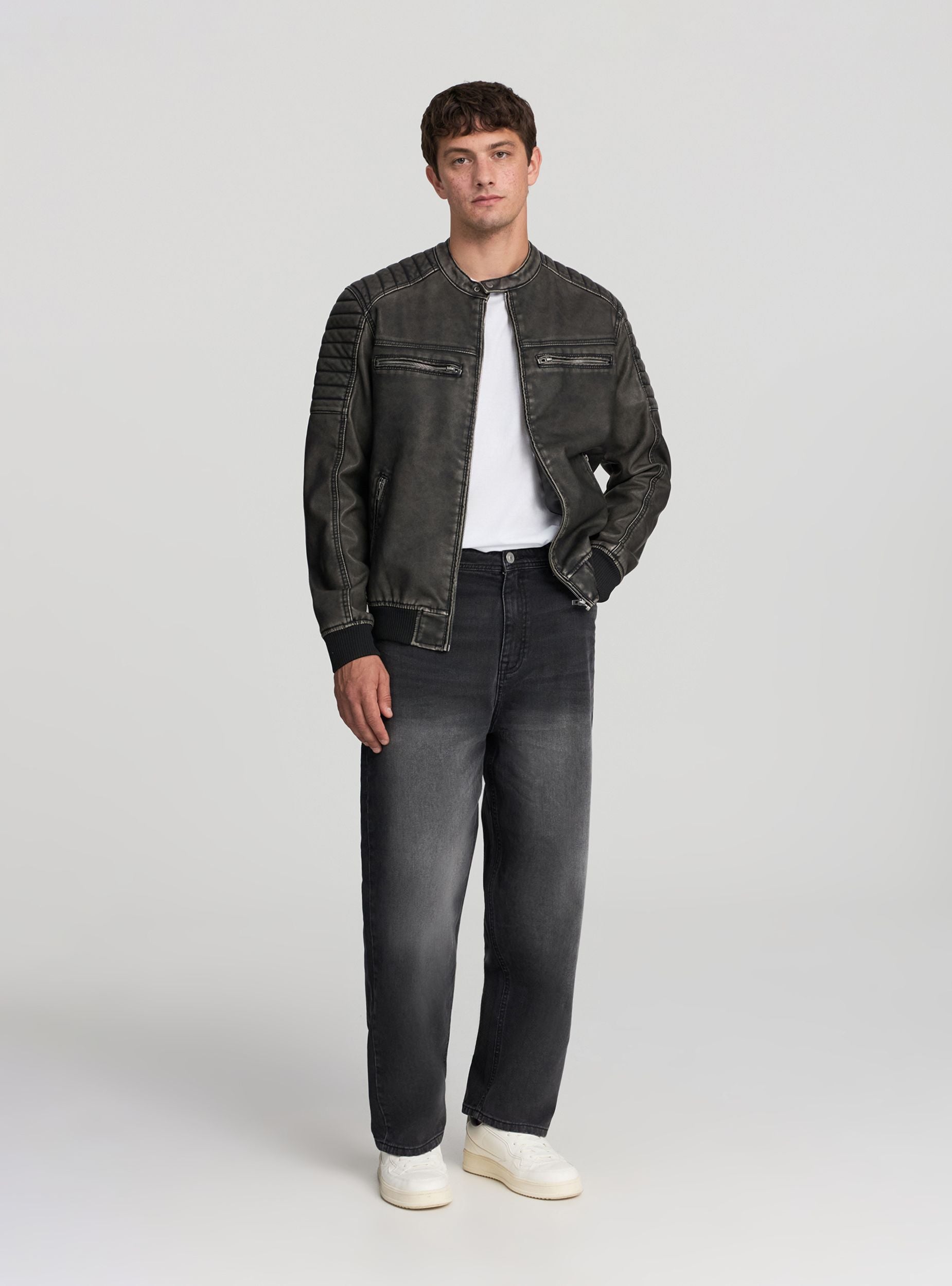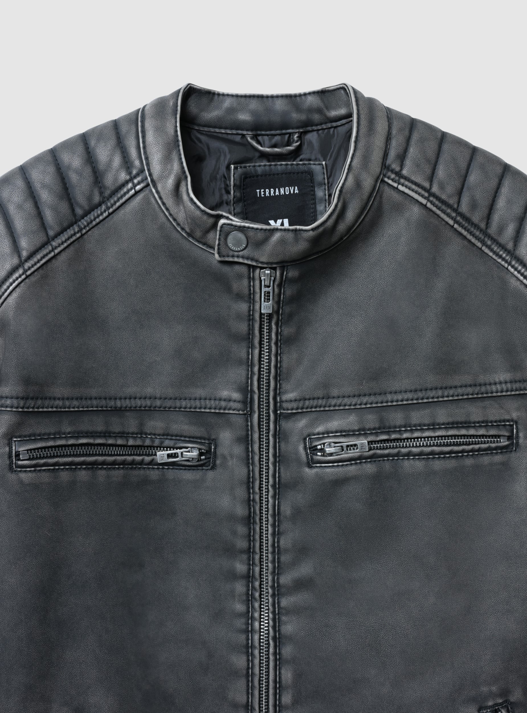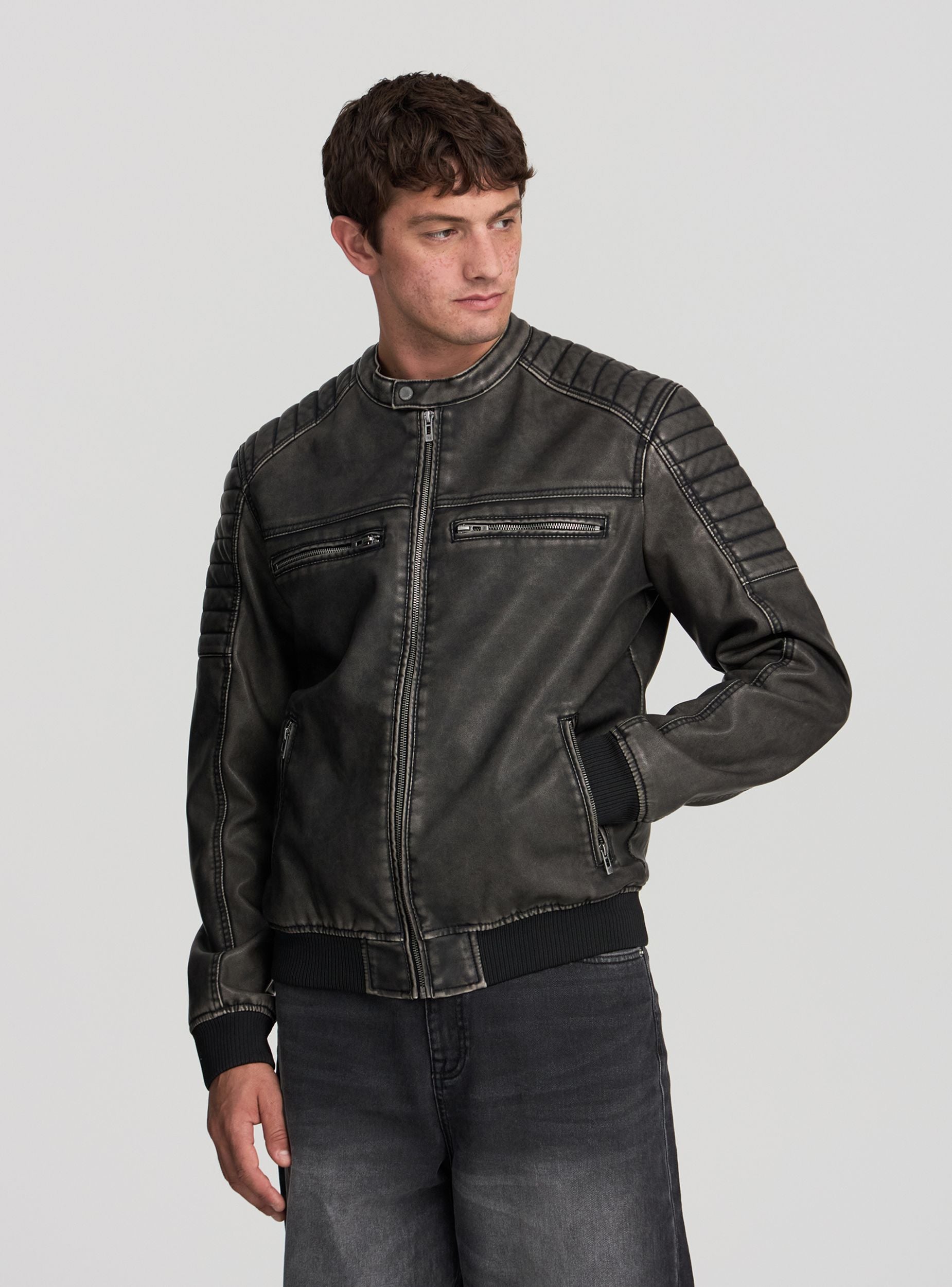 Giubbino da uomo dal taglio biker, perfetto per look decisi e urban. Ideale per il tempo libero o per completare outfit dal gusto rock, presenta maniche lunghe, chiusura con zip, collo alla coreana, tasca interna e tasche con zip sia sul petto che ai lati. Le cuciture decorative e l’effetto rovinato gli donano un carattere grintoso e contemporaneo. Si abbina facilmente a jeans slim e stivaletti per uno stile audace.