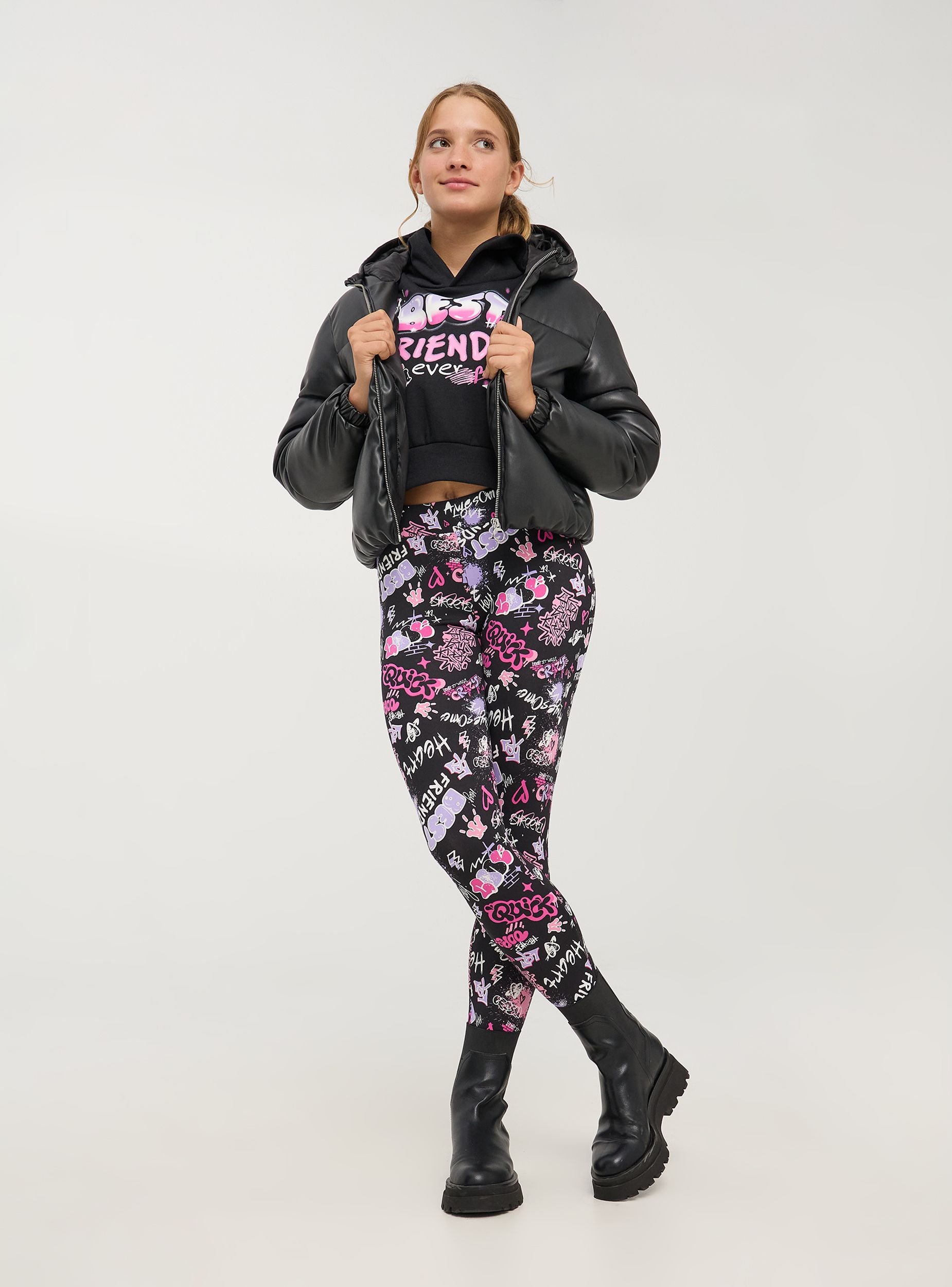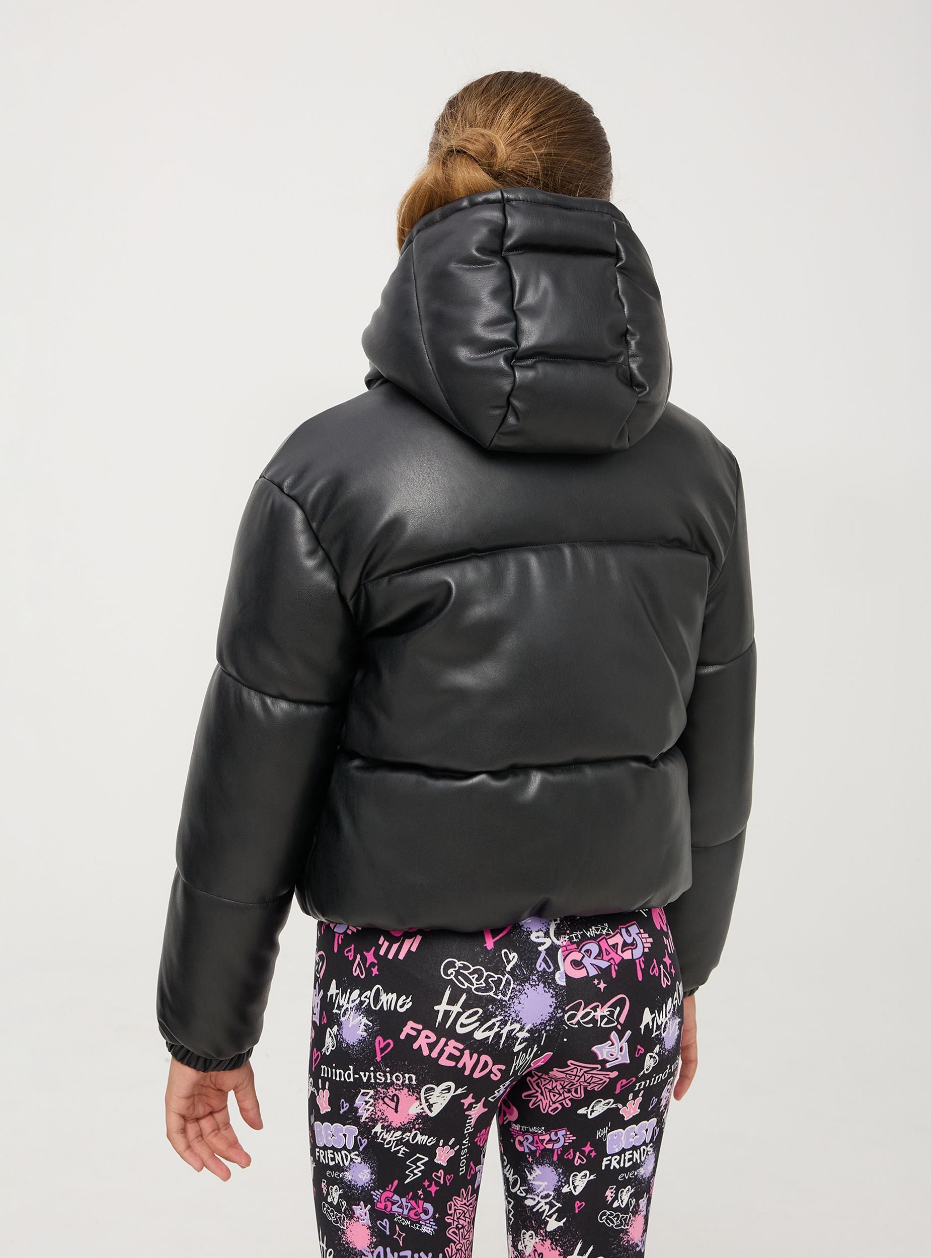 Giubbotto imbottito da bambina a tinta unita in similpelle. Presenta un design moderno e accattivante, perfetto per affrontare le giornate più fredde con stile. Dotaoa di una zip frontale, cappuccio avvolgente e tasche laterali, offre funzionalità e comfort. Le cuciture orizzontali aggiungono un tocco di eleganza. Vestibilità ampia e comoda, ideale per look casual e urban. Perfetta per uscite invernali e attività all'aperto.