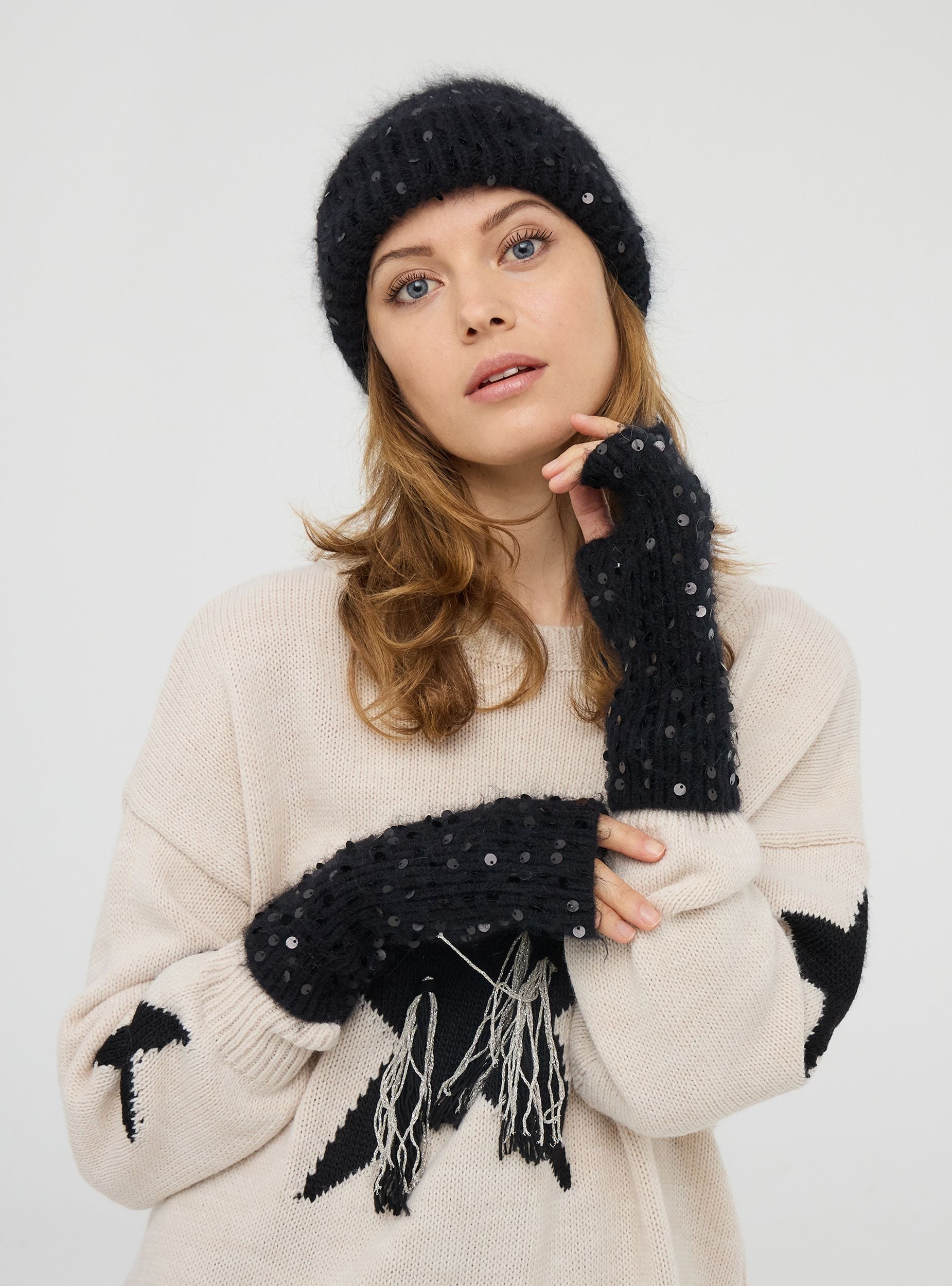 Guanti da donna, modello senza dita, a tinta unita decorati con paillettes. Perfetti per aggiungere un tocco di stile ai tuoi outfit invernali.