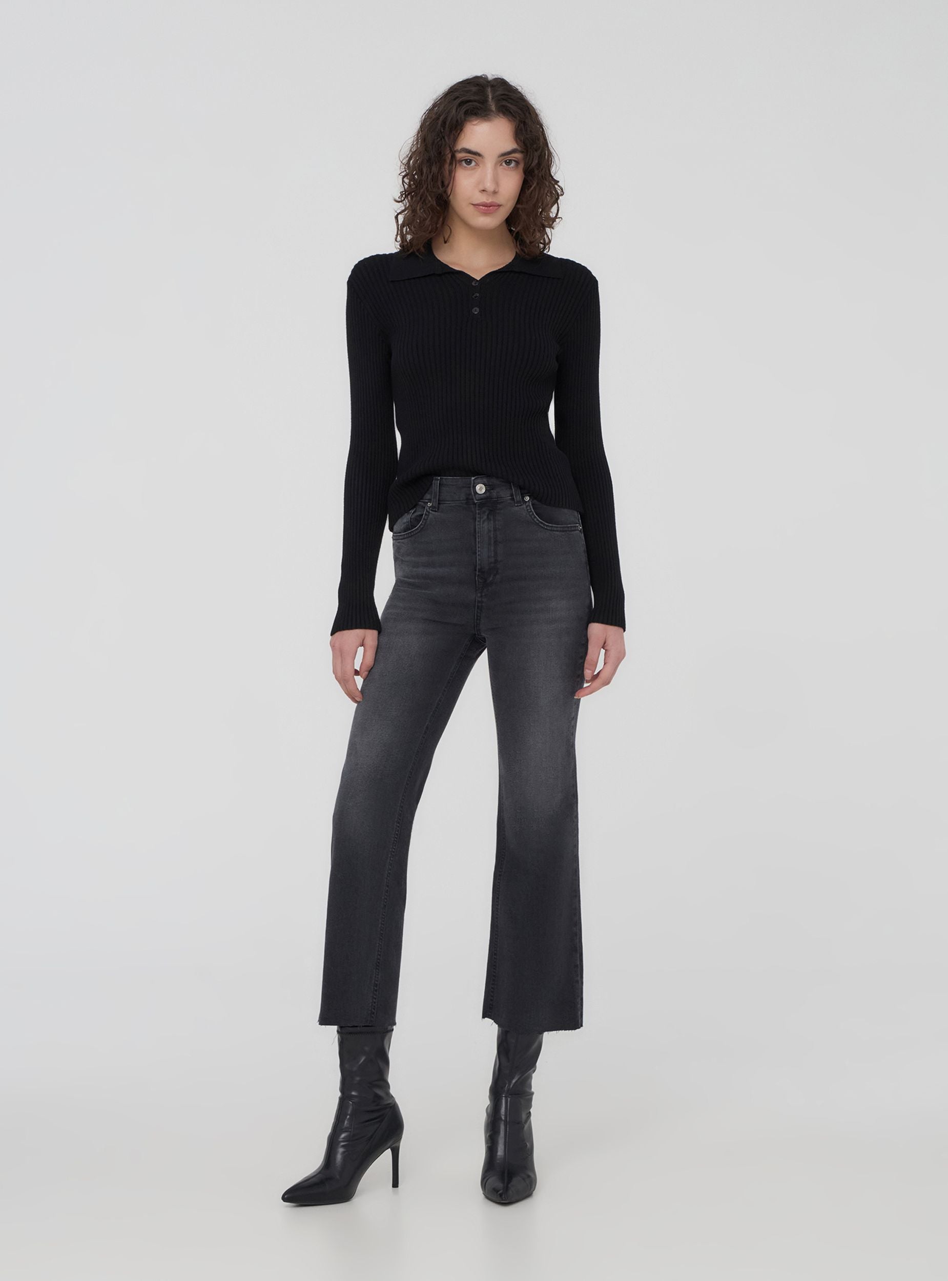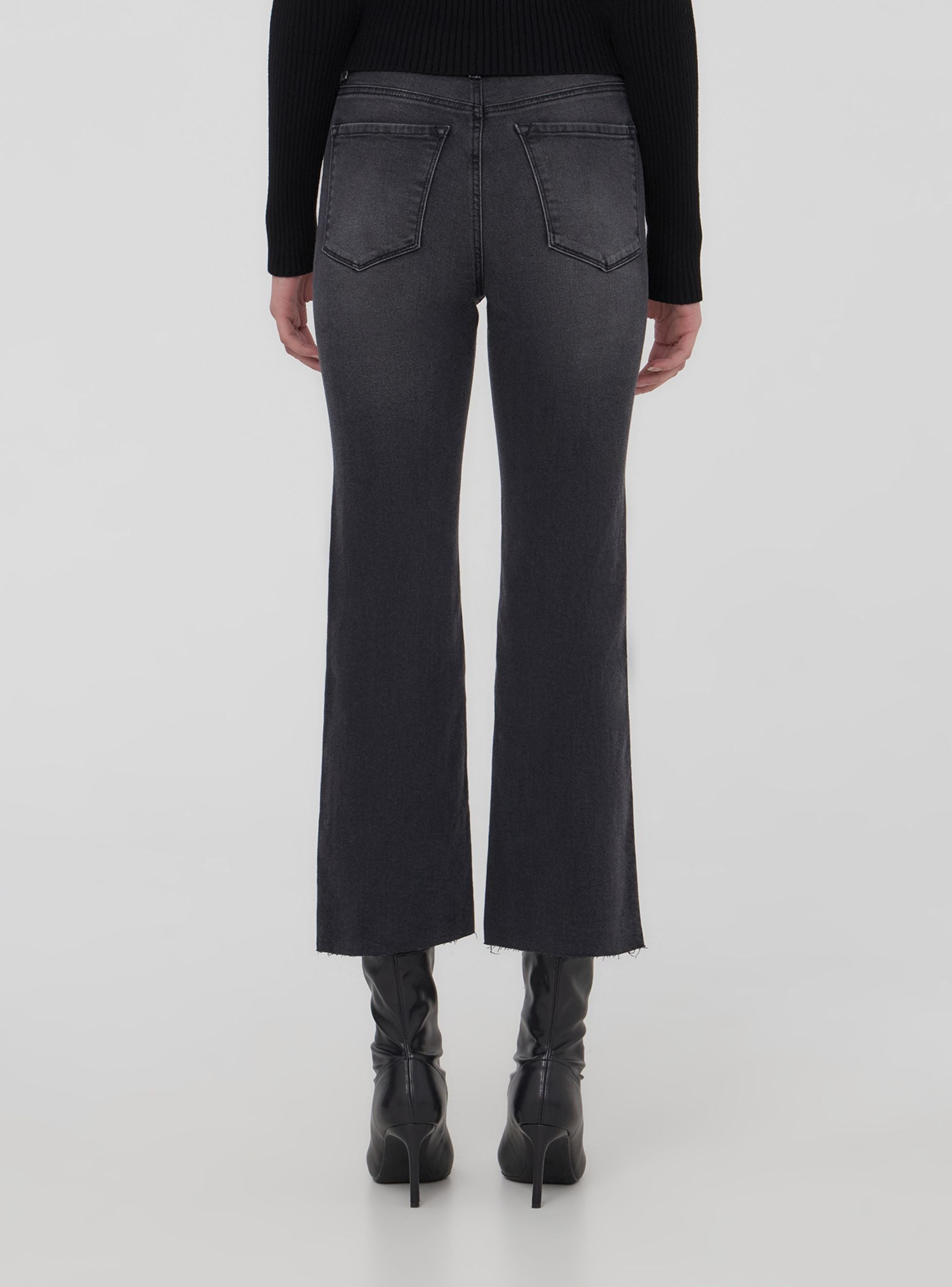 Jeans kick flare da donna caratterizzati da un taglio aderente fino al ginocchio, dove si aprono leggermente verso il basso, creando una svasatura moderata. Questo stile combina l'aderenza dei jeans skinny nella parte superiore con l'ampiezza dei pantaloni a zampa d'elefante, ma in una versione più sottile e moderna. Terminano sopra la caviglia mettendo in evidenza le scarpe e creando un look versatile che può essere sia casual che elegante. Questo modello è perfetto per bilanciare le proporzioni del corpo, allungando visivamente le gambe e aggiungendo un tocco di stile retrò al guardaroba.Dettagli