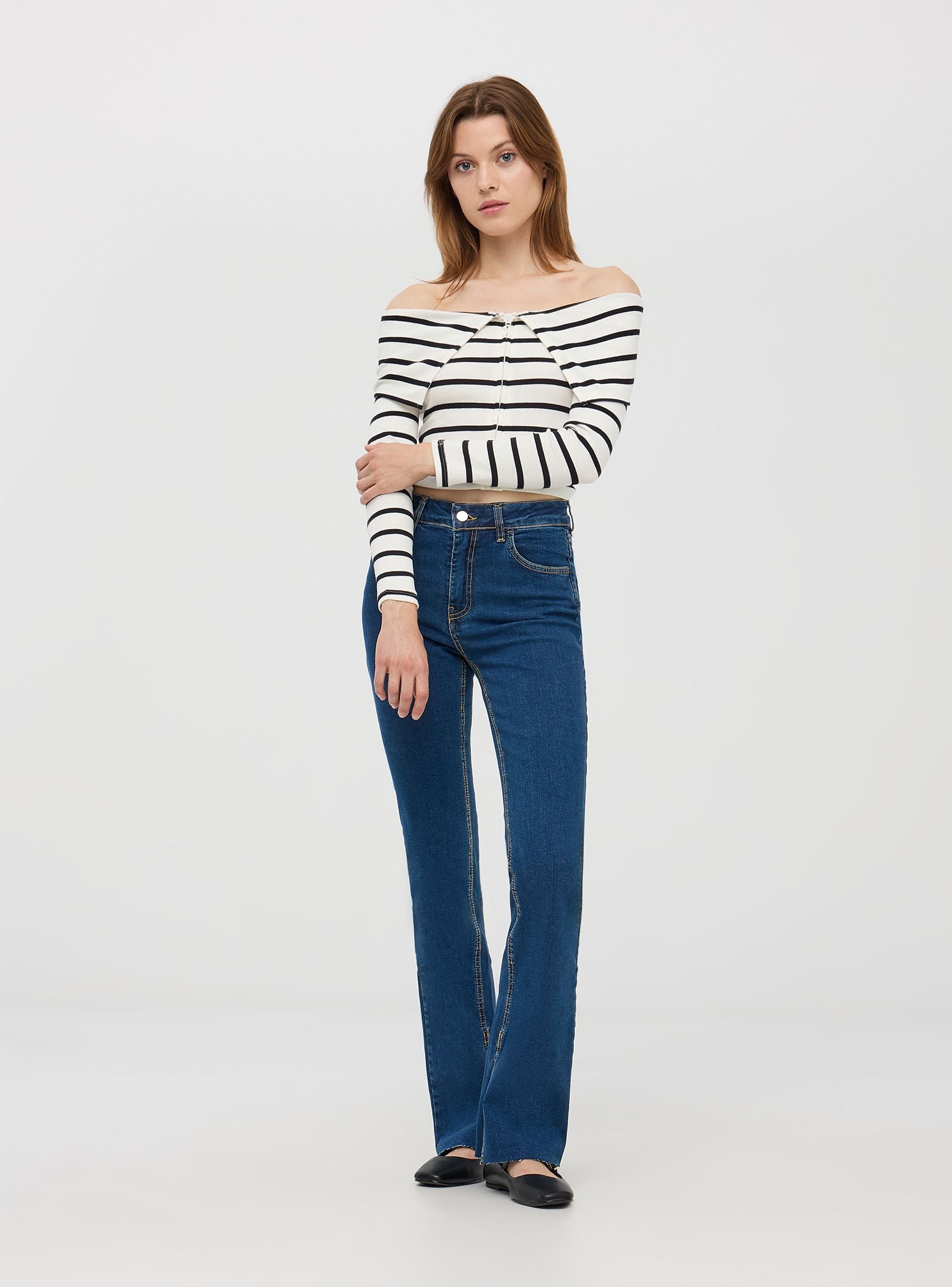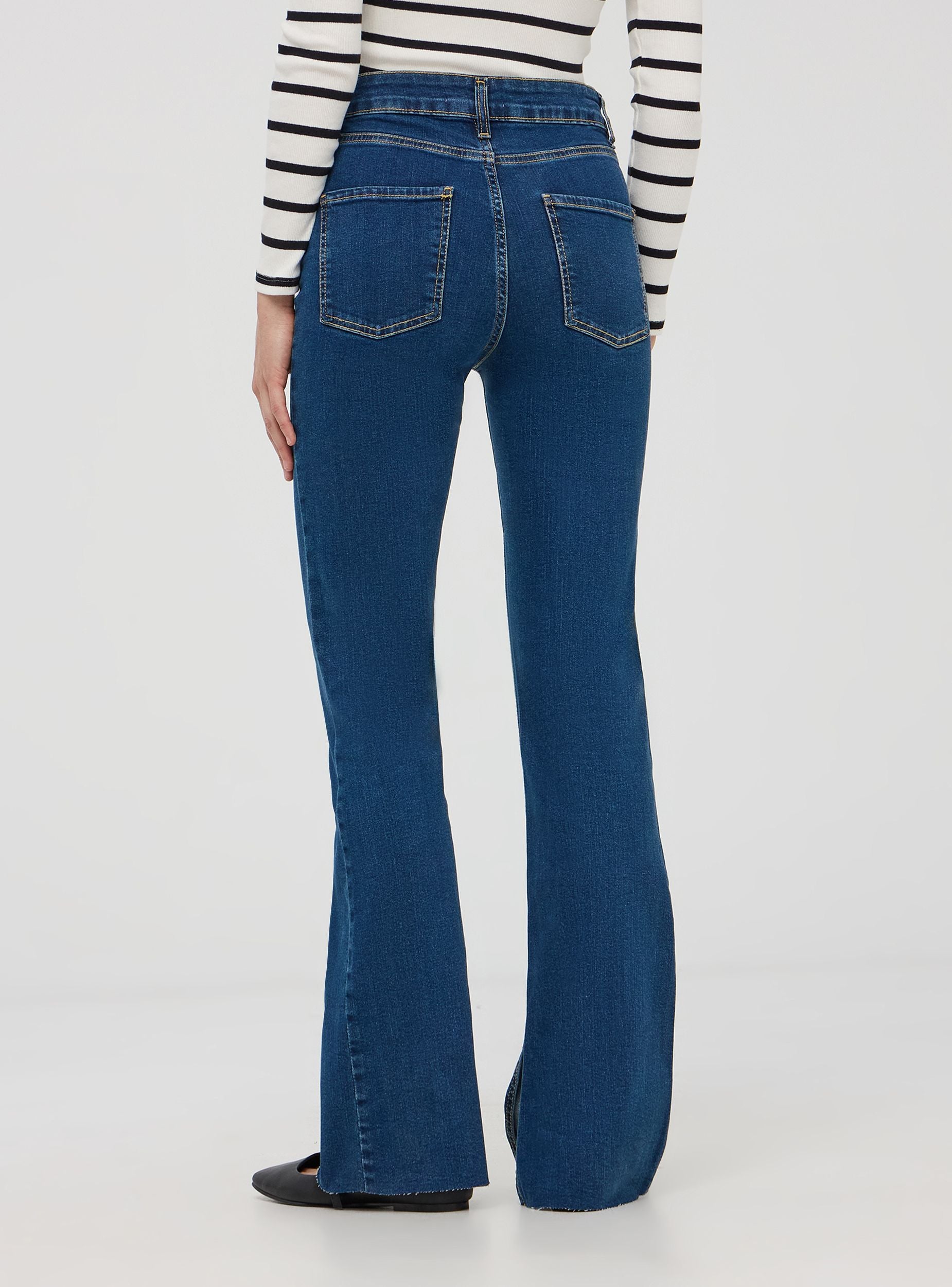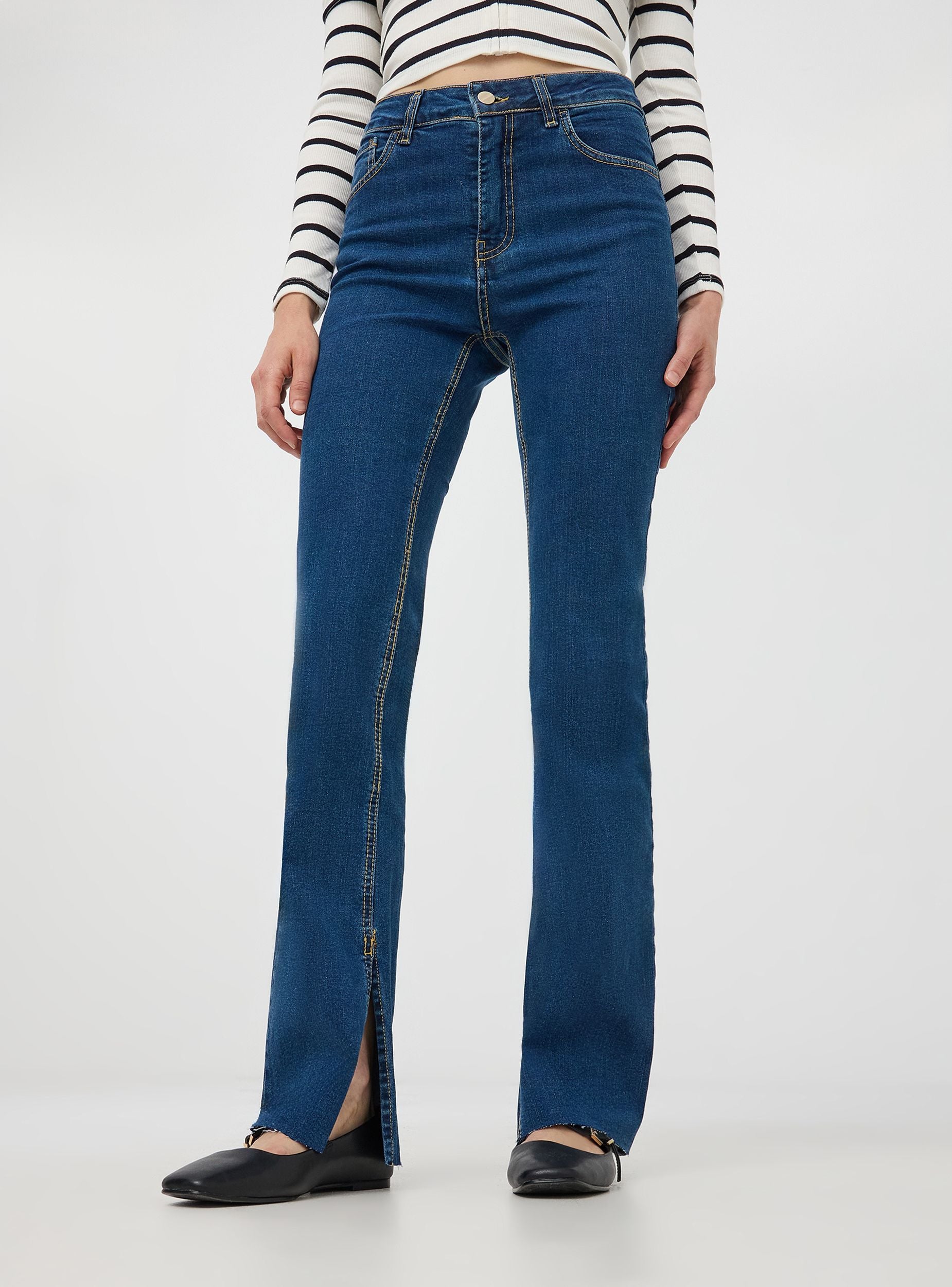 Jeans straight da donna realizzati in denim di colore blu medio e presentano una linea dritta che valorizza la figura in modo semplice ed elegante. Il dettaglio distintivo di questi jeans è lo spacco interno in entrambe le gambe che aggiunge un tocco di originalità e stile al capo. I jeans sono dotati di cinque tasche funzionali. Perfetti per un look casual ma ricercato, possono essere abbinati a maglie e top per creare outfit versatili e alla moda.Dettagli
