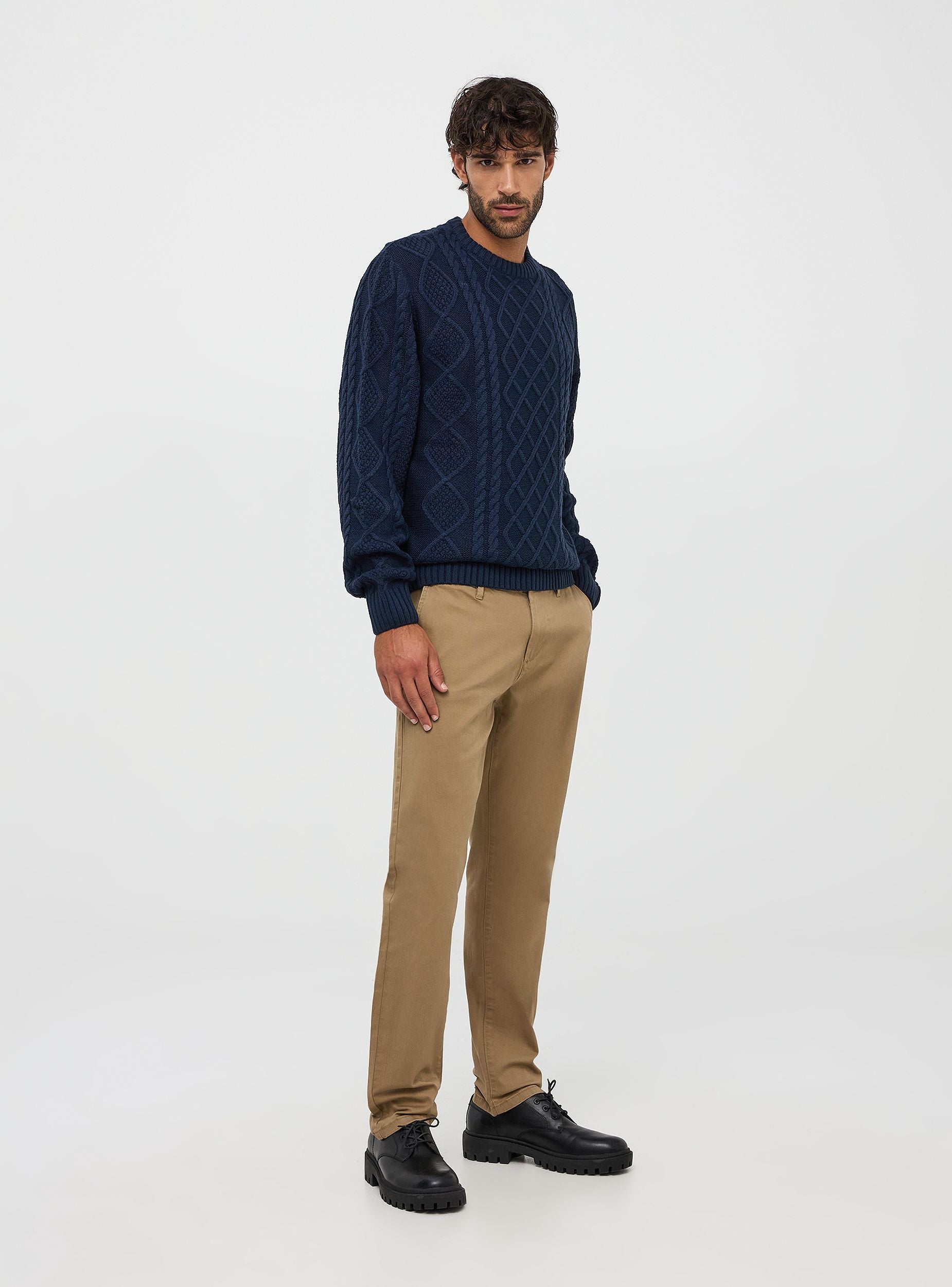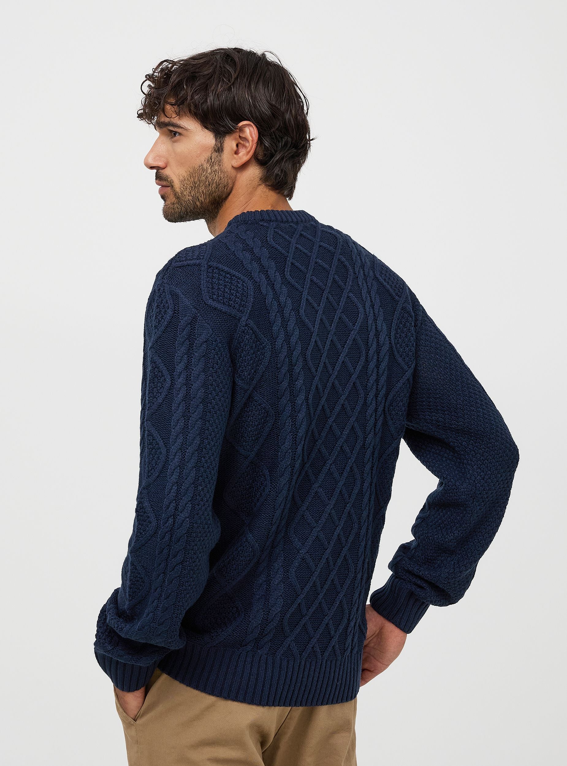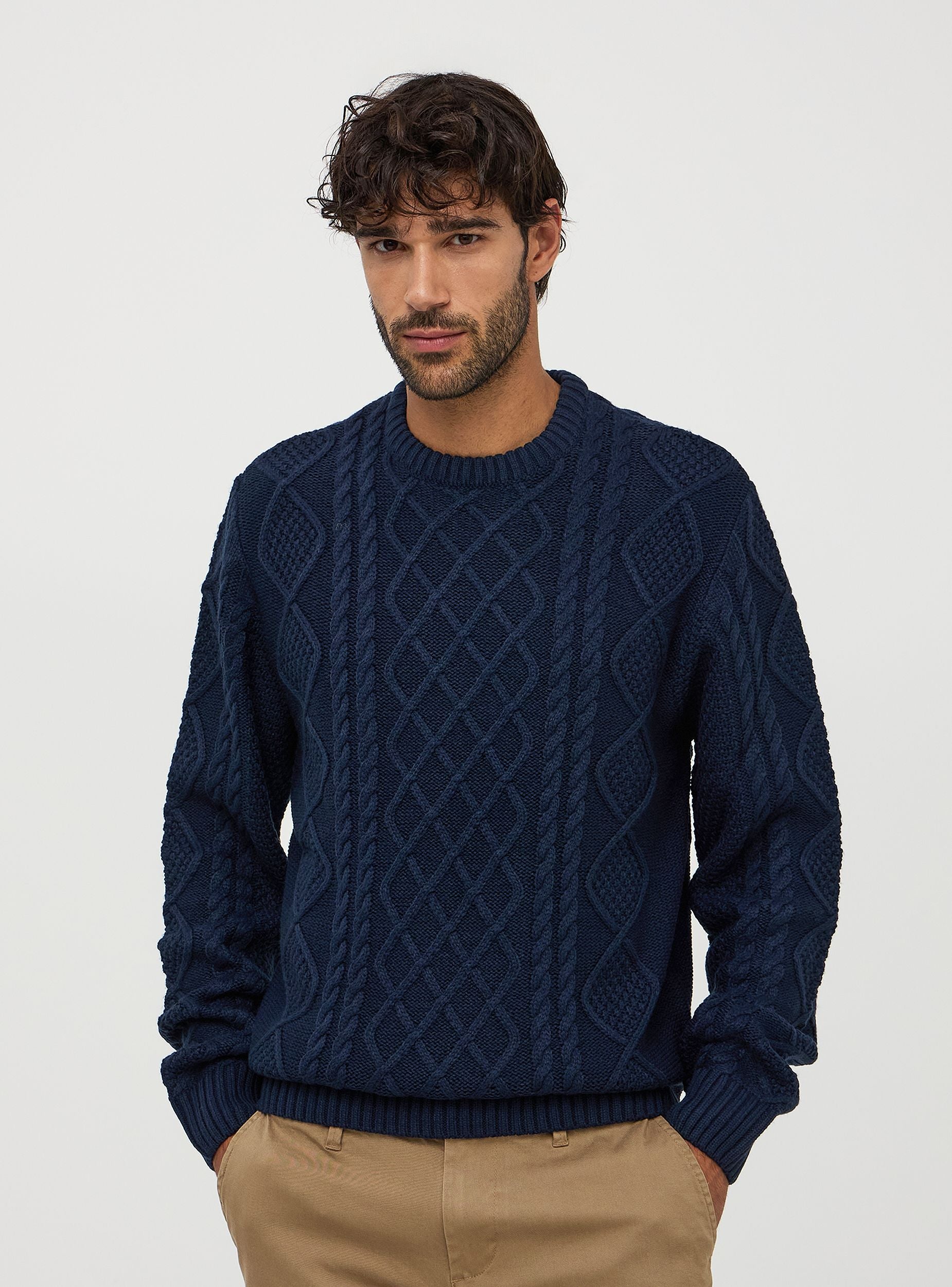 Maglia da uomo con un design a trecce, caratterizzata da un motivo intrecciato su tutta la superficie sia sul davanti che sul retro. La maglia ha una vestibilità regular e presenta orli a costine sul colletto, sui polsini e sulla base, che conferiscono un aspetto elegante e tradizionale. Il capo è adatto per essere indossato durante la stagione invernale, offrendo calore e stile.