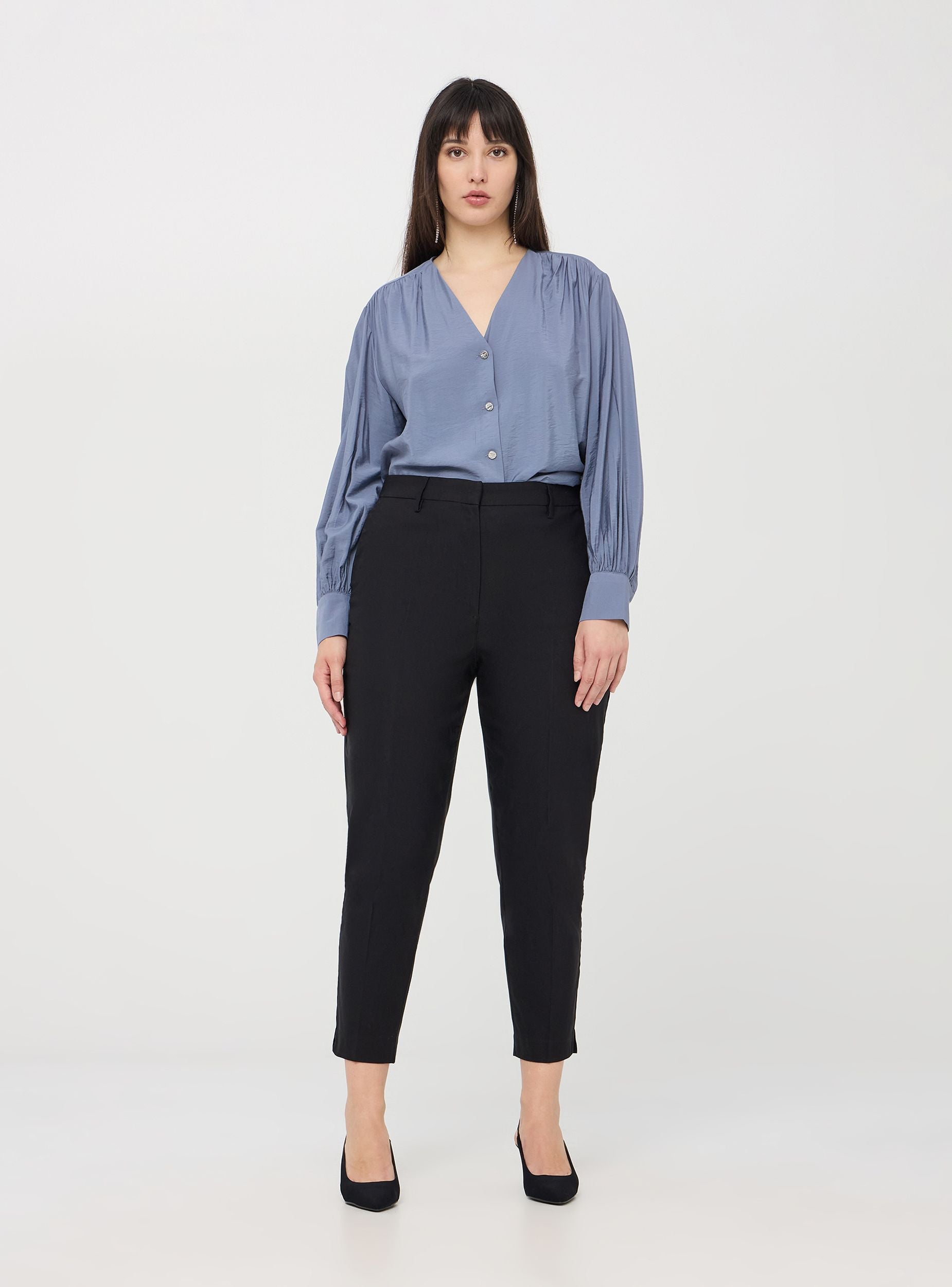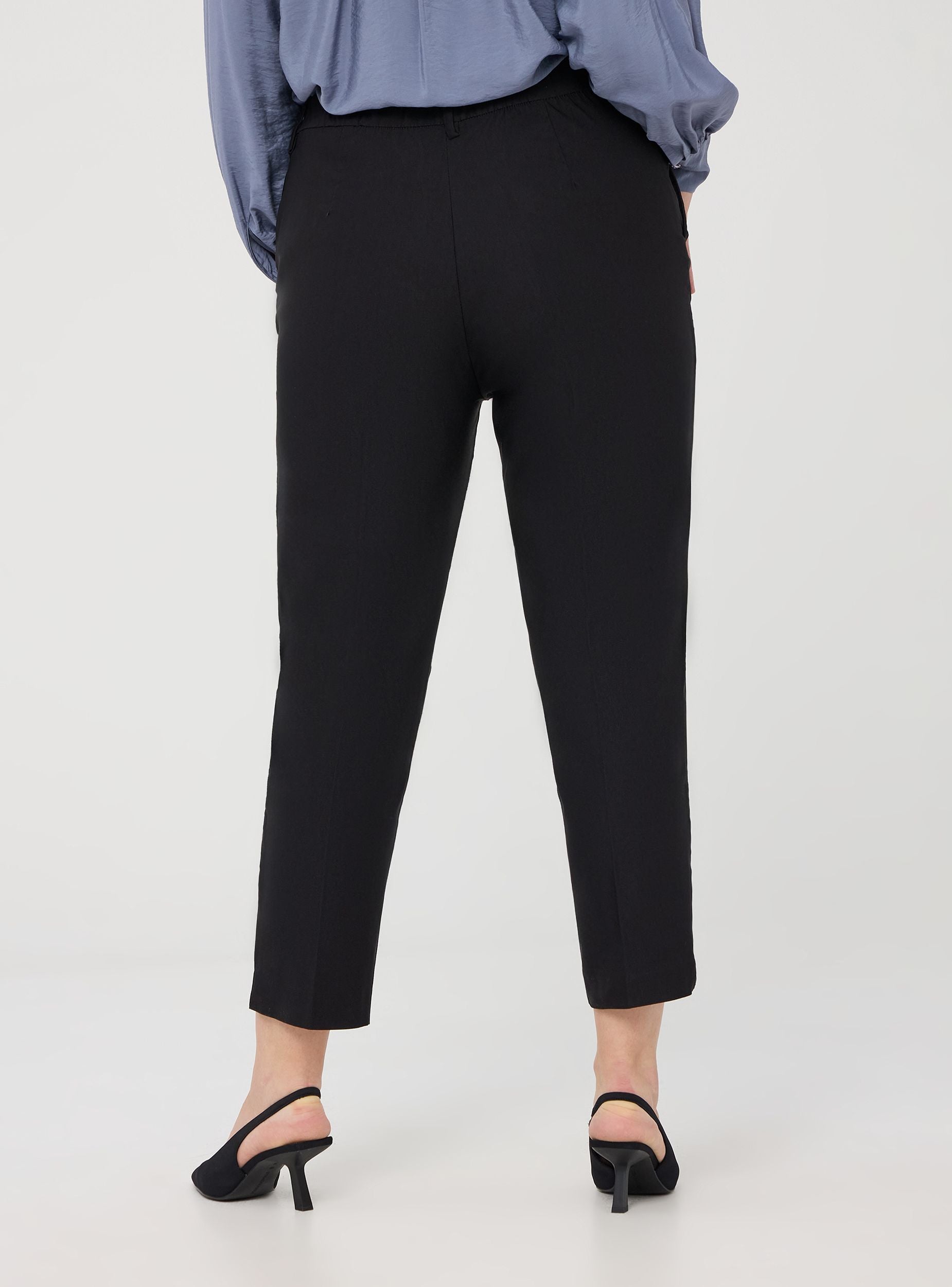 Pantaloni da donna eleganti con tasche alla francese. Questo capo presenta una linea classica con pieghe anteriori e posteriori per un effetto sartoriale. La vita è dotata di un elastico interno per garantire comfort e vestibilità, mentre una chiusura con gancio metallico e cerniera frontale assicura una chiusura sicura. Adatti sia per occasioni formali che per un look casual-chic.