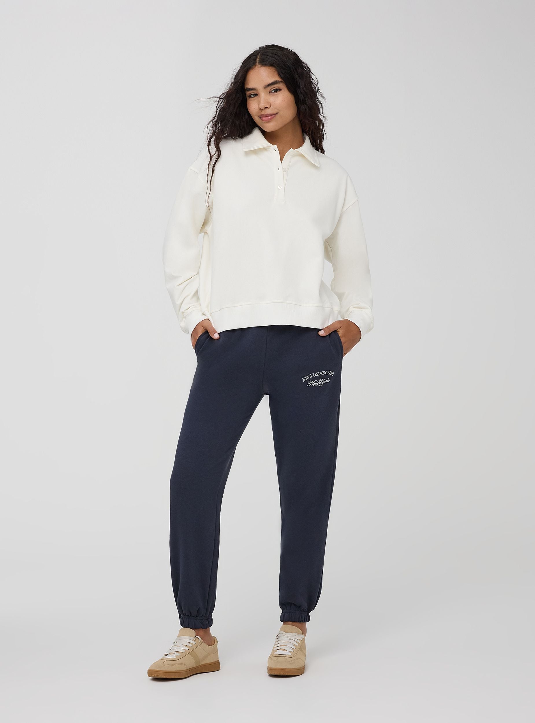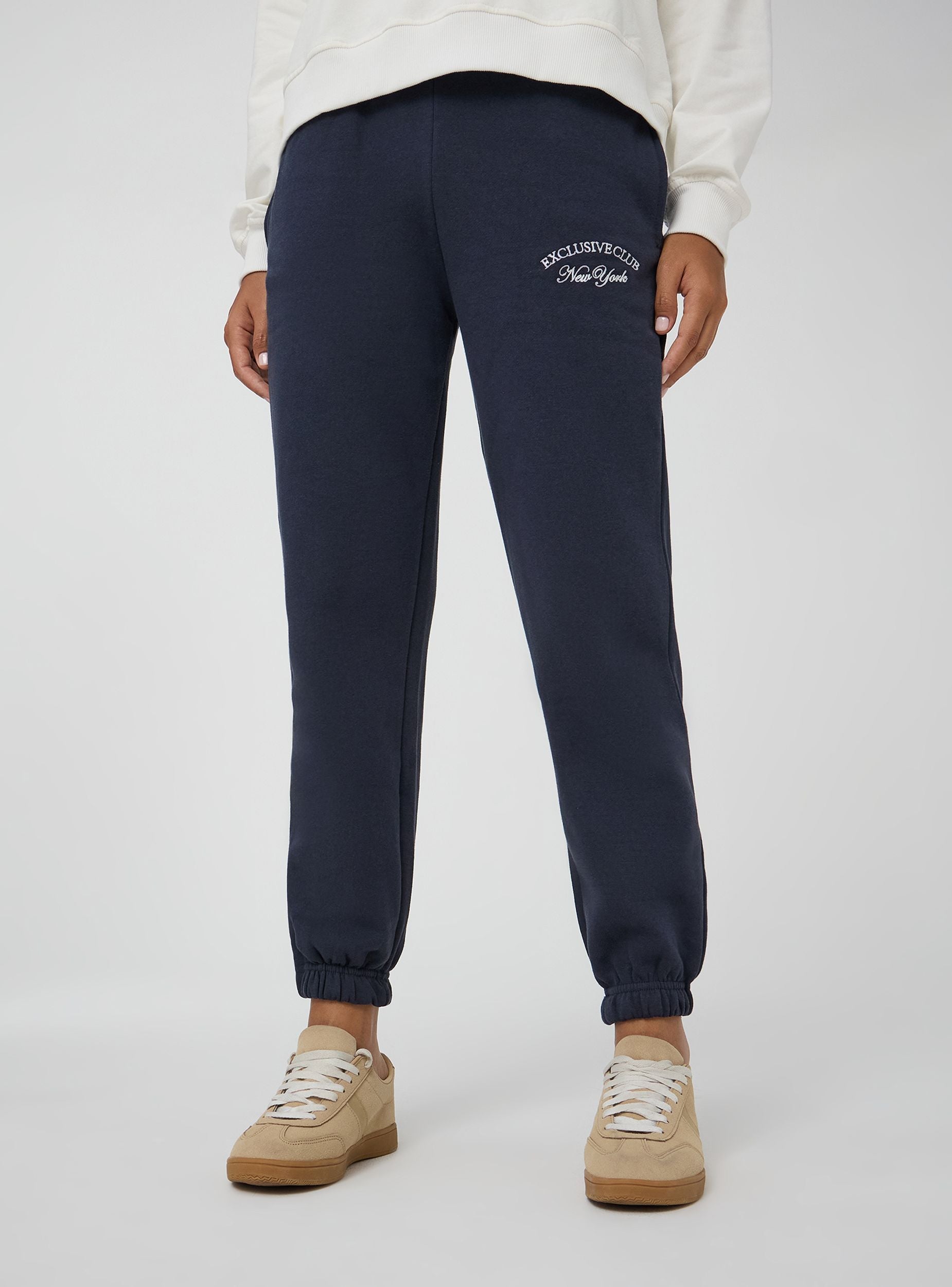 Questi pantaloni della tuta da donna hanno una vestibilità comoda e rilassata, perfetta per un look casual. Il design presenta un ricamo in stile college "Exclusive Club New York" sulla gamba sinistra. Sono dotati di una vita alta elasticizzata e polsini elasticizzati alle caviglie per un'aderenza ottimale. Le due tasche laterali aggiungono funzionalità e praticità. Ideali per il tempo libero, attività sportive o momenti di relax. Realizzati in tessuto pesante a tinta unita.Dettagli