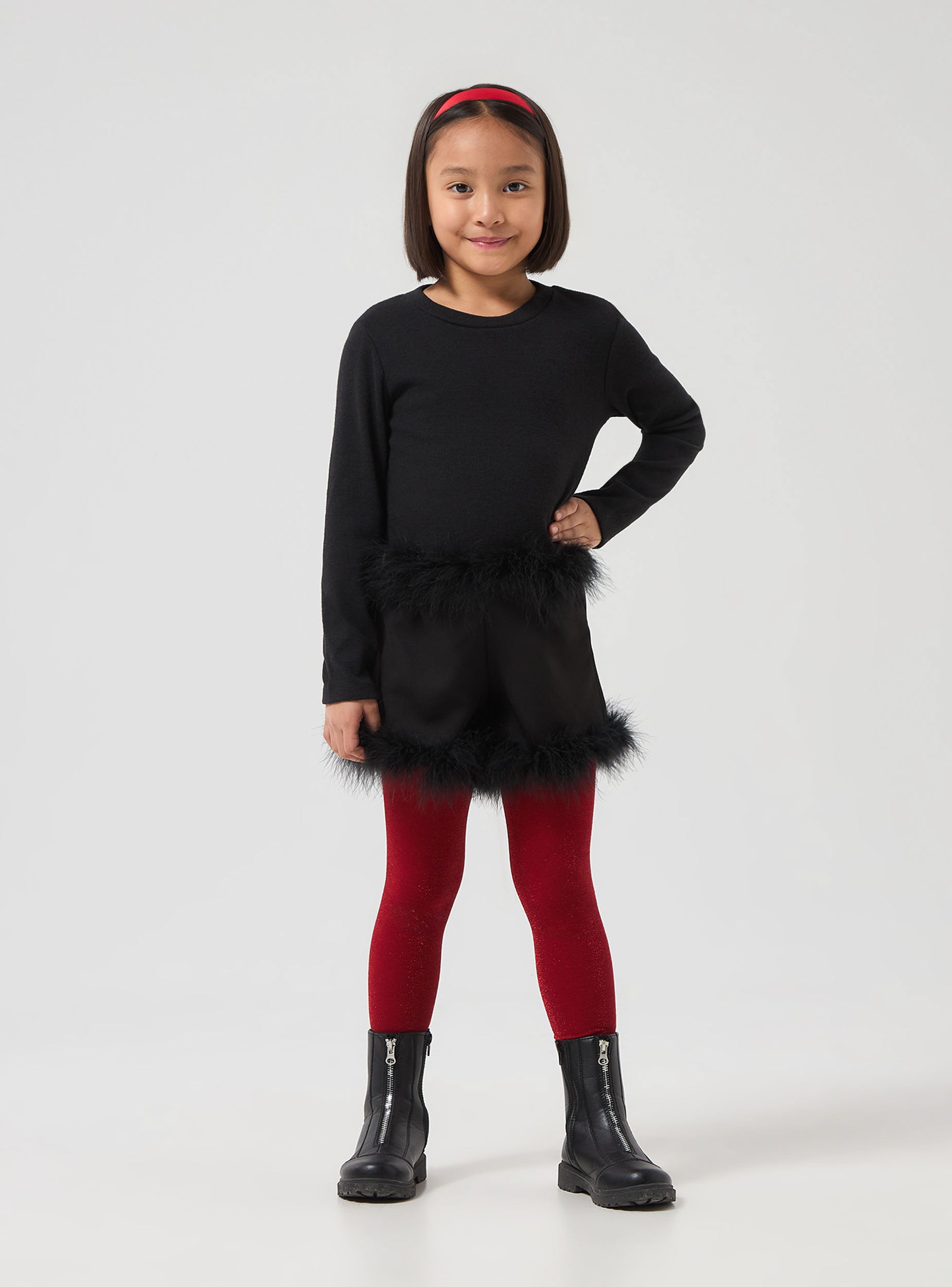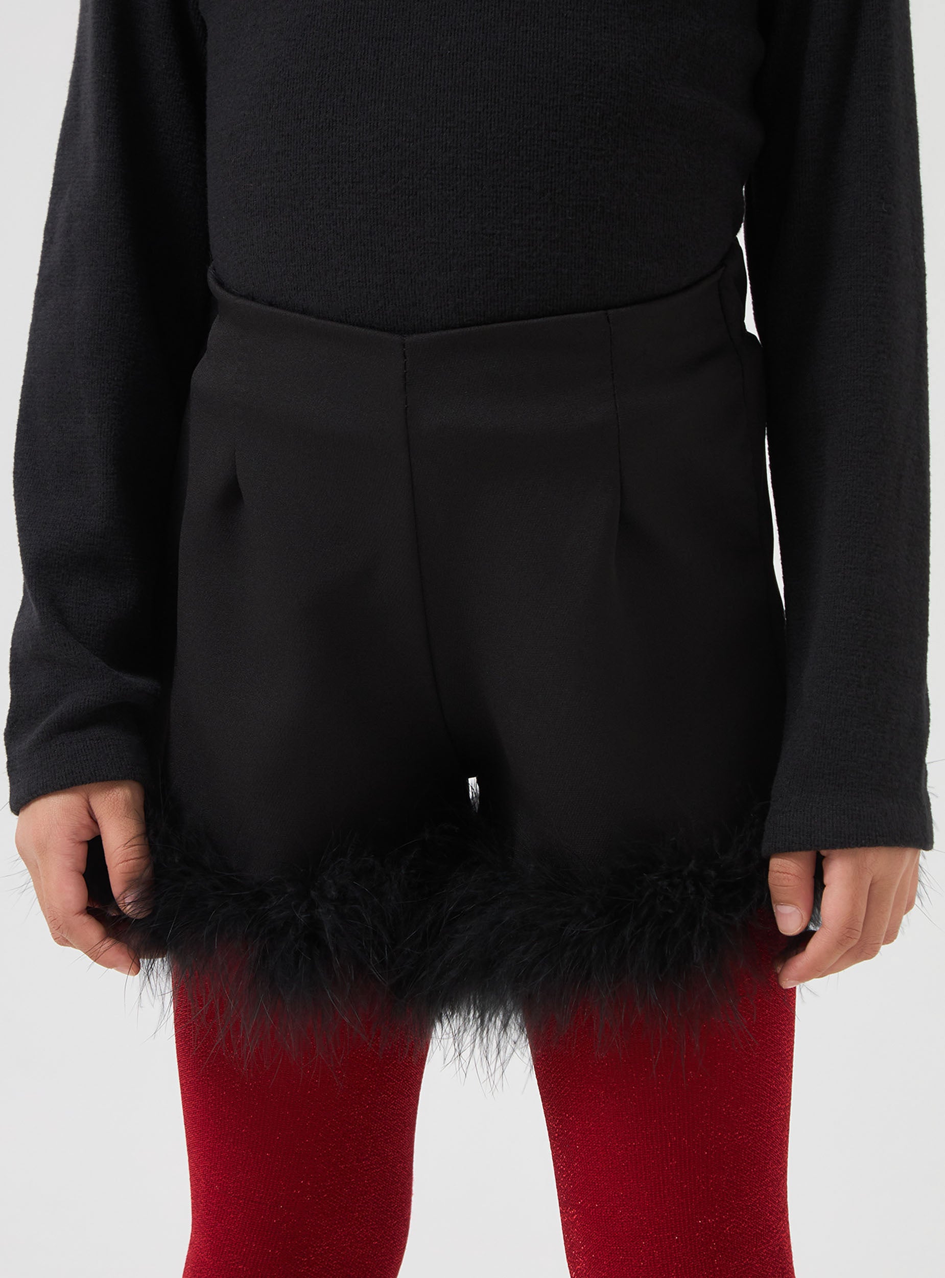 Pantaloncino elegante da bimba con pinces e applicazione in piume . Modello con elastico in vita sul retro