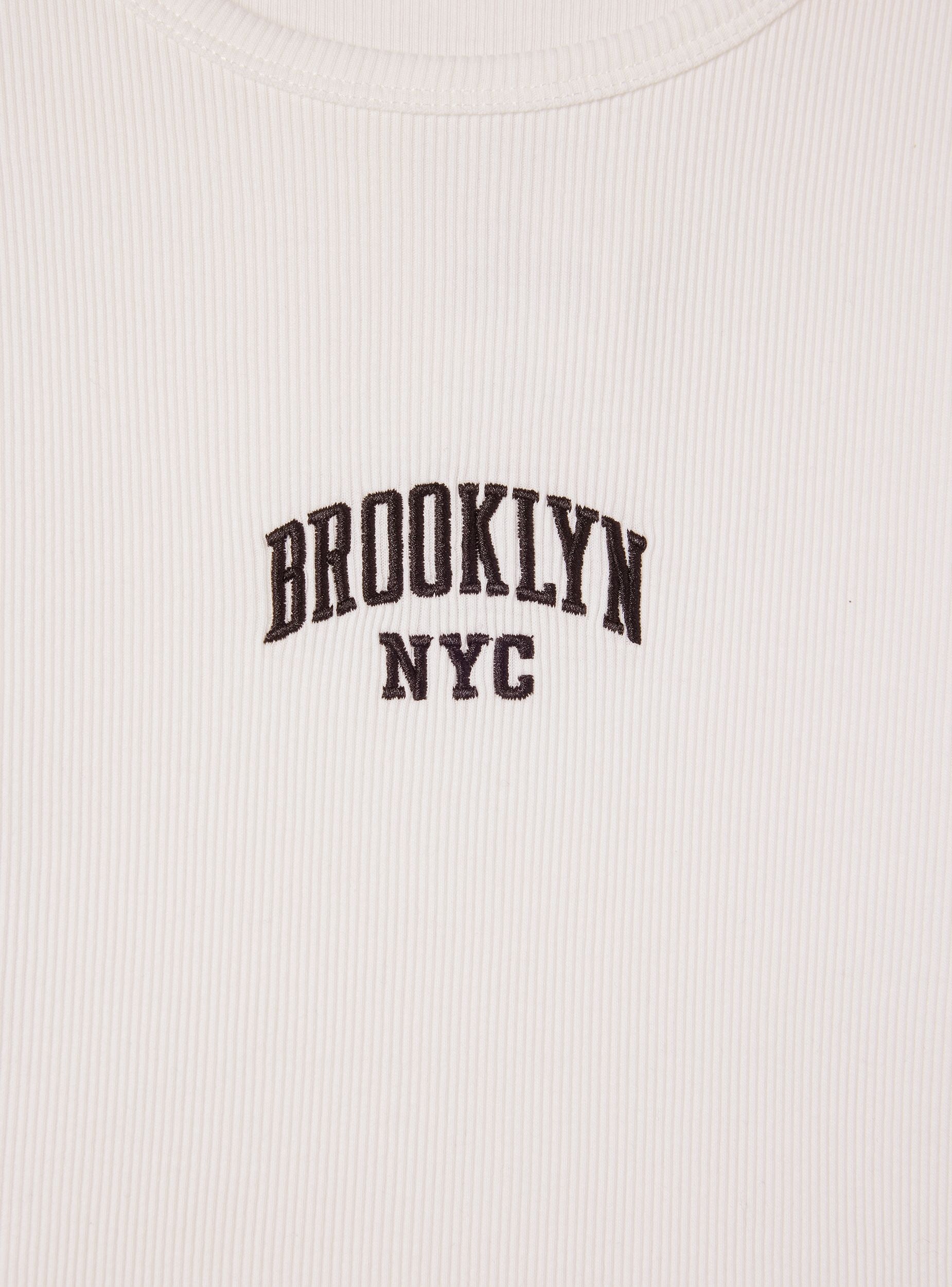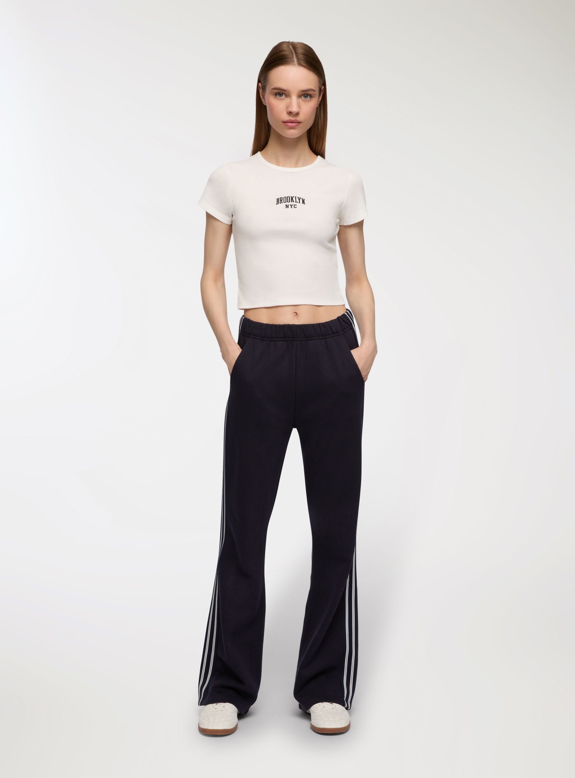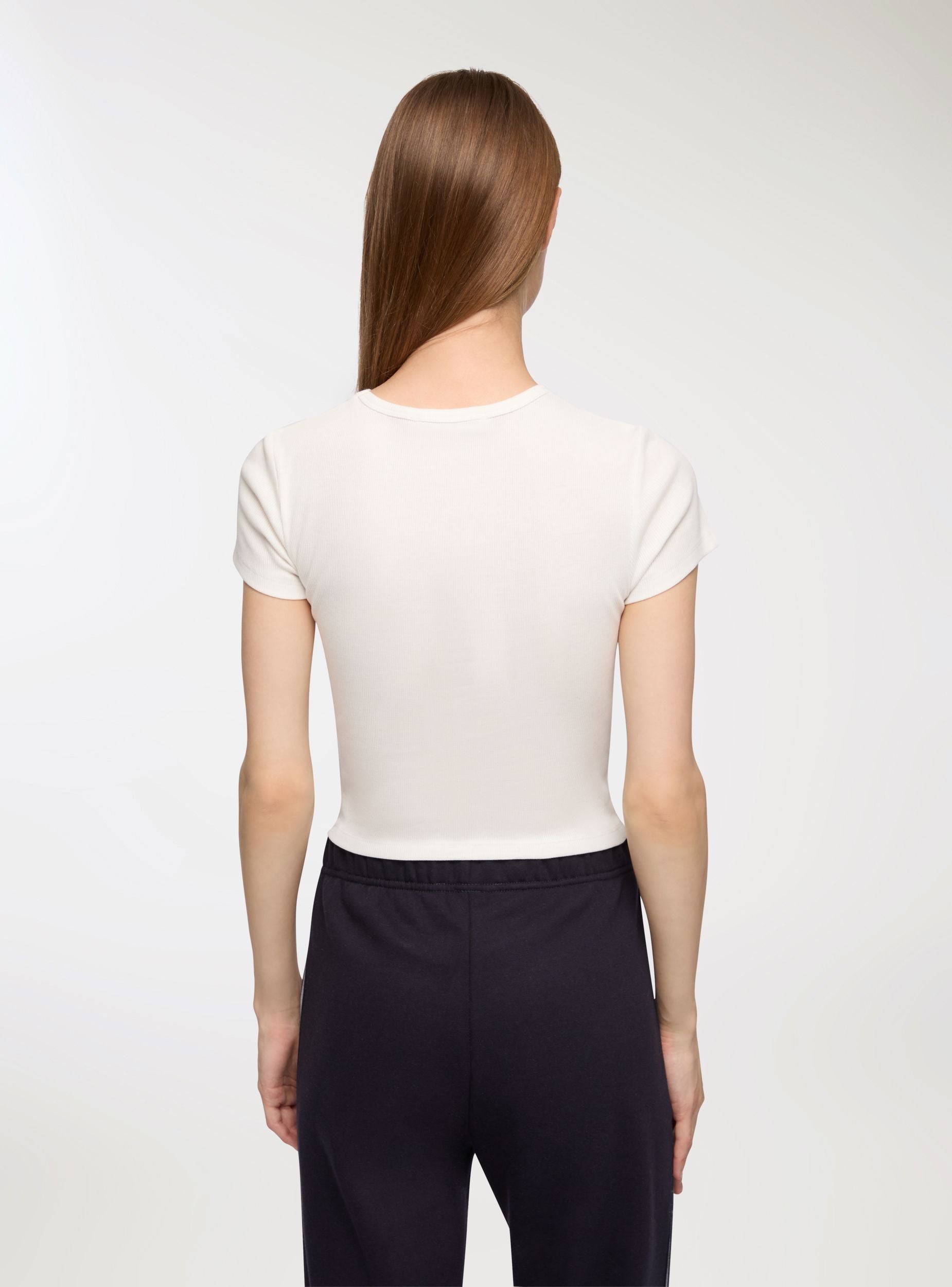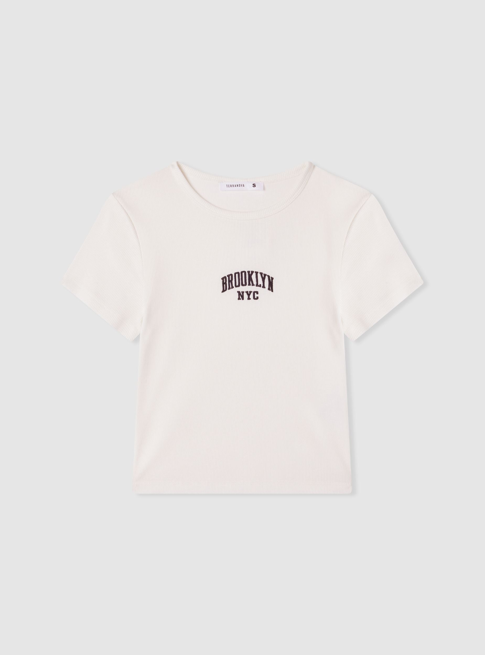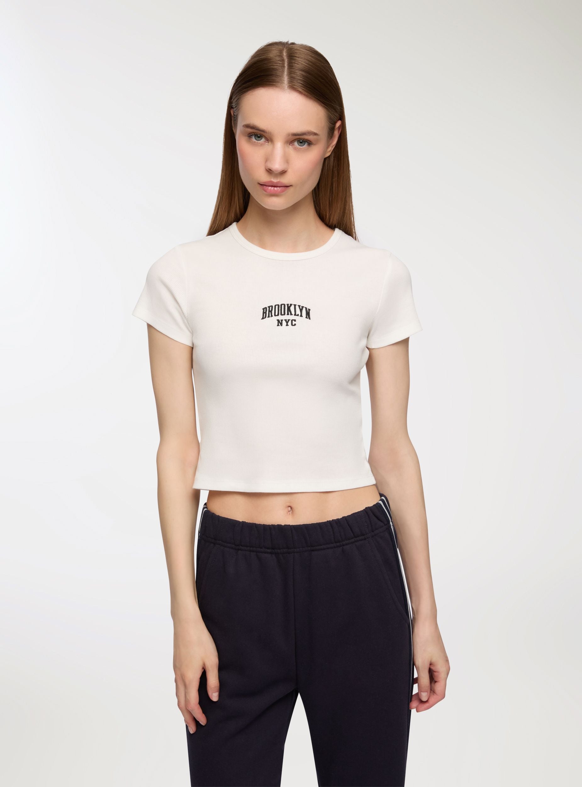 Maglietta crop da donna in tessuto a costine, con maniche corte e girocollo, perfetta per uno stile sportivo e urbano. Il dettaglio con scritta frontale in stile college dona un tocco grintoso e contemporaneo, ideale per look casual e dinamici. La vestibilità aderente valorizza la figura, rendendola un capo versatile da abbinare a jeans, joggers o gonne a vita alta.