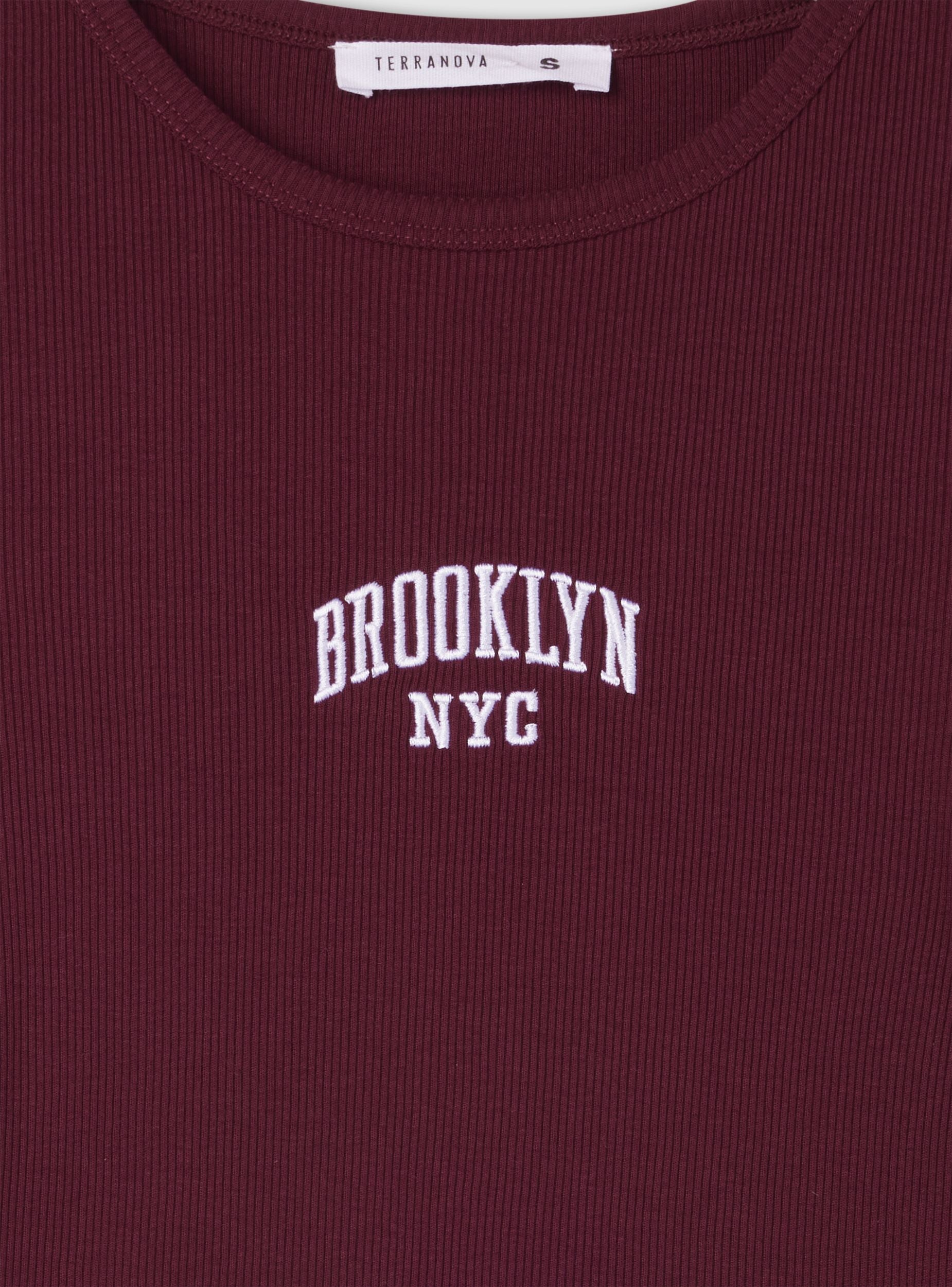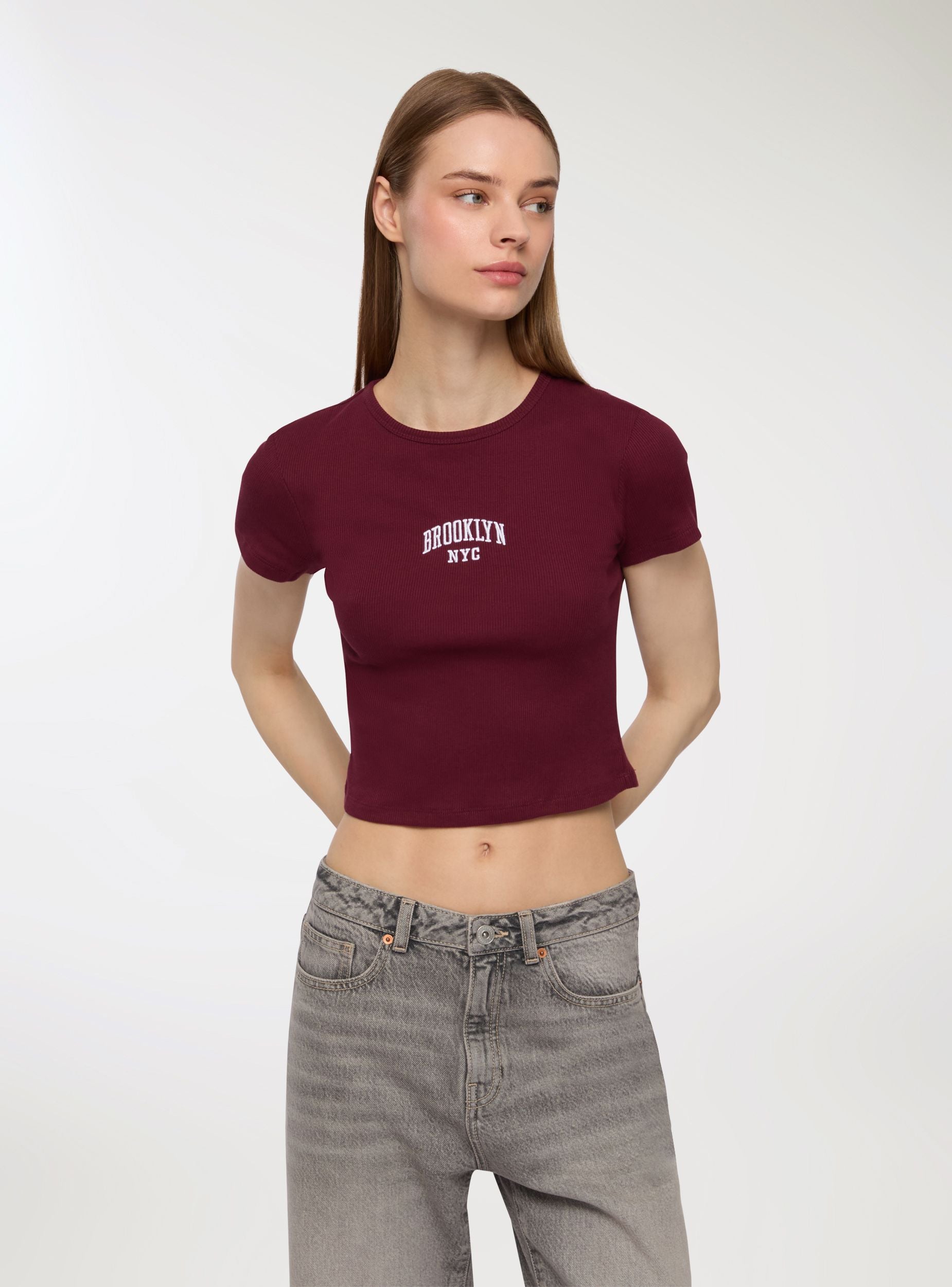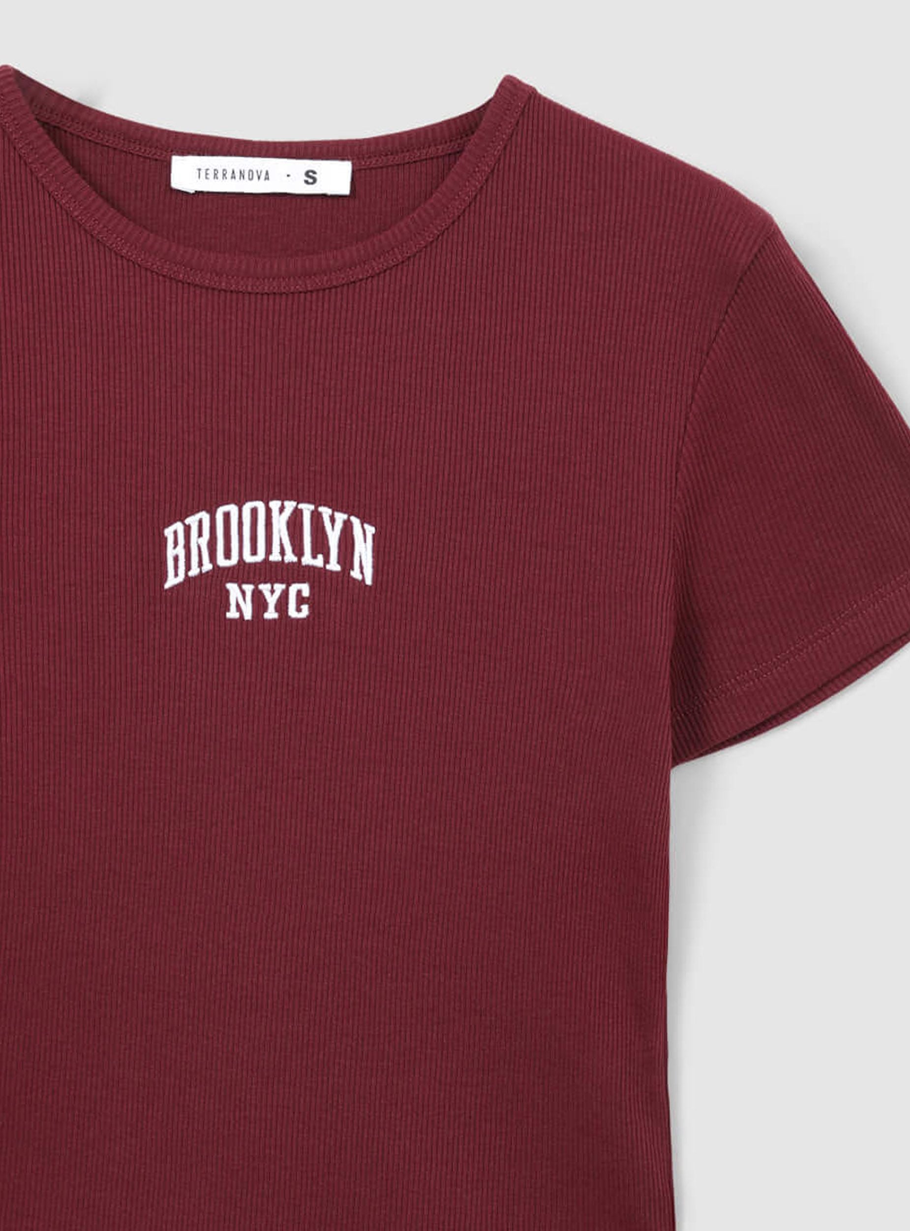 Maglietta crop da donna in tessuto a costine, con maniche corte e girocollo, perfetta per uno stile sportivo e urbano. Il dettaglio con scritta frontale in stile college dona un tocco grintoso e contemporaneo, ideale per look casual e dinamici. La vestibilità aderente valorizza la figura, rendendola un capo versatile da abbinare a jeans, joggers o gonne a vita alta.