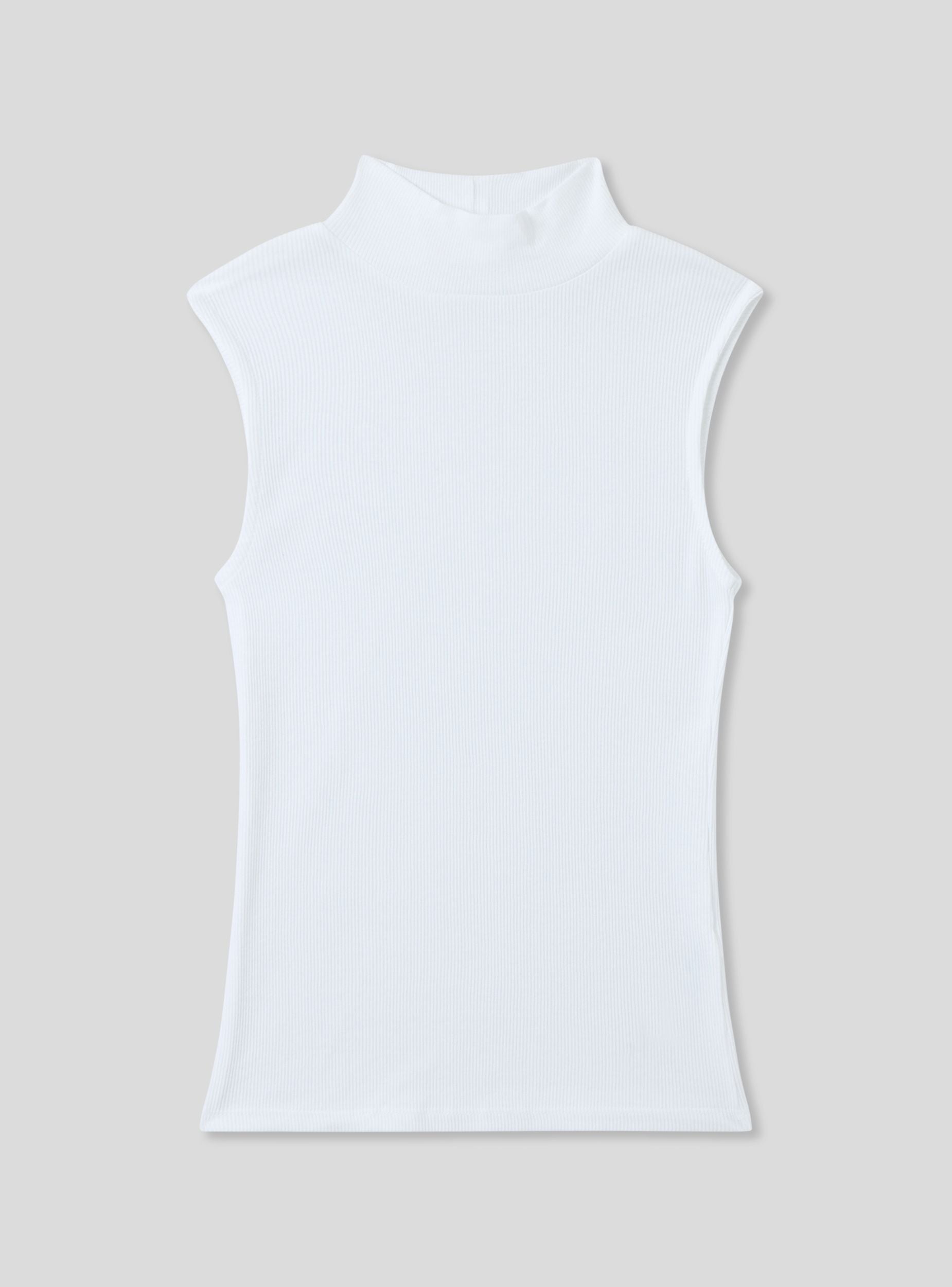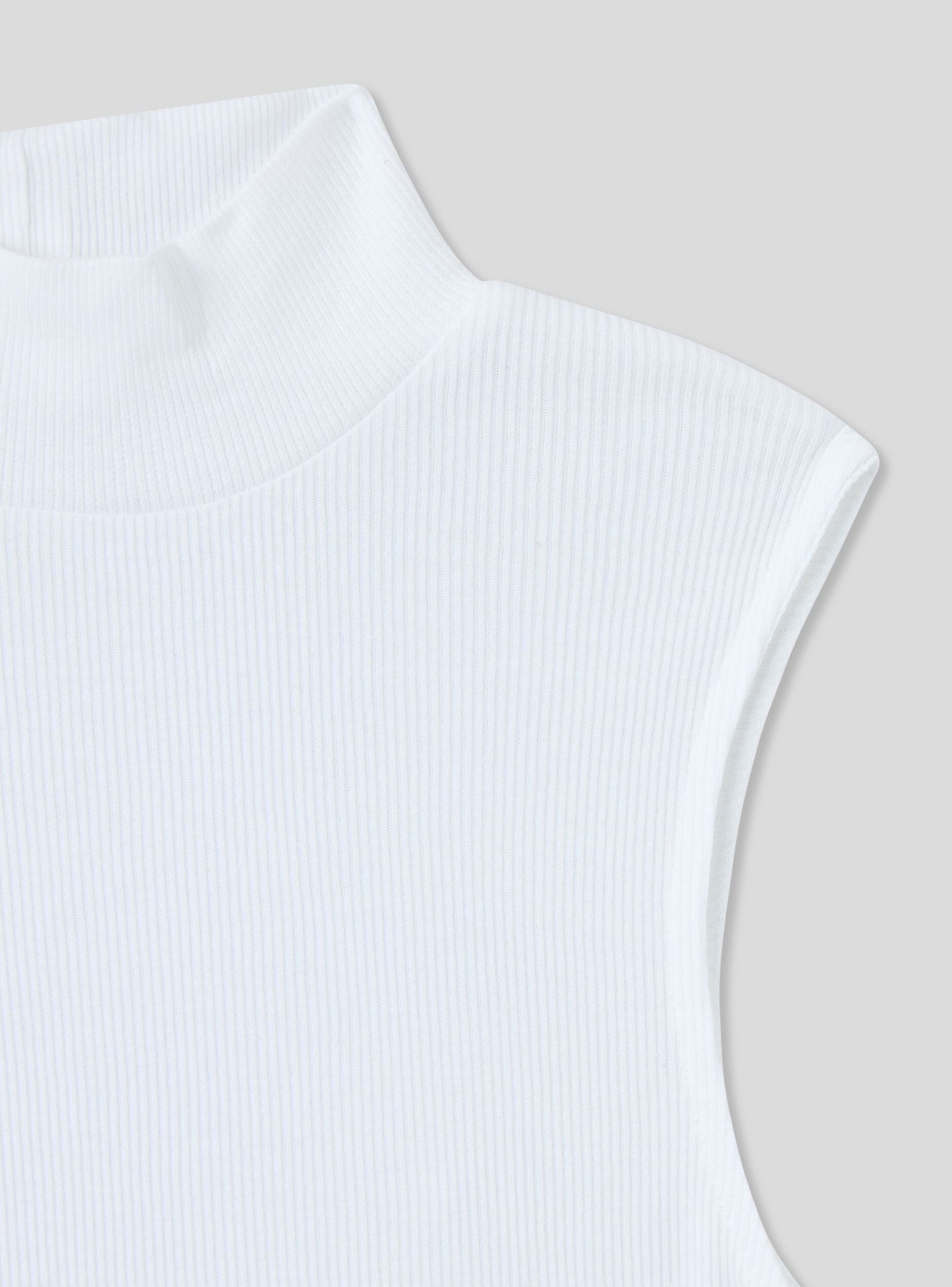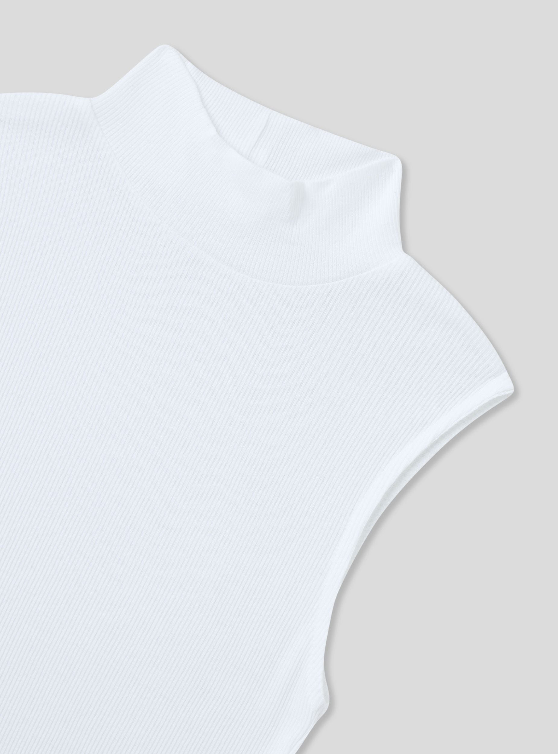 Top da donna a costine a tinta unita, senza maniche, e con collo alto. Realizzato in un tessuto morbido e aderente, offre comfort e libertà di movimento. Il design semplice e versatile lo rende ideale da abbinare a vari stili di abbigliamento, sia casual che più formali. Perfetto per essere indossato da solo o sotto una giacca o un cardigan.