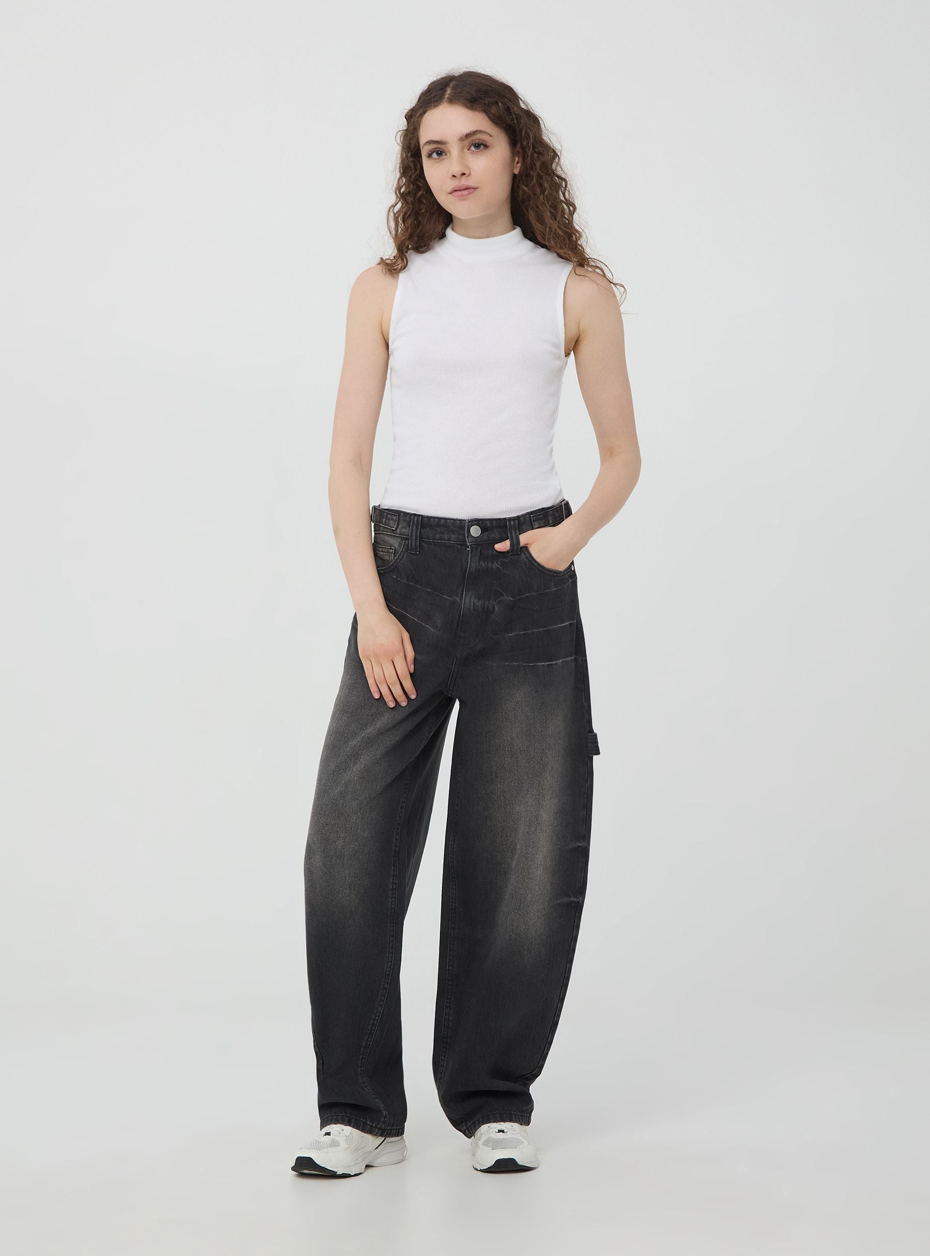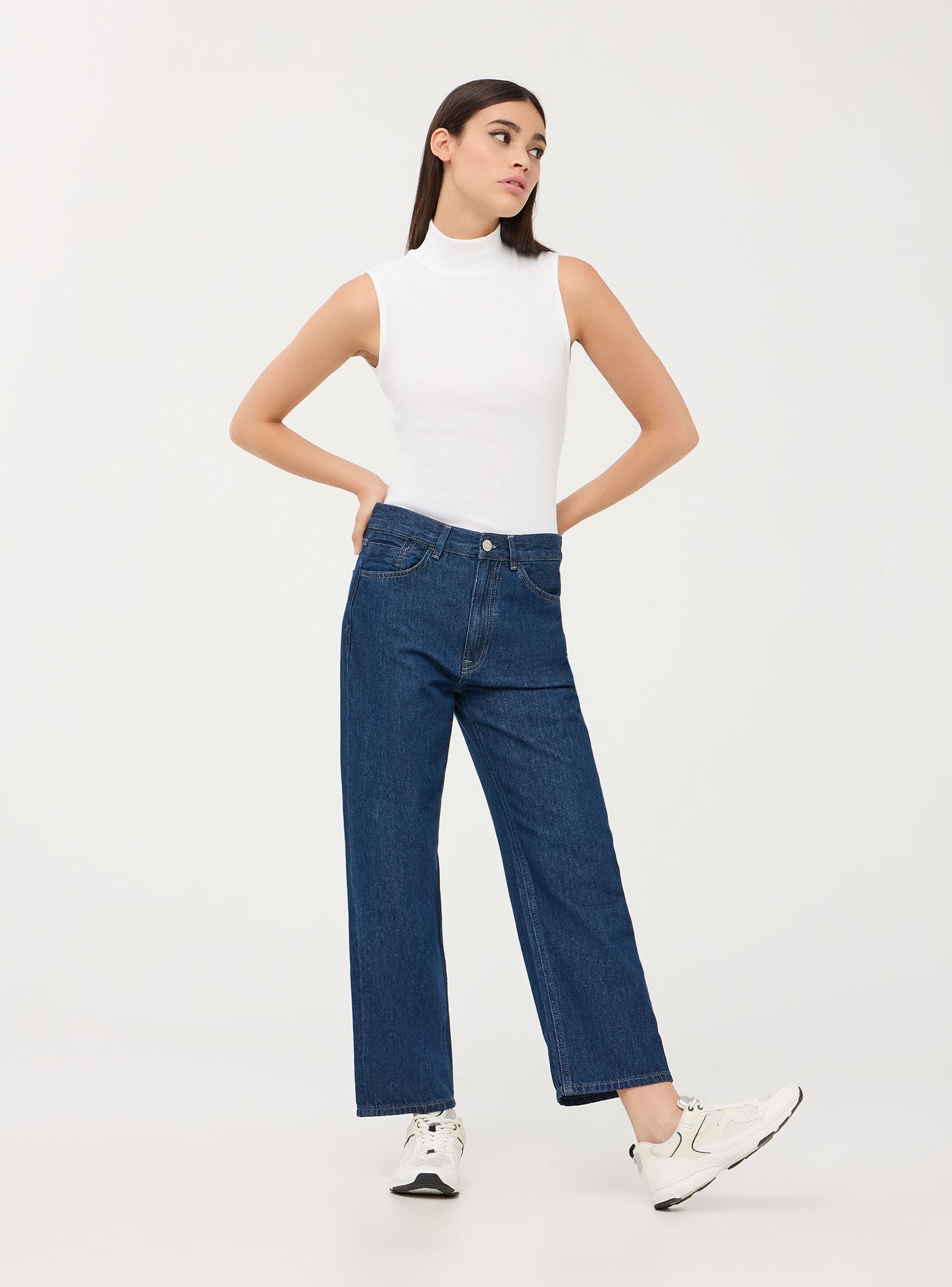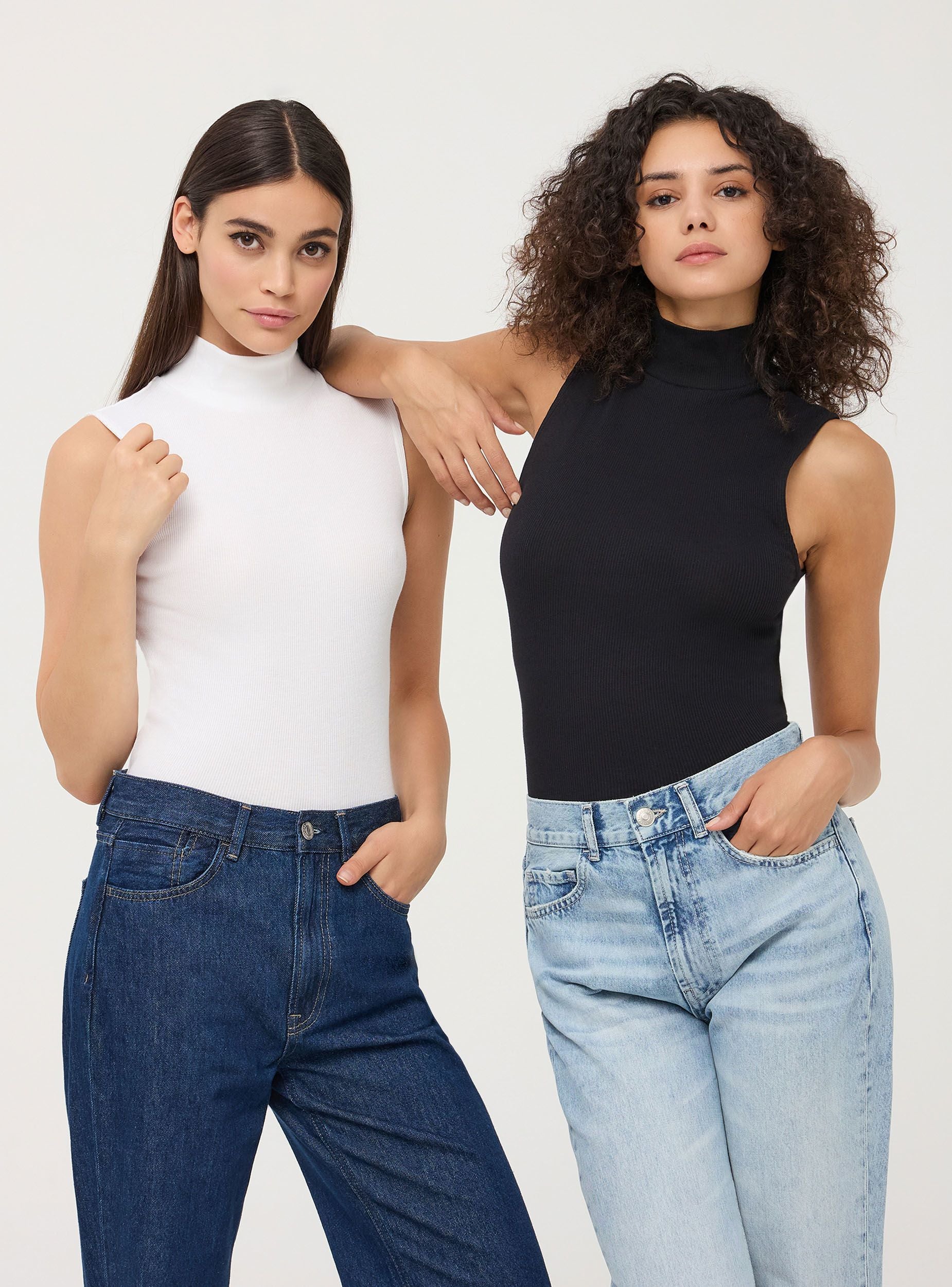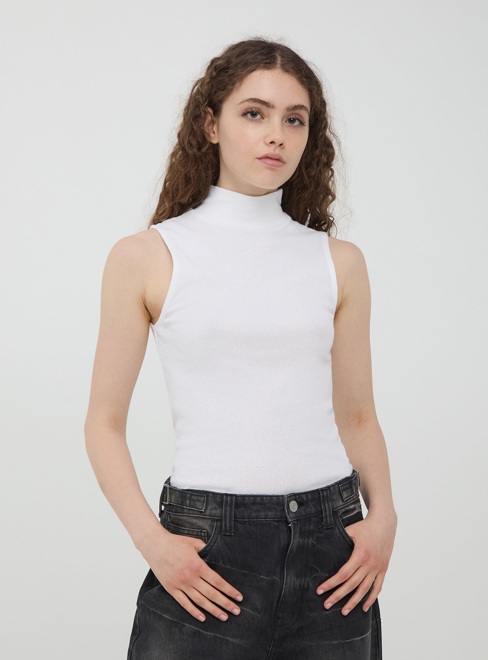 Top da donna a costine a tinta unita, senza maniche, e con collo alto. Realizzato in un tessuto morbido e aderente, offre comfort e libertà di movimento. Il design semplice e versatile lo rende ideale da abbinare a vari stili di abbigliamento, sia casual che più formali. Perfetto per essere indossato da solo o sotto una giacca o un cardigan.
