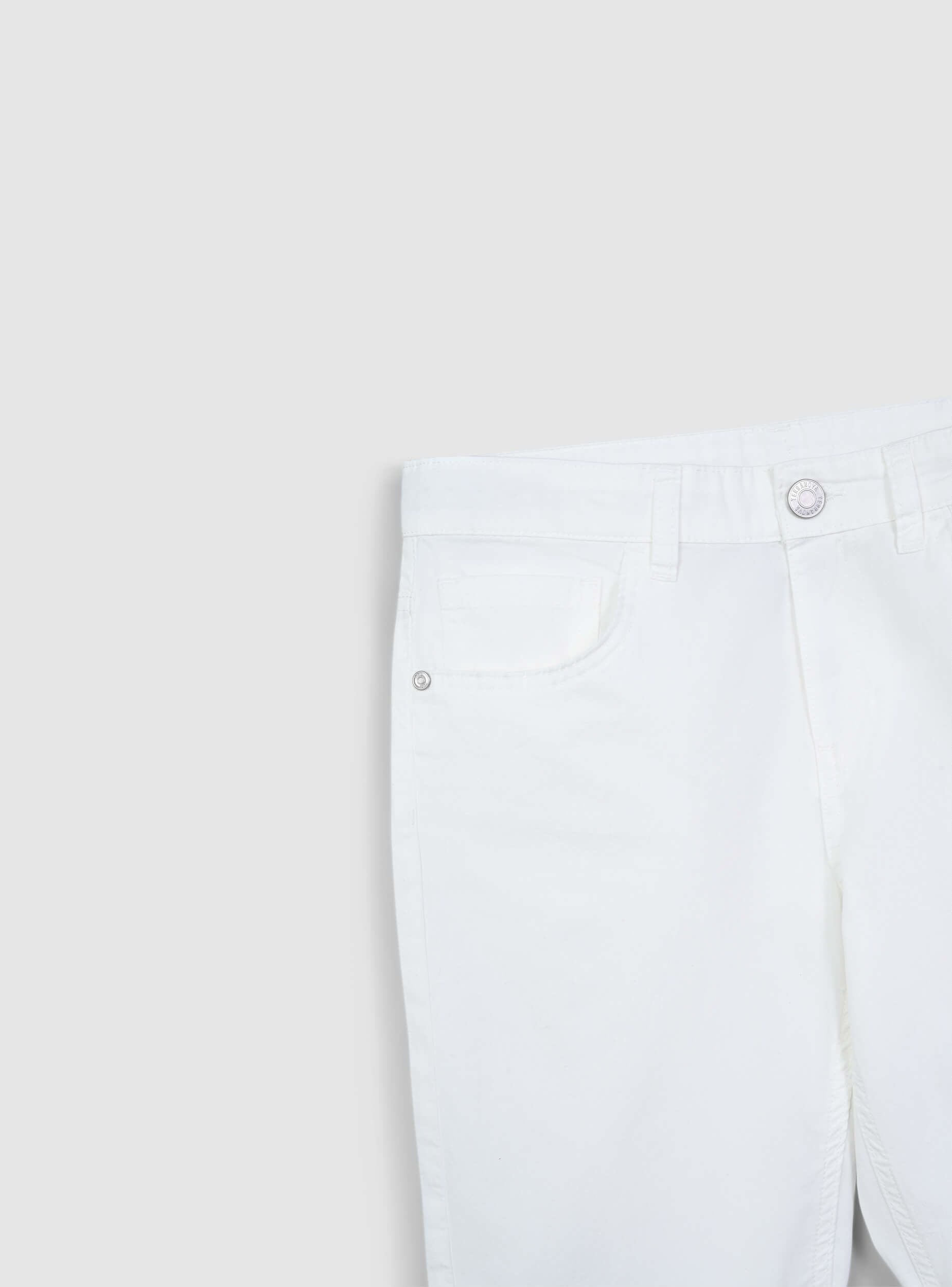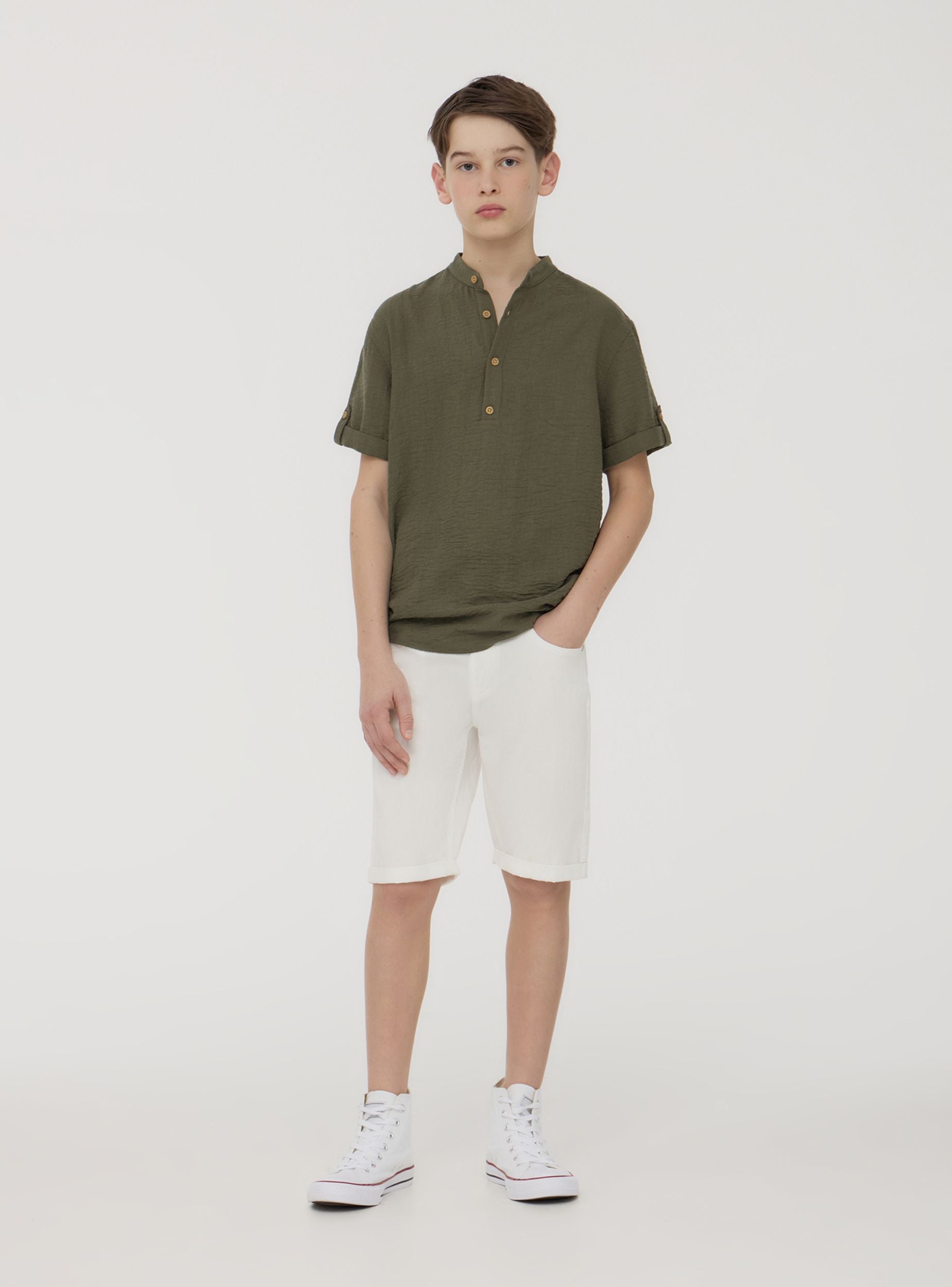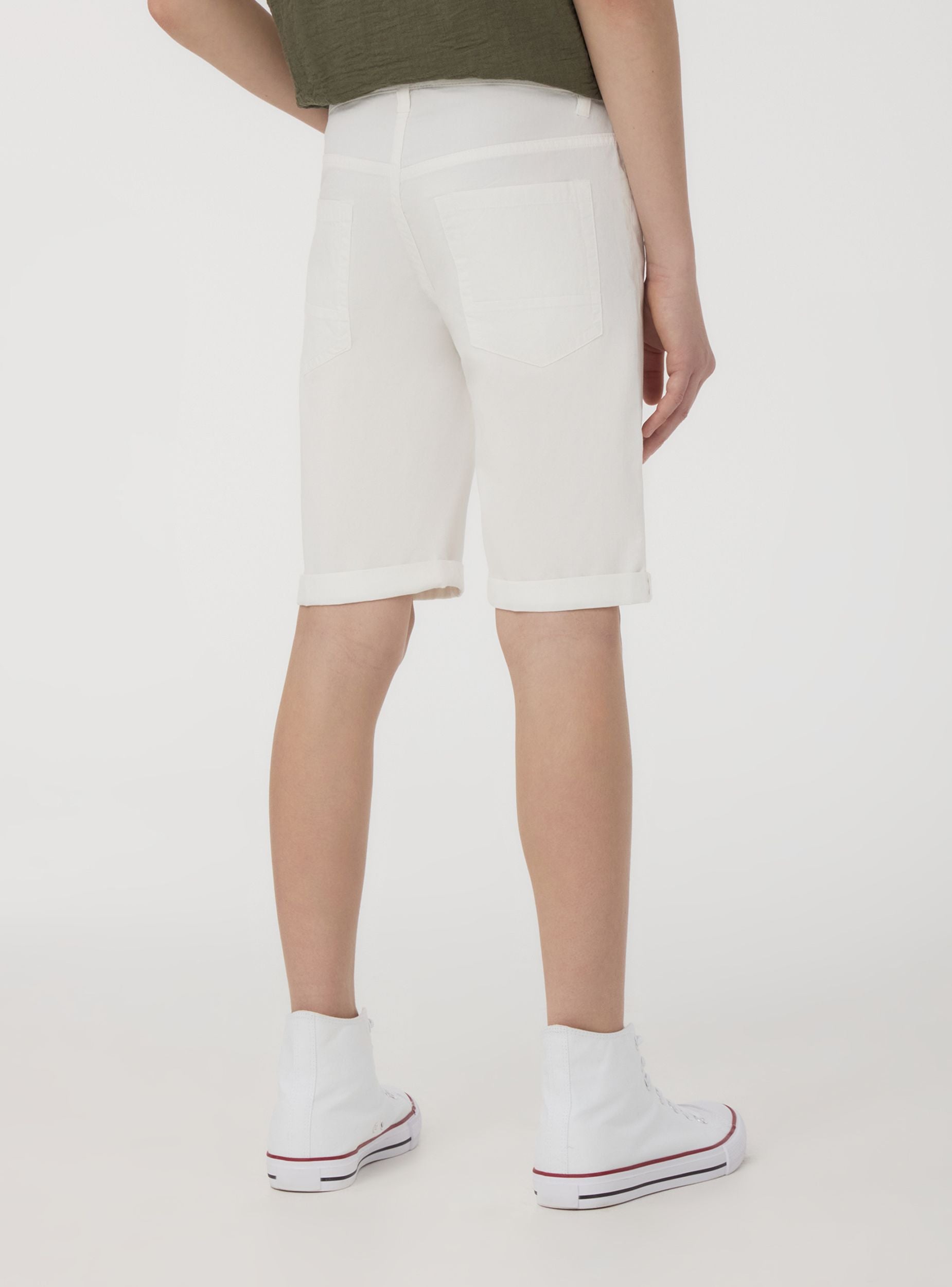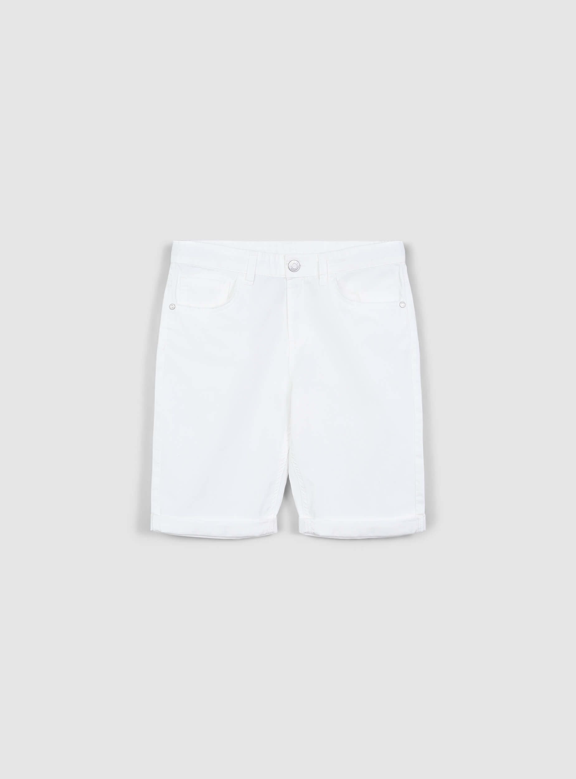 Pantaloncini da bambino perfetti per le giornate estive o il tempo libero. Modello con chiusura a bottone e zip, arricchito da passanti in vita per l'uso con cinture. Il design a cinque tasche offre praticità, mentre il risvolto aggiunge un tocco di stile. La tinta unita li rende ideali per abbinamenti versatili in ogni occasione.Dettagli