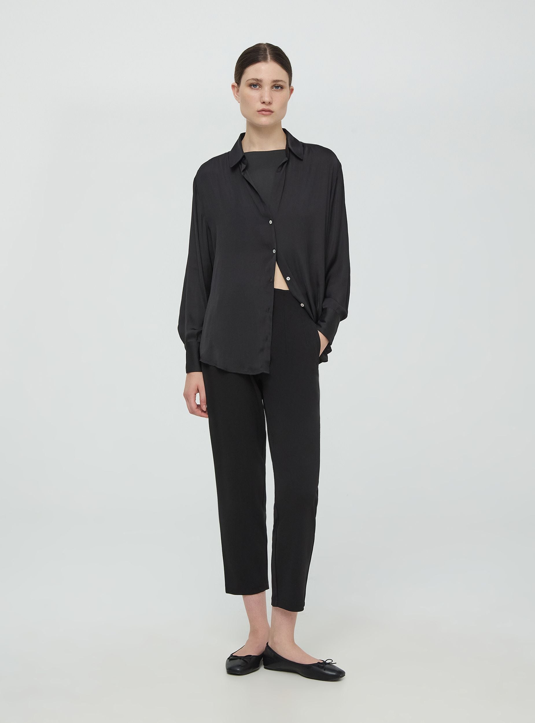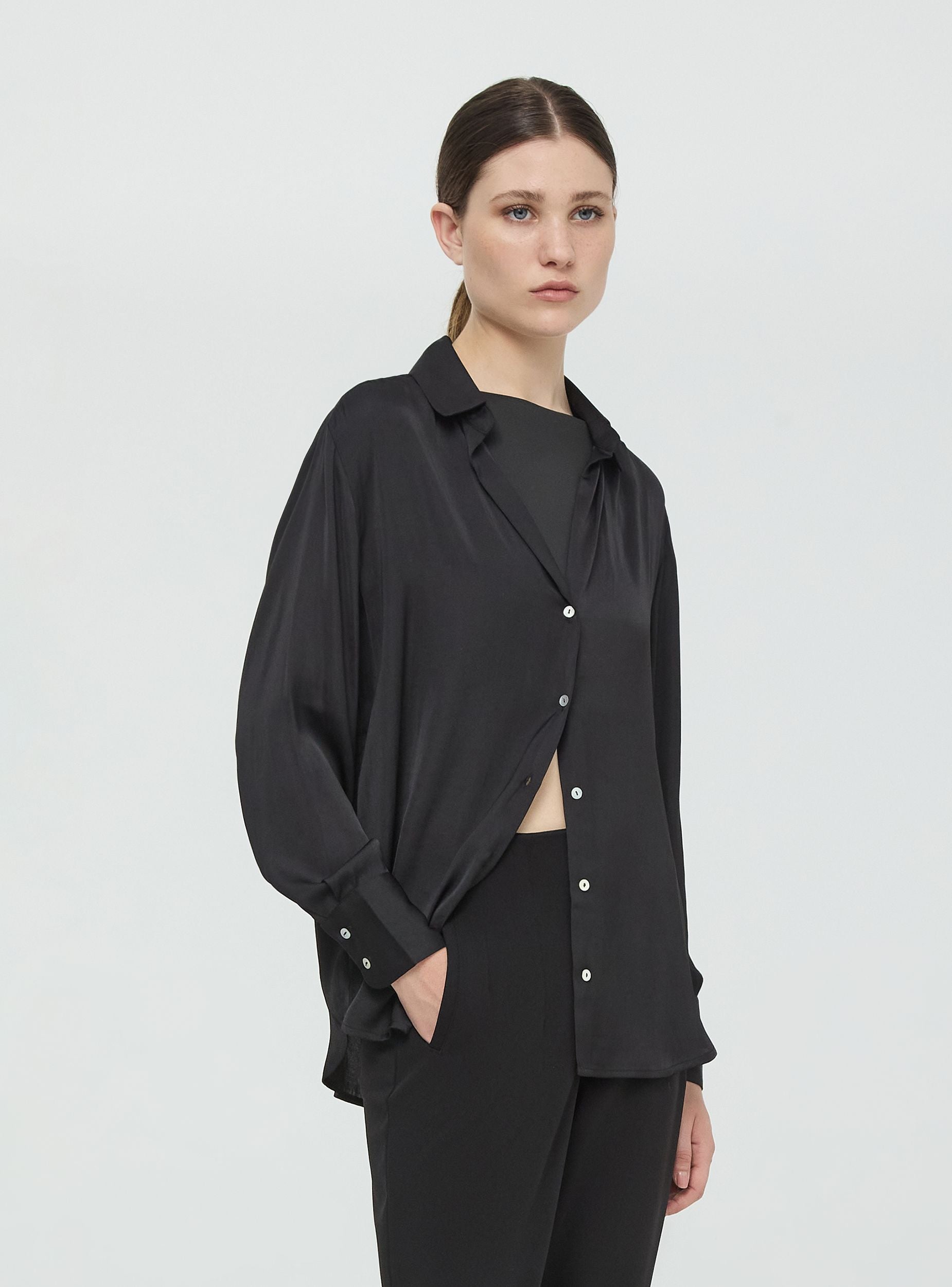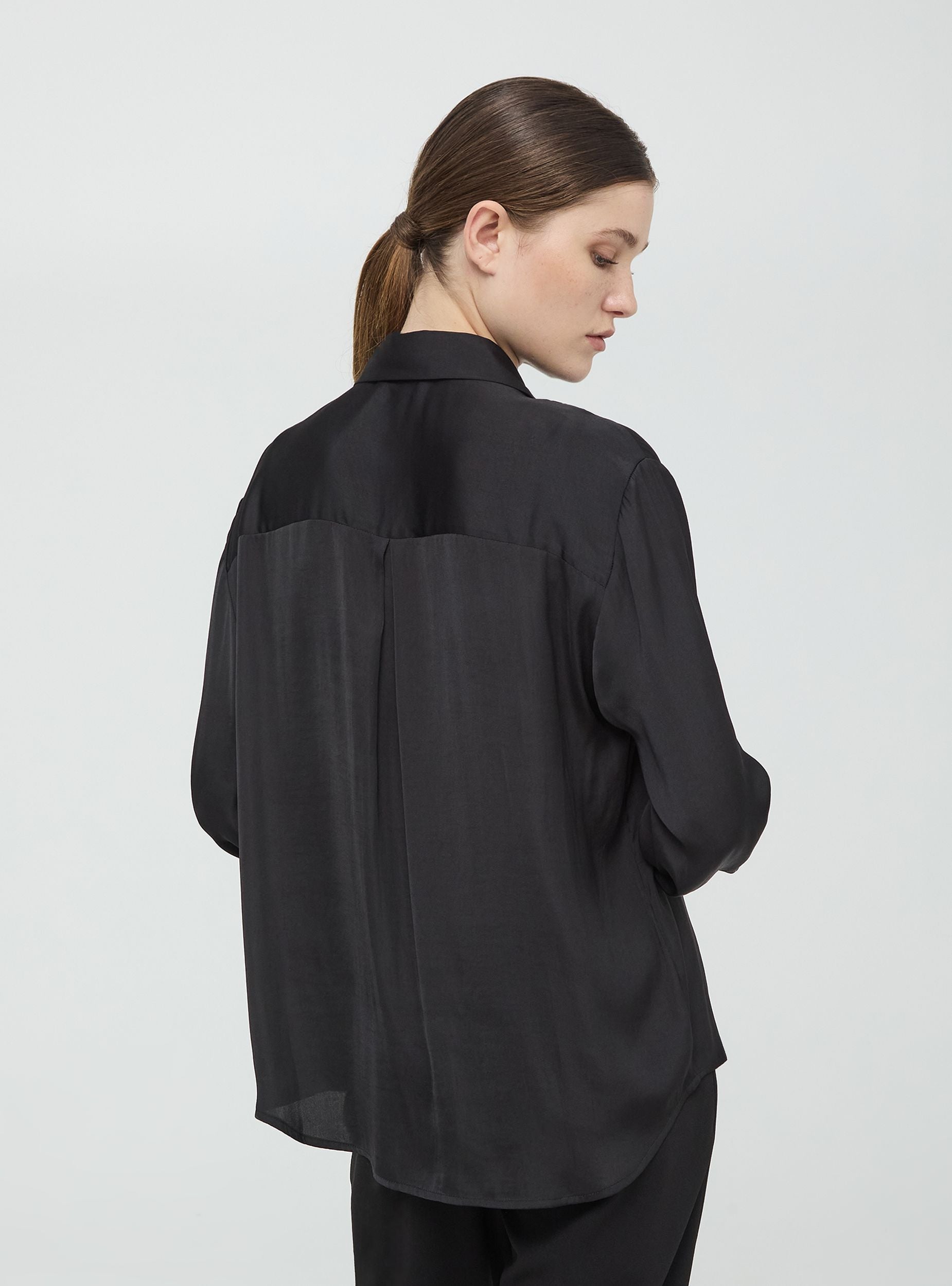 Camicia da donna in tessuto effetto raso lucido a tinta unita. Modello con maniche lunghe con doppio bottone sul polsino e chiusura frontale con bottoni. Un must-have dallo stile casual chic da avere nell'armadio. Vestibilità morbida.Dettagli