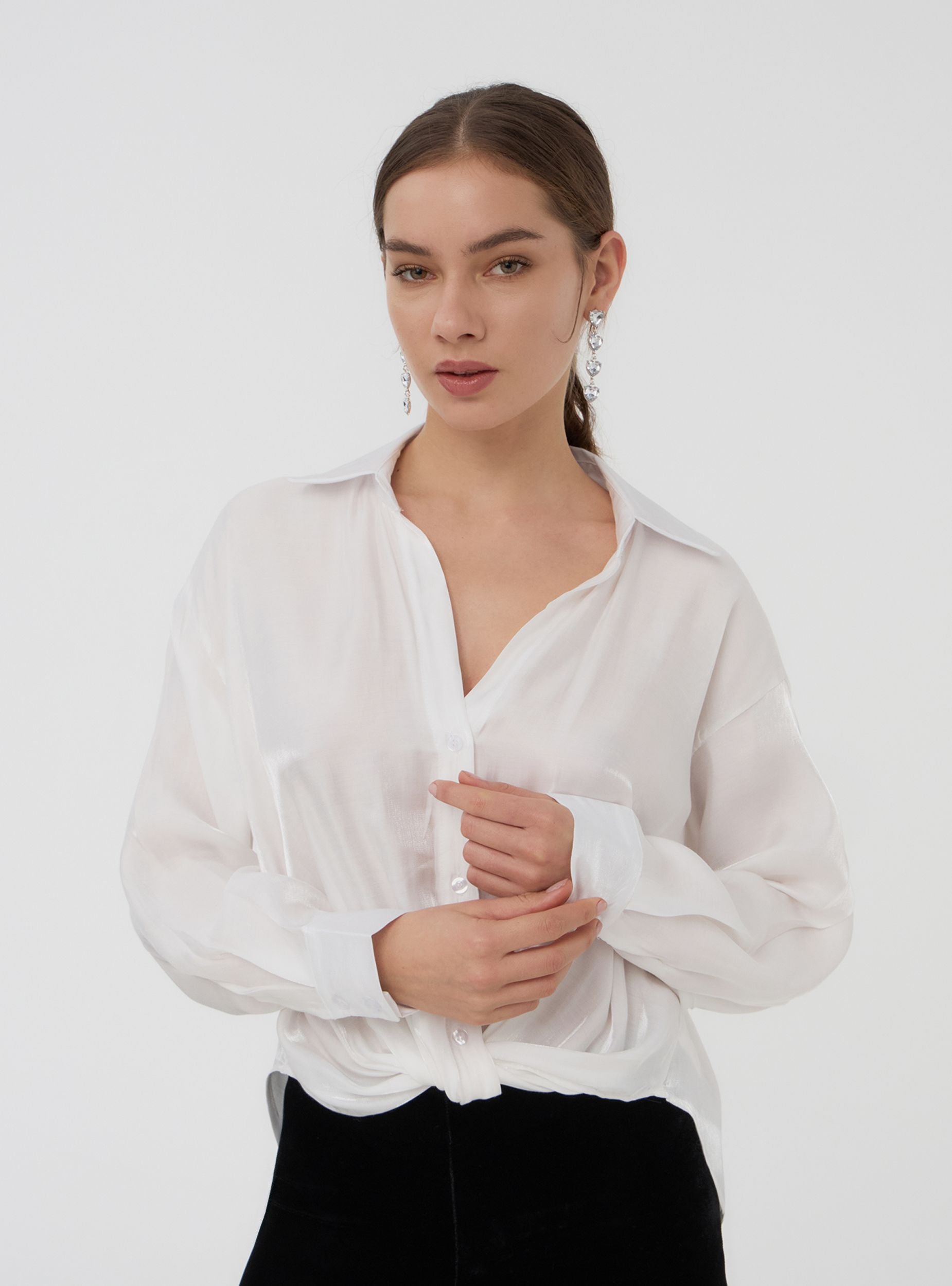 Camicia da donna dallo stile elegante e luminoso, impreziosita da dettagli luccicante che donano un tocco di brillantezza. Il nodo decorativo sul davanti aggiunge carattere e femminilità  al design, mentre i bottoni e il colletto strutturato ne esaltano l'aspetto sofisticato. Le maniche lunghe completano il capo, rendendolo perfetto per occasioni speciali o per arricchire un look serale con un tocco glamour.