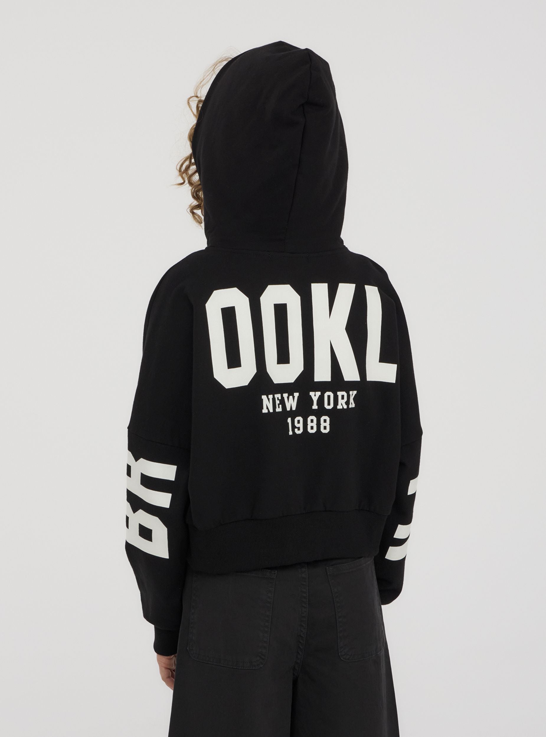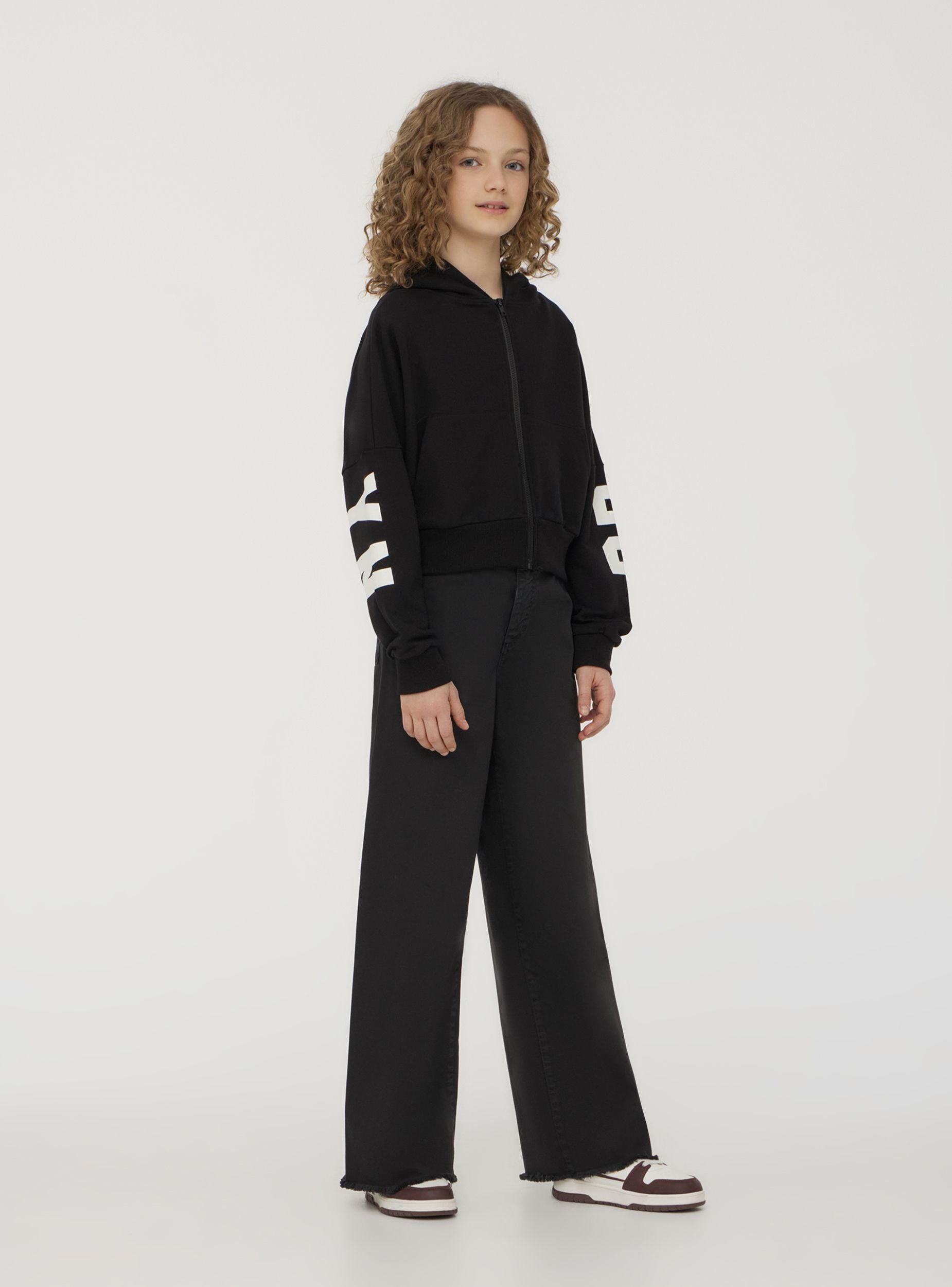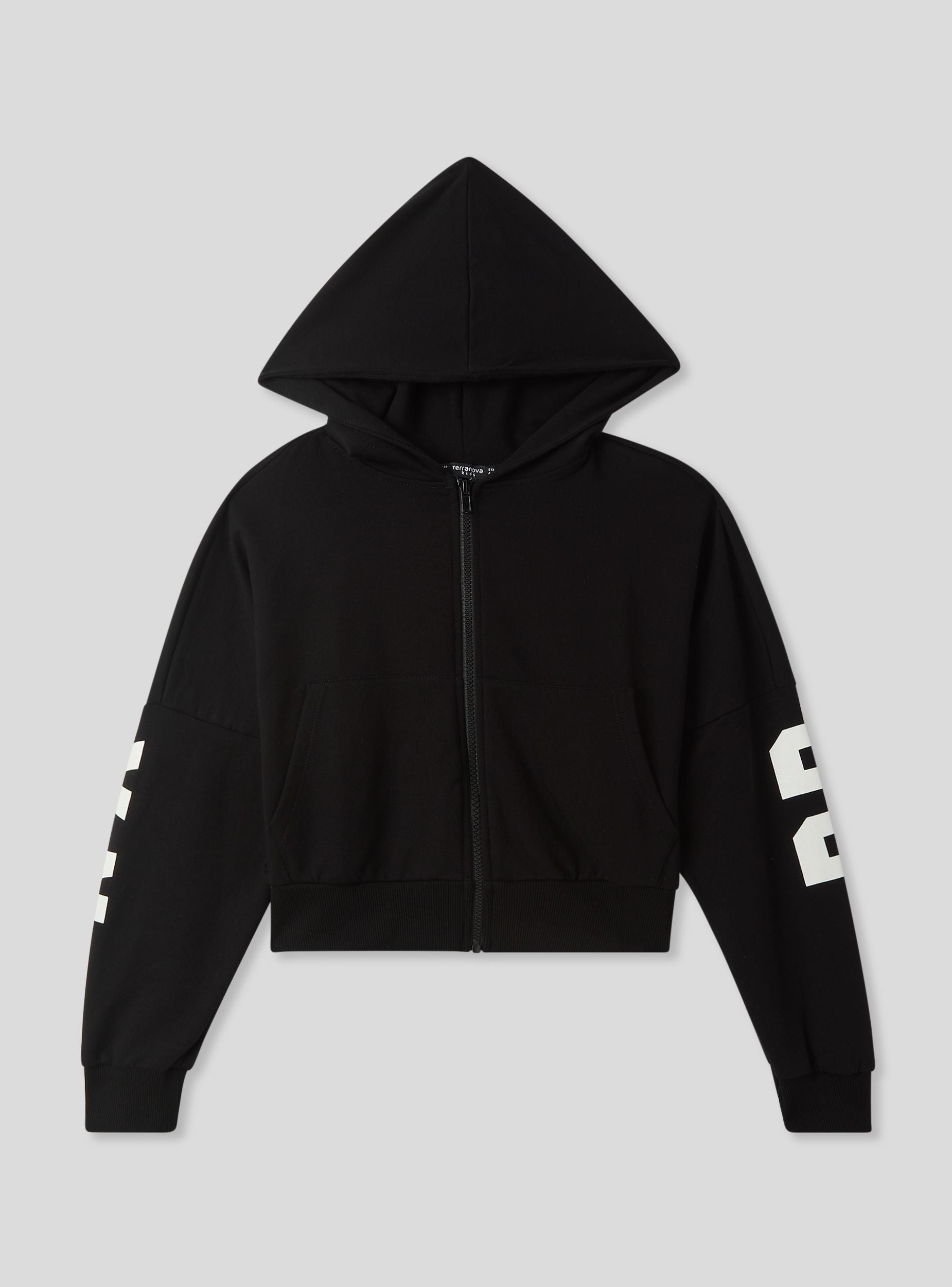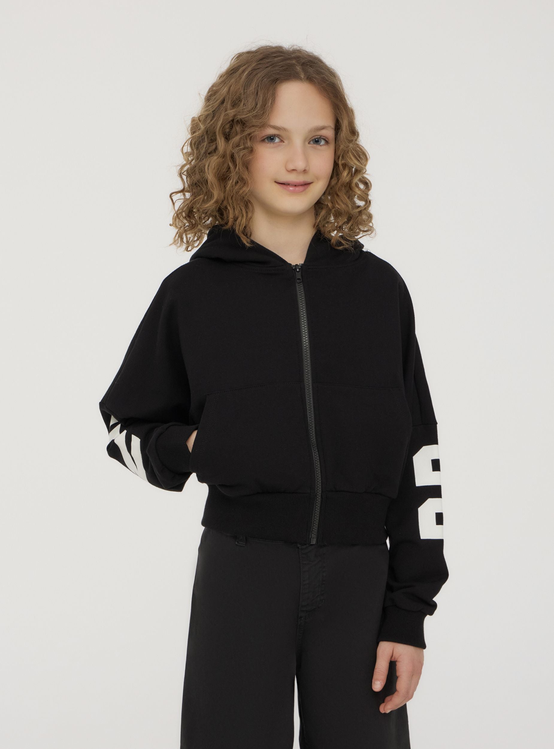 Felpa leggera da bambina dallo stile moderno e dinamico, perfetta per un look sportivo e alla moda. Il design crop con maniche lunghe e cappuccio aggiunge un tocco di tendenza, mentre la zip frontale assicura praticità. La stampa sul retro dona carattere e originalità. Ideale da abbinare a jeans e sneakers per un outfit casual o a joggers per un comfort totale nelle attività quotidiane.